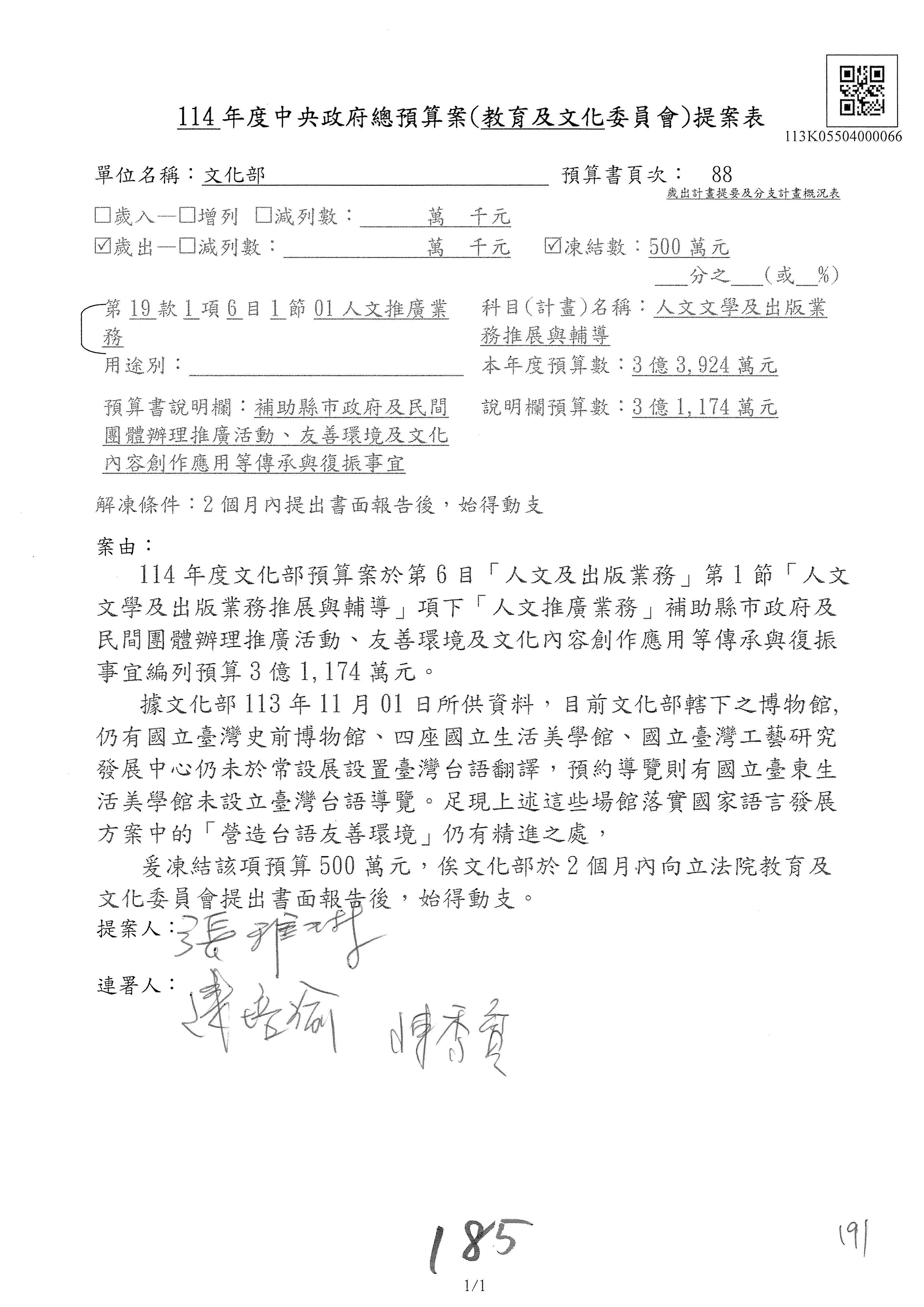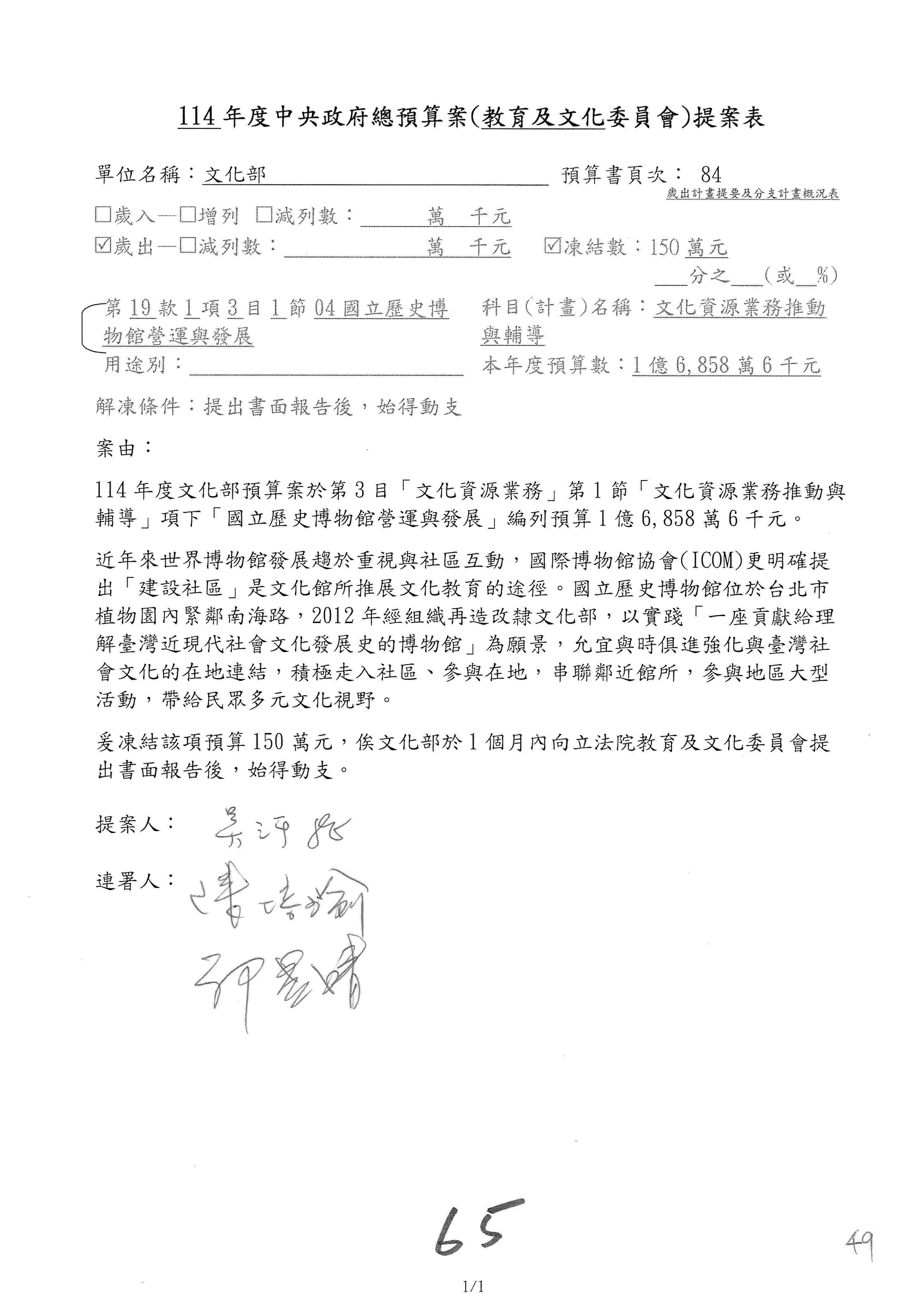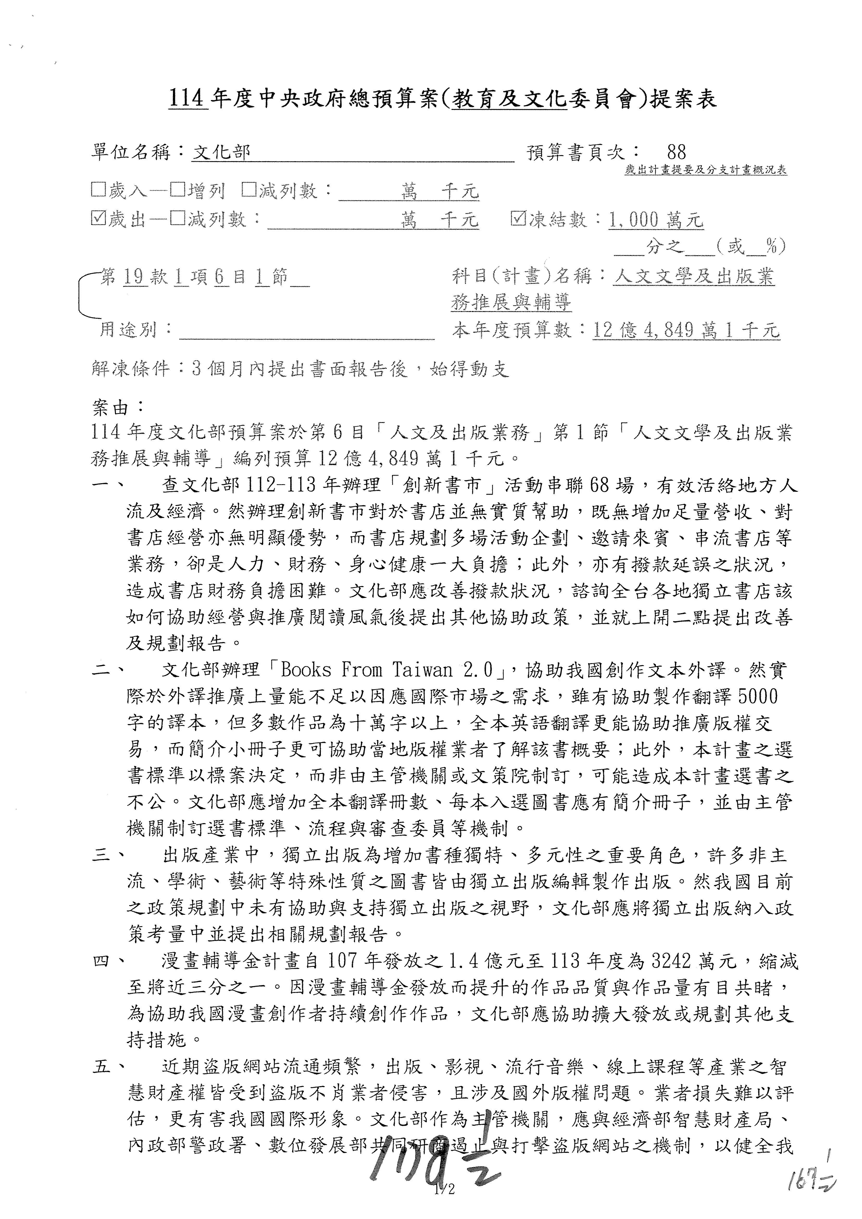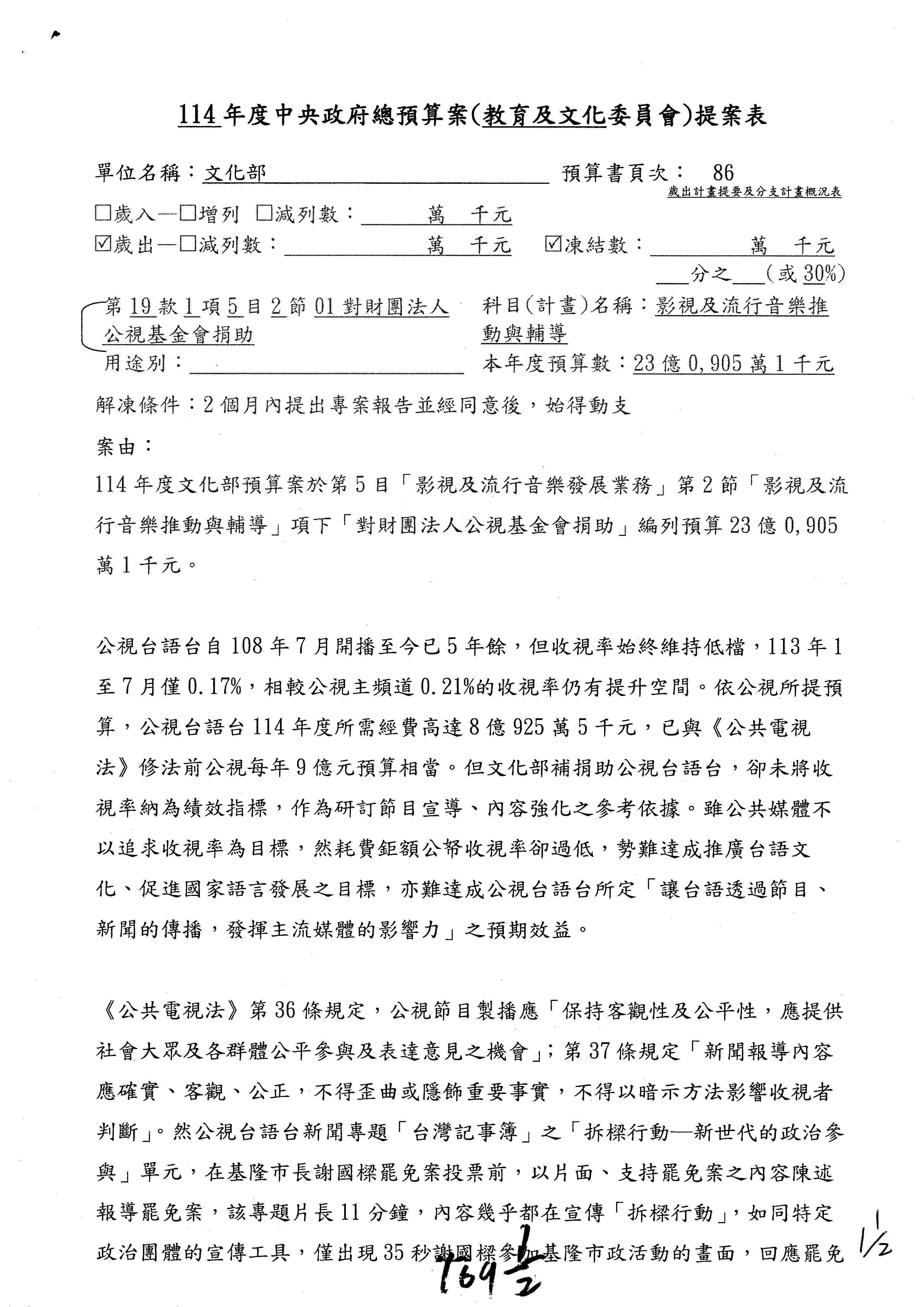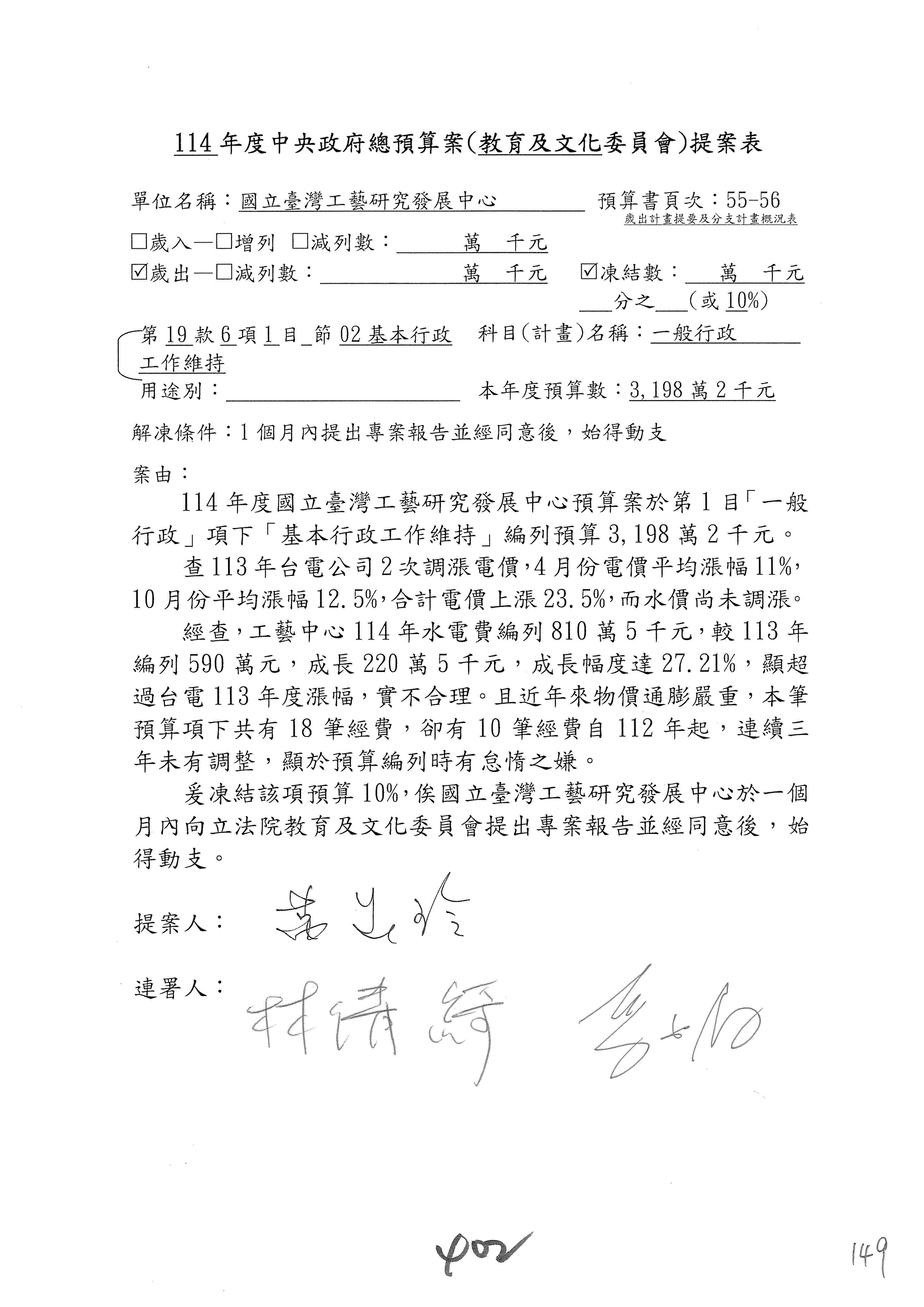 (一)114年度核能安全委員會及所屬預算編列38億3,878萬9千元,凍結150萬元,俟核能安全委員會向立法院教育及文化委員會提出書面報告後,始得動支。2-5