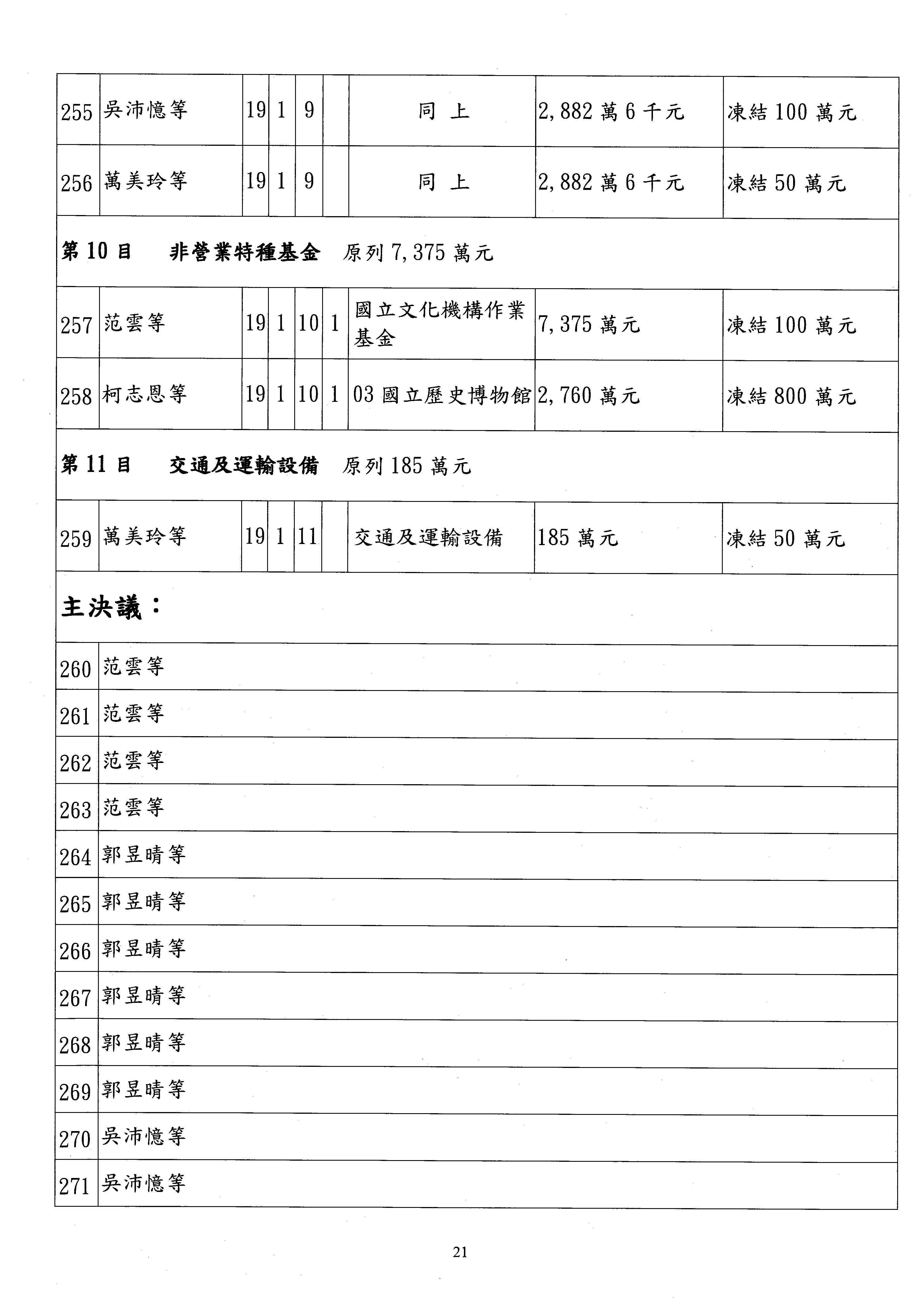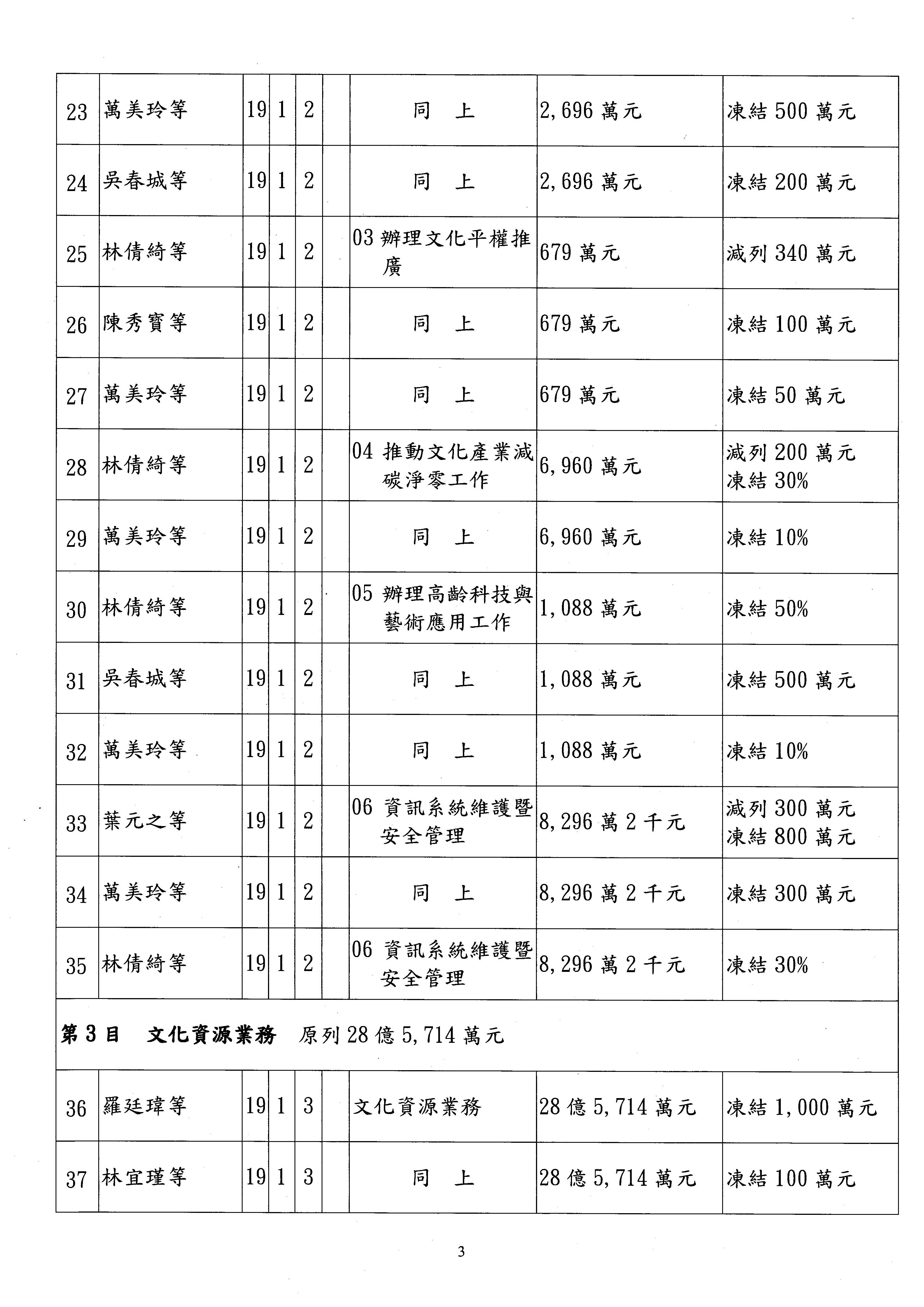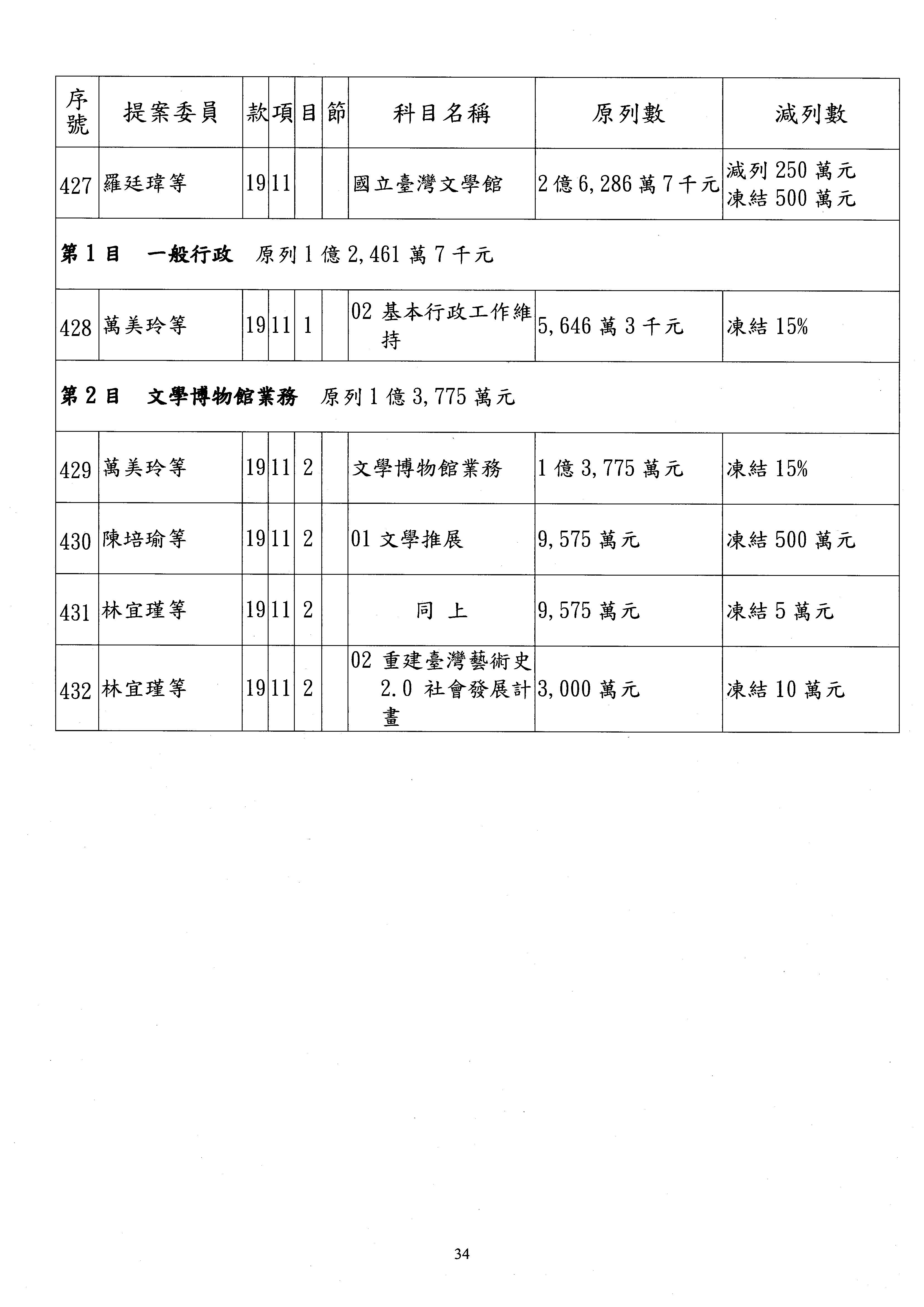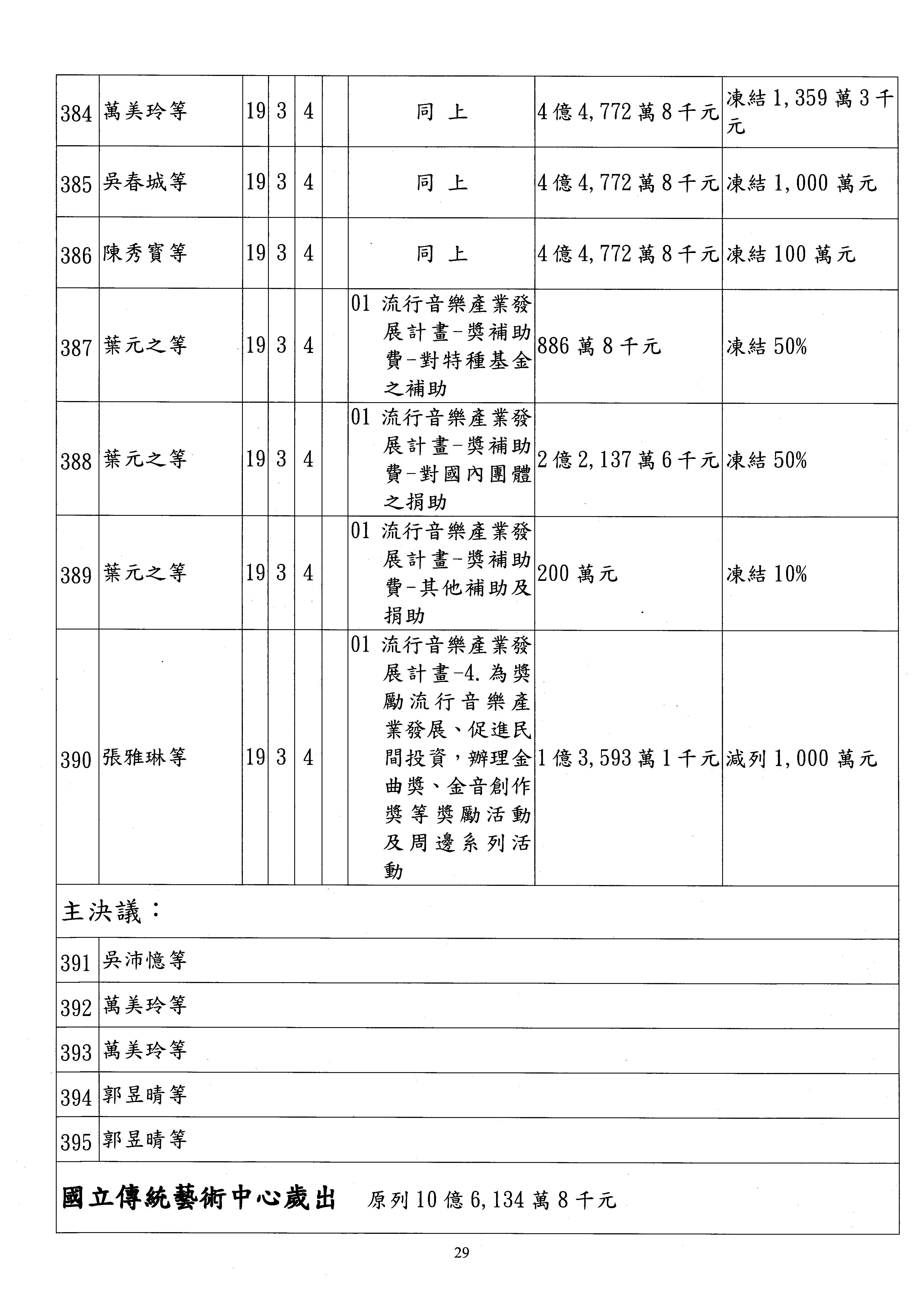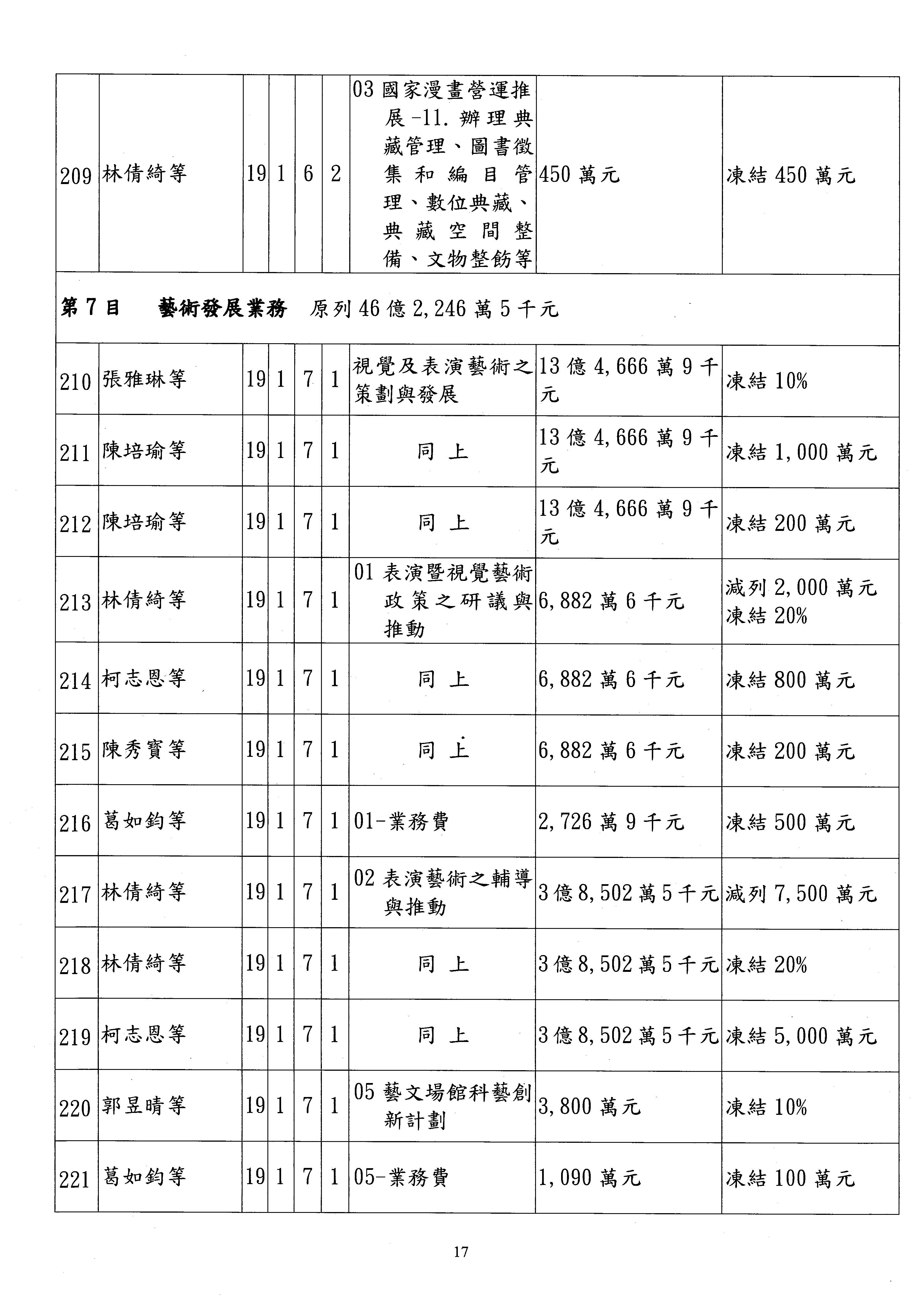 現在進行預算案的審查,請議事人員宣讀預算數及提案內容,文化部及所屬單位預算案計432案;國立文化機構作業基金附屬單位預算案計6案;文化發展基金附屬單位預算案計6案;行政法人國家表演藝術中心、文化內容策進院、國家電影及視聽文化中心預算案計39案,並進行討論與協商,討論時如有新增或修正文字之主決議請議事人員一併宣讀。