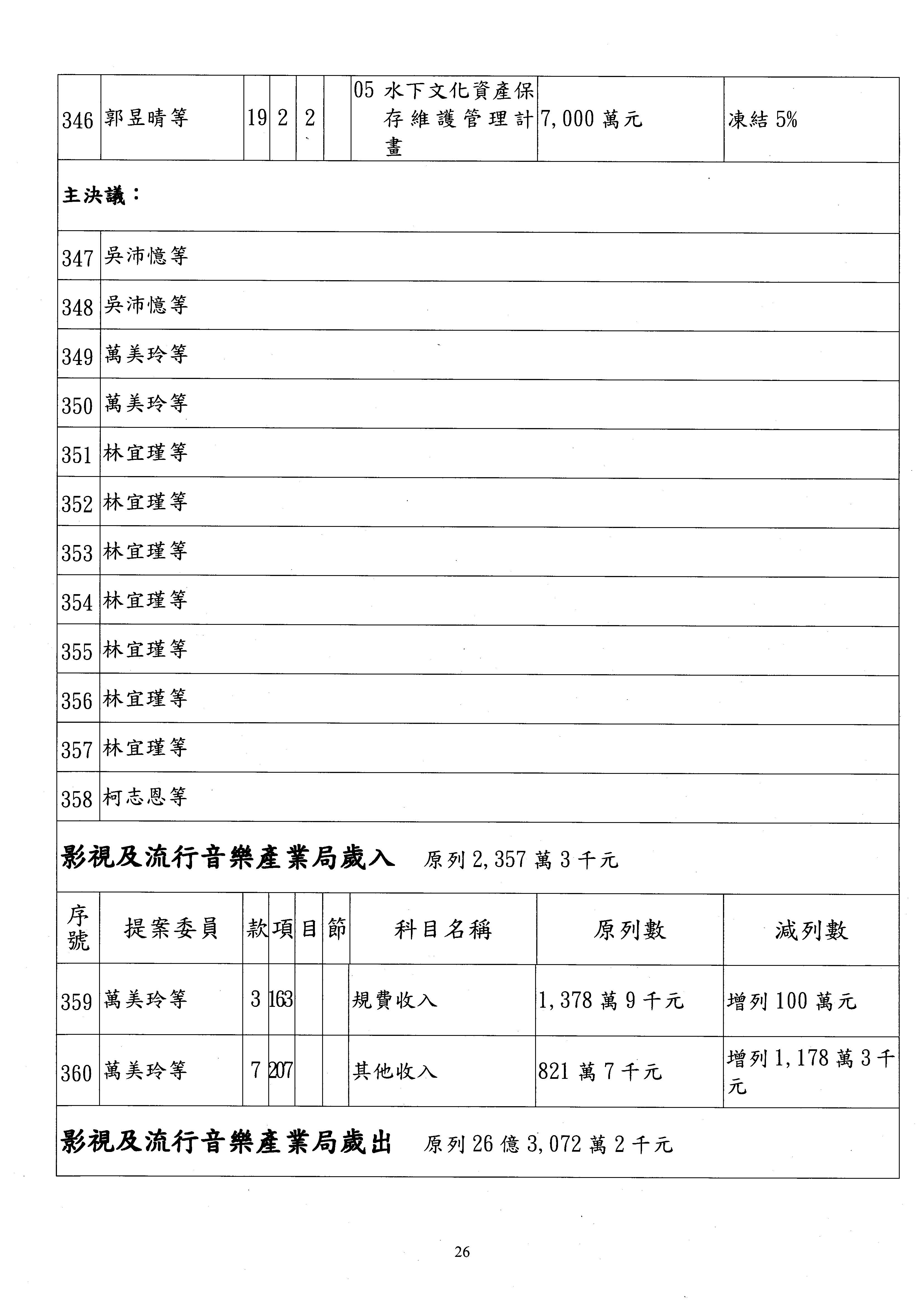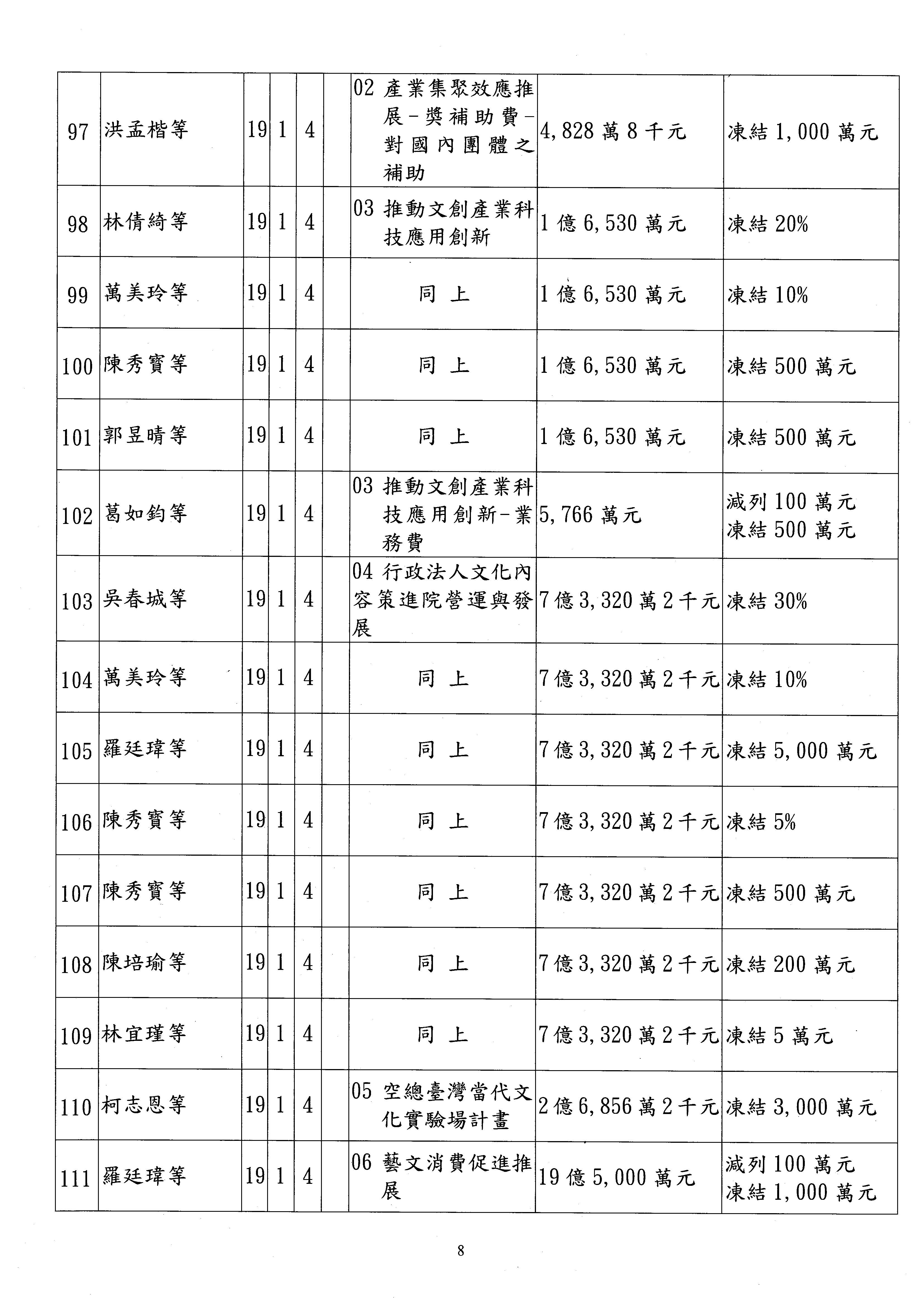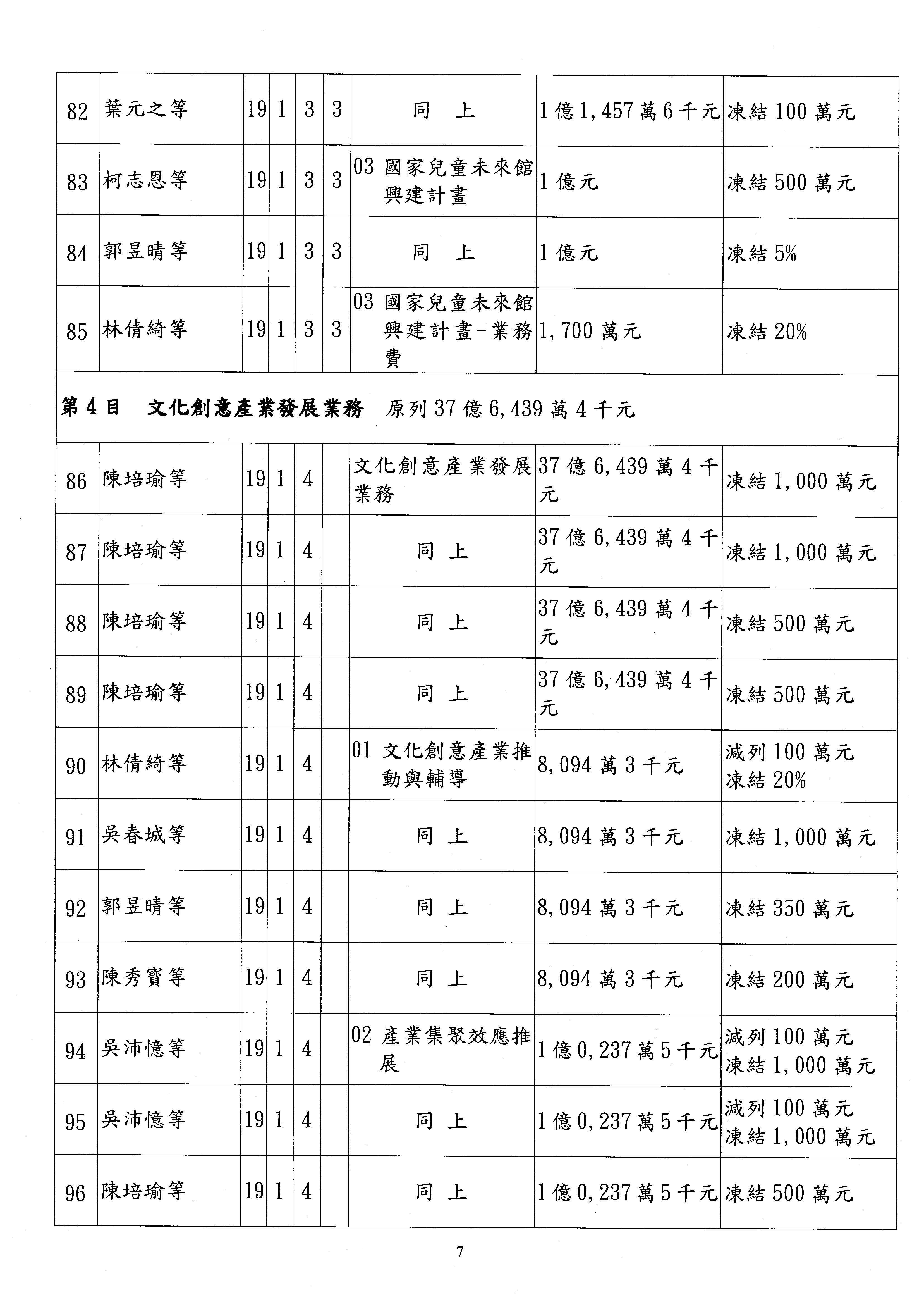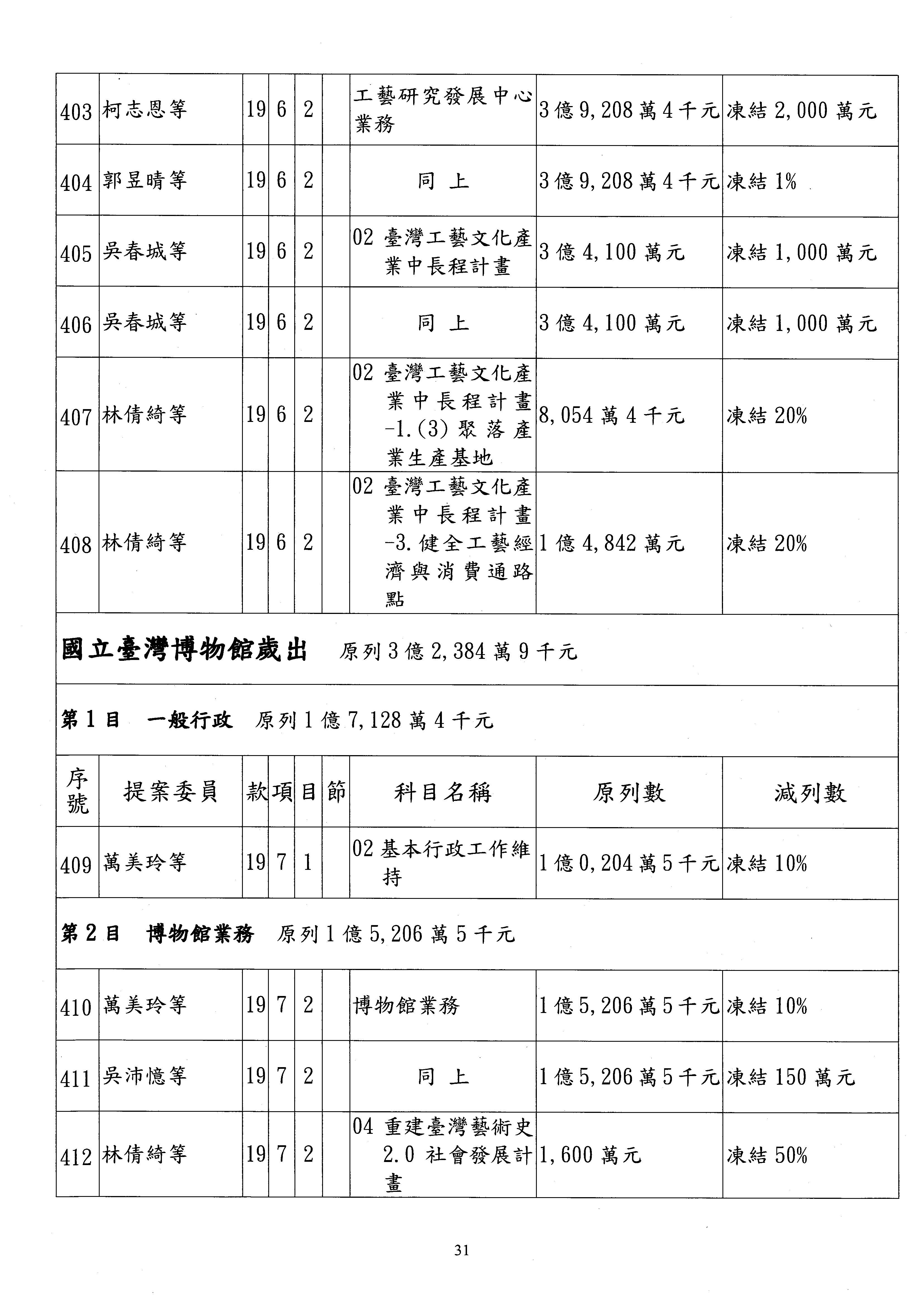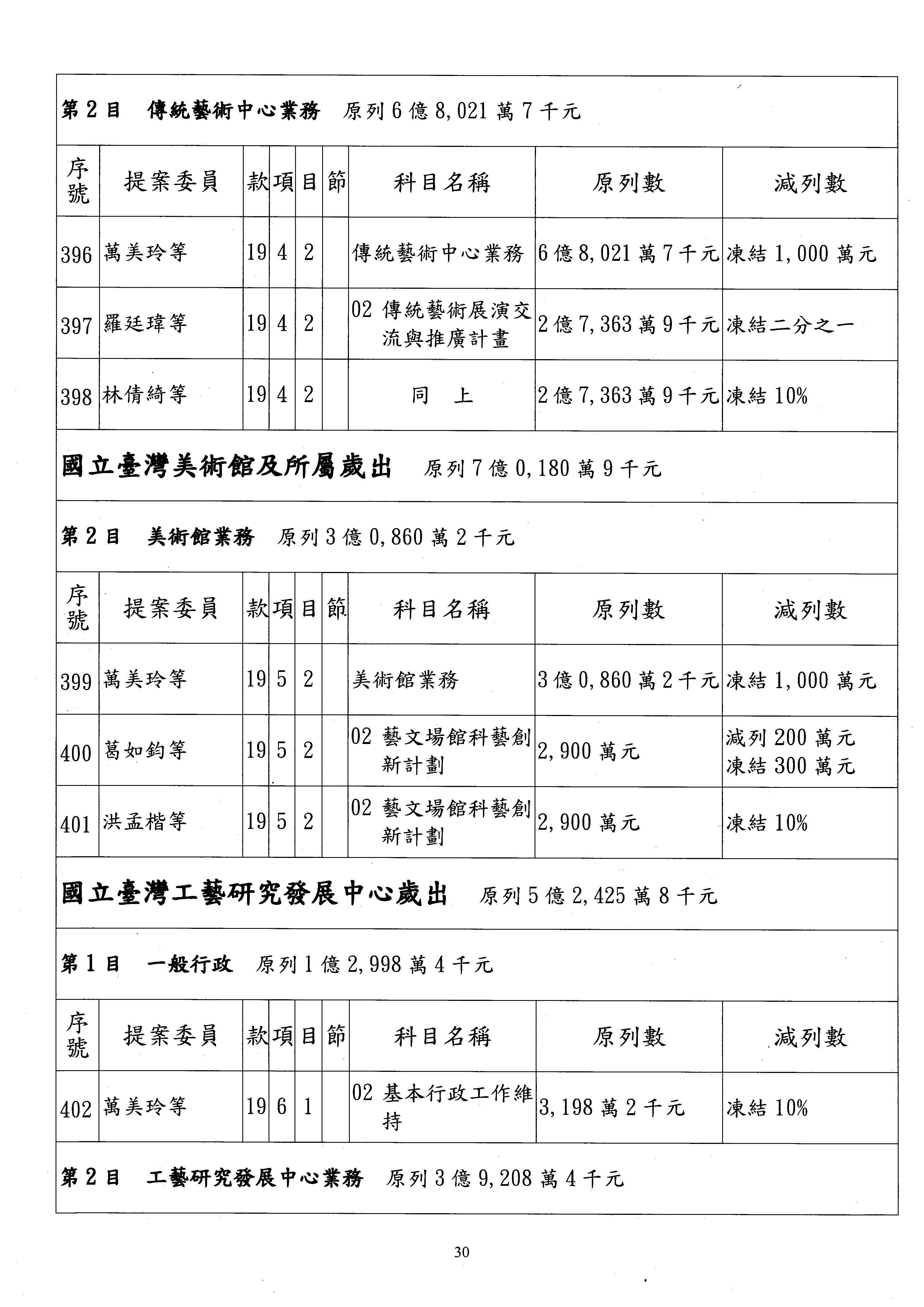 現在進行預算案的審查,請議事人員宣讀預算數及提案內容,文化部及所屬單位預算案計432案;國立文化機構作業基金附屬單位預算案計6案;文化發展基金附屬單位預算案計6案;行政法人國家表演藝術中心、文化內容策進院、國家電影及視聽文化中心預算案計39案,並進行討論與協商,討論時如有新增或修正文字之主決議請議事人員一併宣讀。