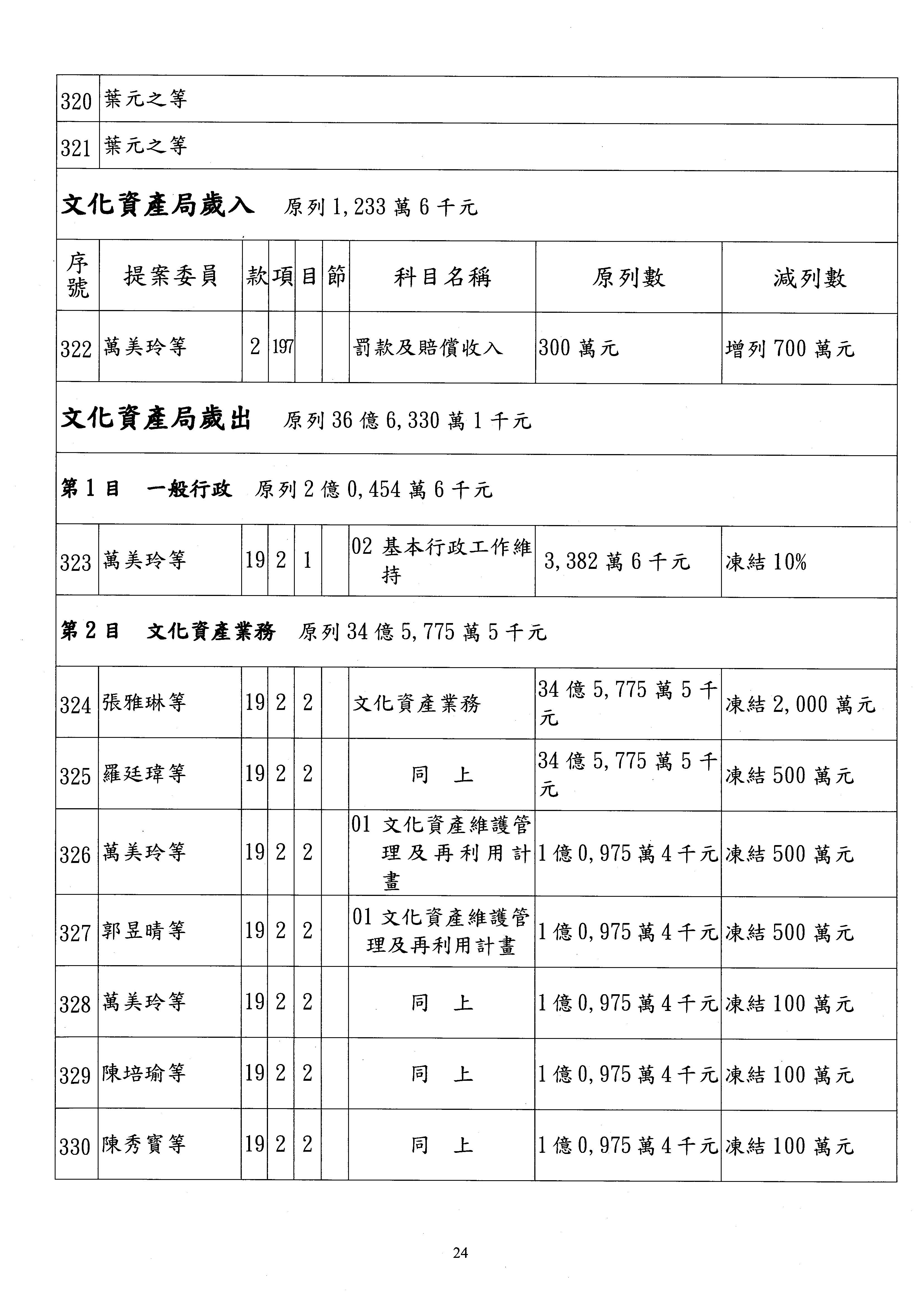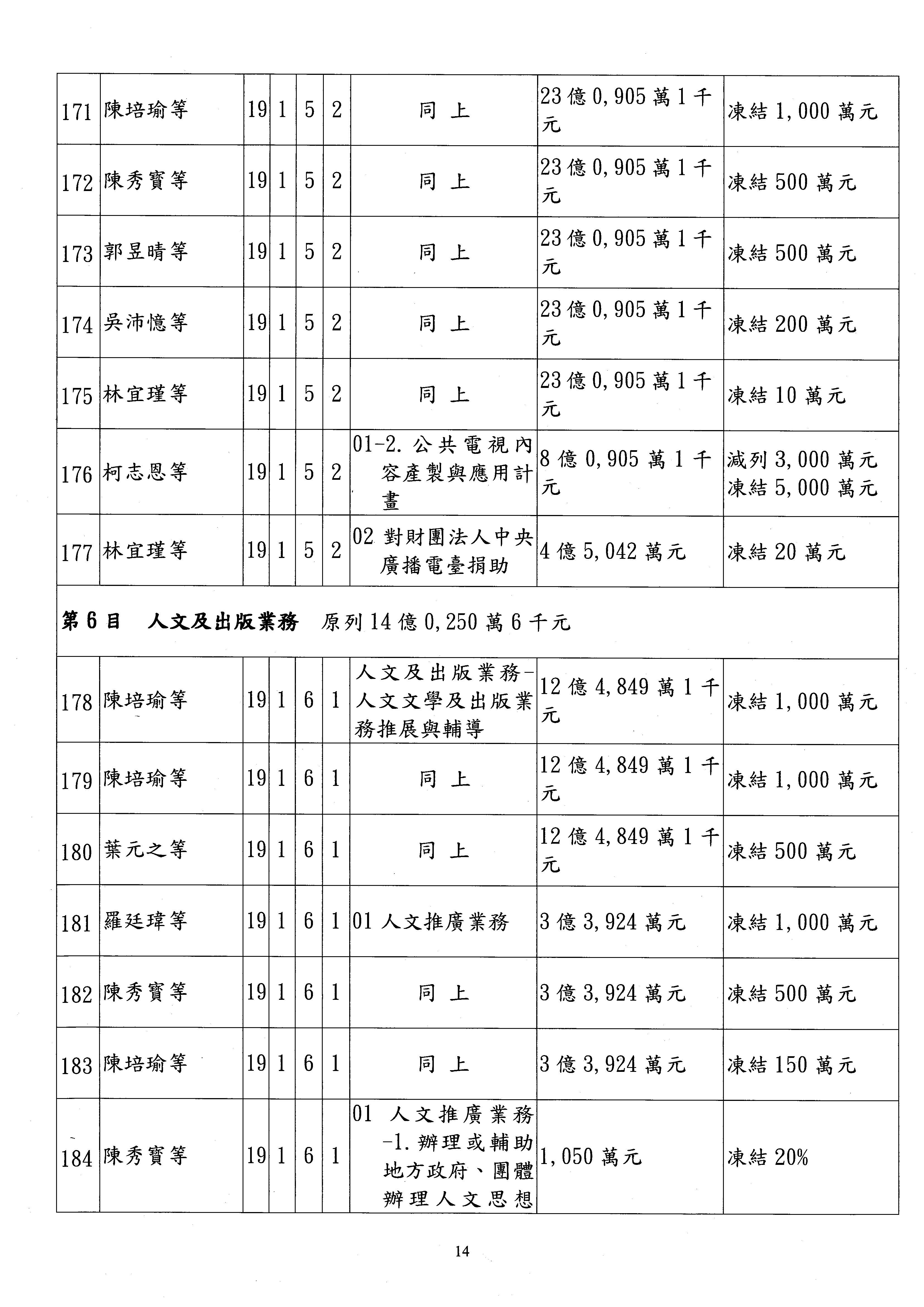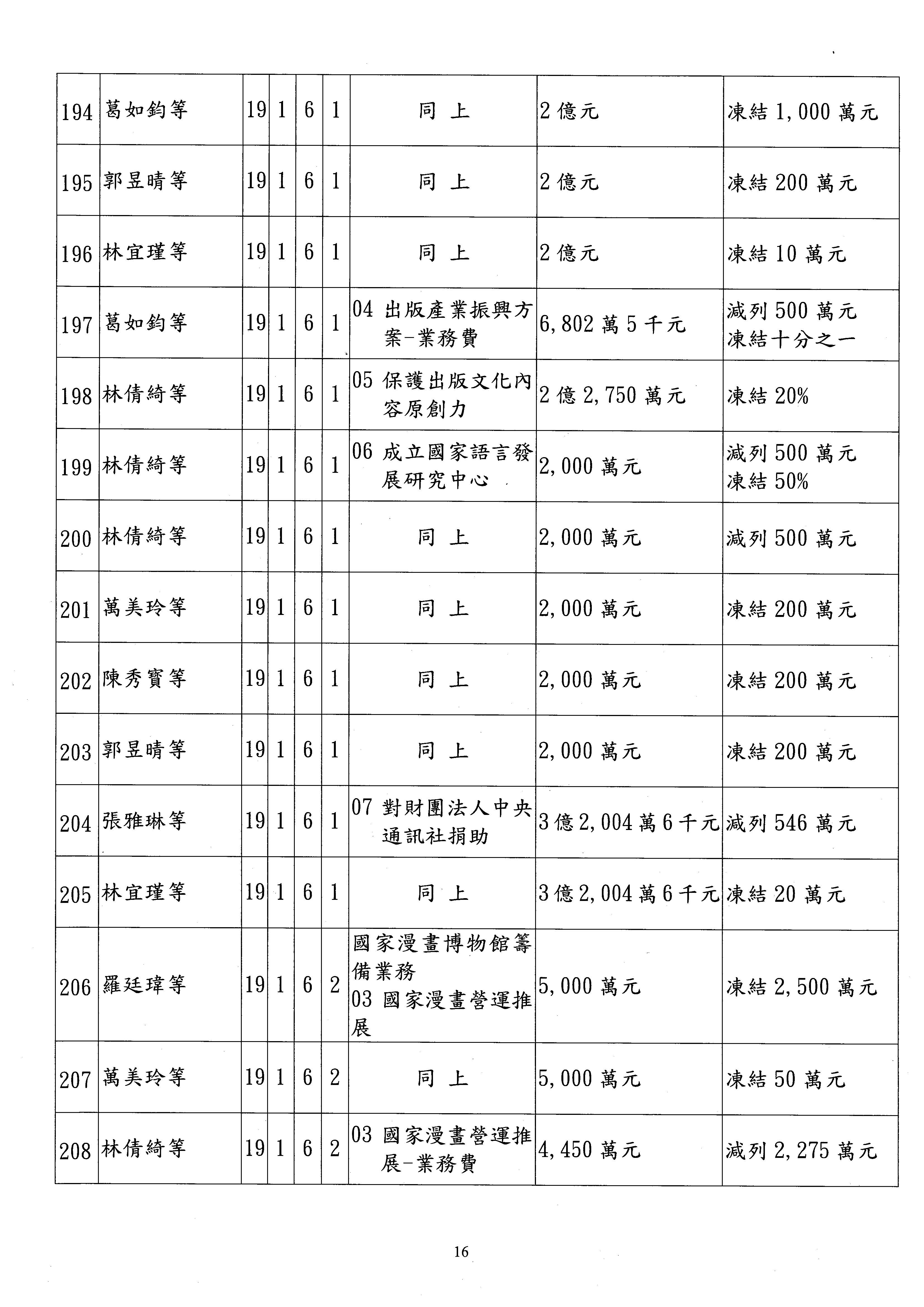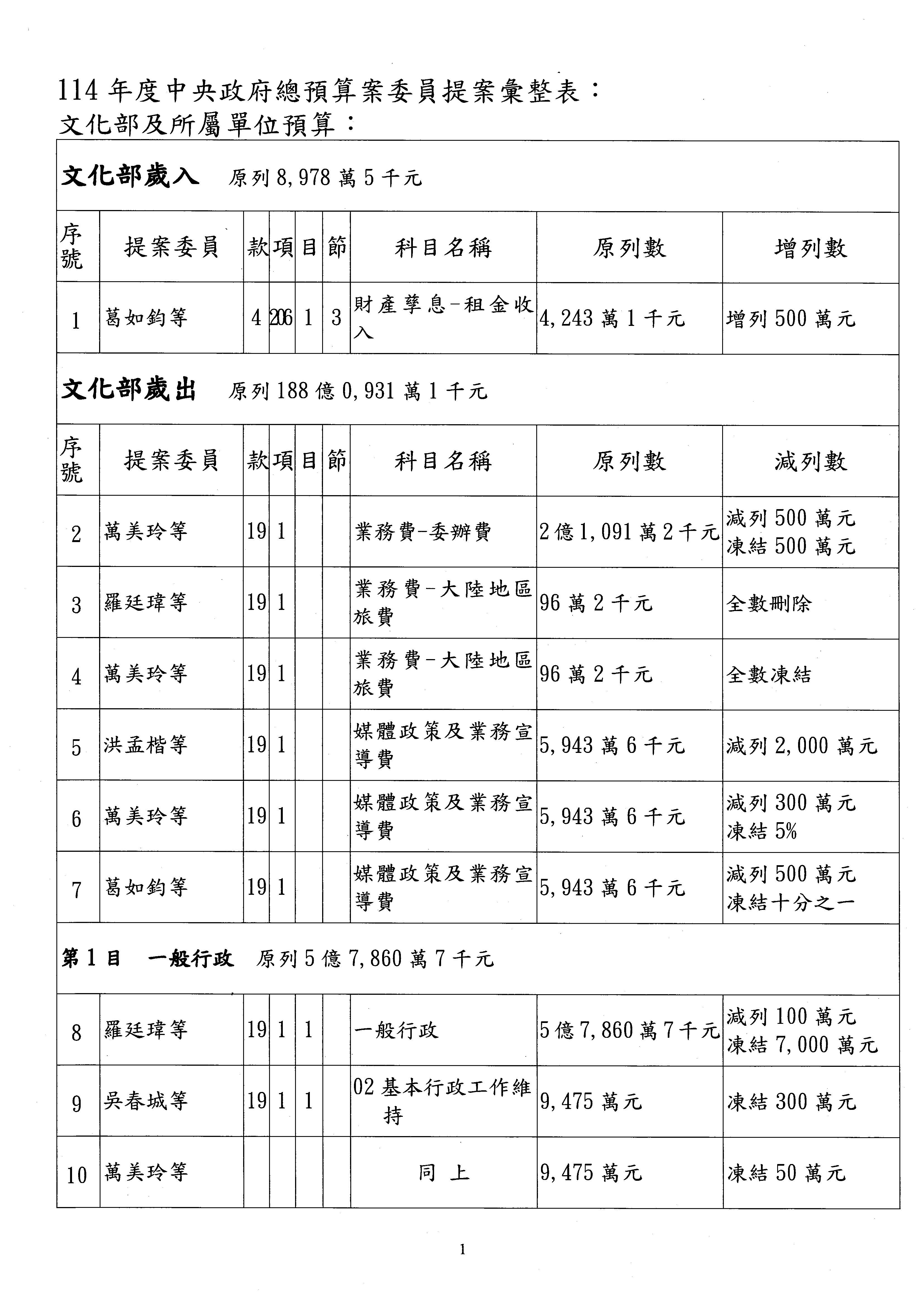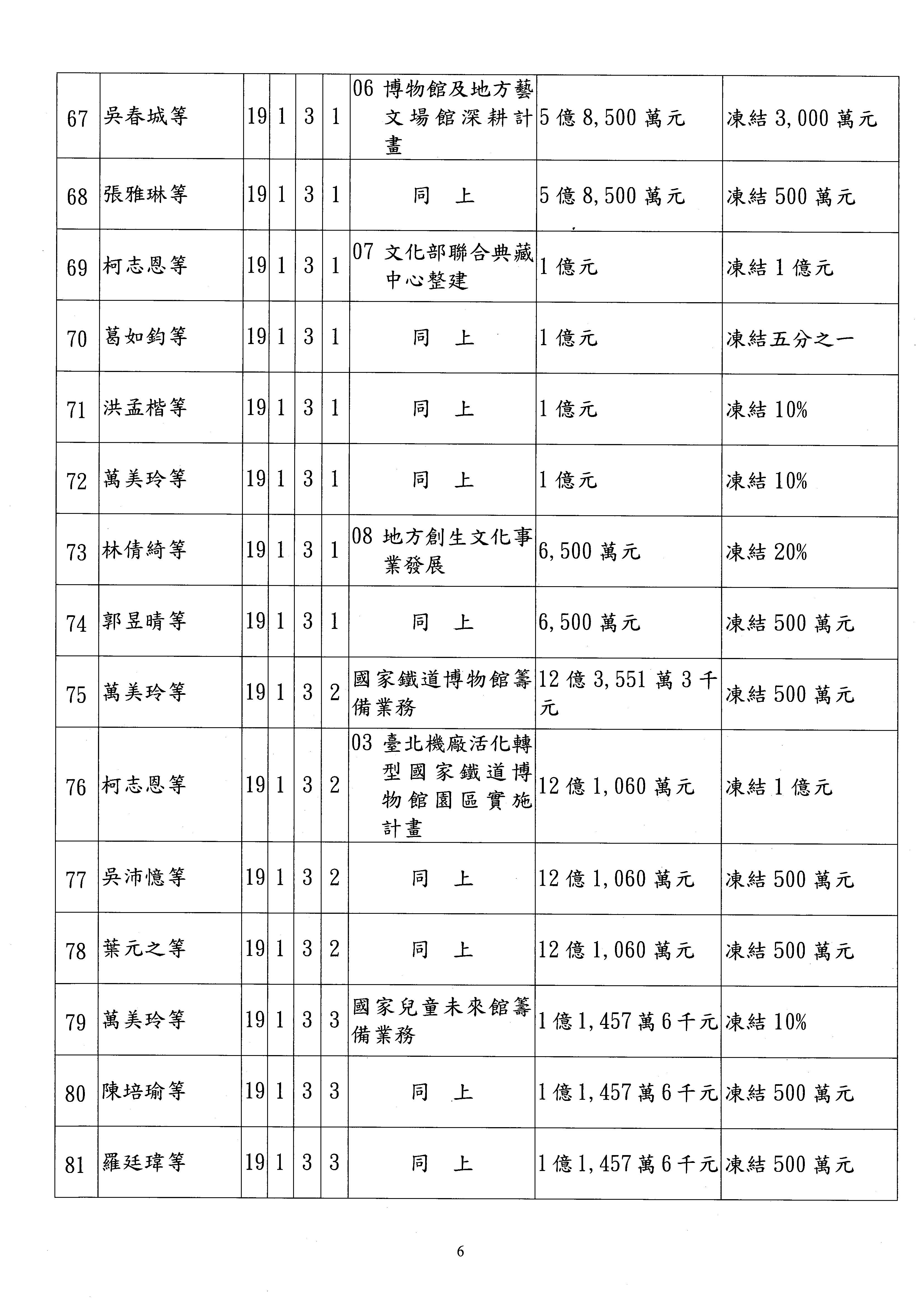 現在進行預算案的審查,請議事人員宣讀預算數及提案內容,文化部及所屬單位預算案計432案;國立文化機構作業基金附屬單位預算案計6案;文化發展基金附屬單位預算案計6案;行政法人國家表演藝術中心、文化內容策進院、國家電影及視聽文化中心預算案計39案,並進行討論與協商,討論時如有新增或修正文字之主決議請議事人員一併宣讀。