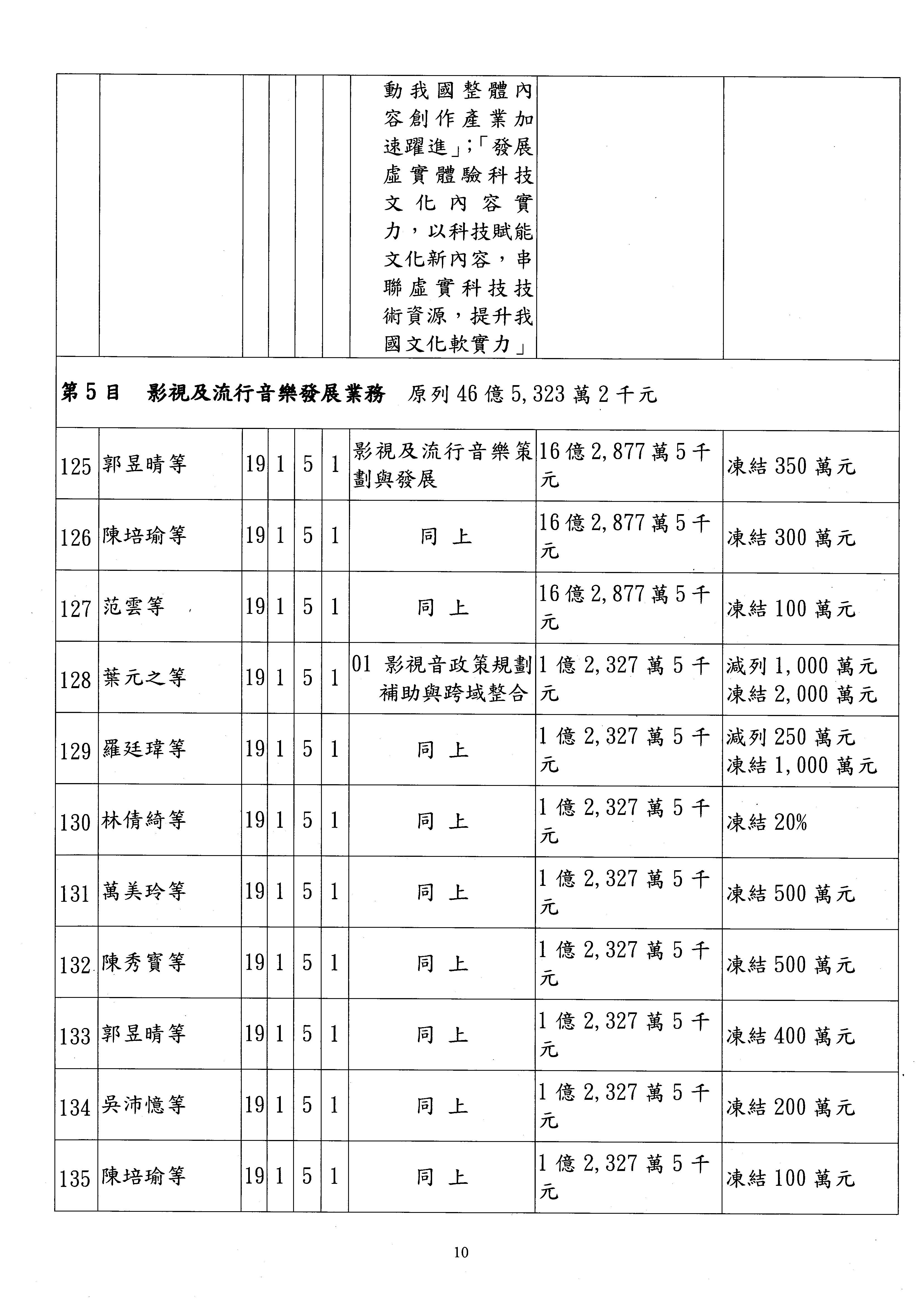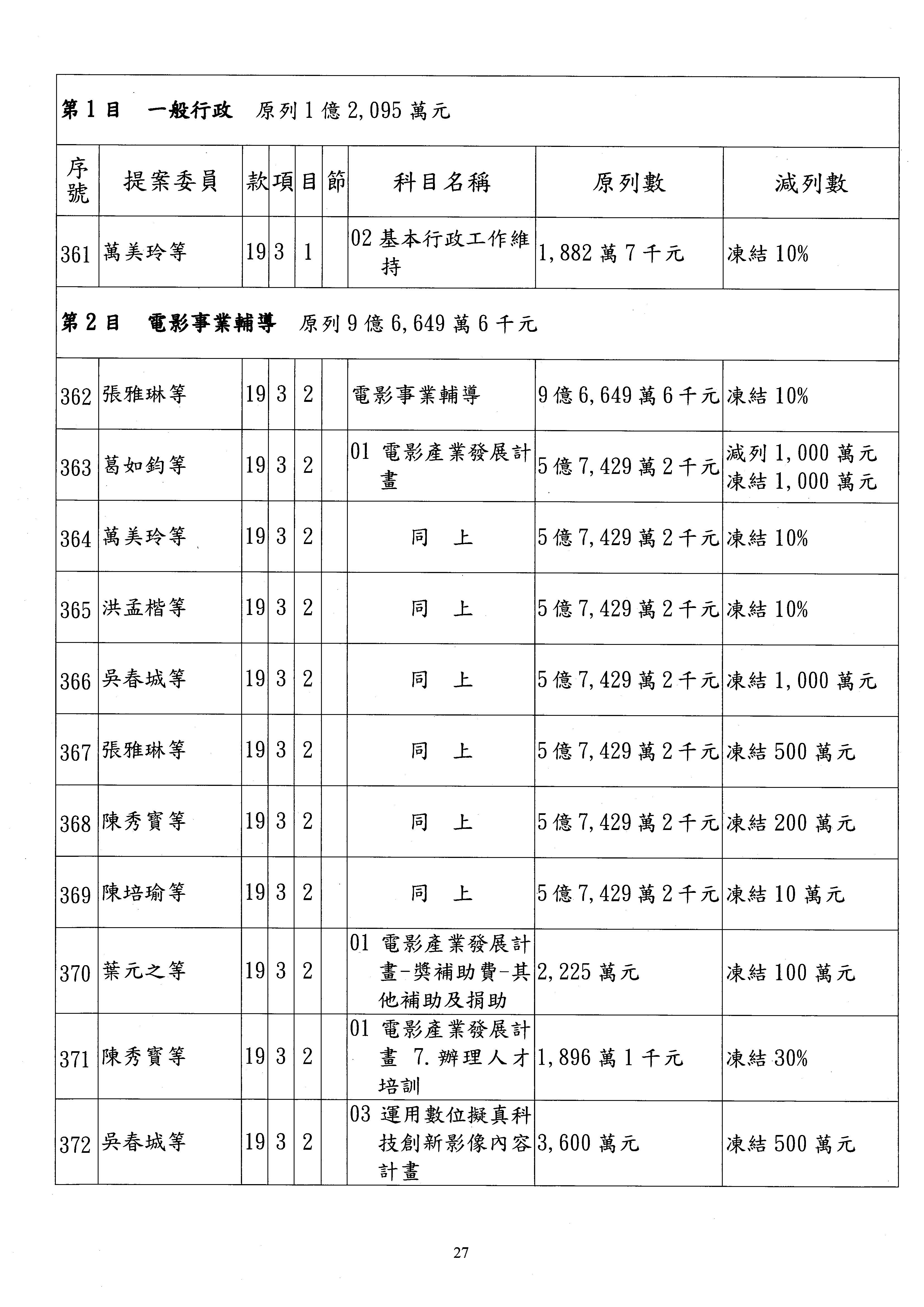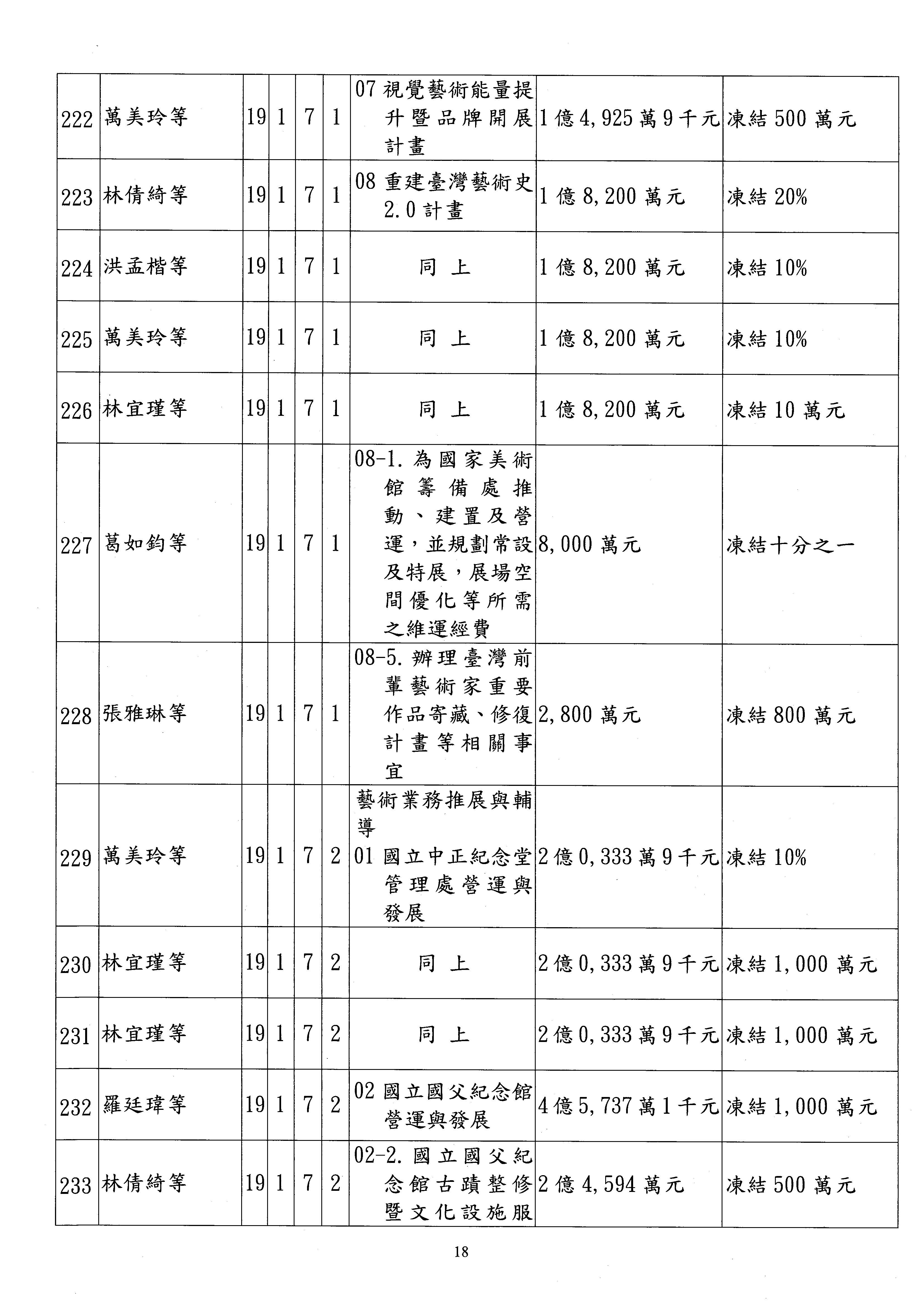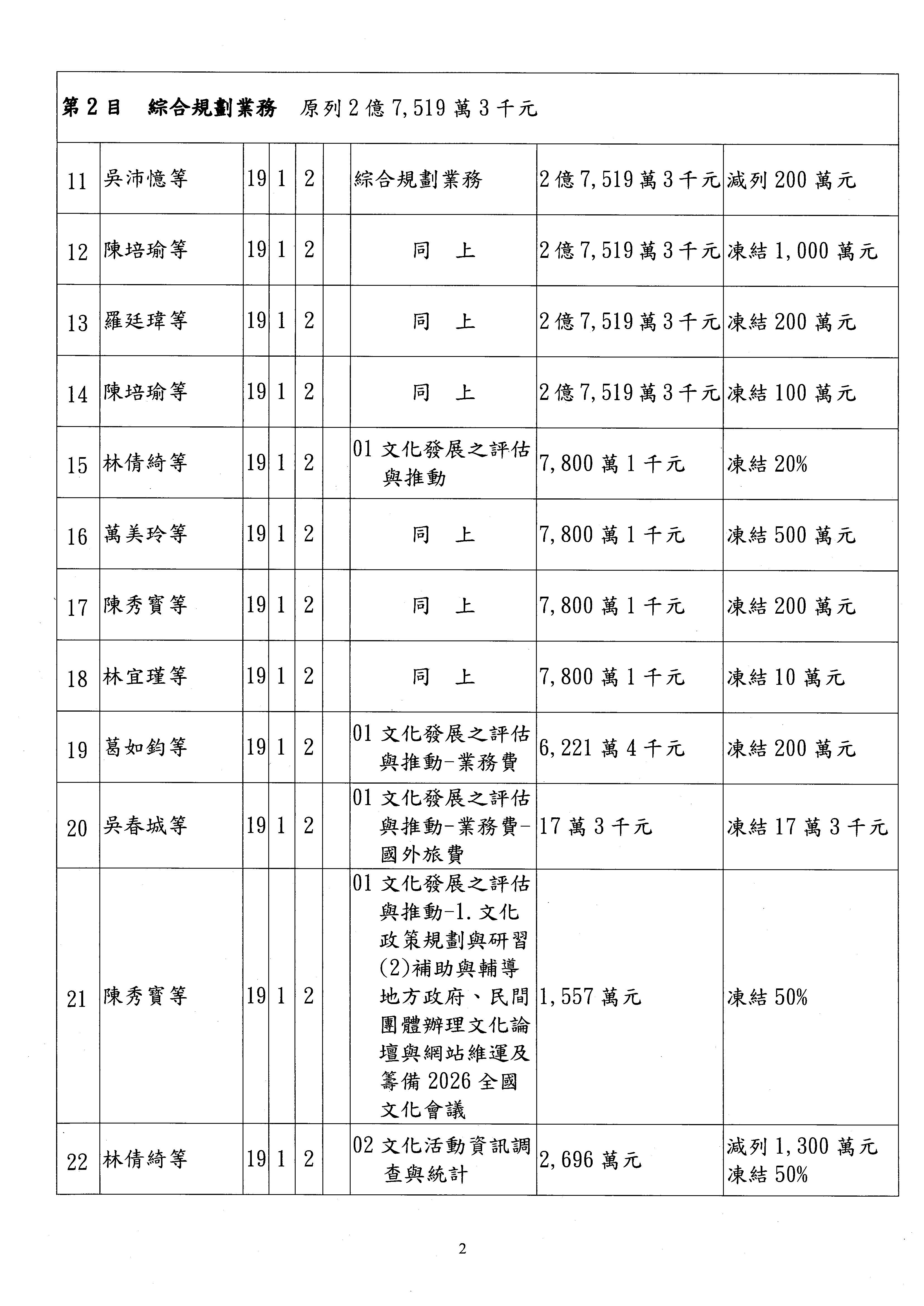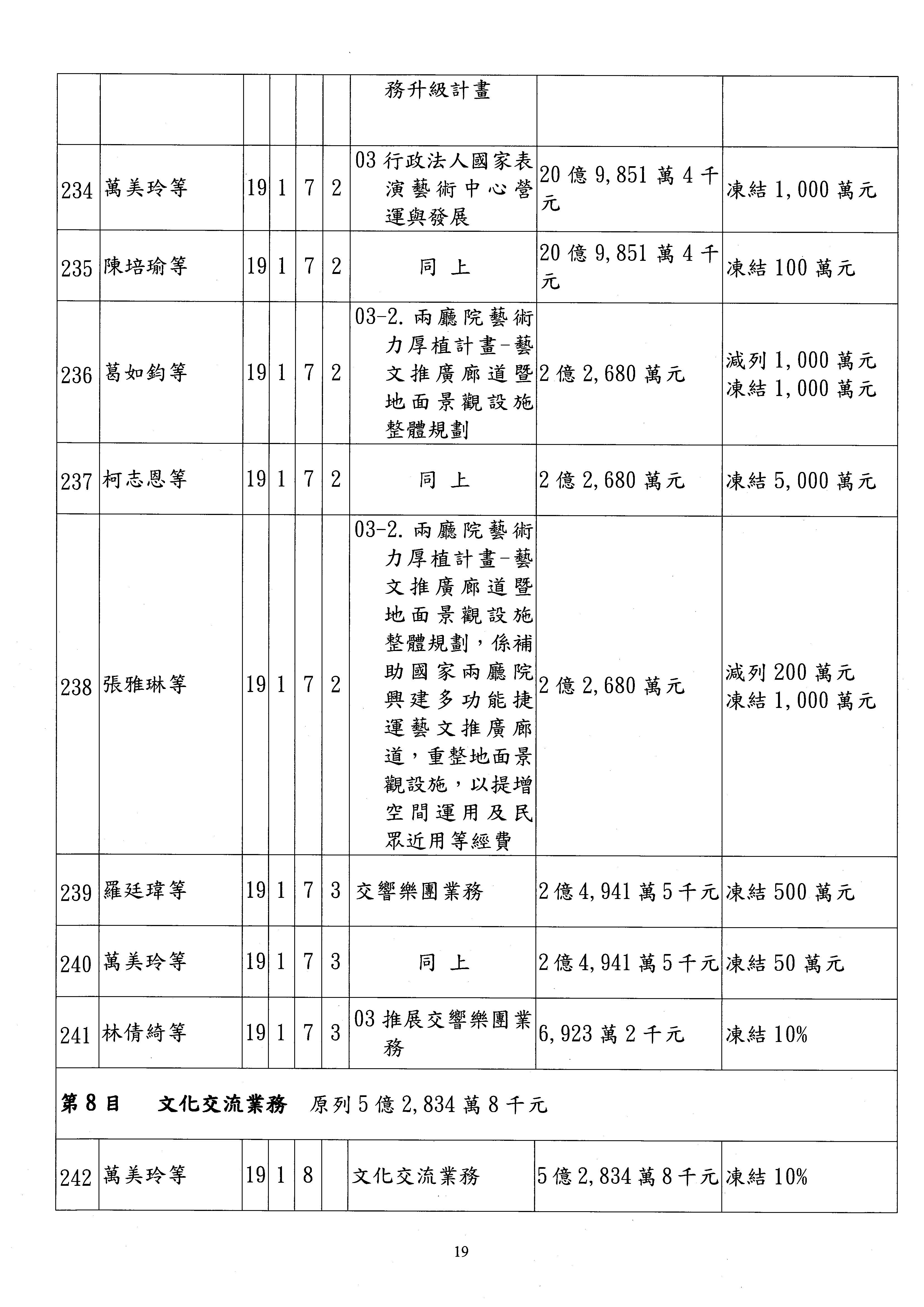 現在進行預算案的審查,請議事人員宣讀預算數及提案內容,文化部及所屬單位預算案計432案;國立文化機構作業基金附屬單位預算案計6案;文化發展基金附屬單位預算案計6案;行政法人國家表演藝術中心、文化內容策進院、國家電影及視聽文化中心預算案計39案,並進行討論與協商,討論時如有新增或修正文字之主決議請議事人員一併宣讀。