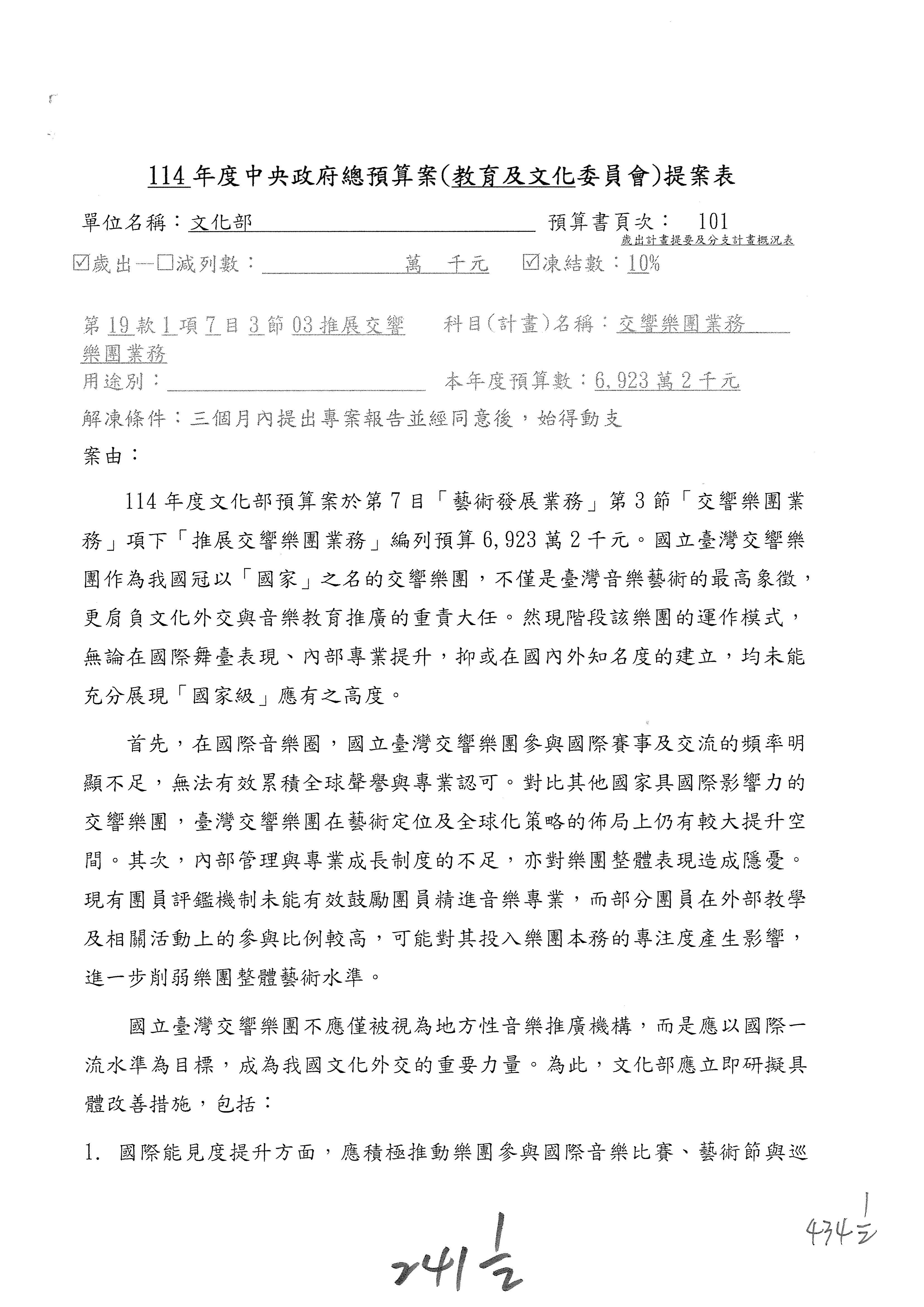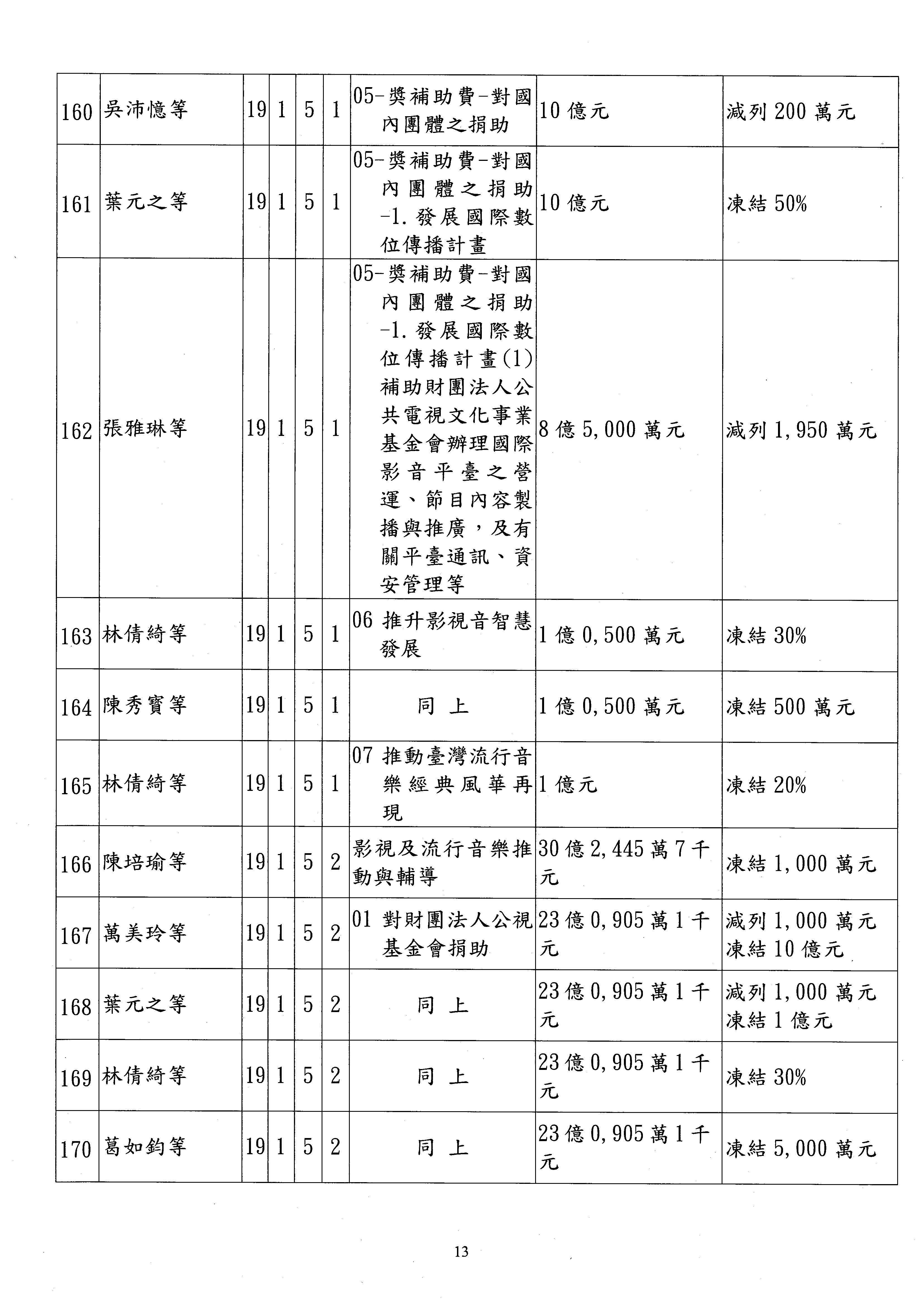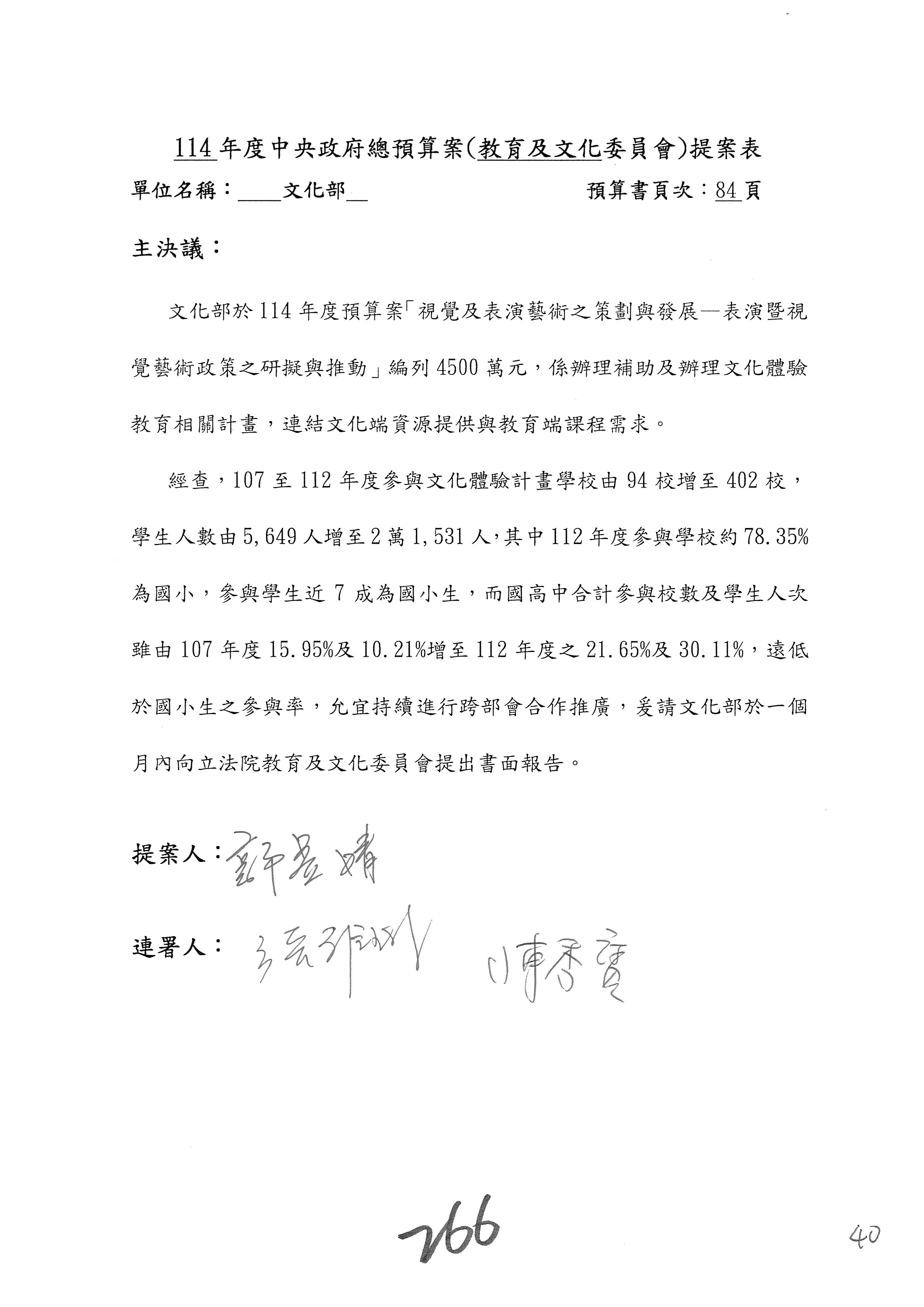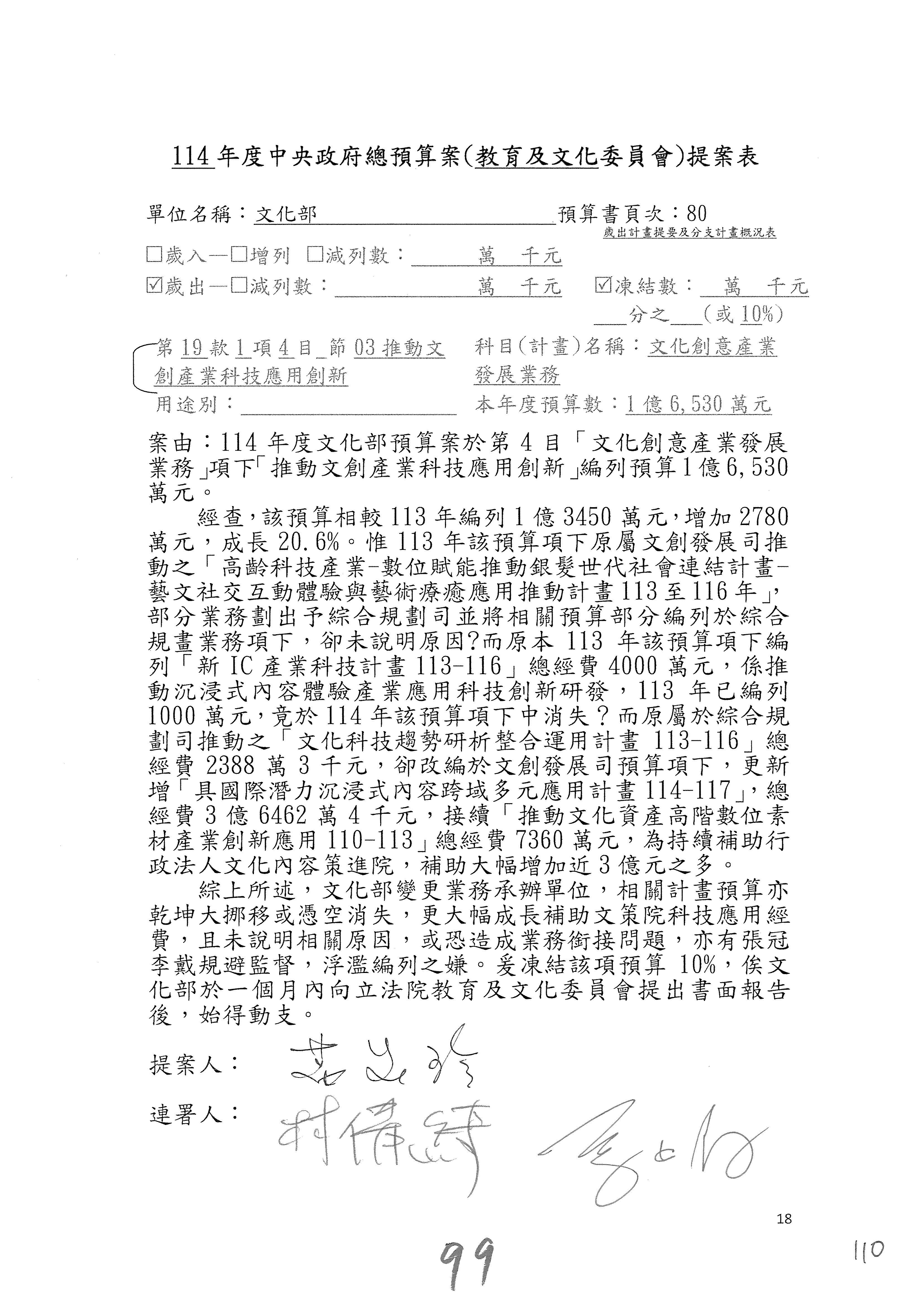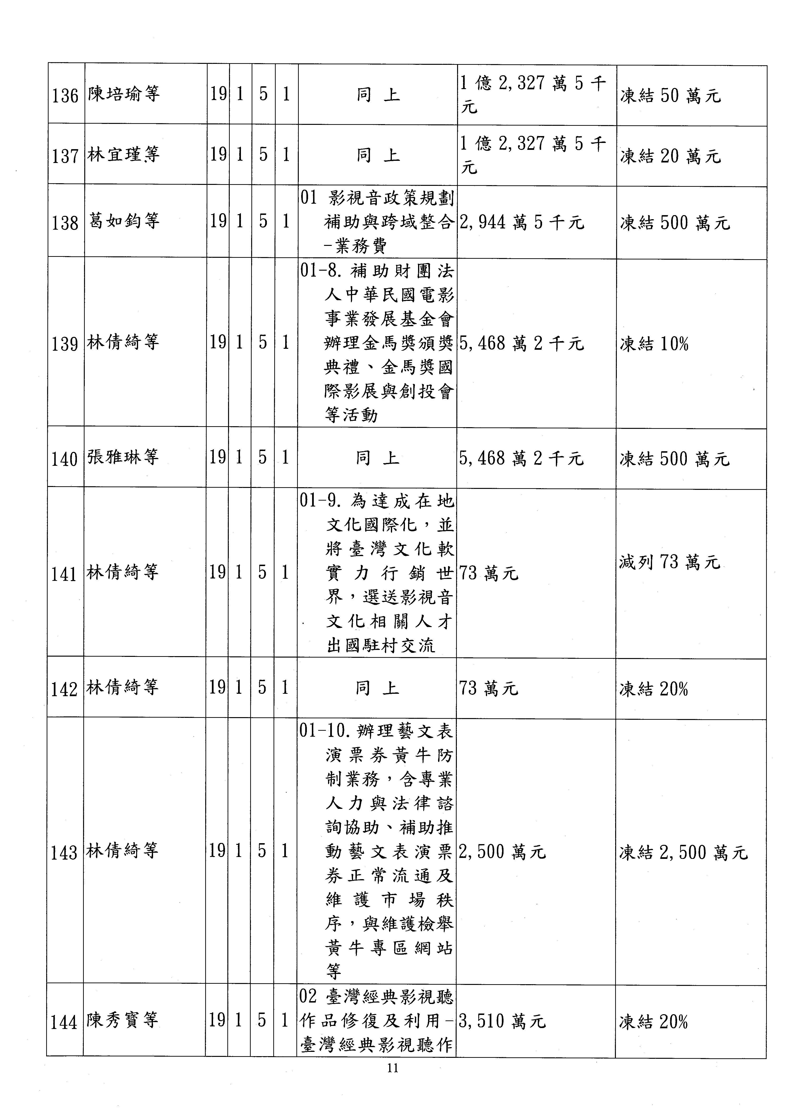 現在進行預算案的審查,請議事人員宣讀預算數及提案內容,文化部及所屬單位預算案計432案;國立文化機構作業基金附屬單位預算案計6案;文化發展基金附屬單位預算案計6案;行政法人國家表演藝術中心、文化內容策進院、國家電影及視聽文化中心預算案計39案,並進行討論與協商,討論時如有新增或修正文字之主決議請議事人員一併宣讀。