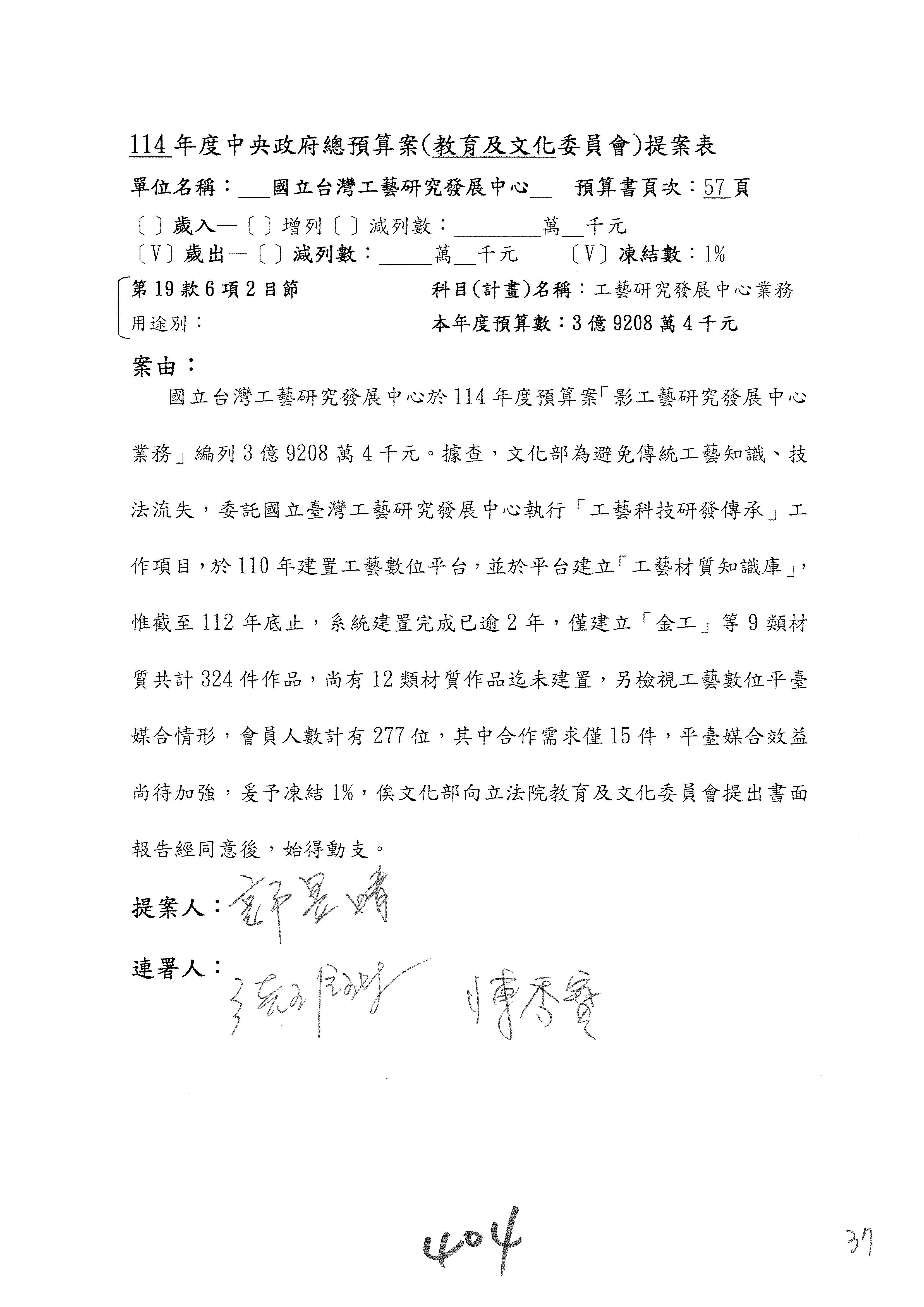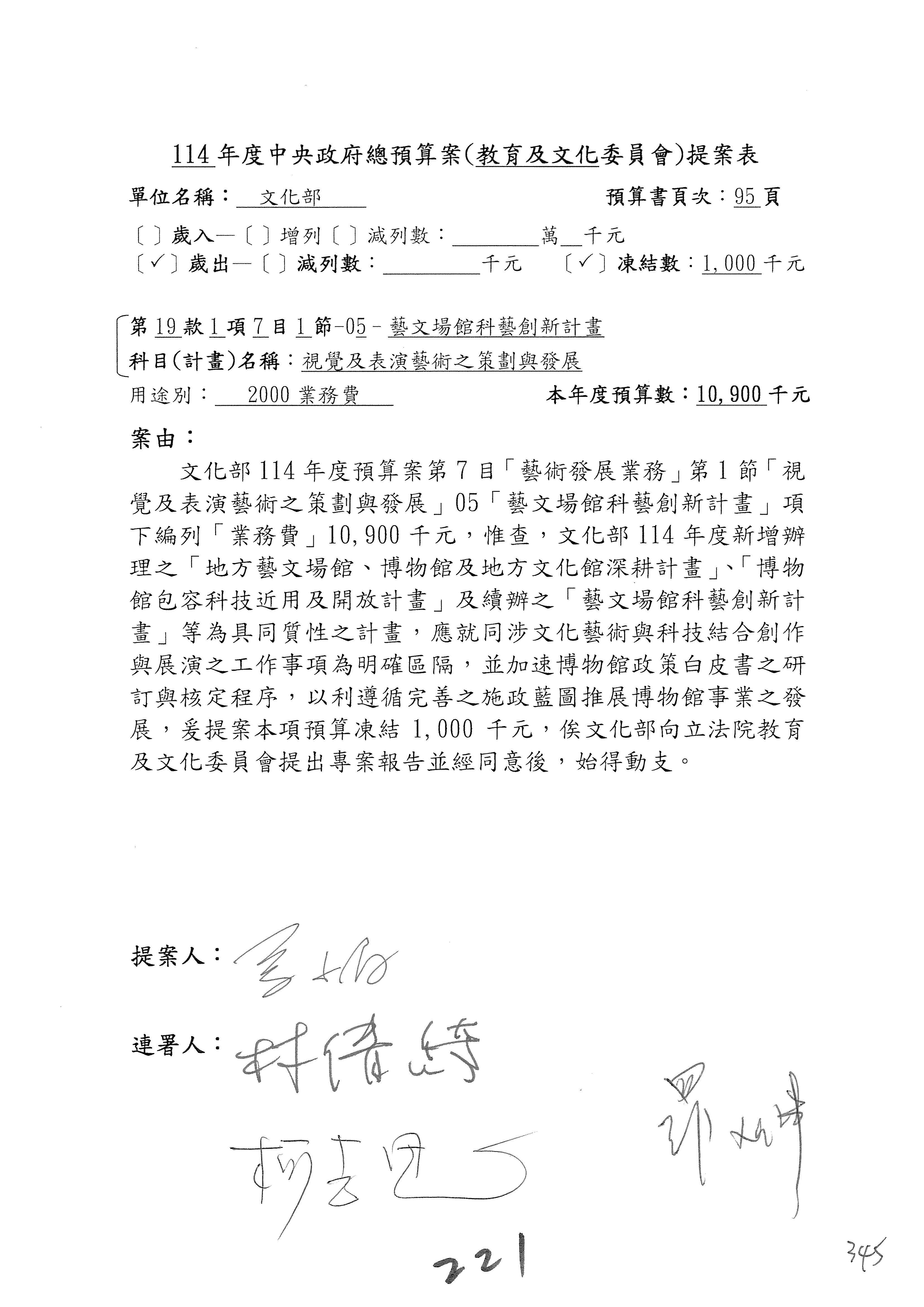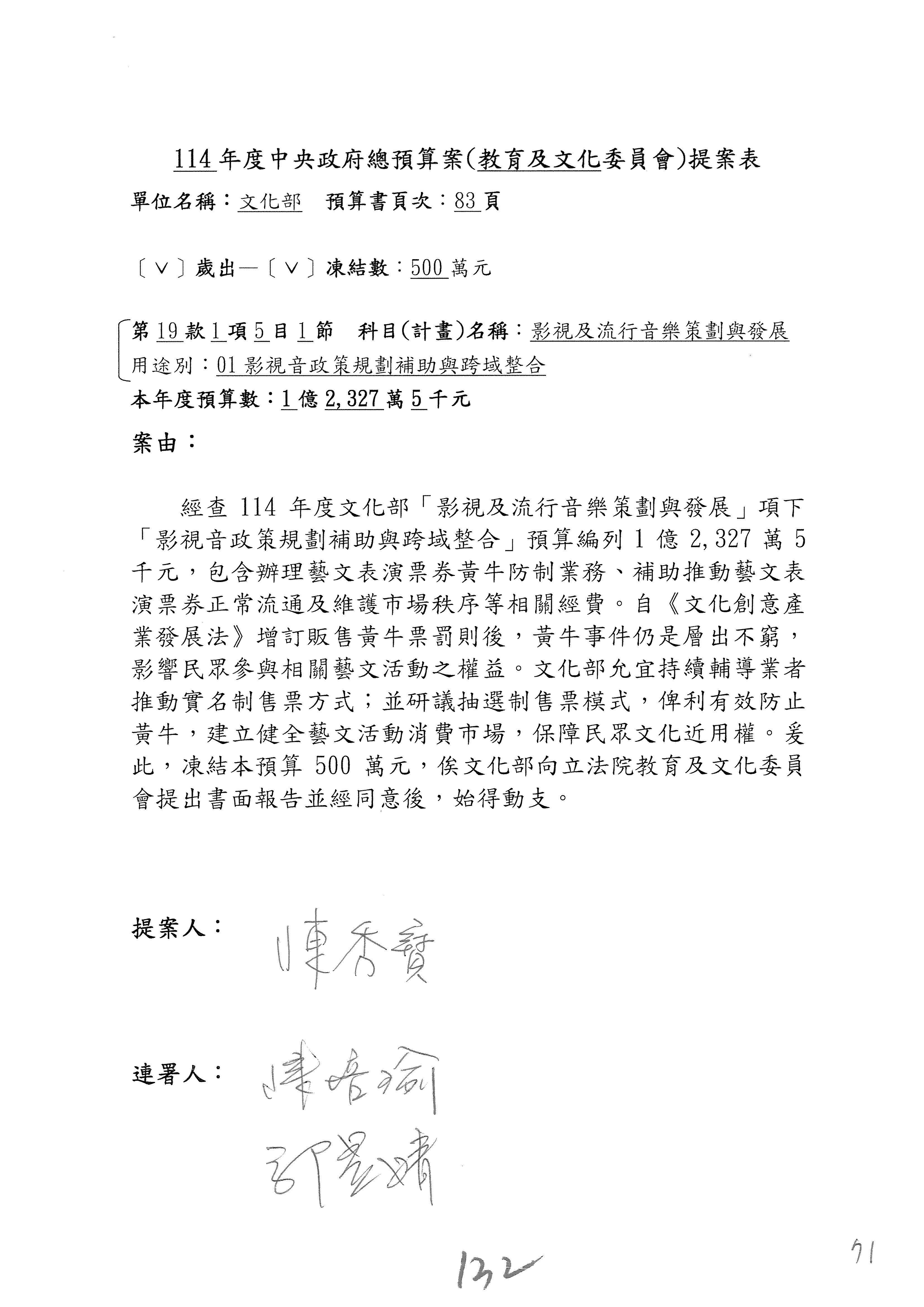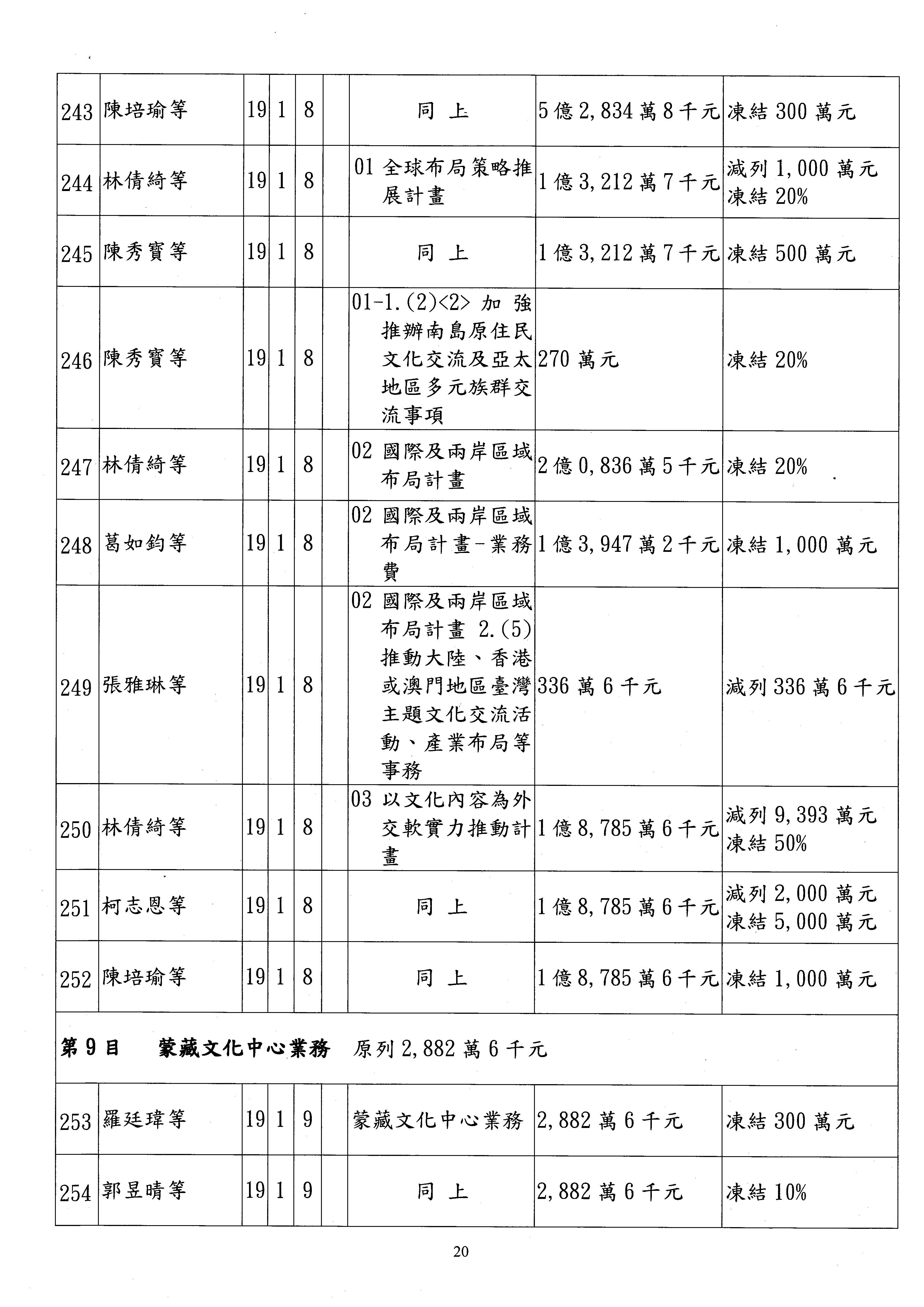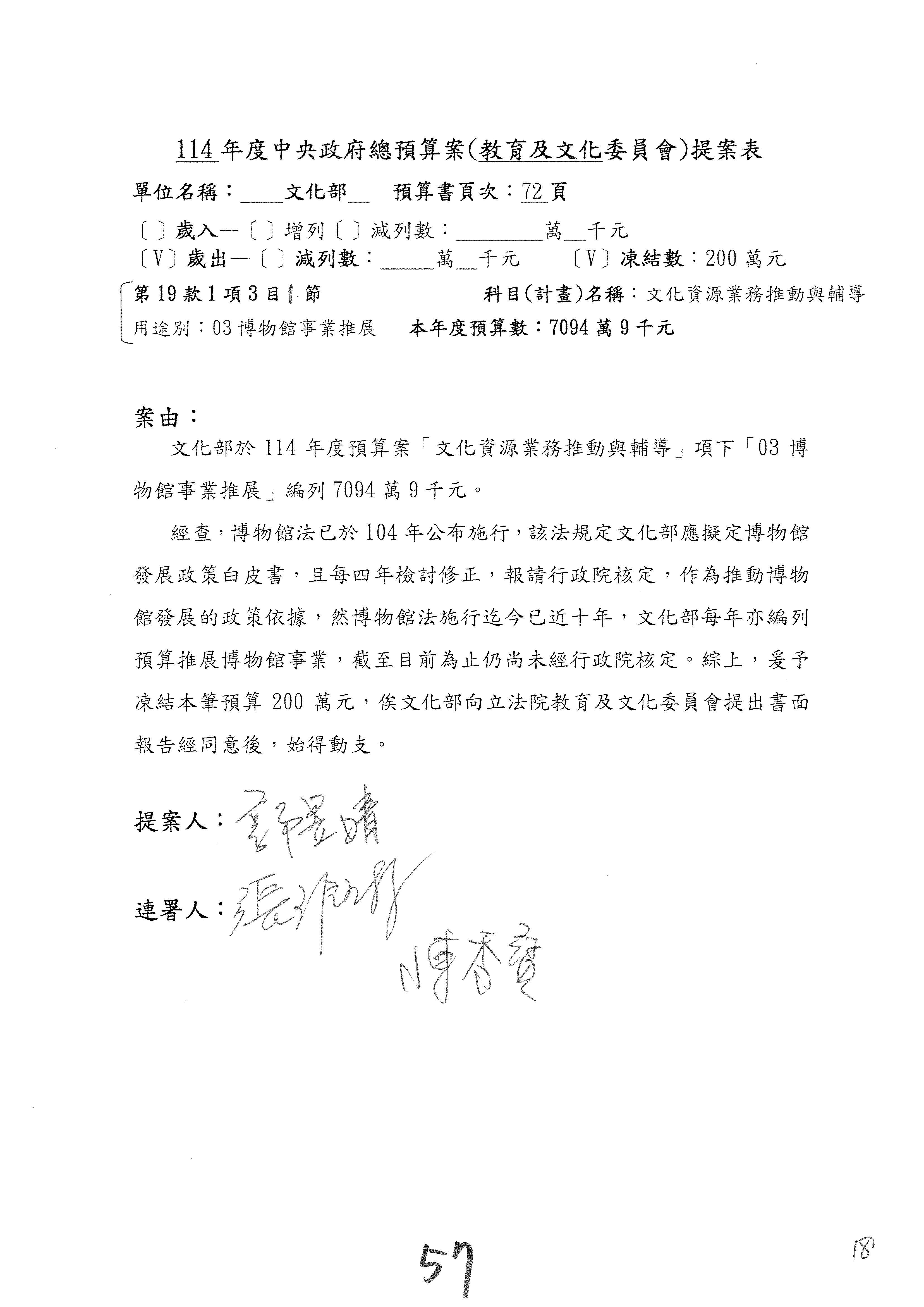 現在進行預算案的審查,請議事人員宣讀預算數及提案內容,文化部及所屬單位預算案計432案;國立文化機構作業基金附屬單位預算案計6案;文化發展基金附屬單位預算案計6案;行政法人國家表演藝術中心、文化內容策進院、國家電影及視聽文化中心預算案計39案,並進行討論與協商,討論時如有新增或修正文字之主決議請議事人員一併宣讀。