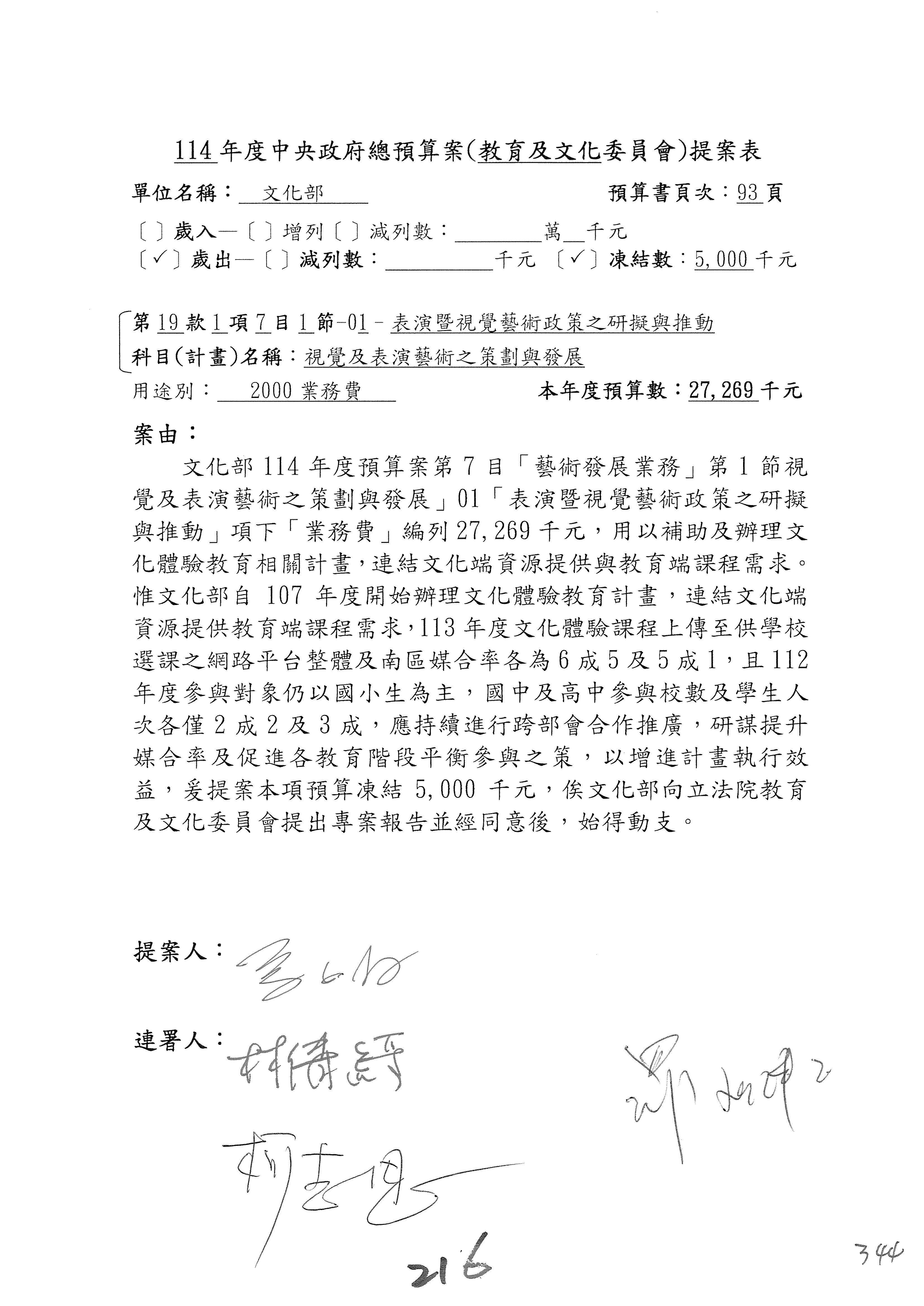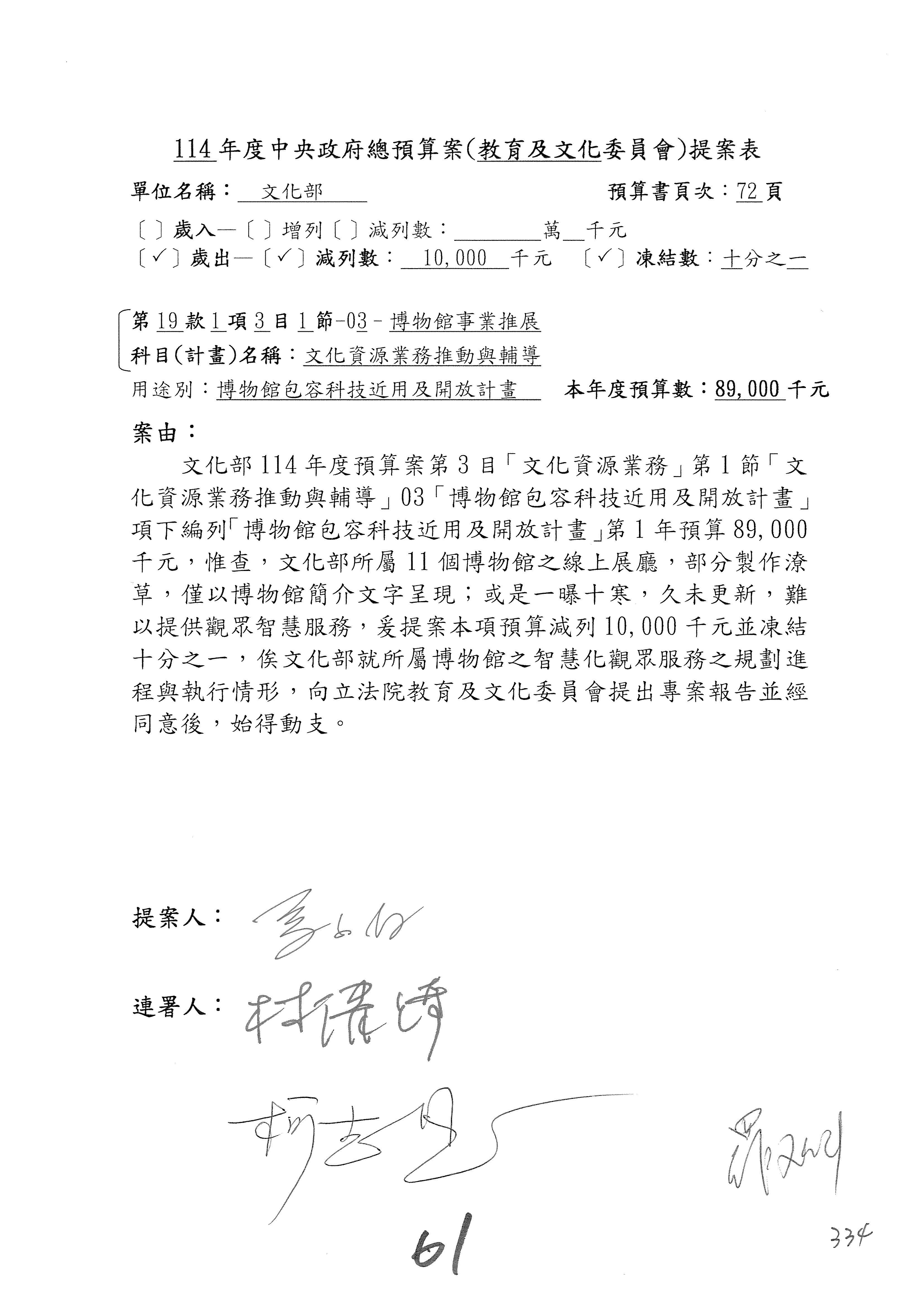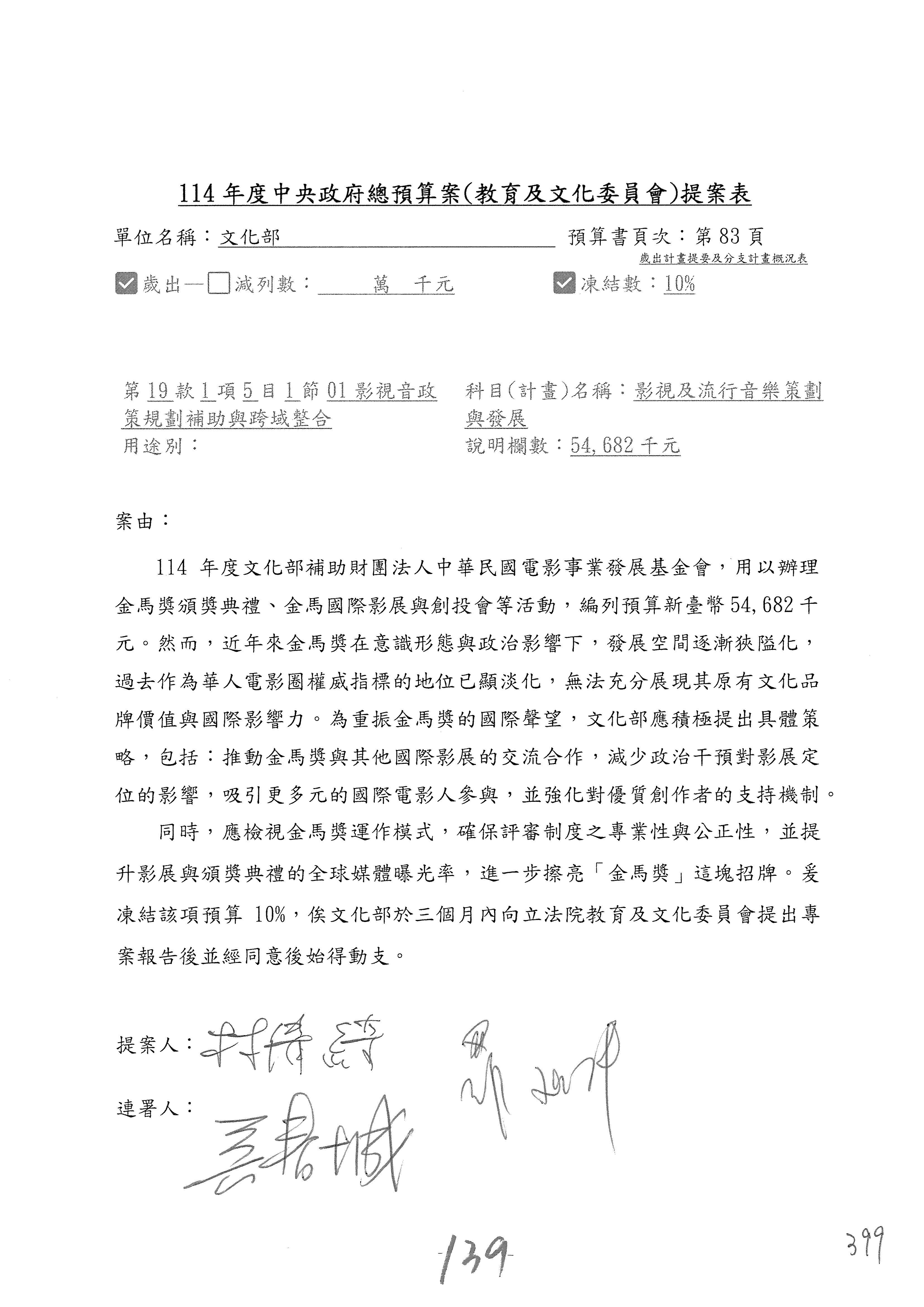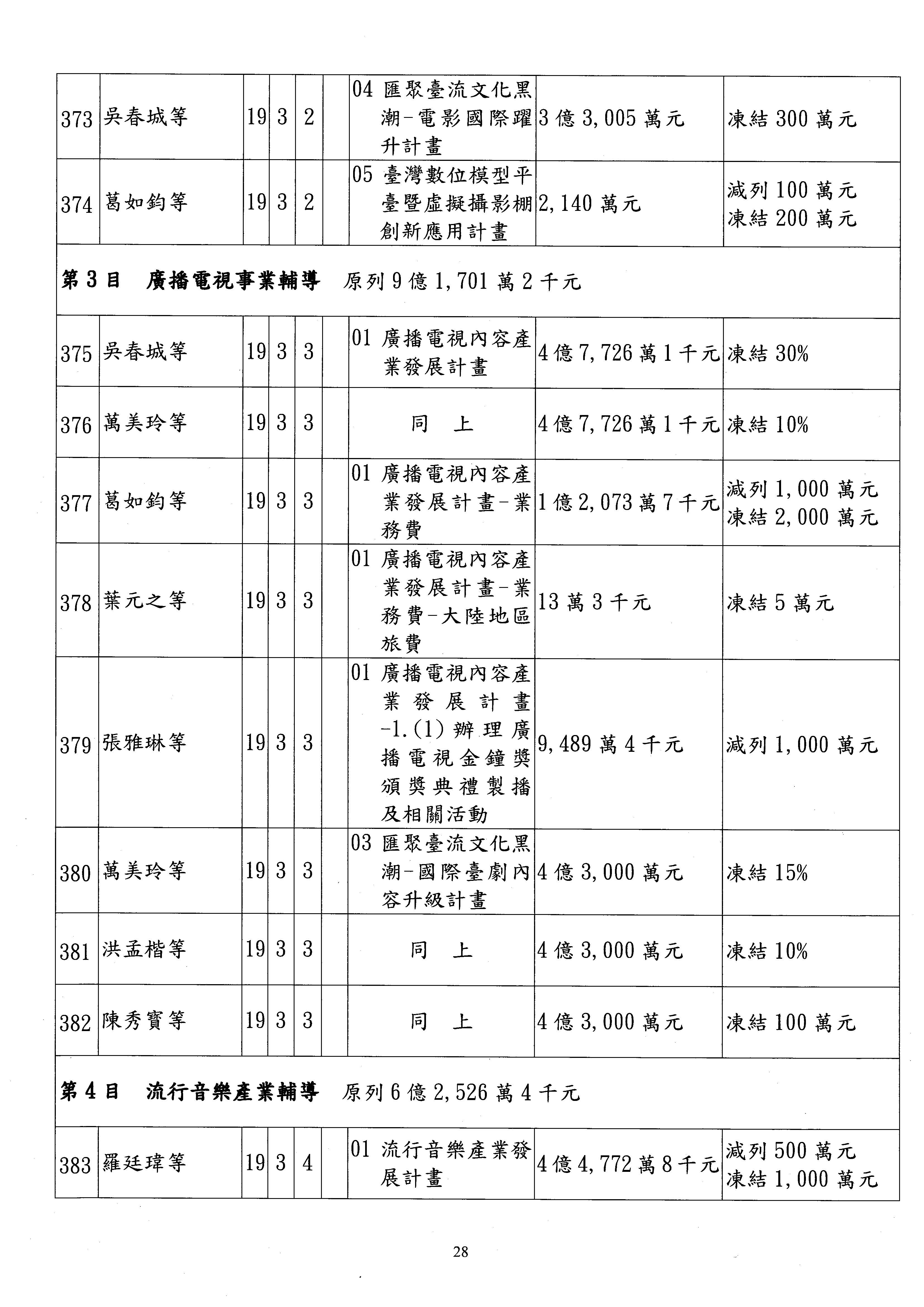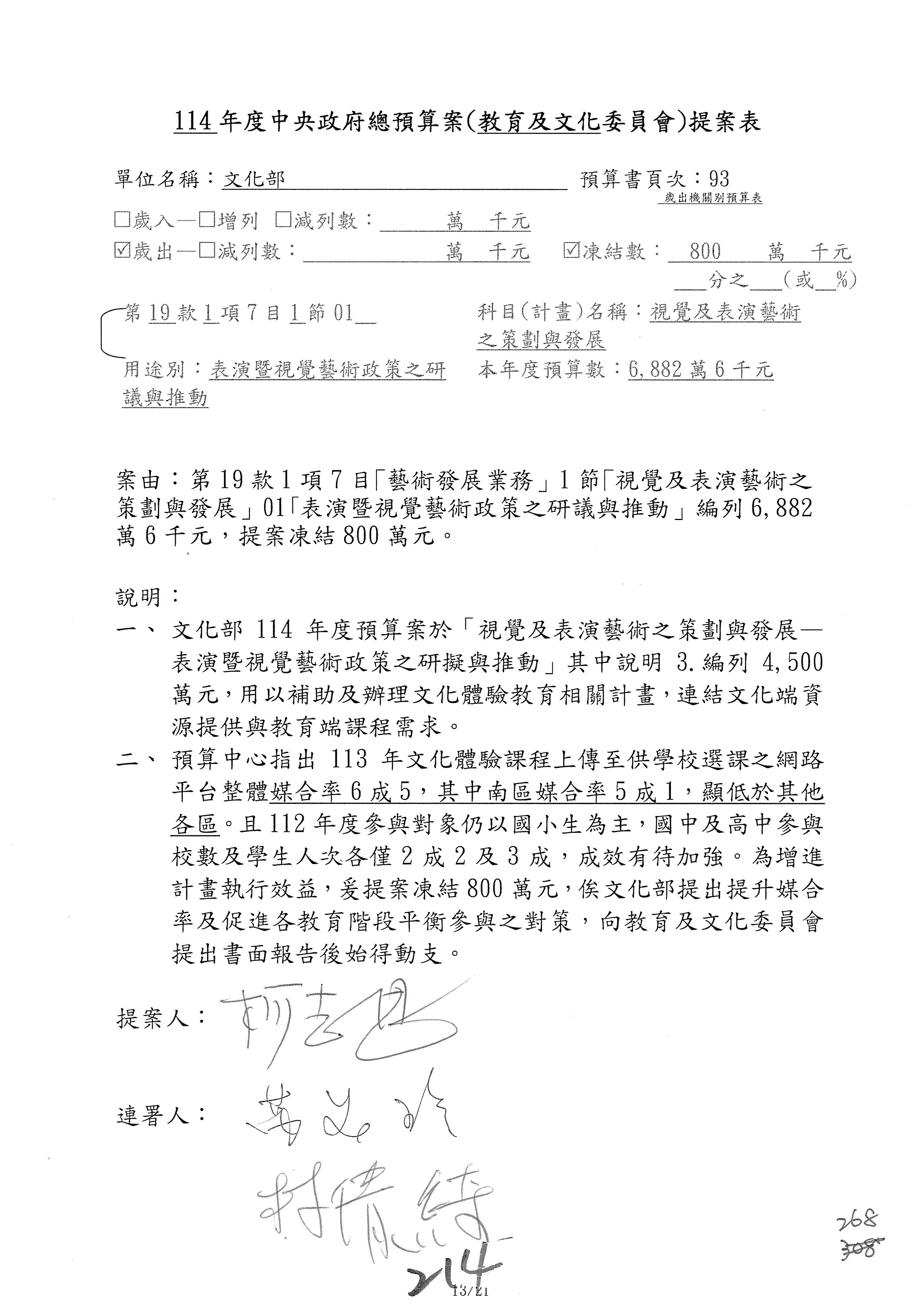 現在進行預算案的審查,請議事人員宣讀預算數及提案內容,文化部及所屬單位預算案計432案;國立文化機構作業基金附屬單位預算案計6案;文化發展基金附屬單位預算案計6案;行政法人國家表演藝術中心、文化內容策進院、國家電影及視聽文化中心預算案計39案,並進行討論與協商,討論時如有新增或修正文字之主決議請議事人員一併宣讀。