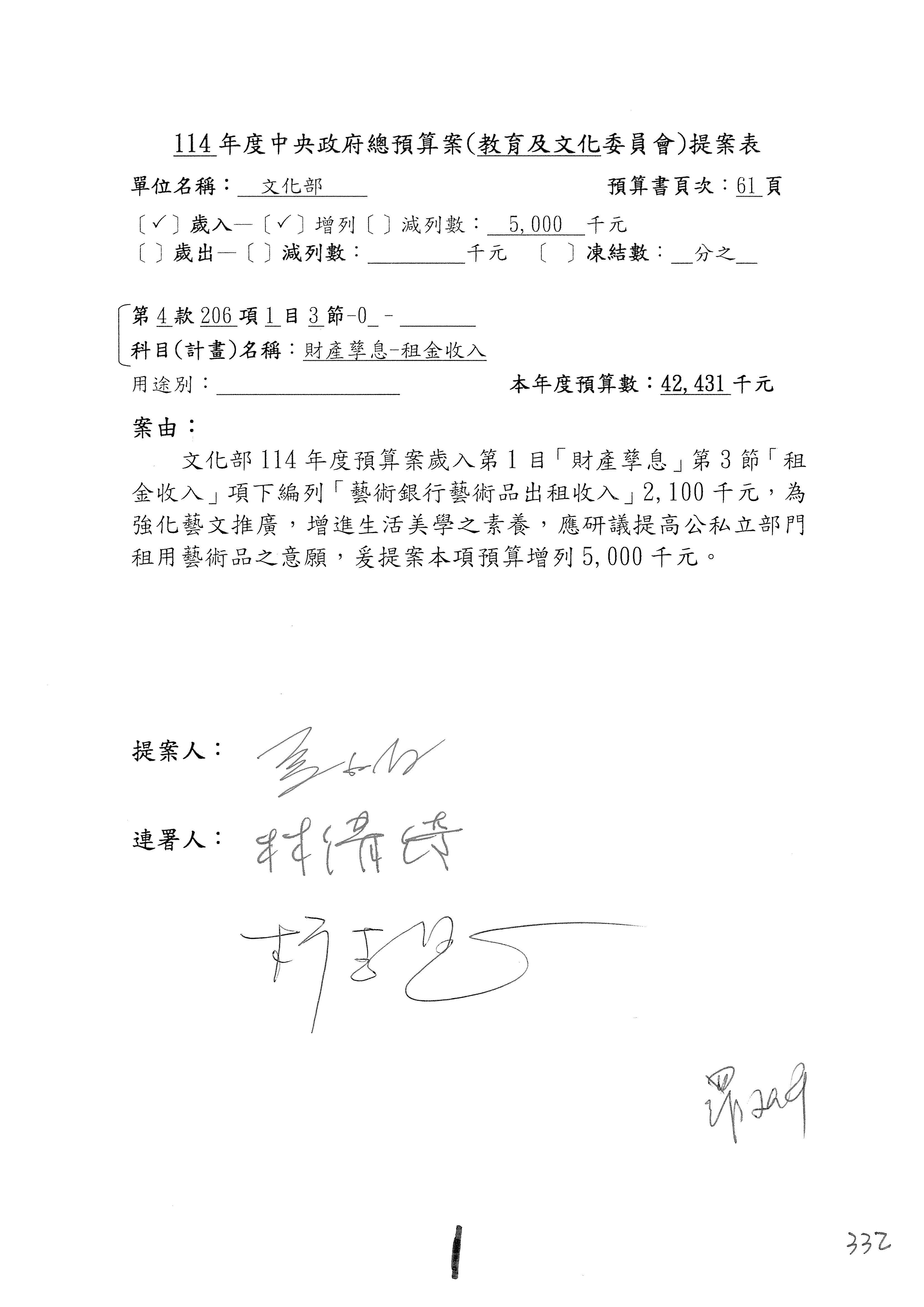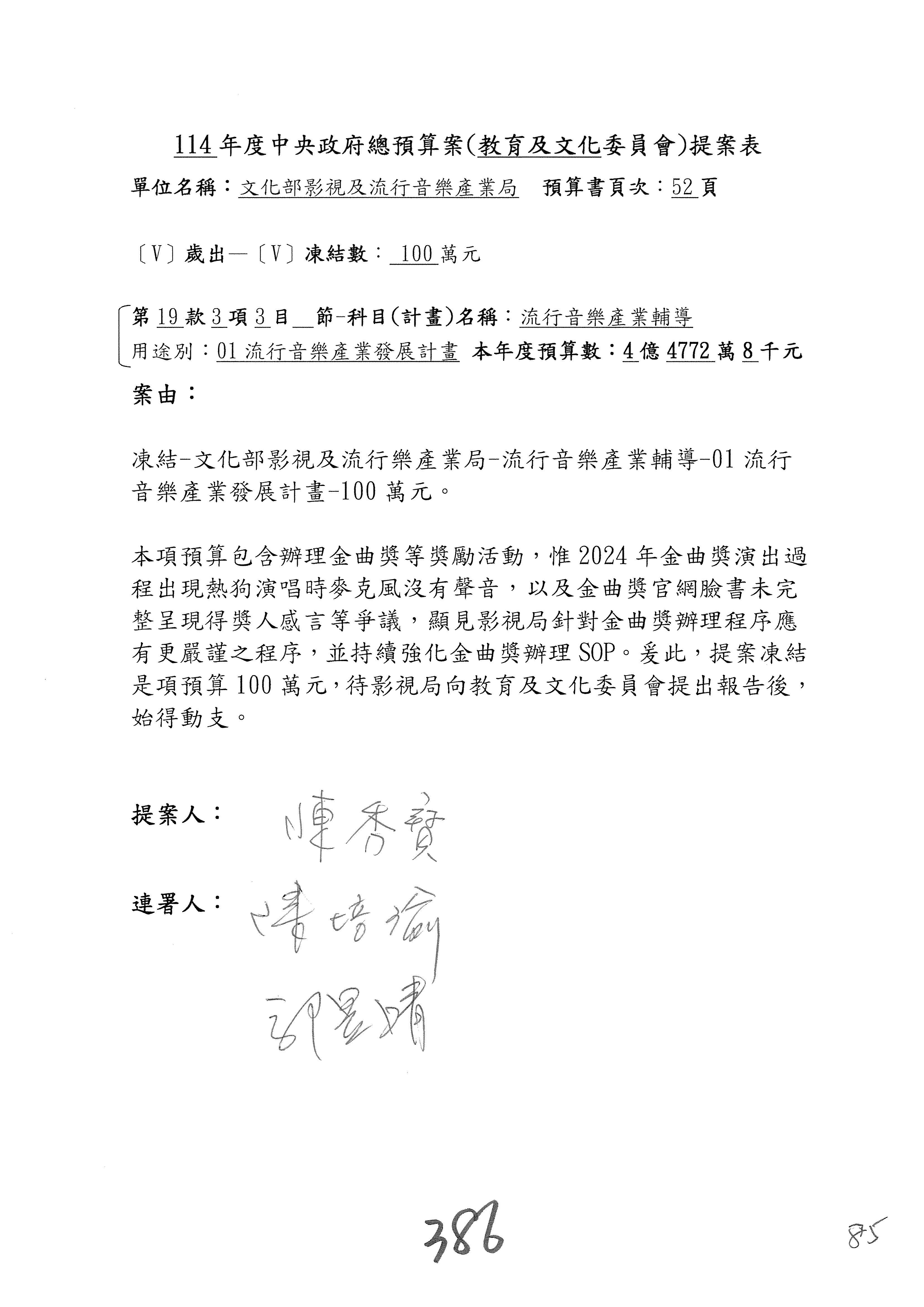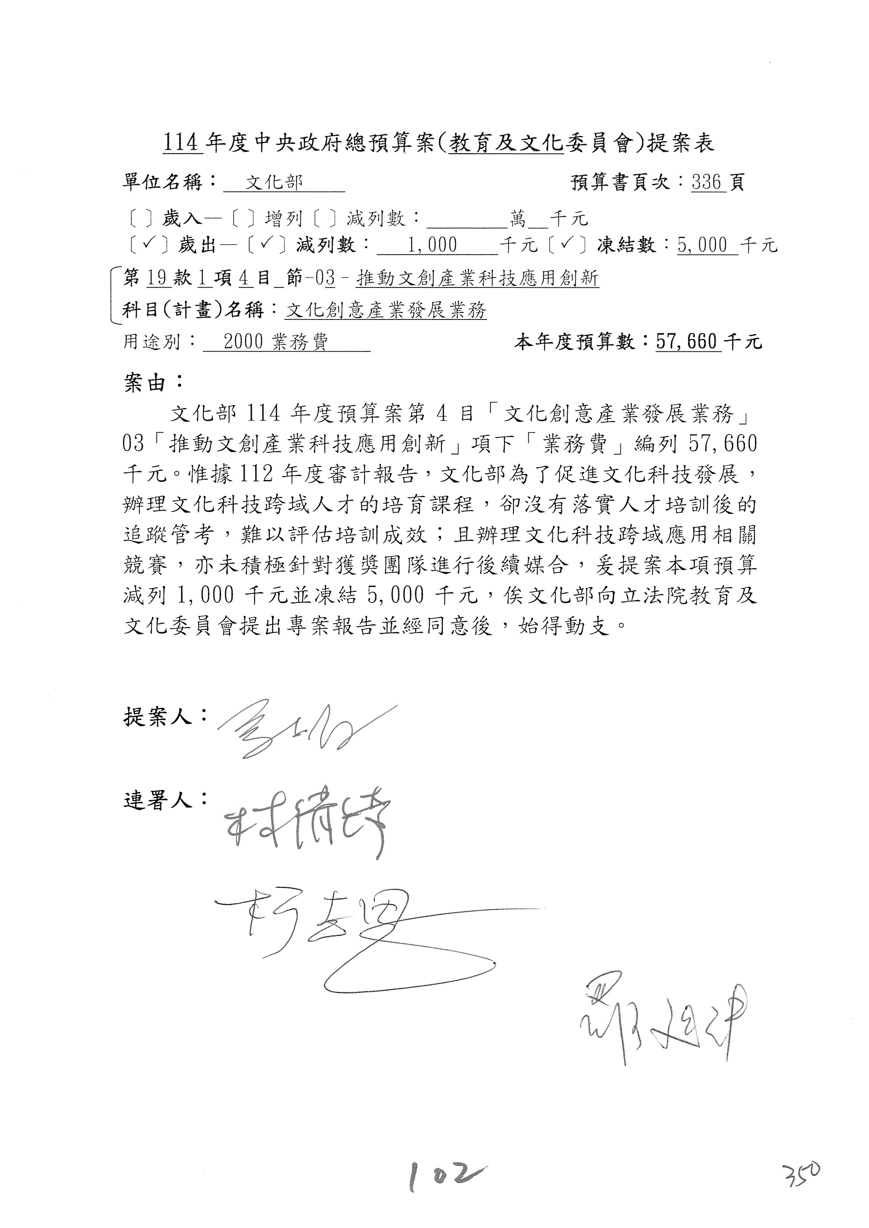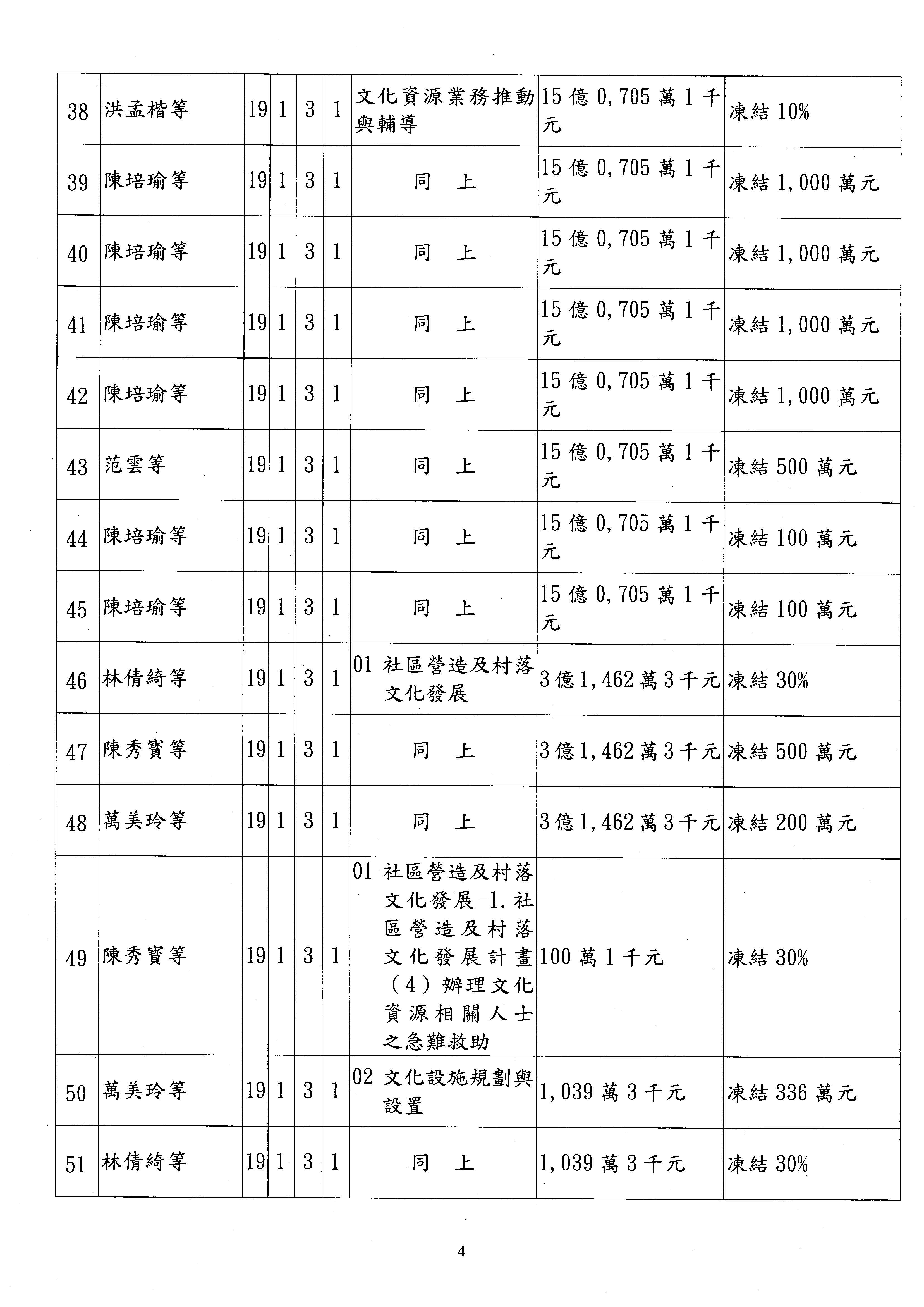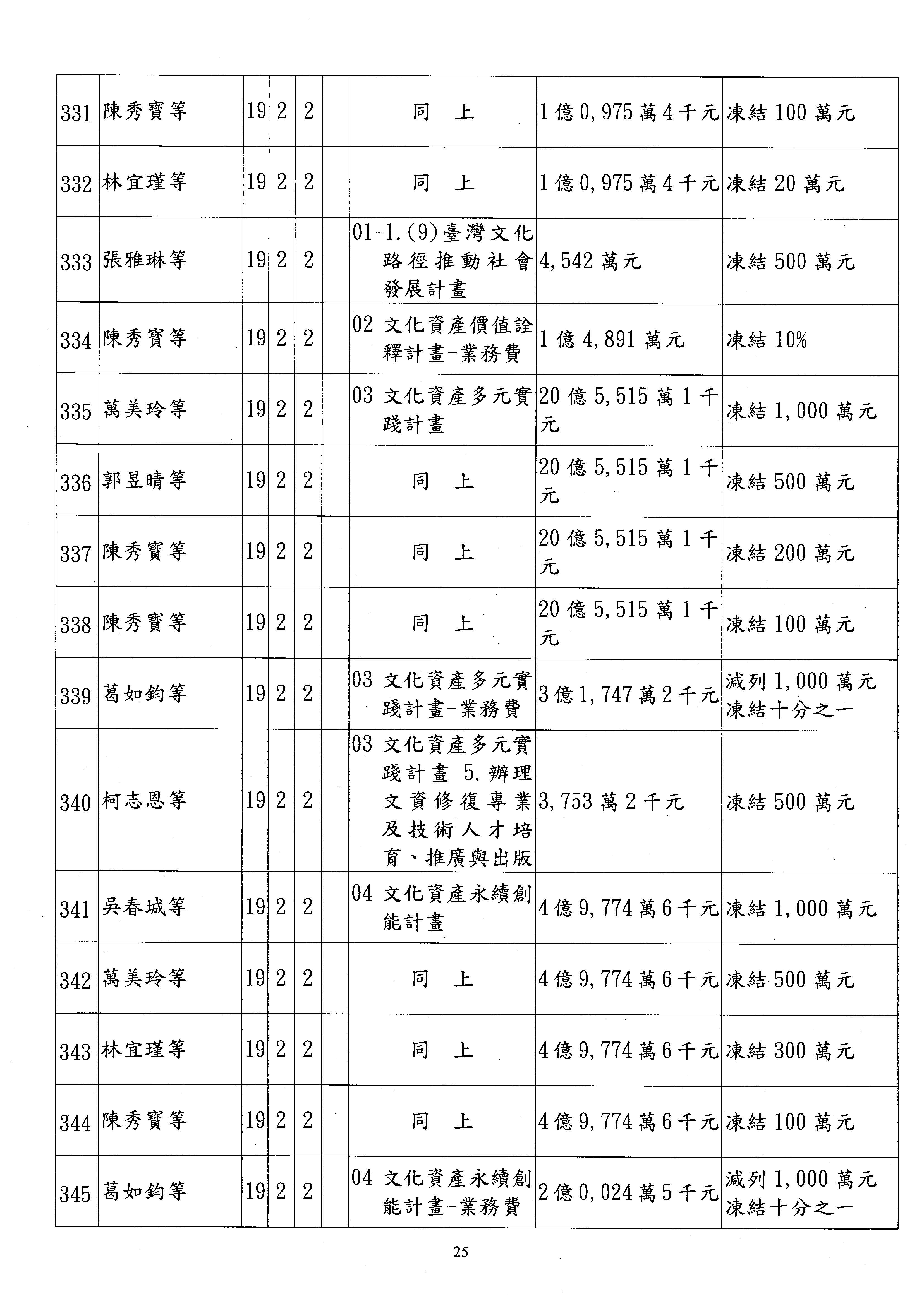 現在進行預算案的審查,請議事人員宣讀預算數及提案內容,文化部及所屬單位預算案計432案;國立文化機構作業基金附屬單位預算案計6案;文化發展基金附屬單位預算案計6案;行政法人國家表演藝術中心、文化內容策進院、國家電影及視聽文化中心預算案計39案,並進行討論與協商,討論時如有新增或修正文字之主決議請議事人員一併宣讀。