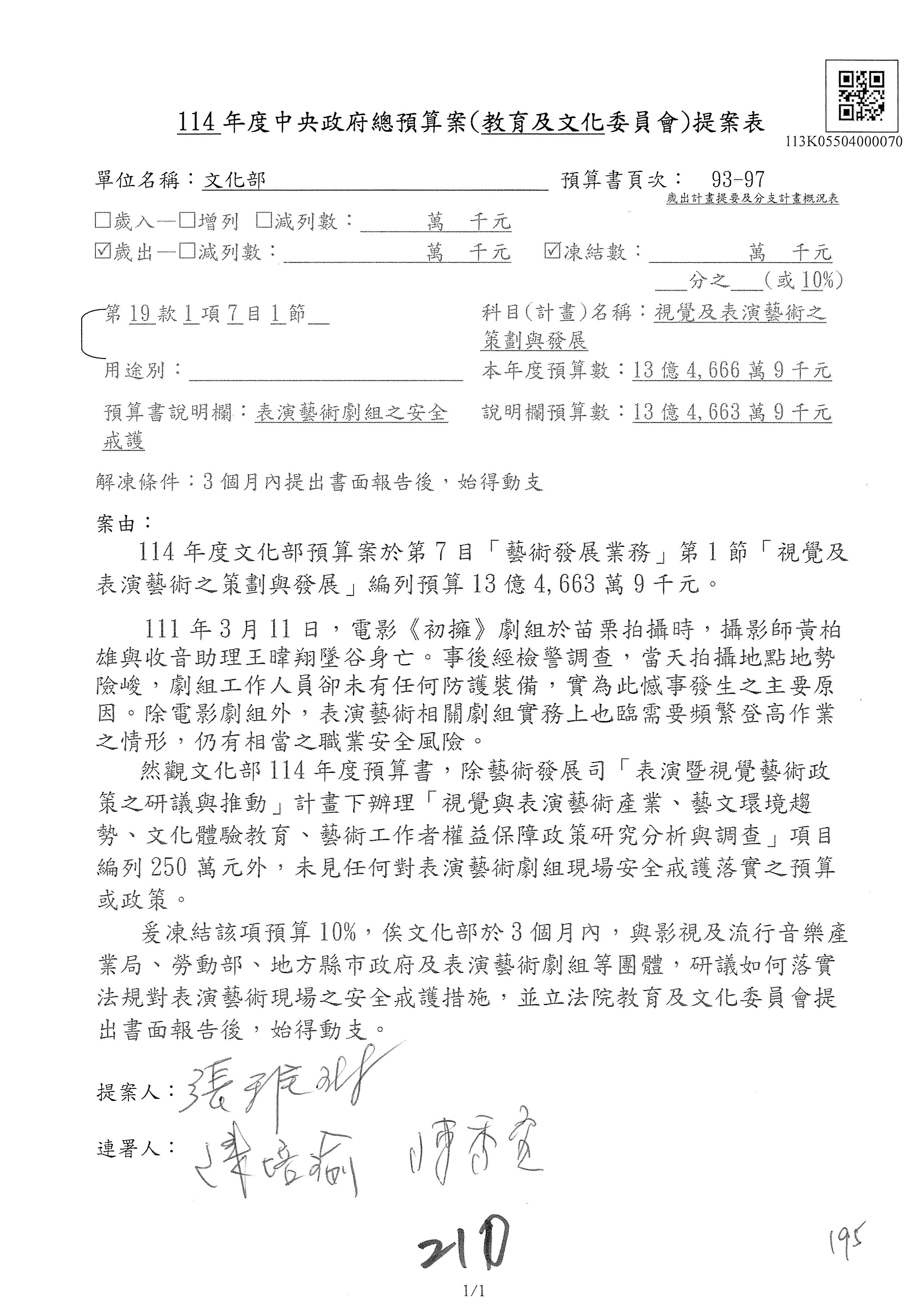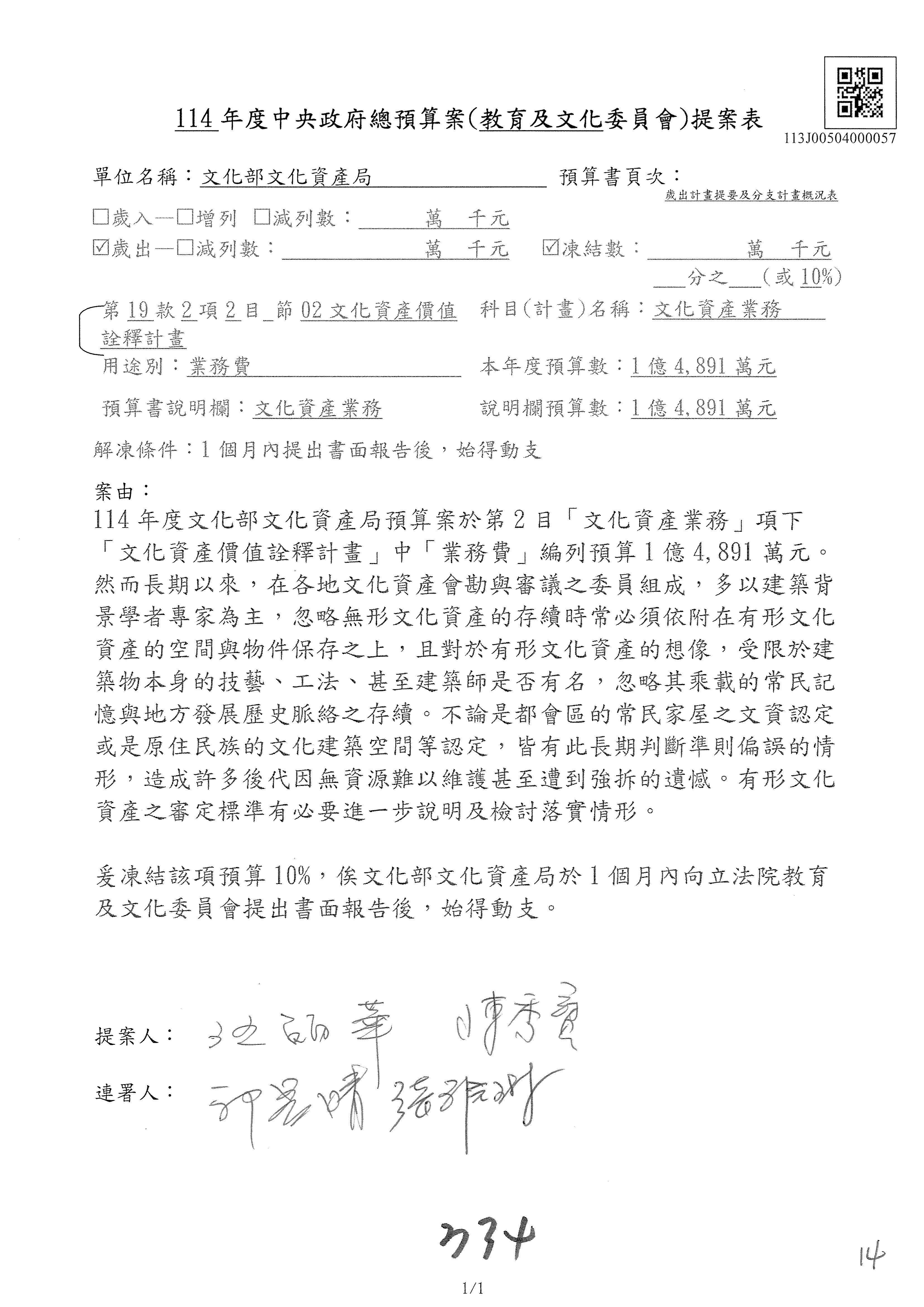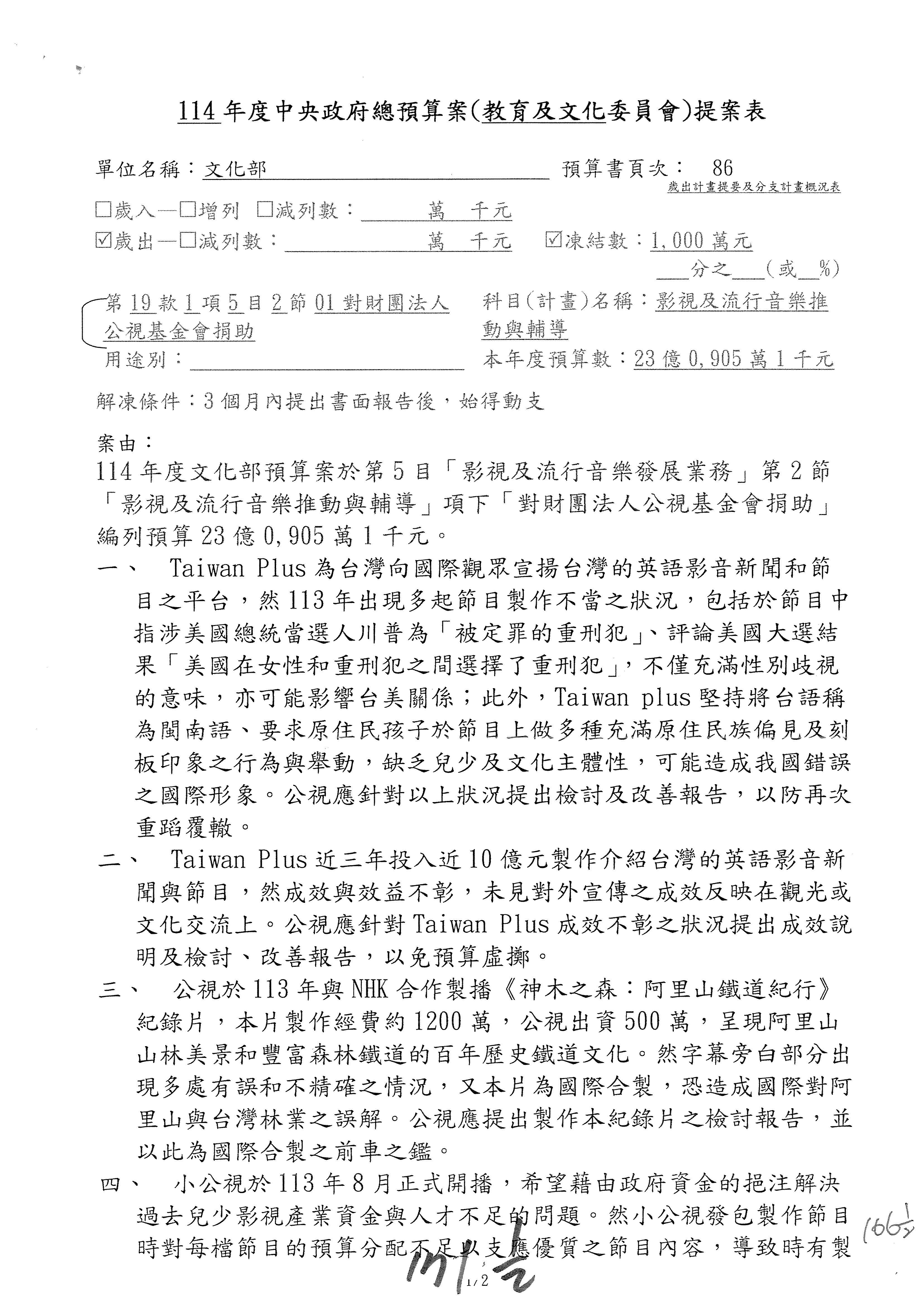 1.114年度核能安全委員會監督行政法人國家原子能科技研究院「支出」預算編列27億5,997萬7千元,凍結50萬元,俟核能安全委員會向立法院教育及文化委員會提出書面報告後,始得動支。1-15