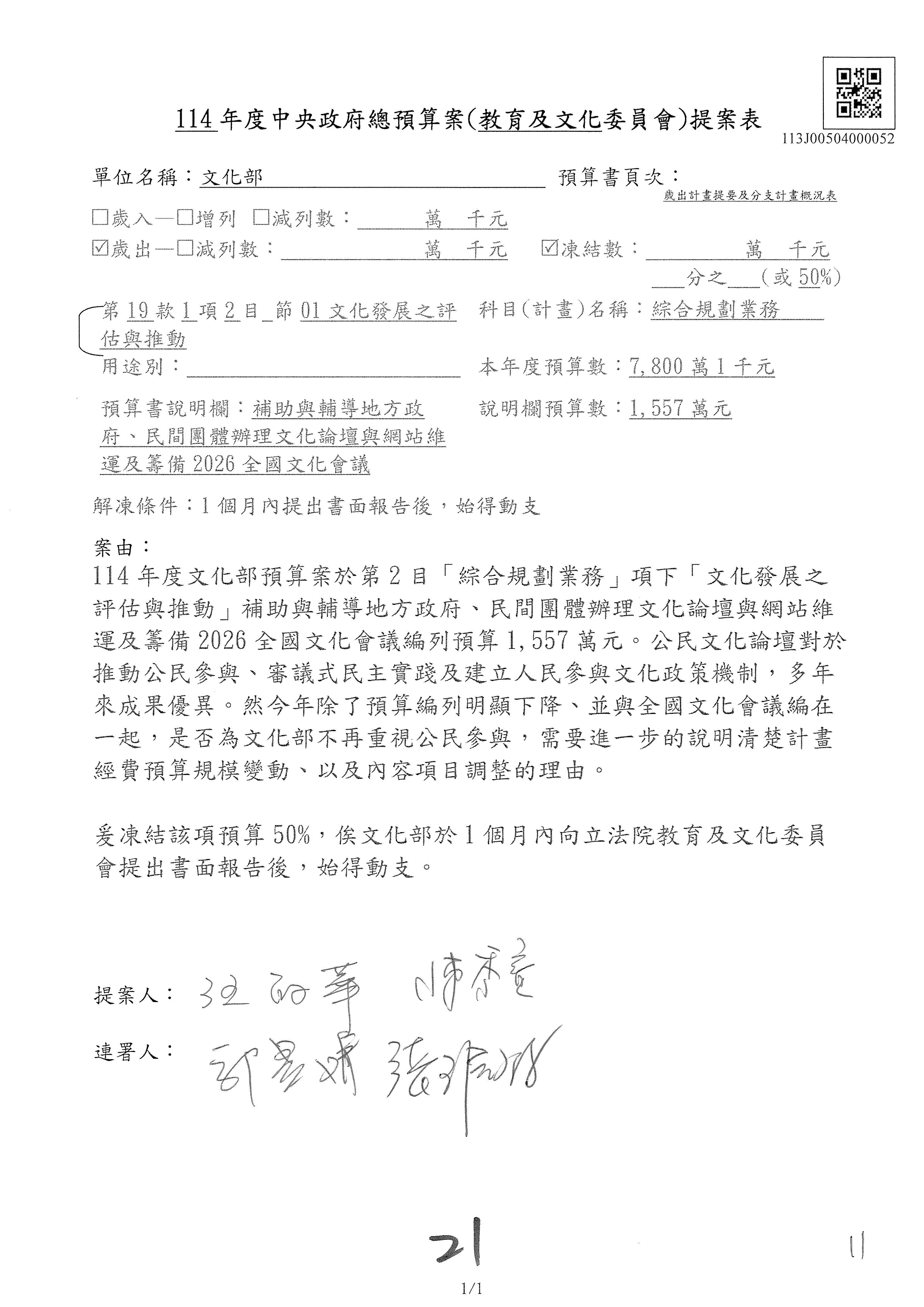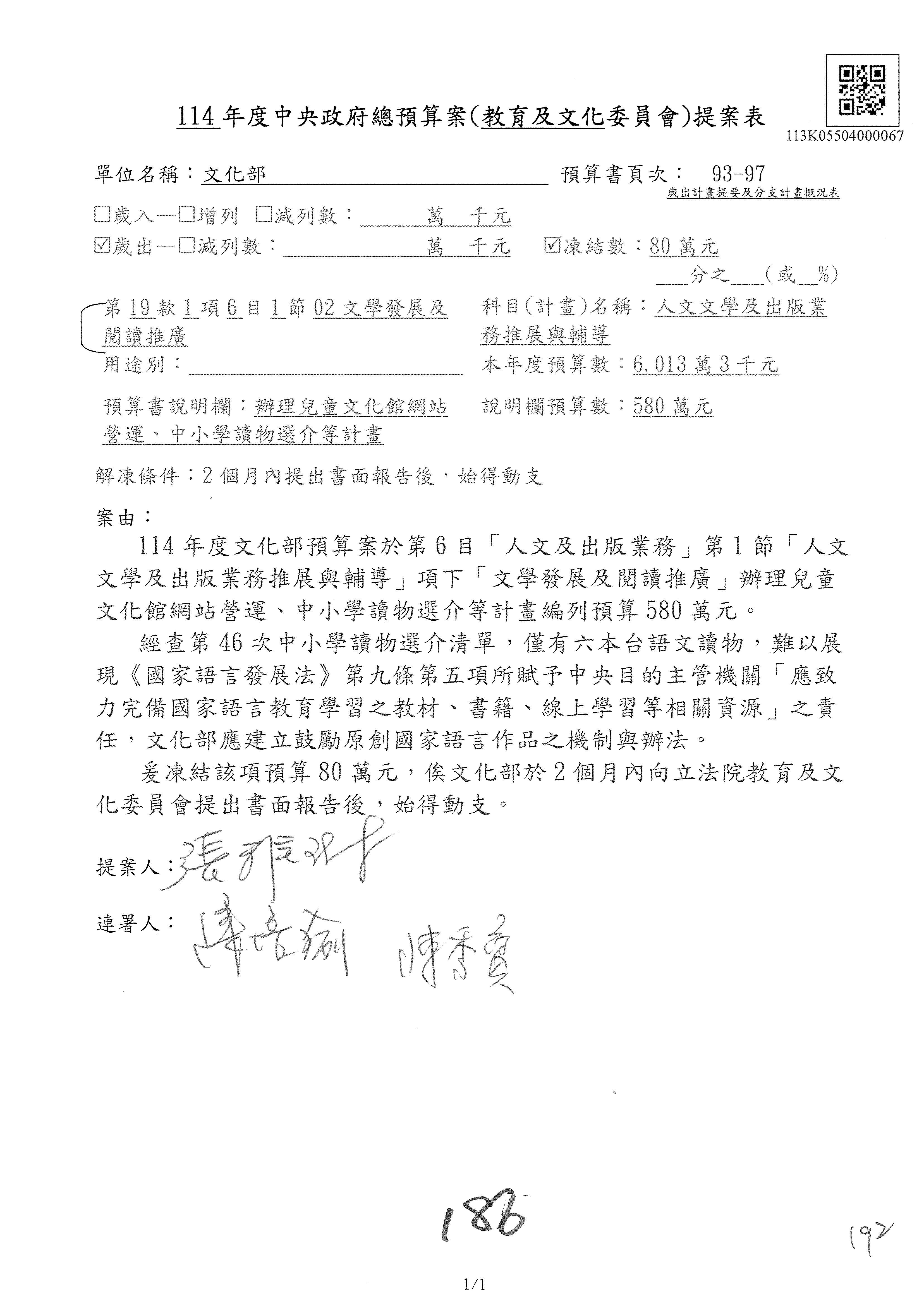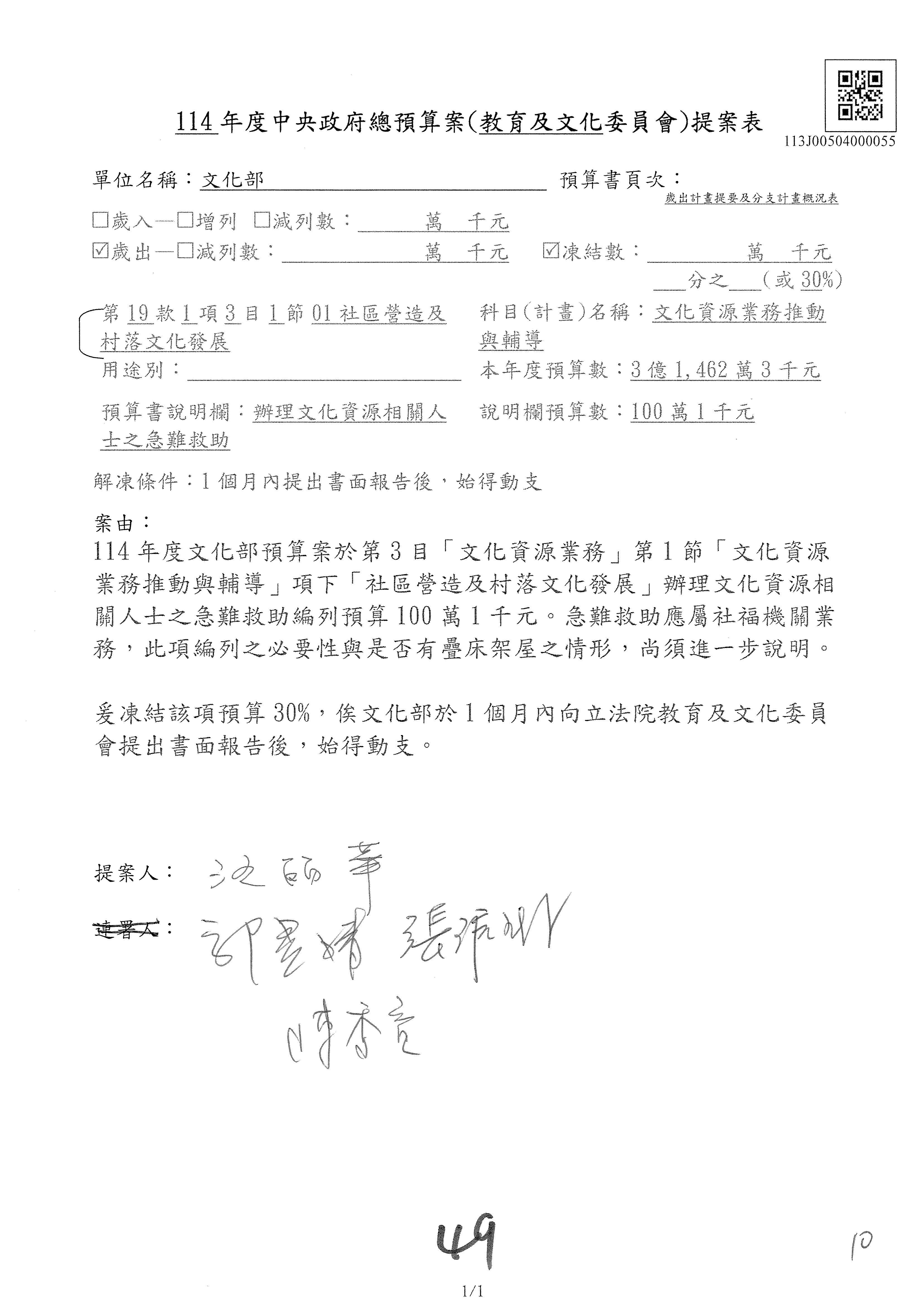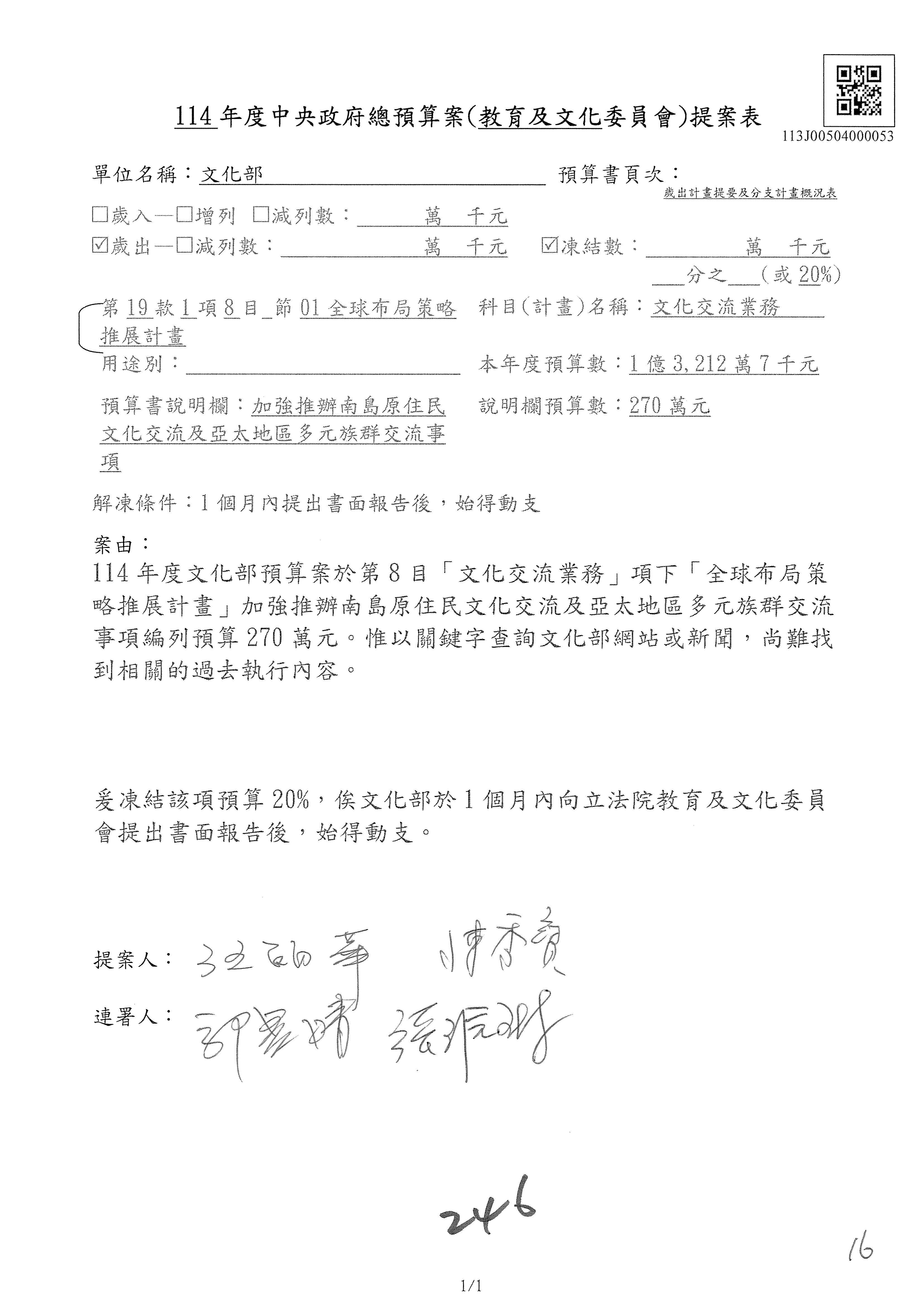 1.114年度核能安全委員會監督行政法人國家原子能科技研究院「支出」預算編列27億5,997萬7千元,凍結50萬元,俟核能安全委員會向立法院教育及文化委員會提出書面報告後,始得動支。1-15