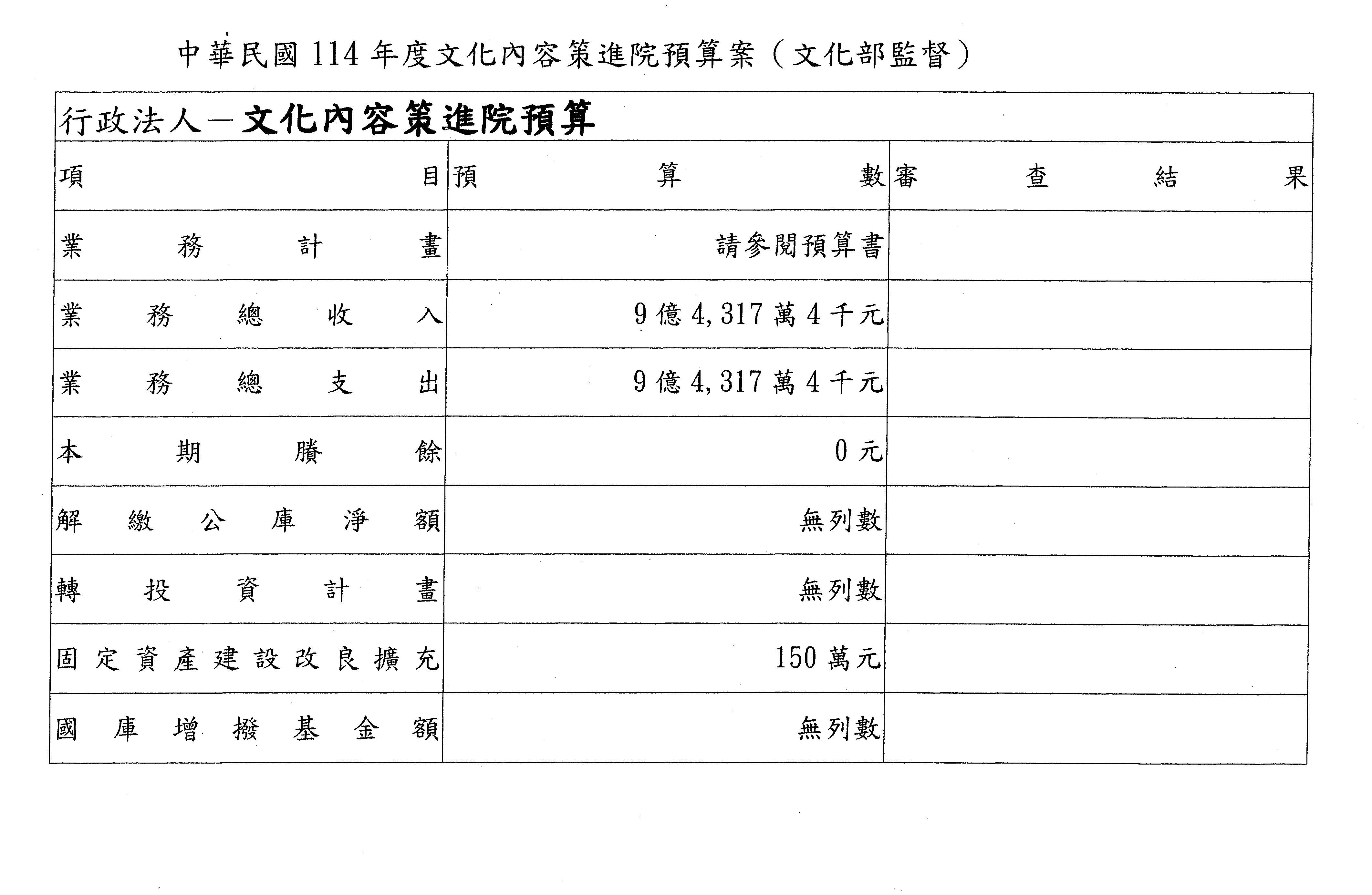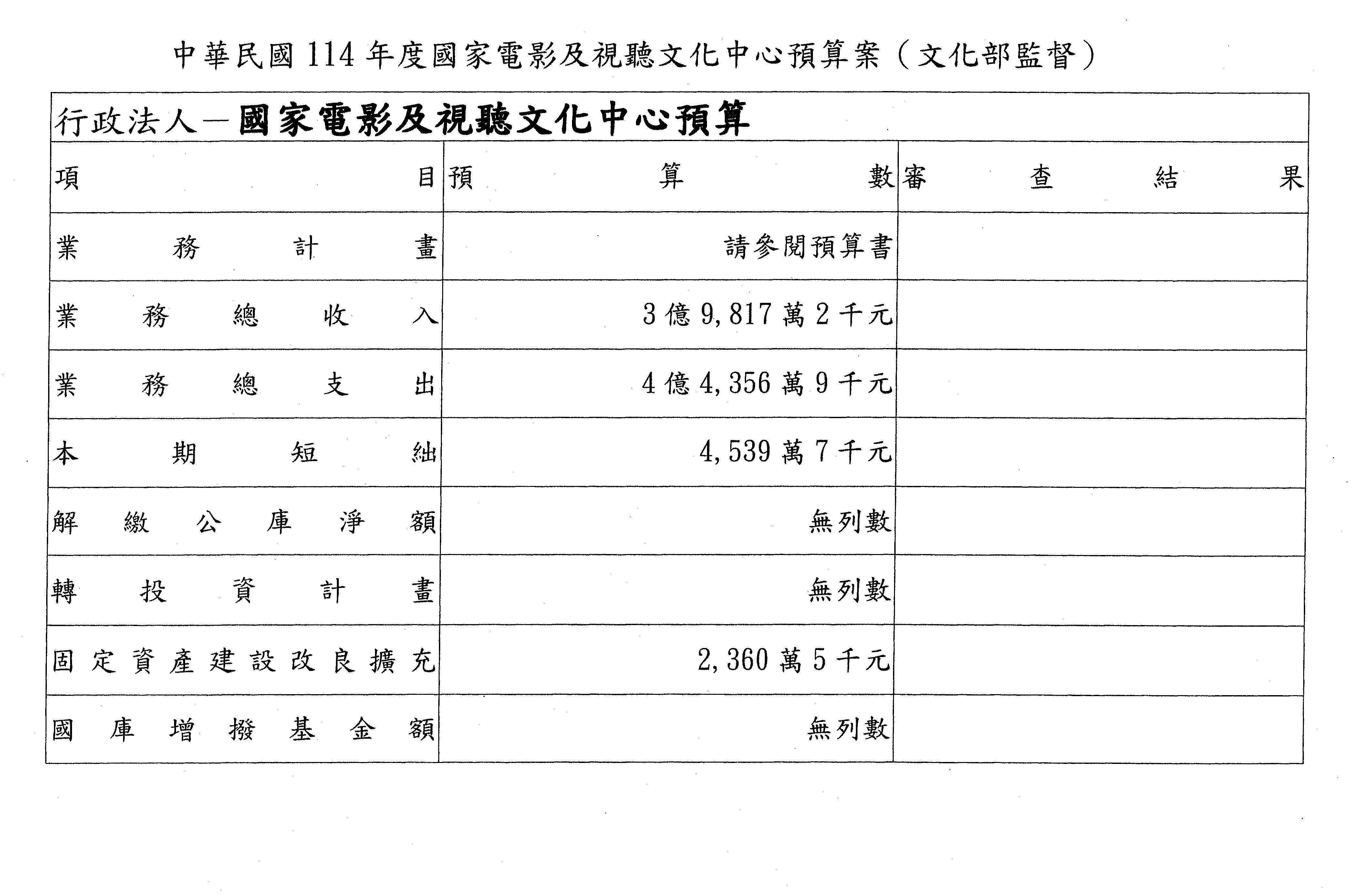 四、繼續審查114年度行政法人國家表演藝術中心、文化內容策進院、國家電影及視聽文化中心預算案。