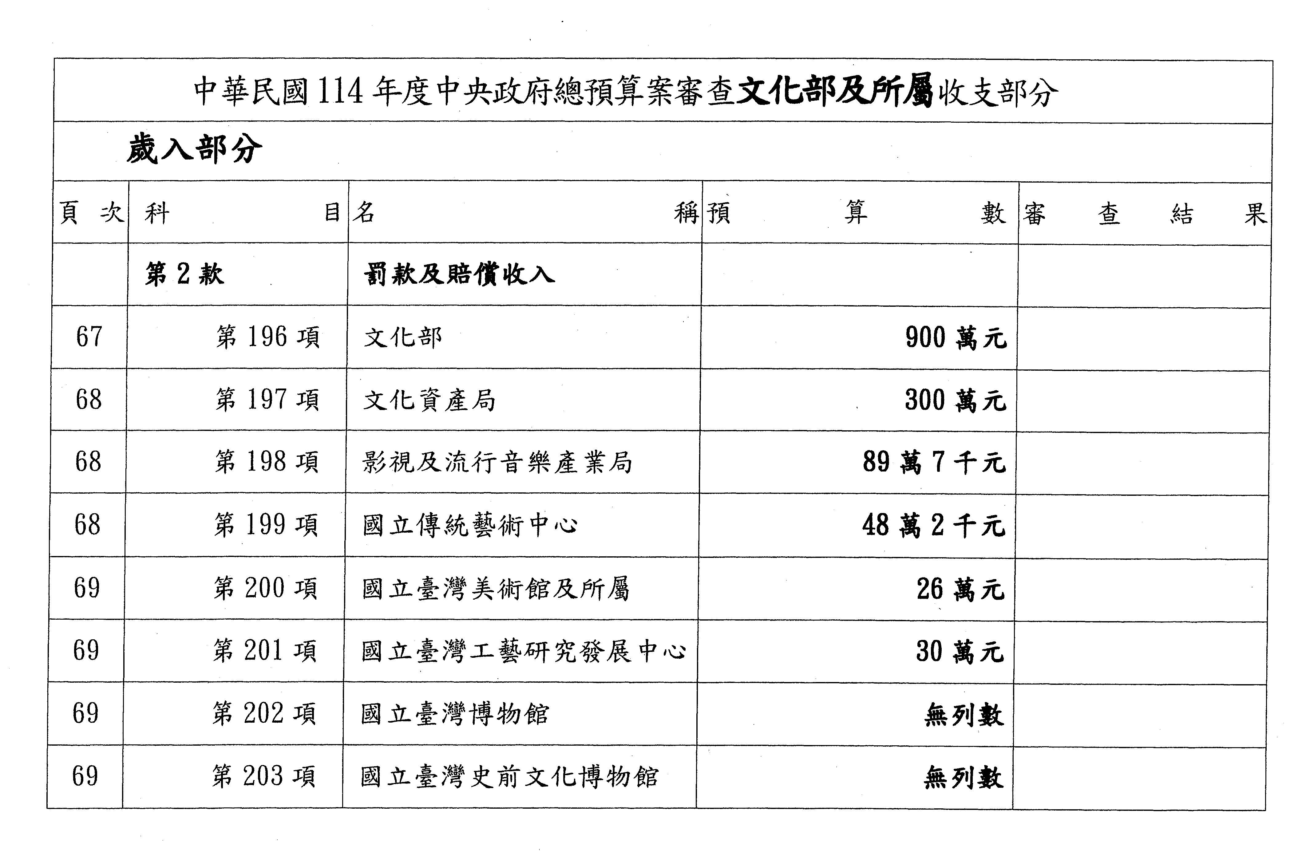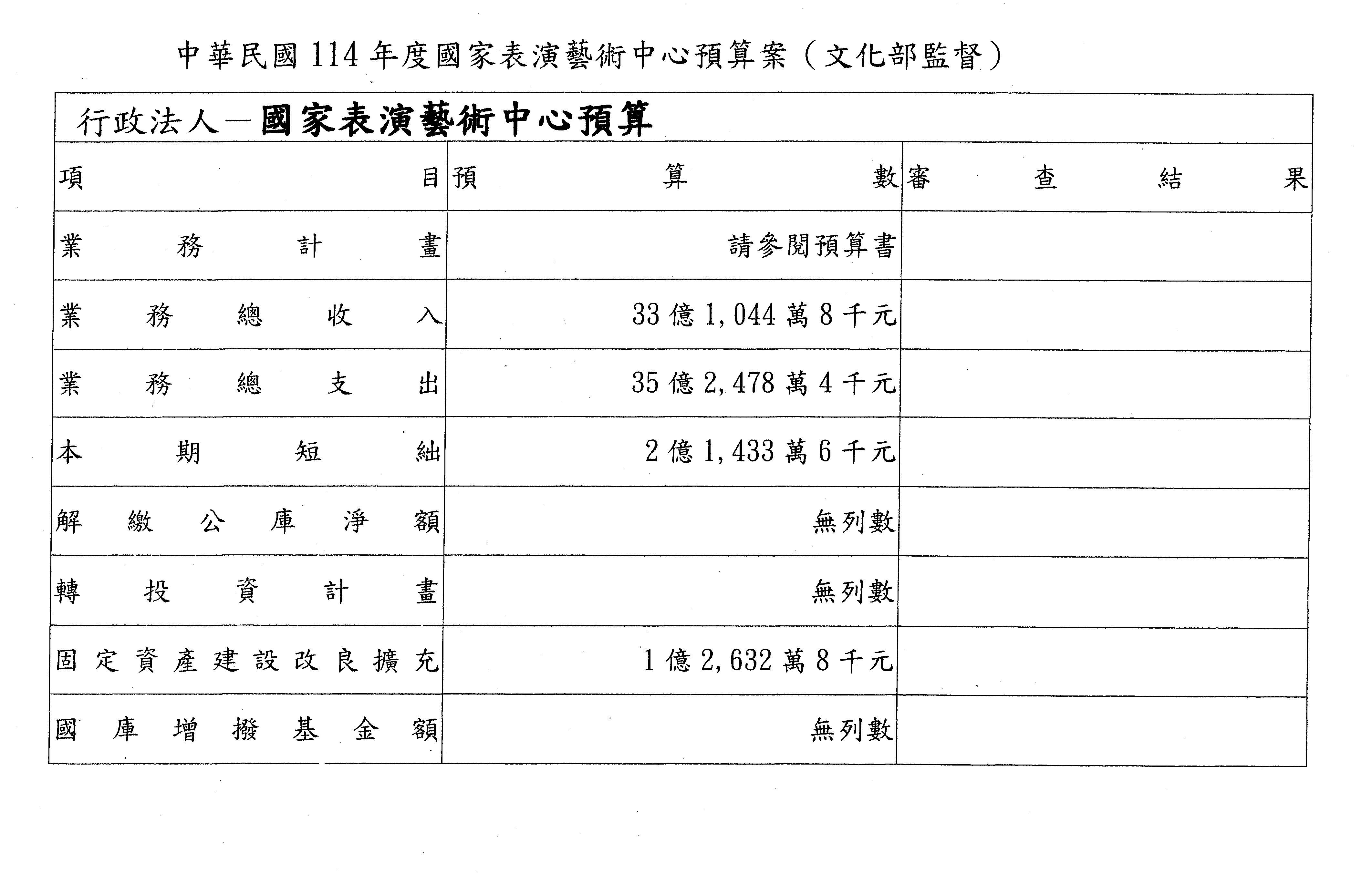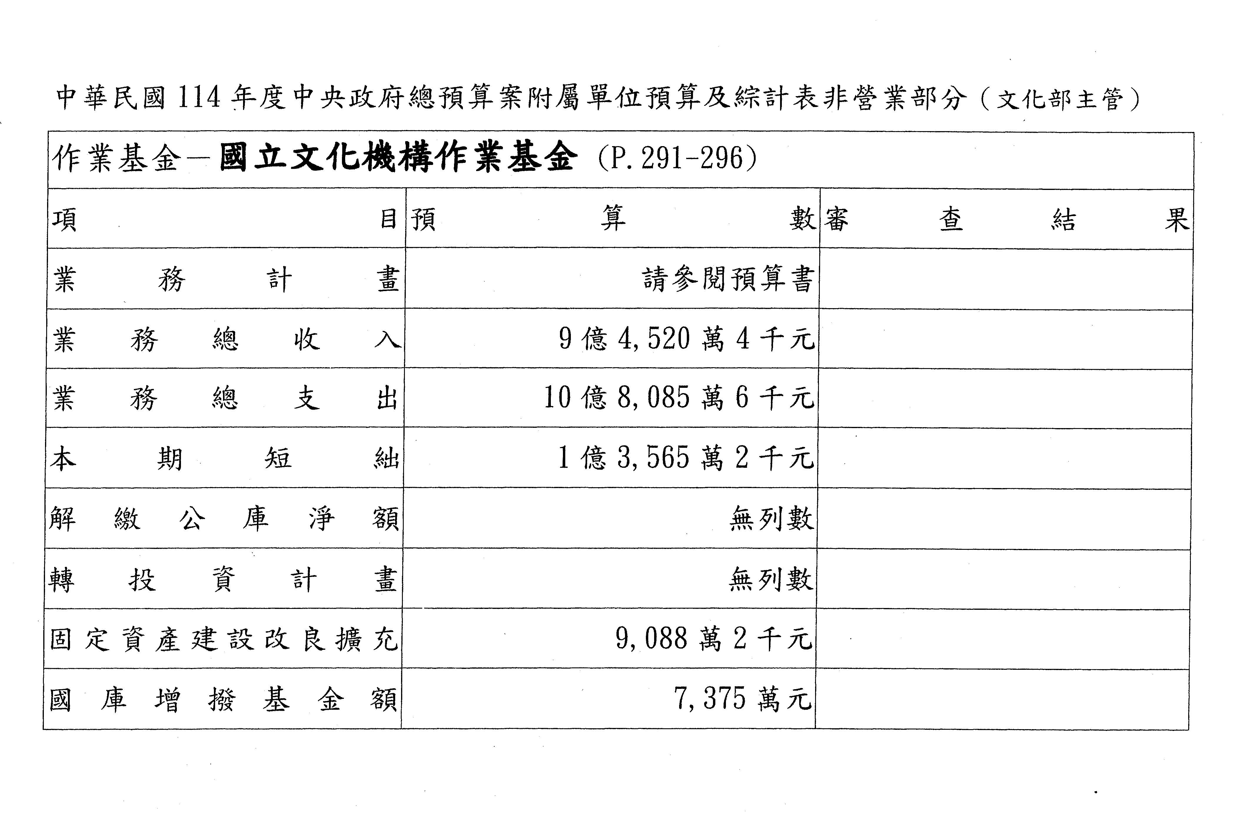 二、繼續審查114年度中央政府總預算案有關文化部主管國立文化機構作業基金附屬單位預算案。