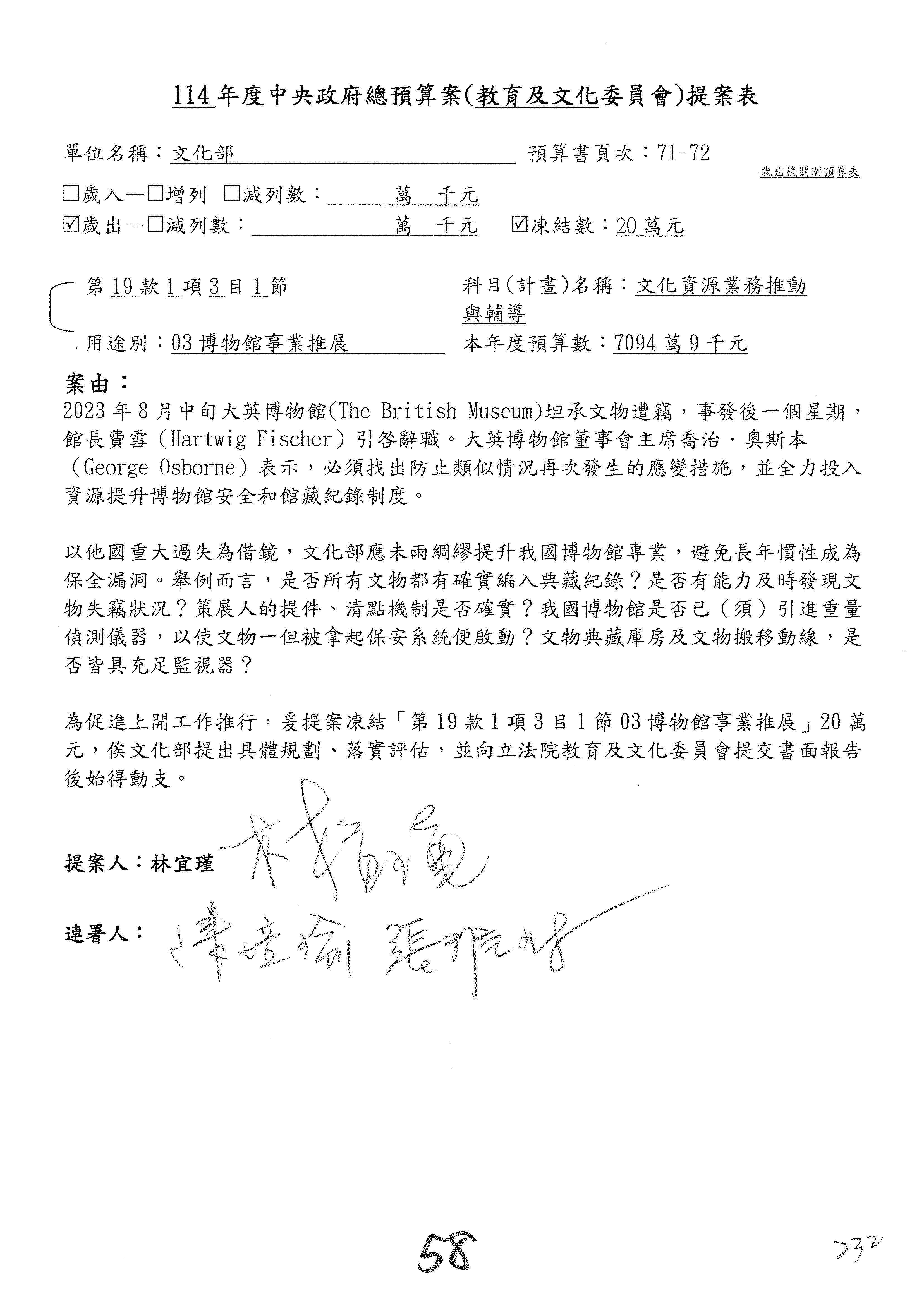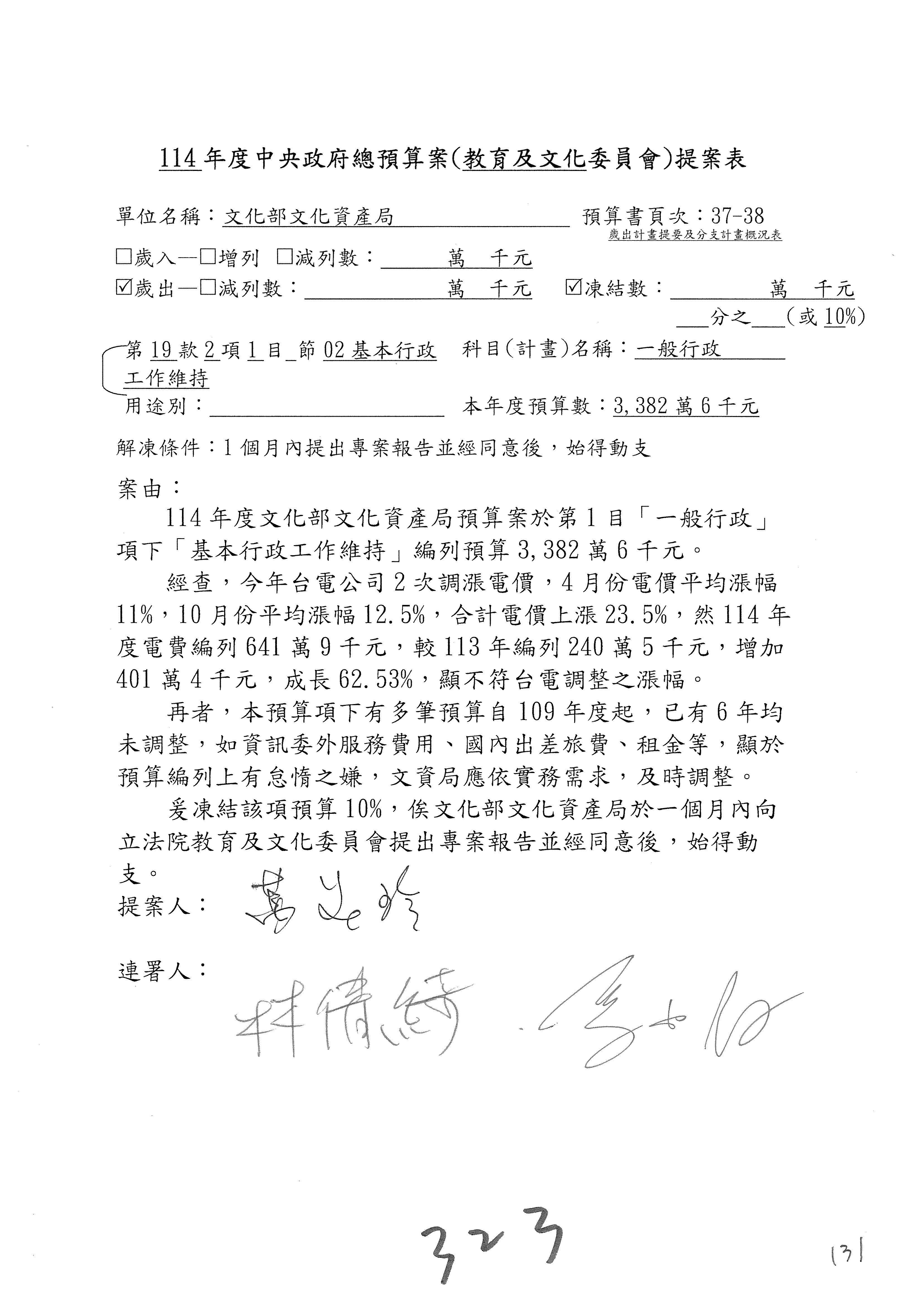 (二十三)114年度核能安全委員會「一般行政」項下「基本工作維持」預算中編列相關會議室設備優化更新等設備費共203萬5千元,經查,核安會113年度以組織改造及員額增加或調整致原辦公空間配置難以符合需求為由,編列7,252萬2千元用以辦理辦公廳舍裝修工程,惟前項工程迄113年7月底執行狀況,因物價調漲及原規劃落差,目前僅進行圖說審查階段,114年度又編列預算用已更新相關設備,該筆預算是否有其必要性,容有疑義。綜上所述,爰要求核能安全委員會應積極執行及檢討如何妥善運用相關經費,並於2個月內向立法院教育及文化委員會提出書面報告。11