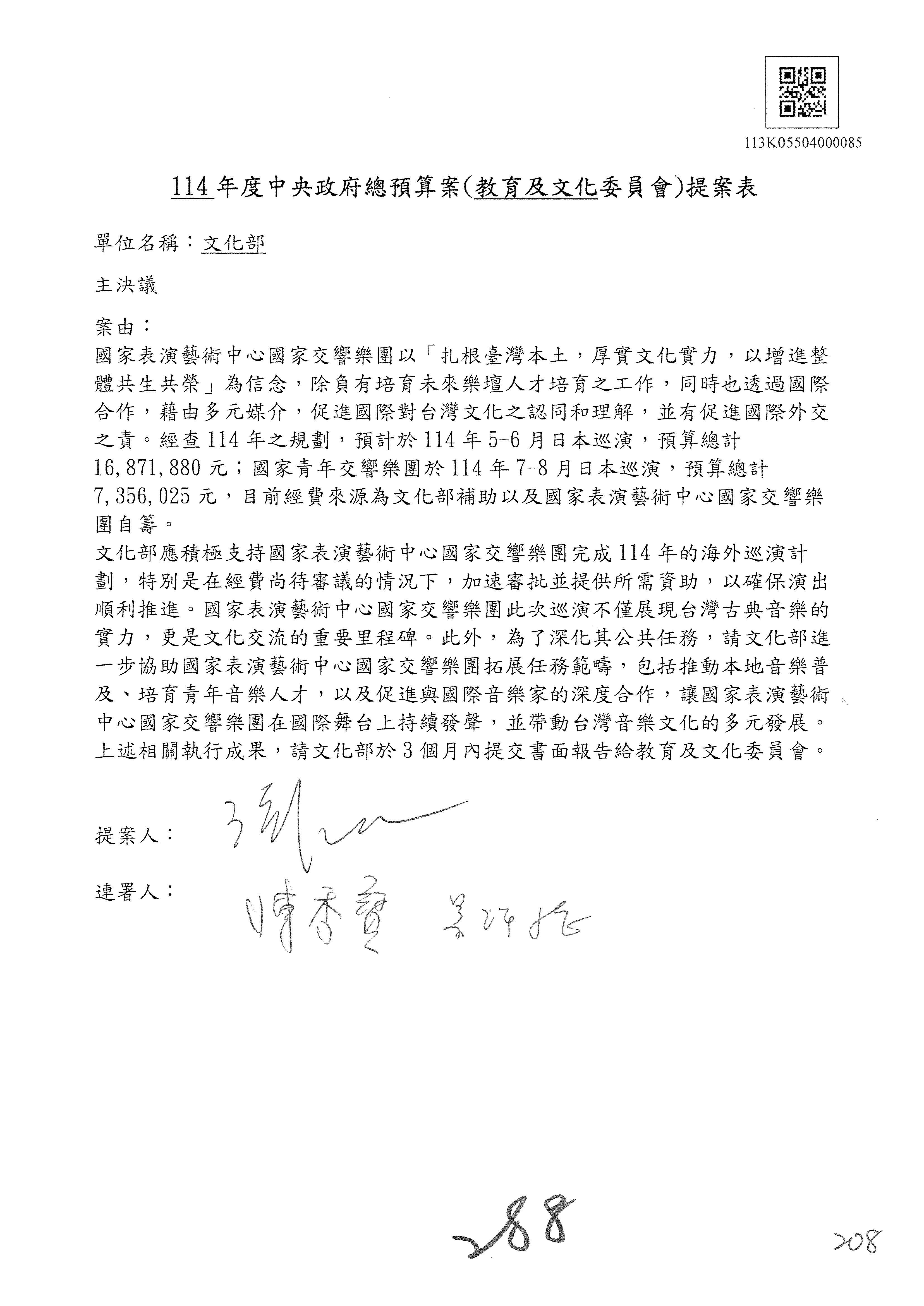 今天的議程總共有4項:繼續審查114年度中央政府總預算案有關文化部及所屬單位預算案;繼續審查114年度中央政府總預算案有關文化部主管國立文化機構作業基金附屬單位預算案;繼續審查114年度中央政府總預算案有關文化部主管文化發展基金附屬單位預算案;繼續審查114年度行政法人國家表演藝術中心、文化內容策進院、國家電影及視聽文化中心預算案。