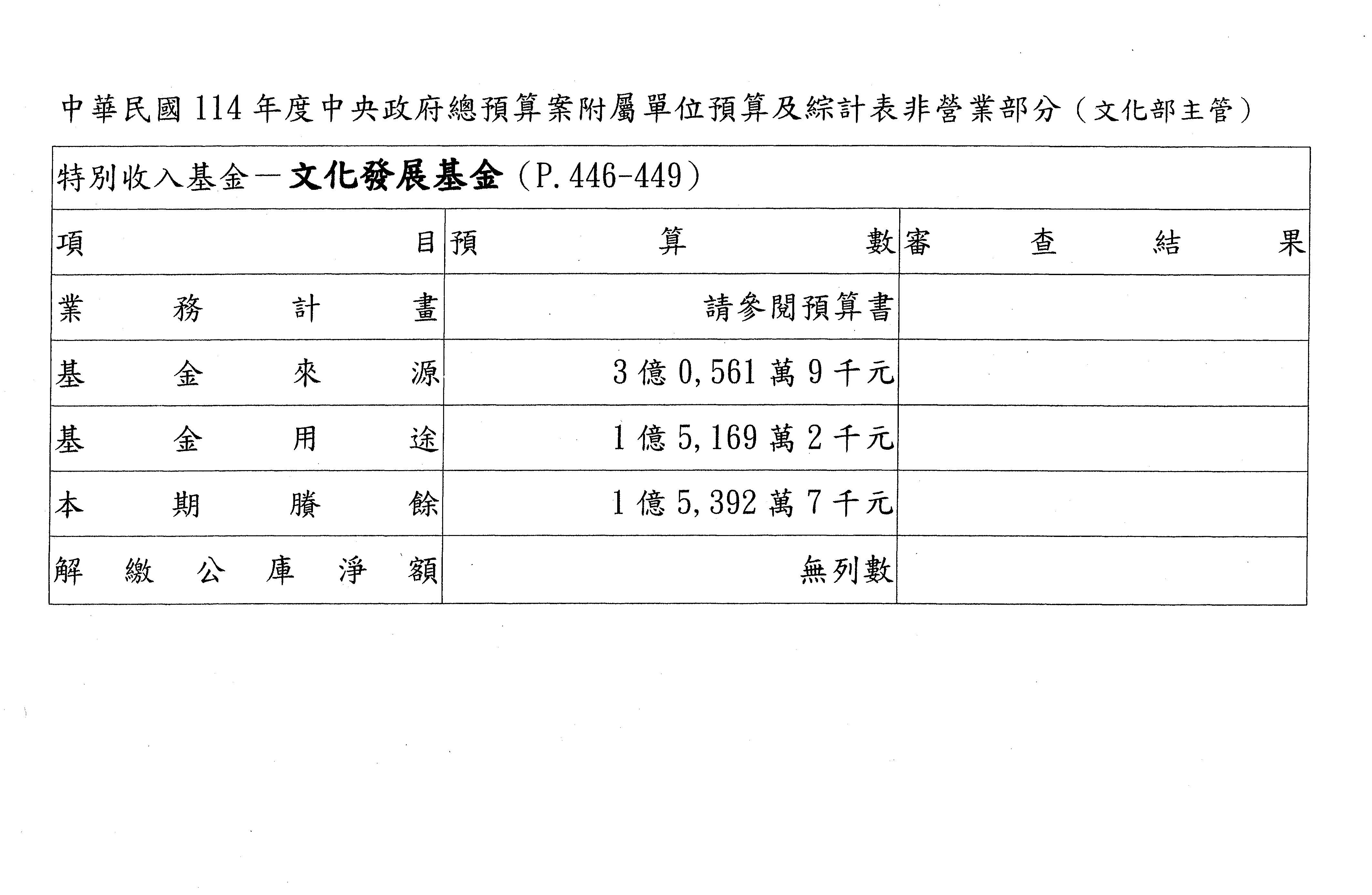 三、繼續審查114年度中央政府總預算案有關文化部主管文化發展基金附屬單位預算案。