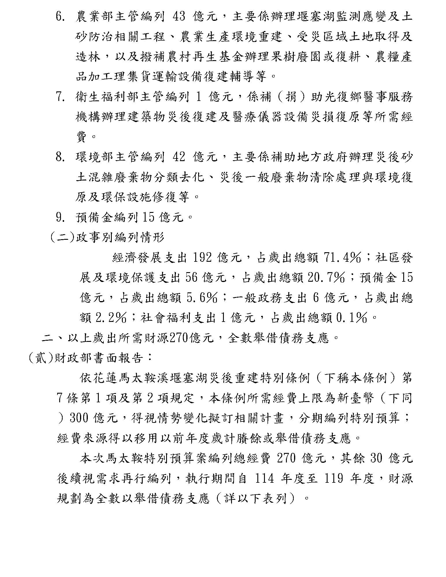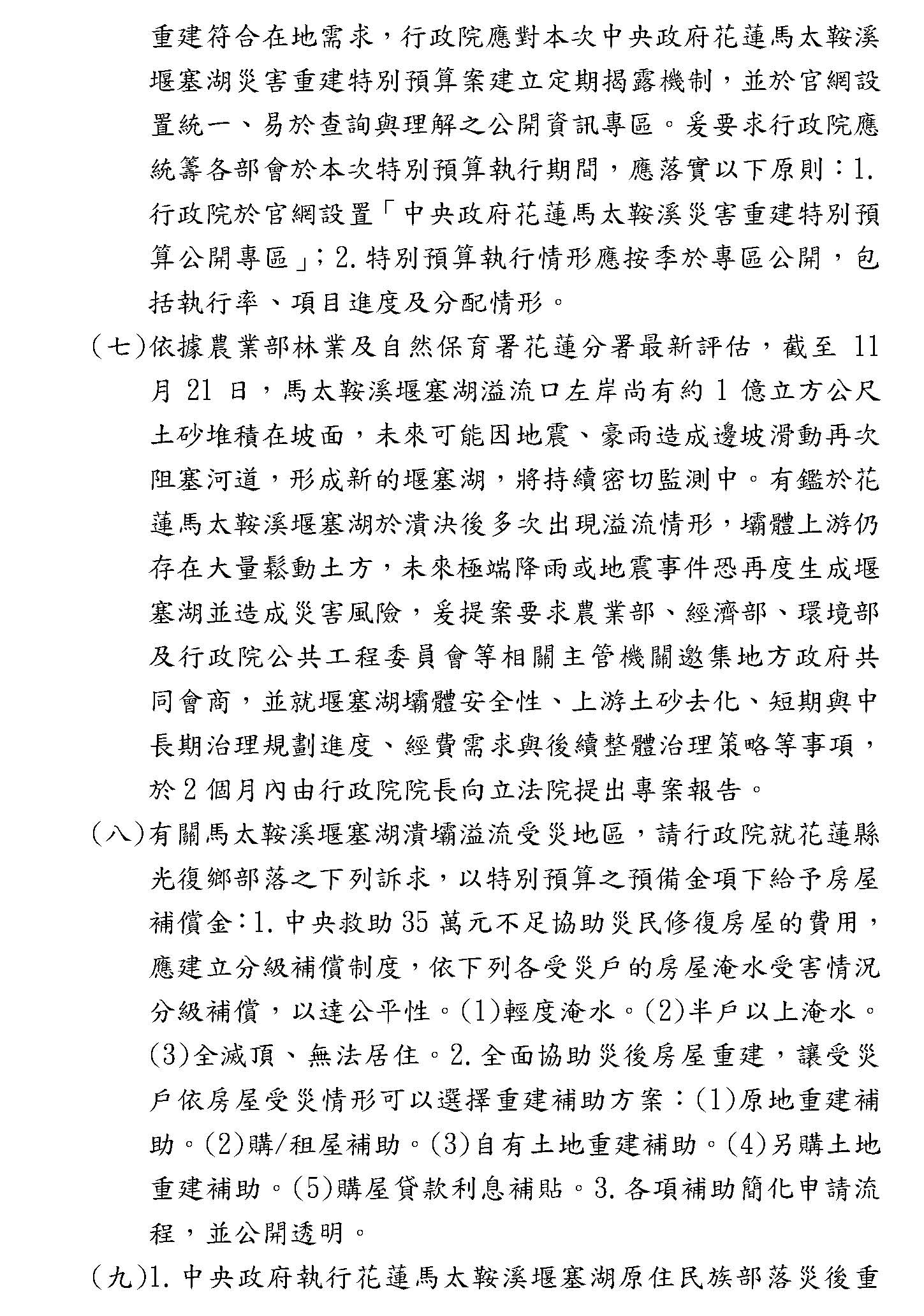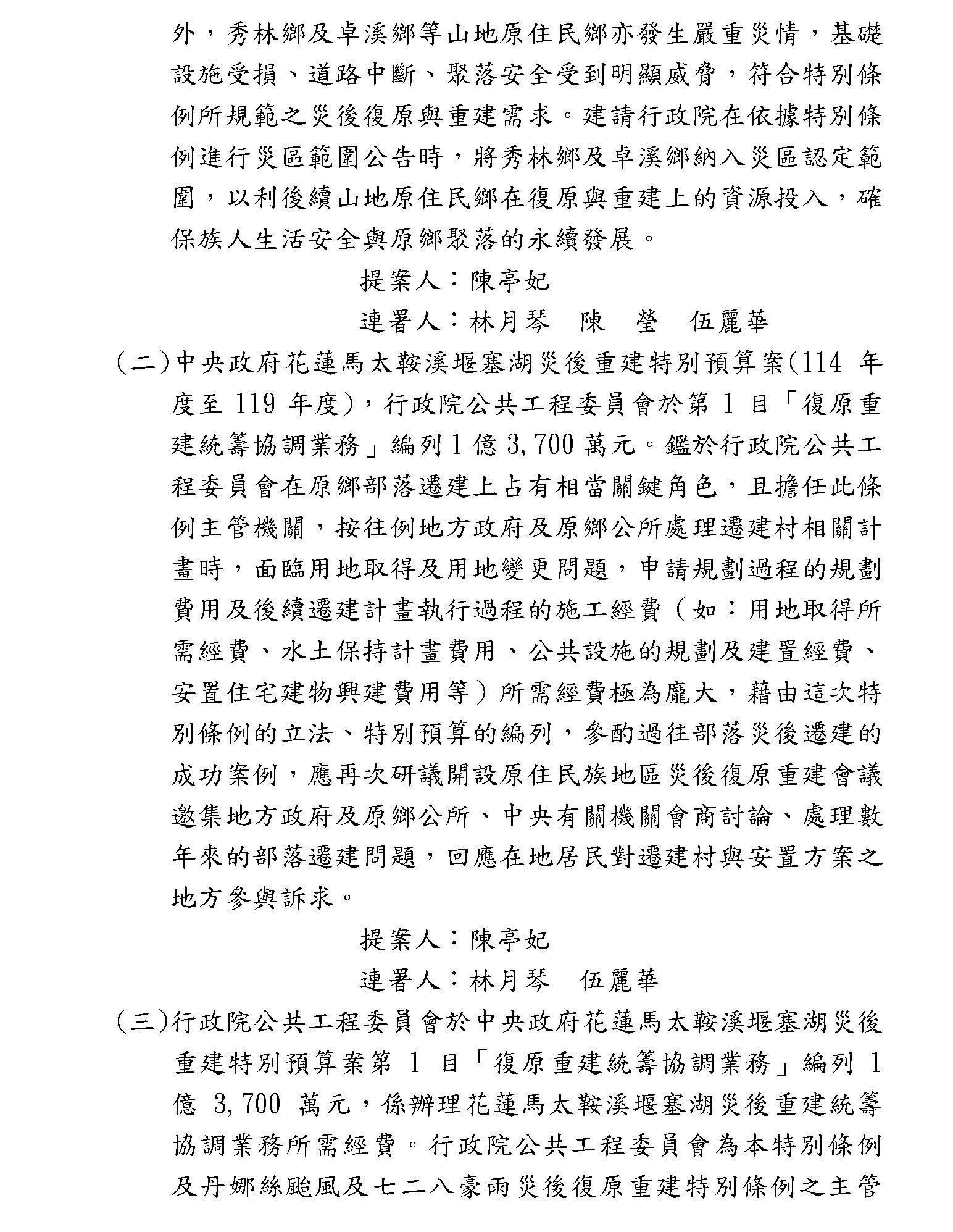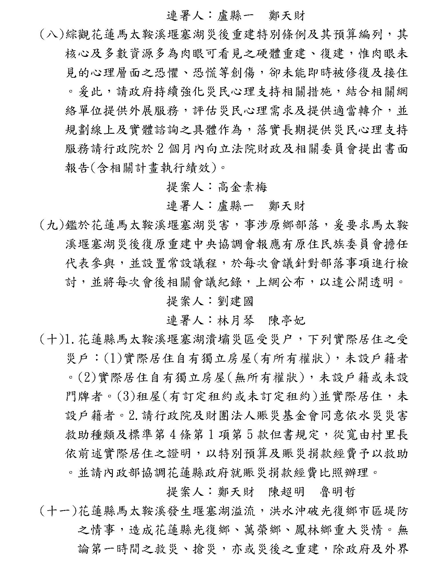 二、中央政府花蓮馬太鞍溪堰塞湖災後重建特別預算案完成立法程序後,由各黨團各推派1人發言,每人發言時間2分鐘。