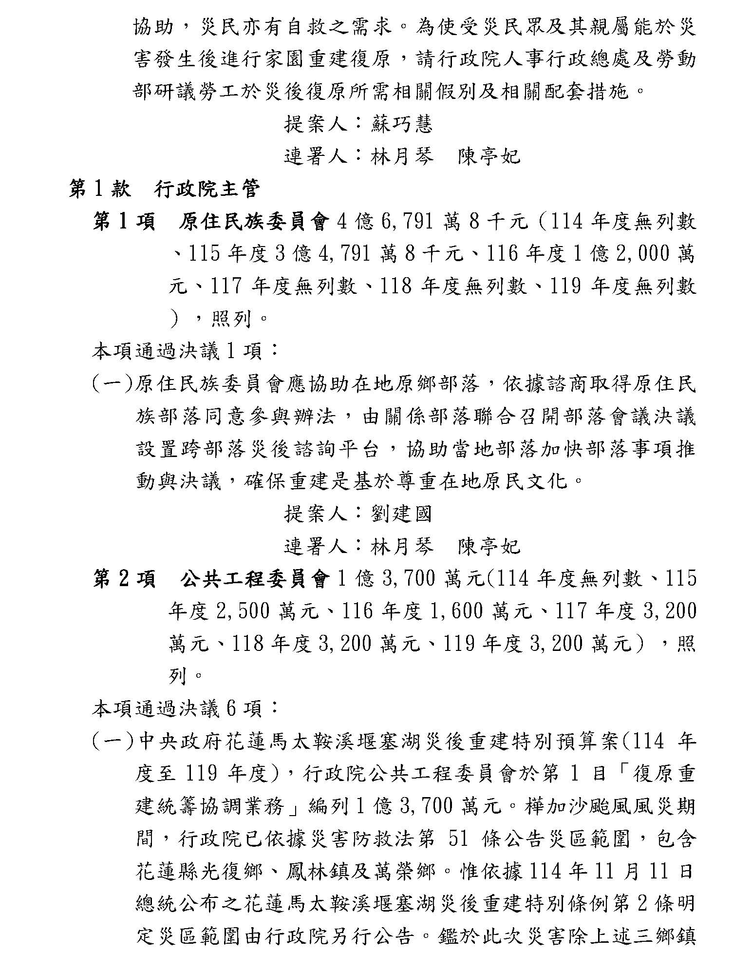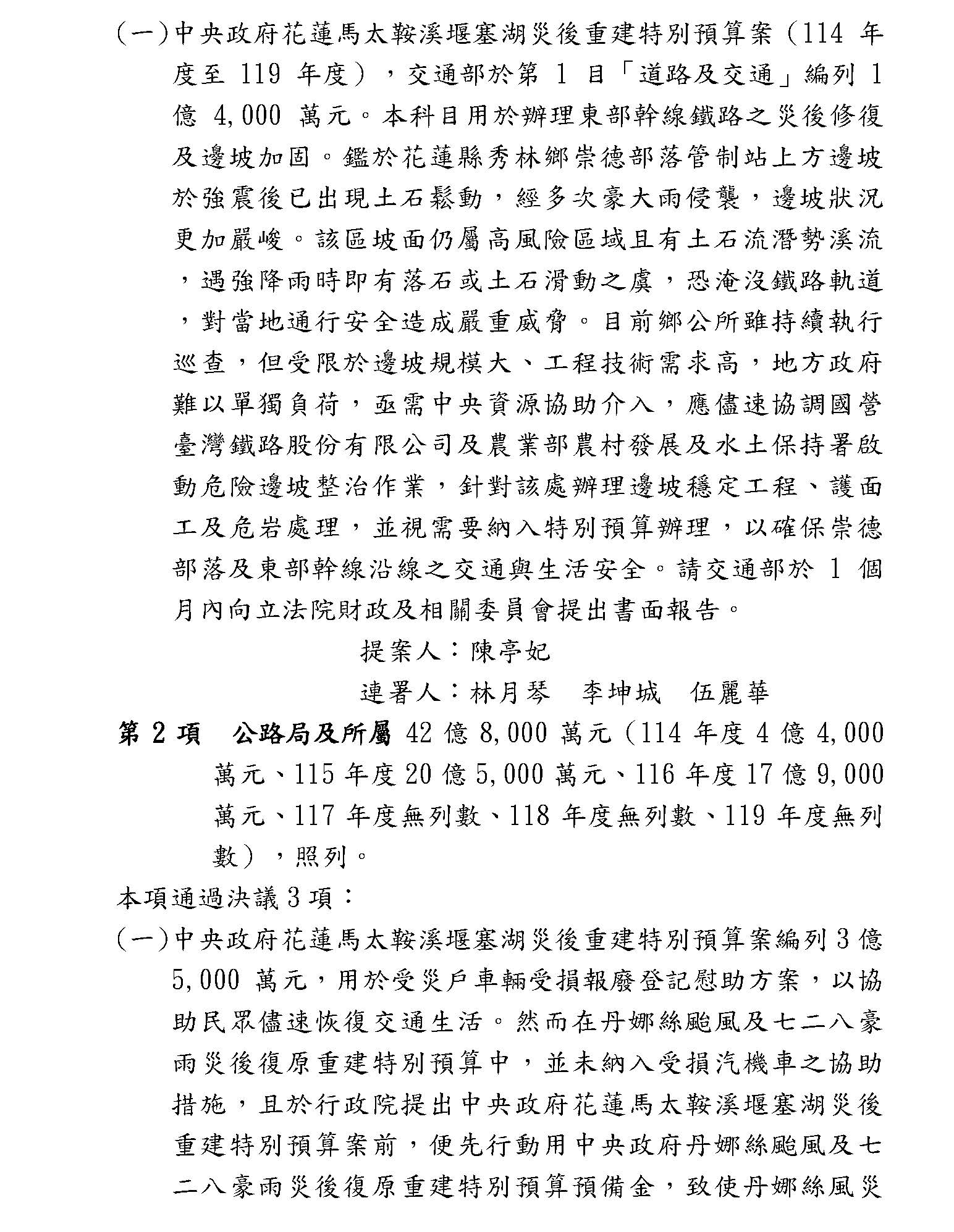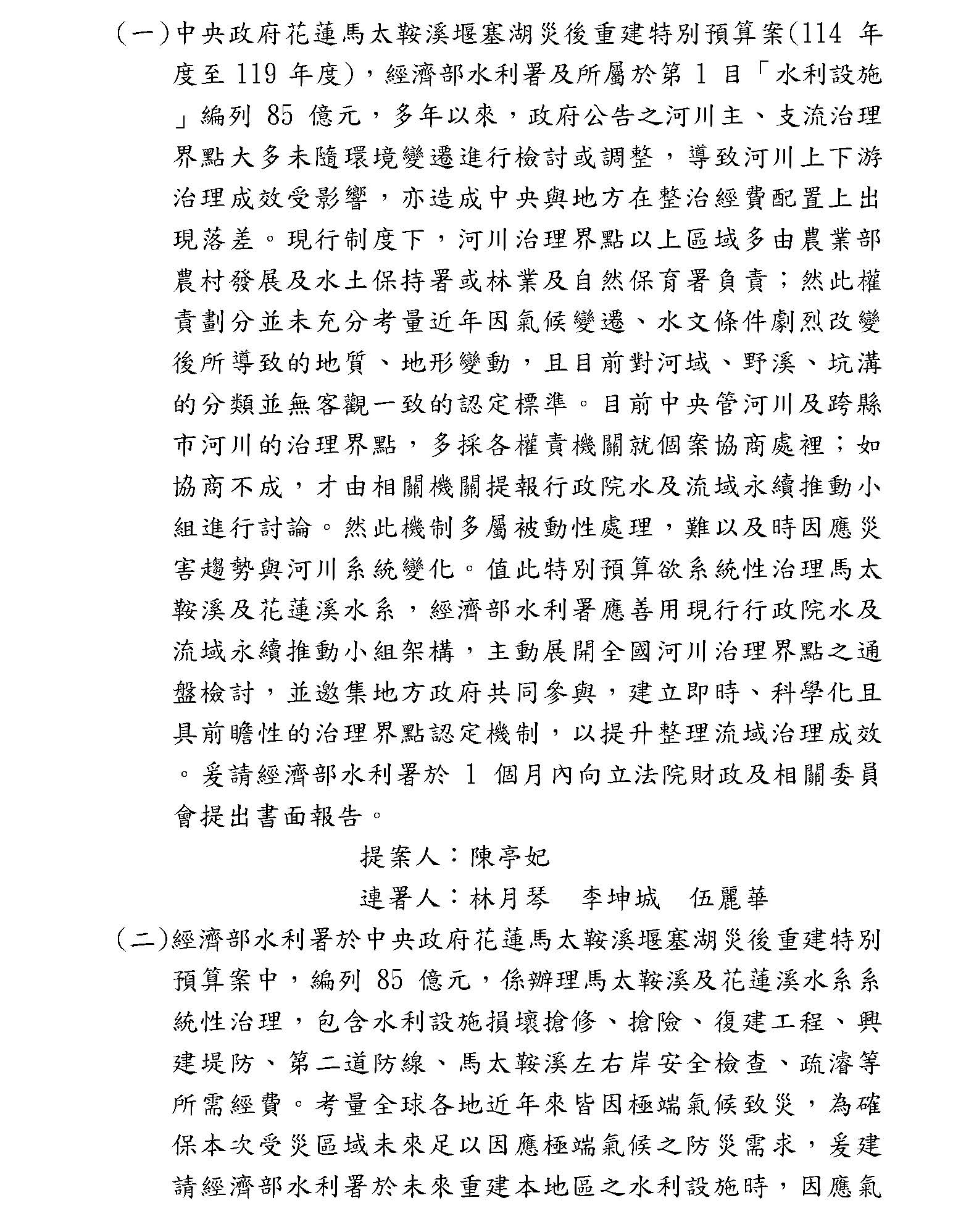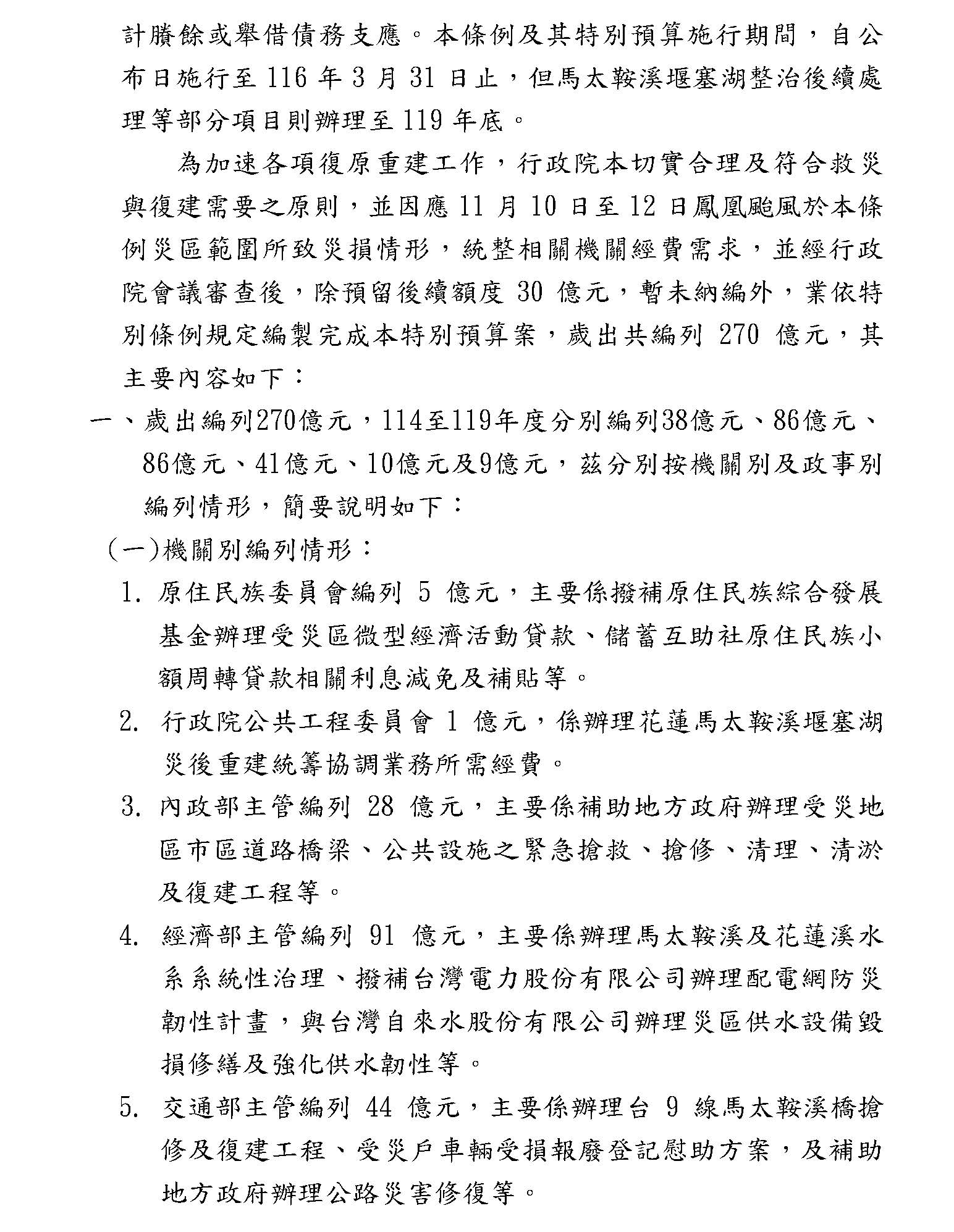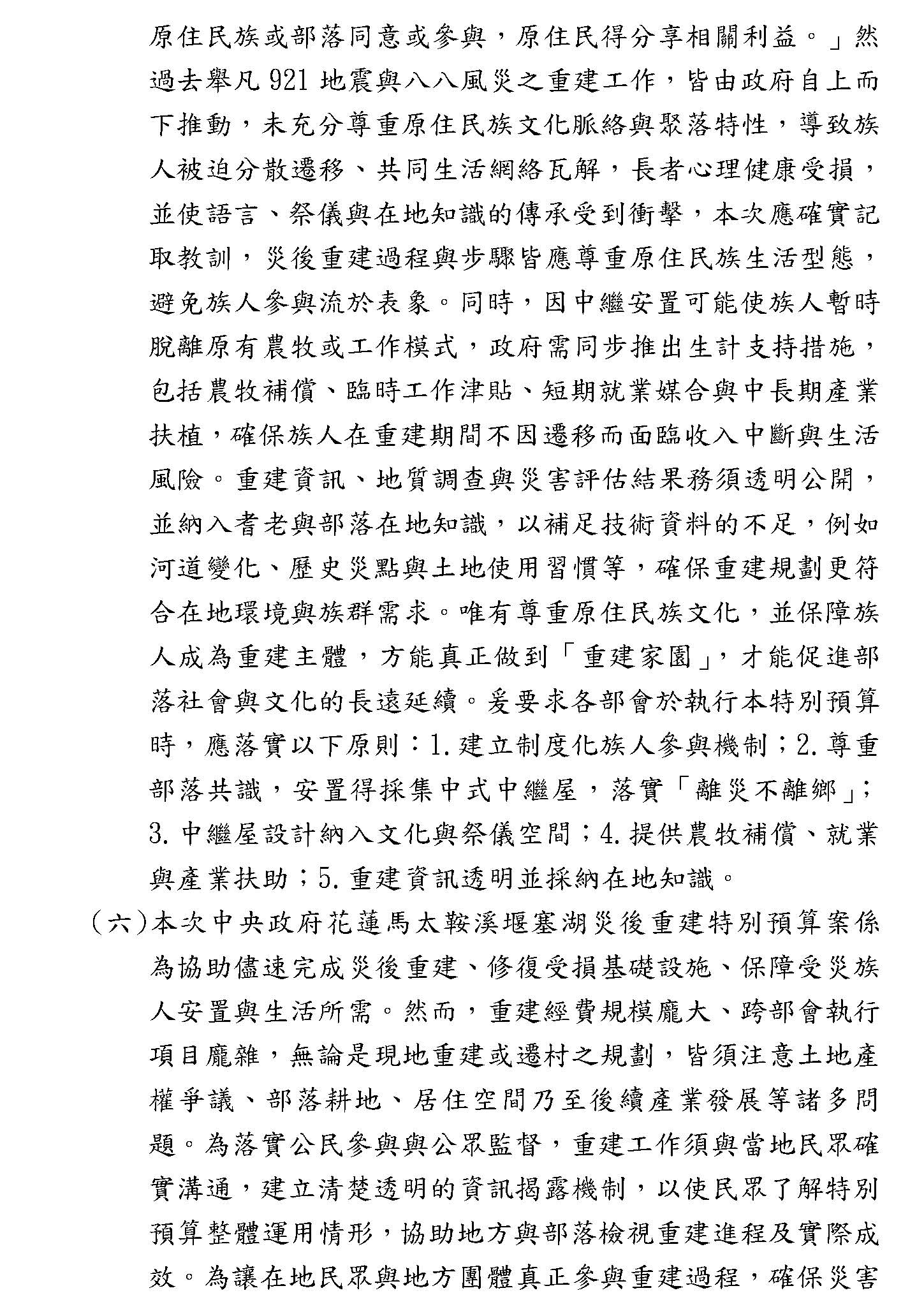 二、中央政府花蓮馬太鞍溪堰塞湖災後重建特別預算案完成立法程序後,由各黨團各推派1人發言,每人發言時間2分鐘。