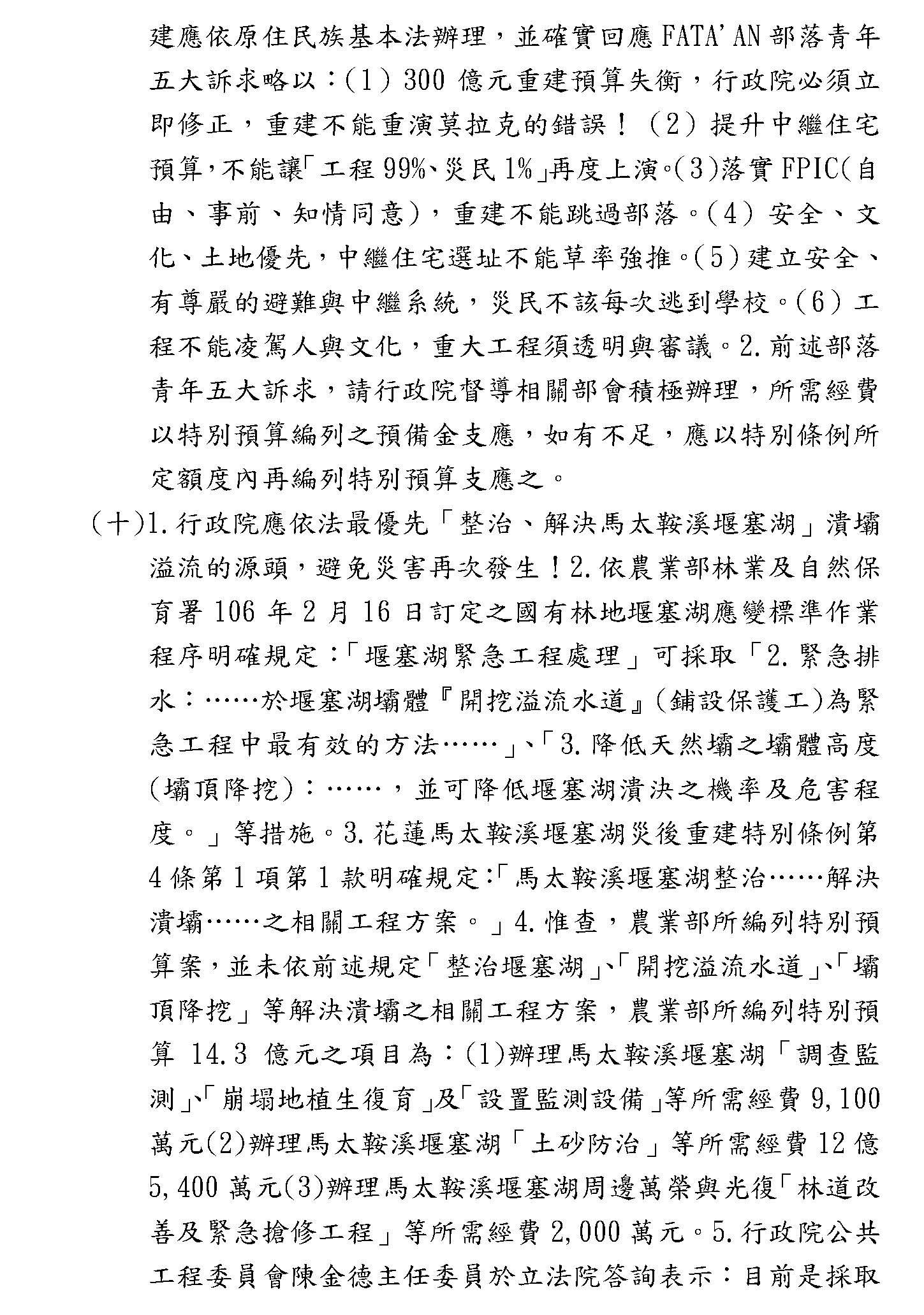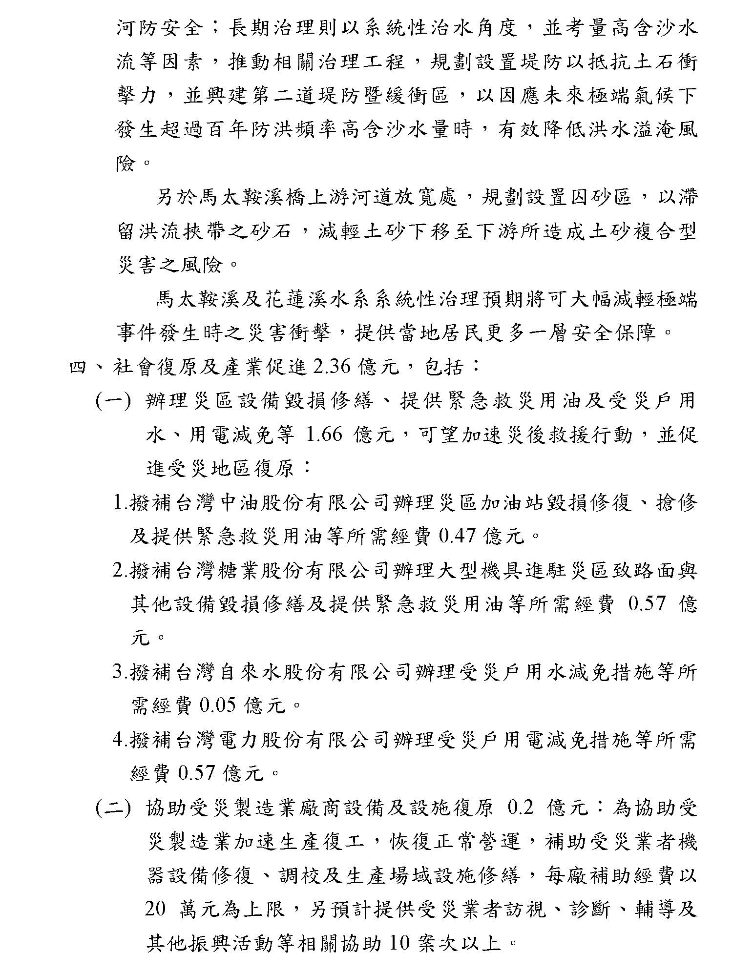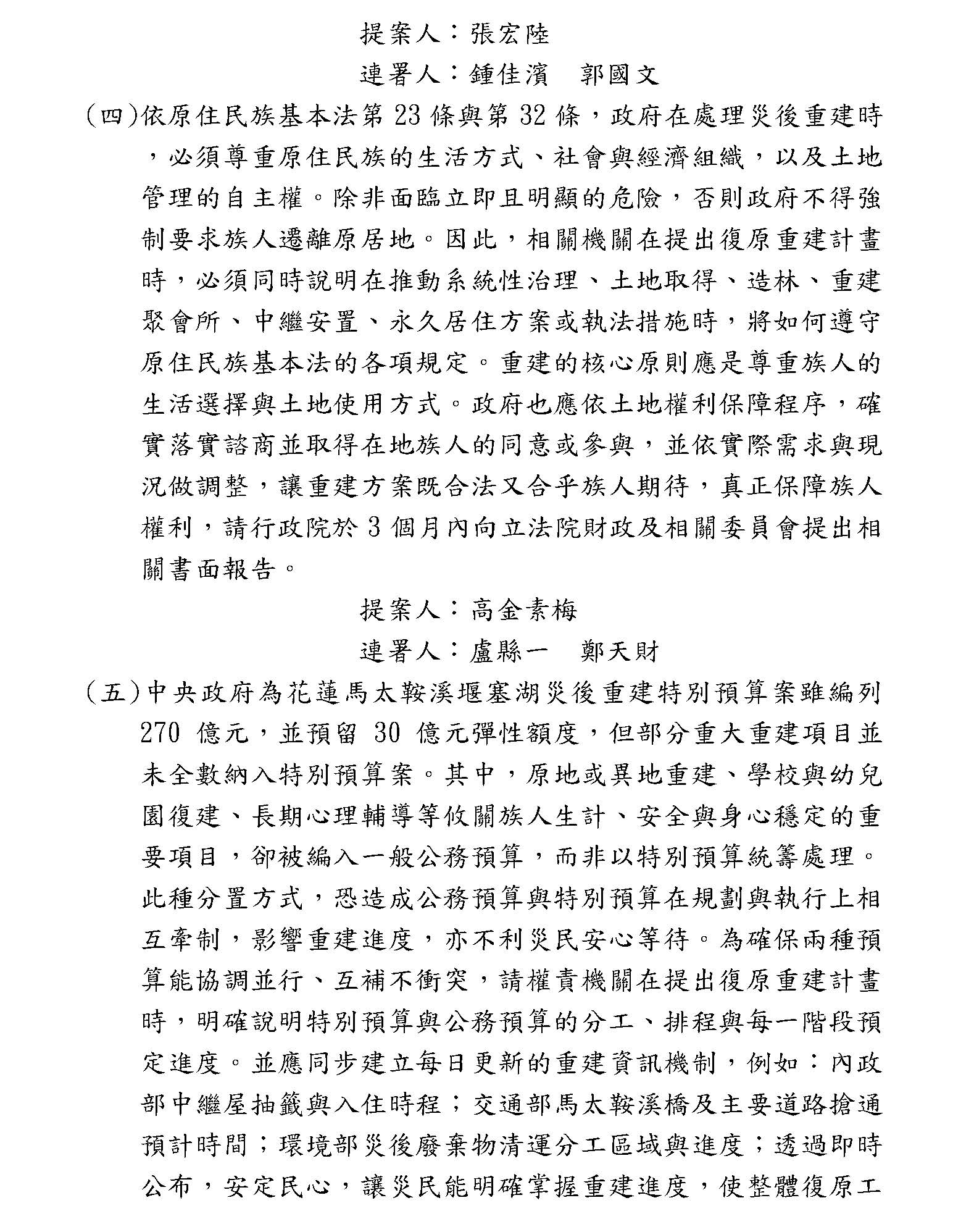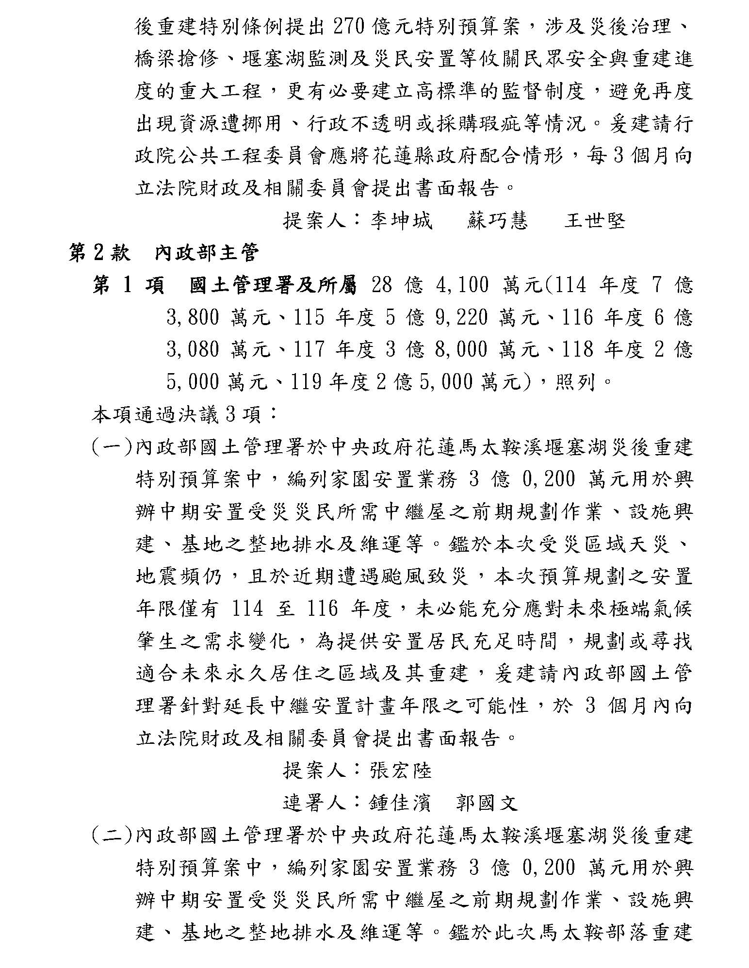 二、中央政府花蓮馬太鞍溪堰塞湖災後重建特別預算案完成立法程序後,由各黨團各推派1人發言,每人發言時間2分鐘。