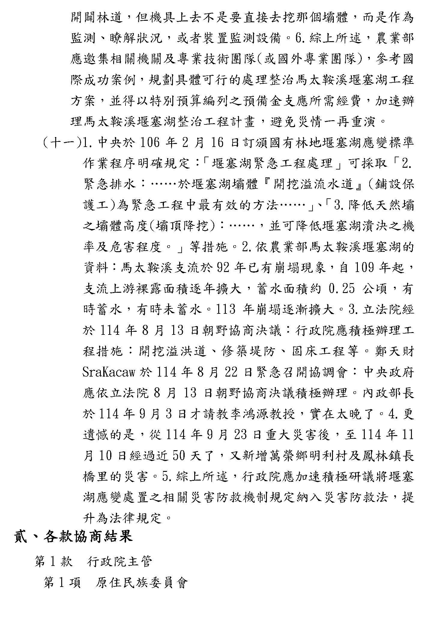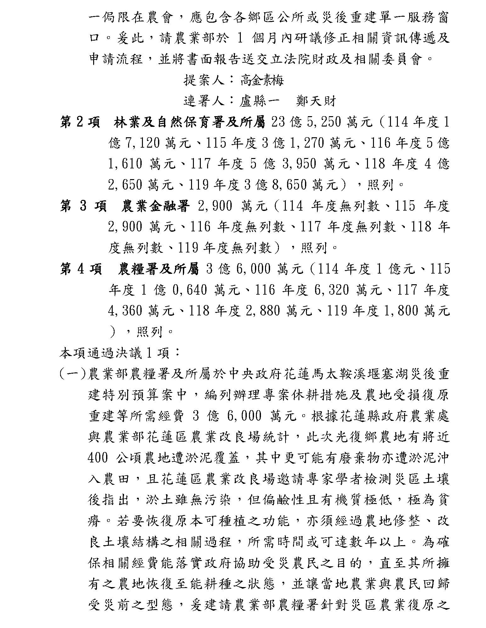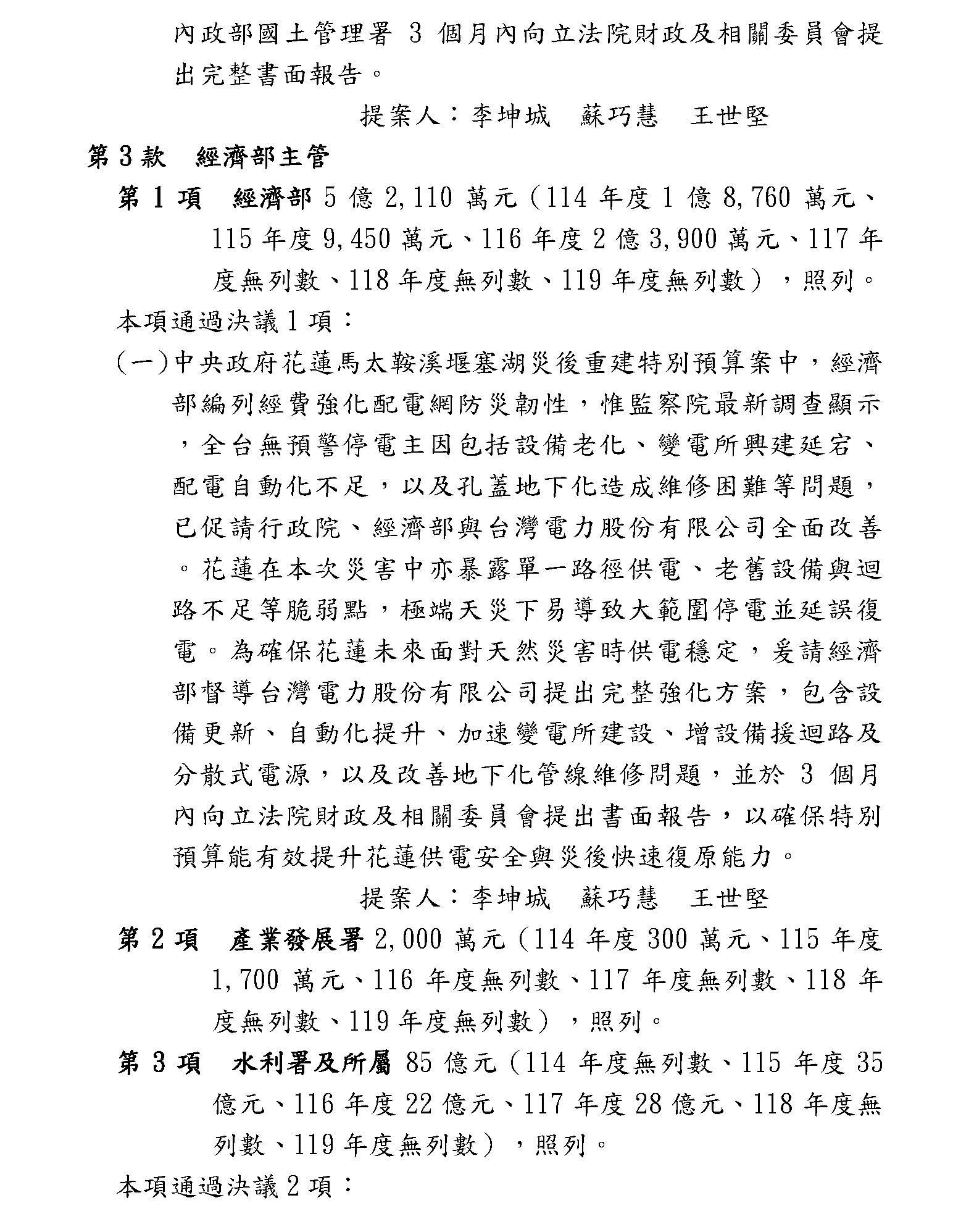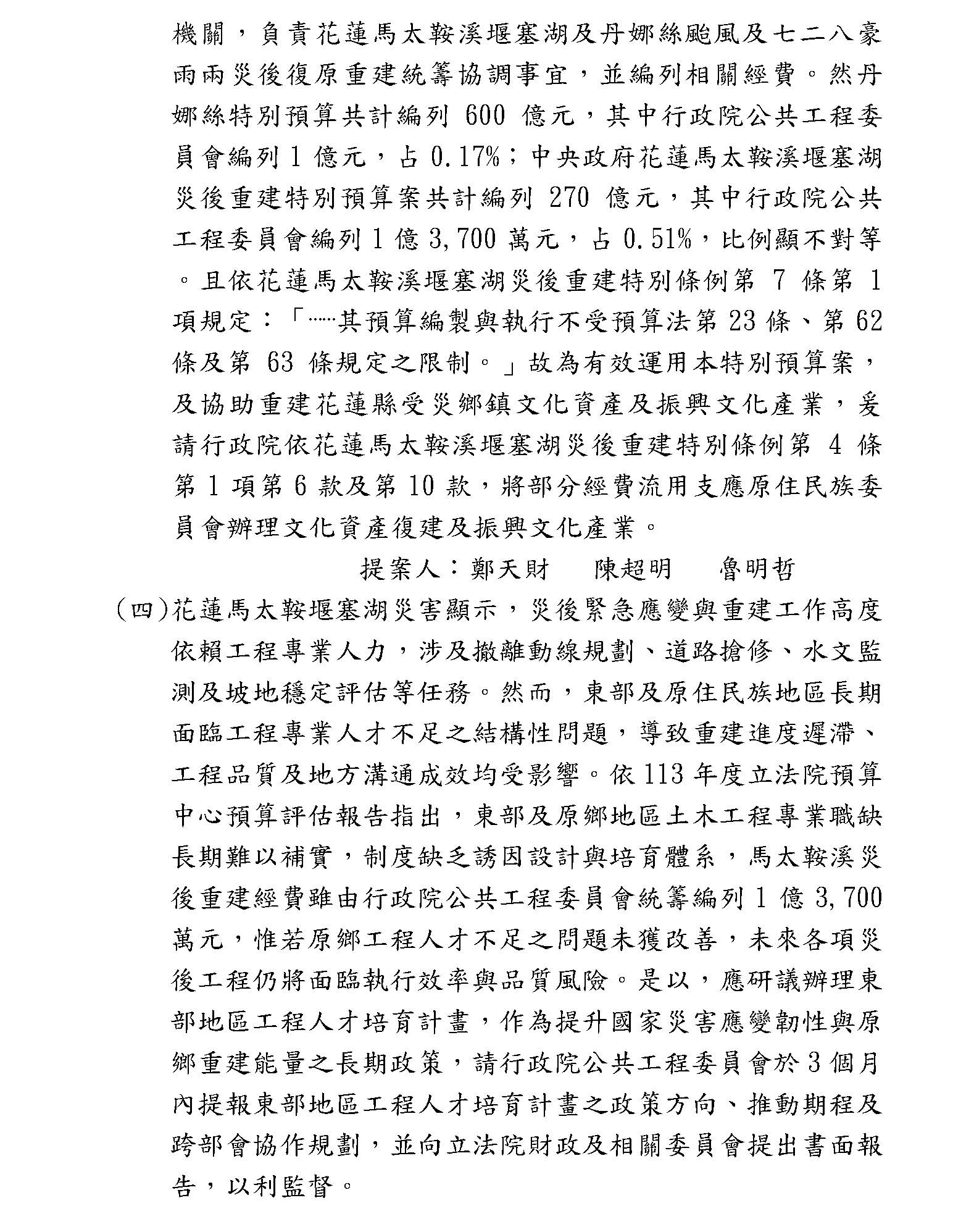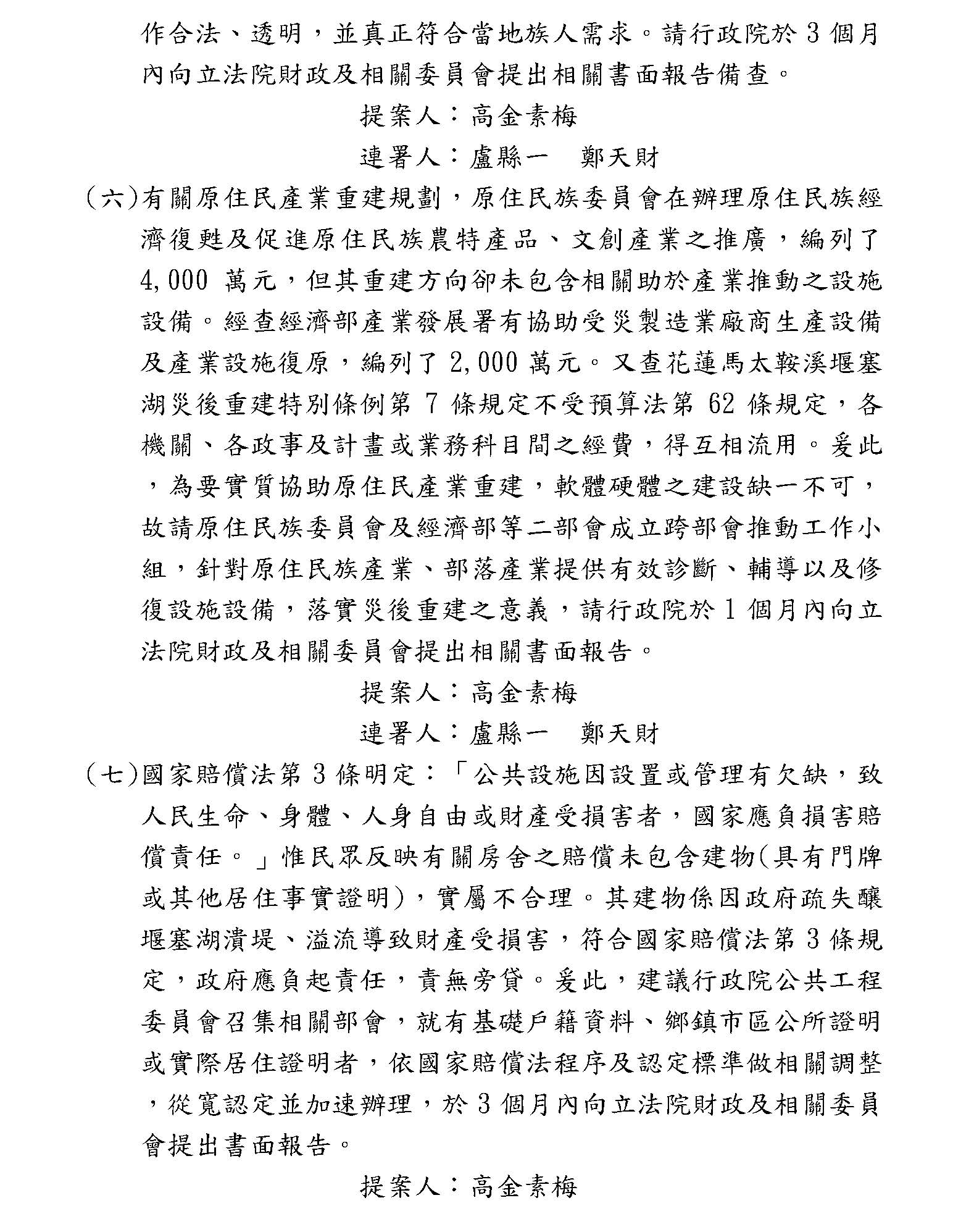 二、中央政府花蓮馬太鞍溪堰塞湖災後重建特別預算案完成立法程序後,由各黨團各推派1人發言,每人發言時間2分鐘。