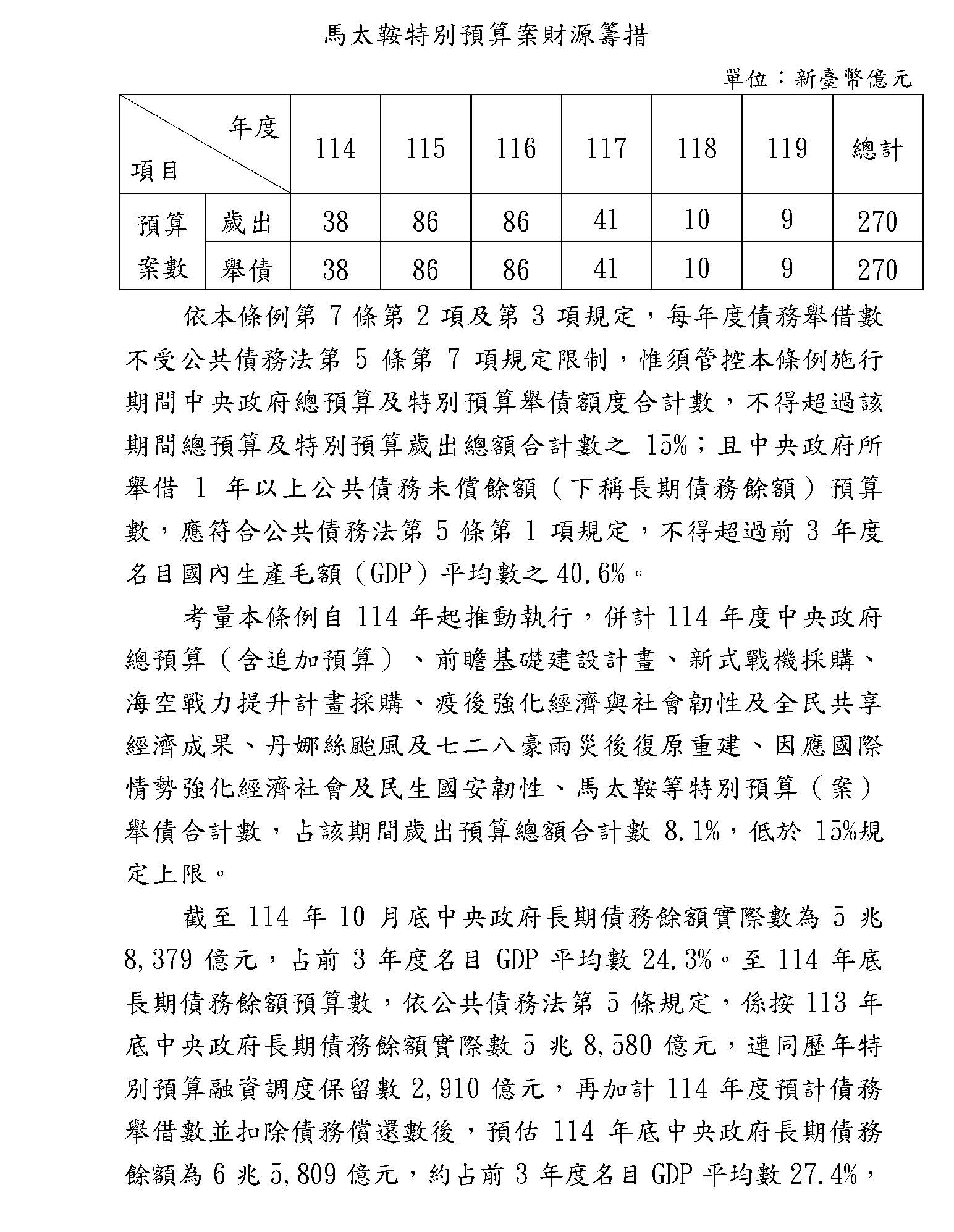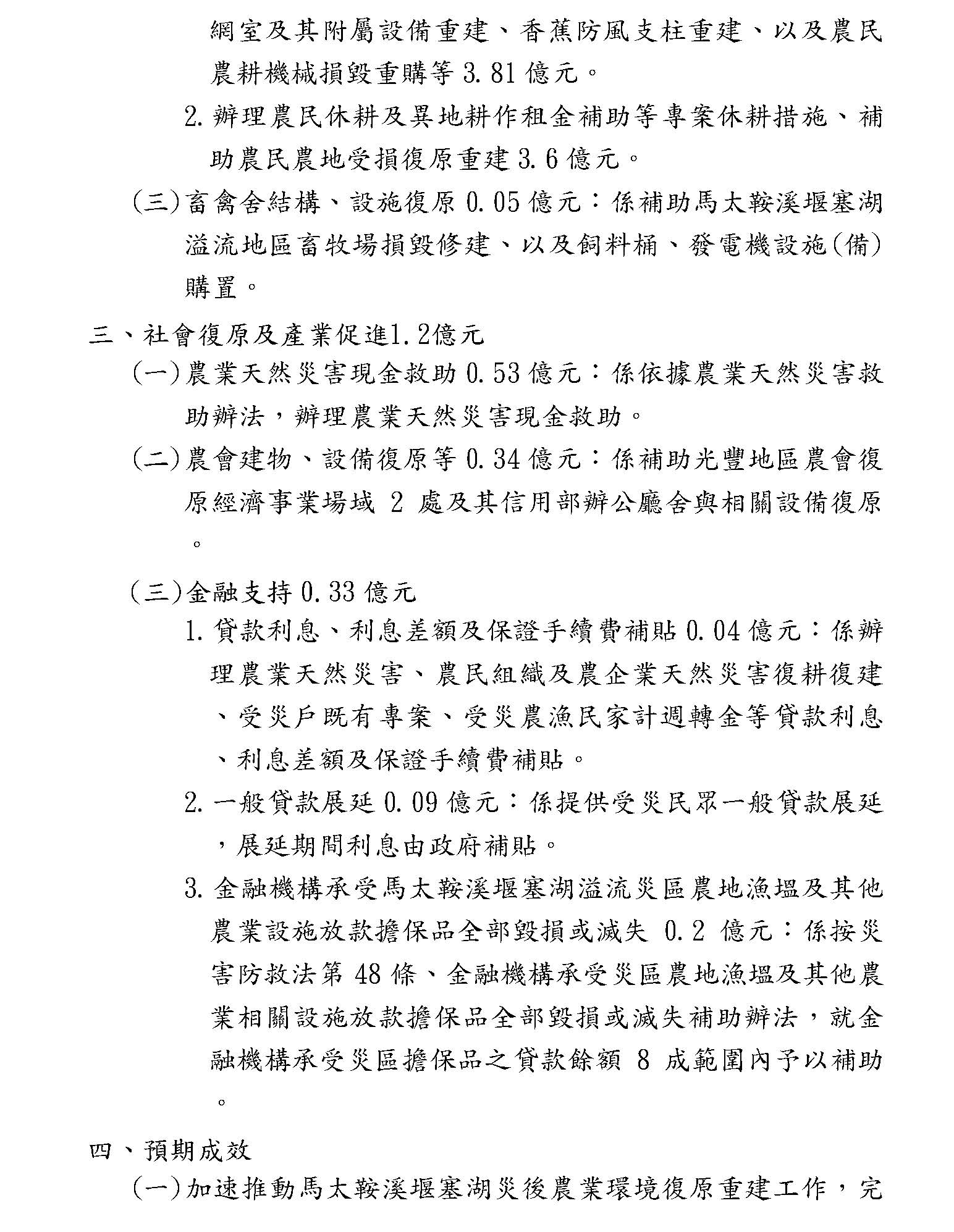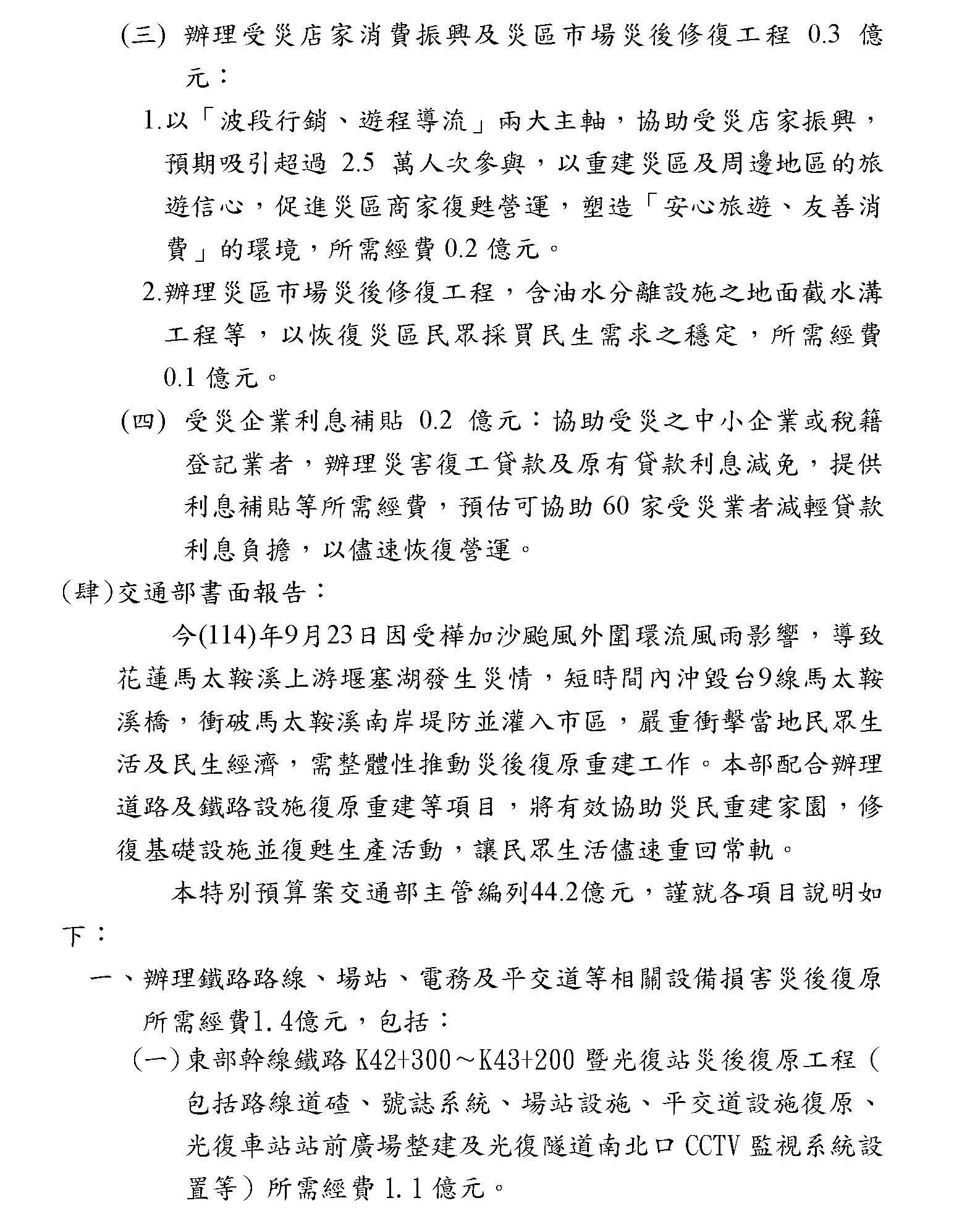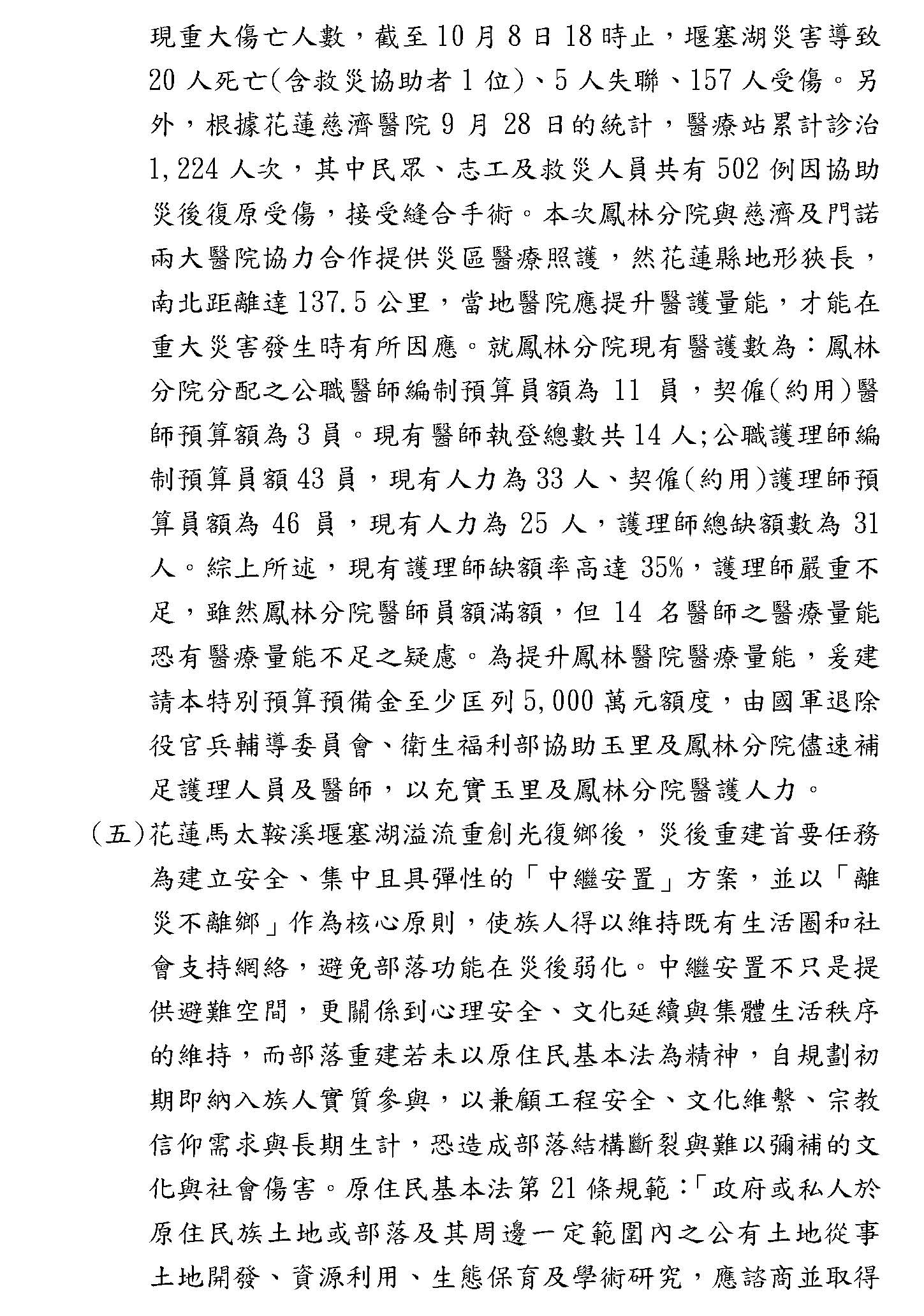 二、中央政府花蓮馬太鞍溪堰塞湖災後重建特別預算案完成立法程序後,由各黨團各推派1人發言,每人發言時間2分鐘。