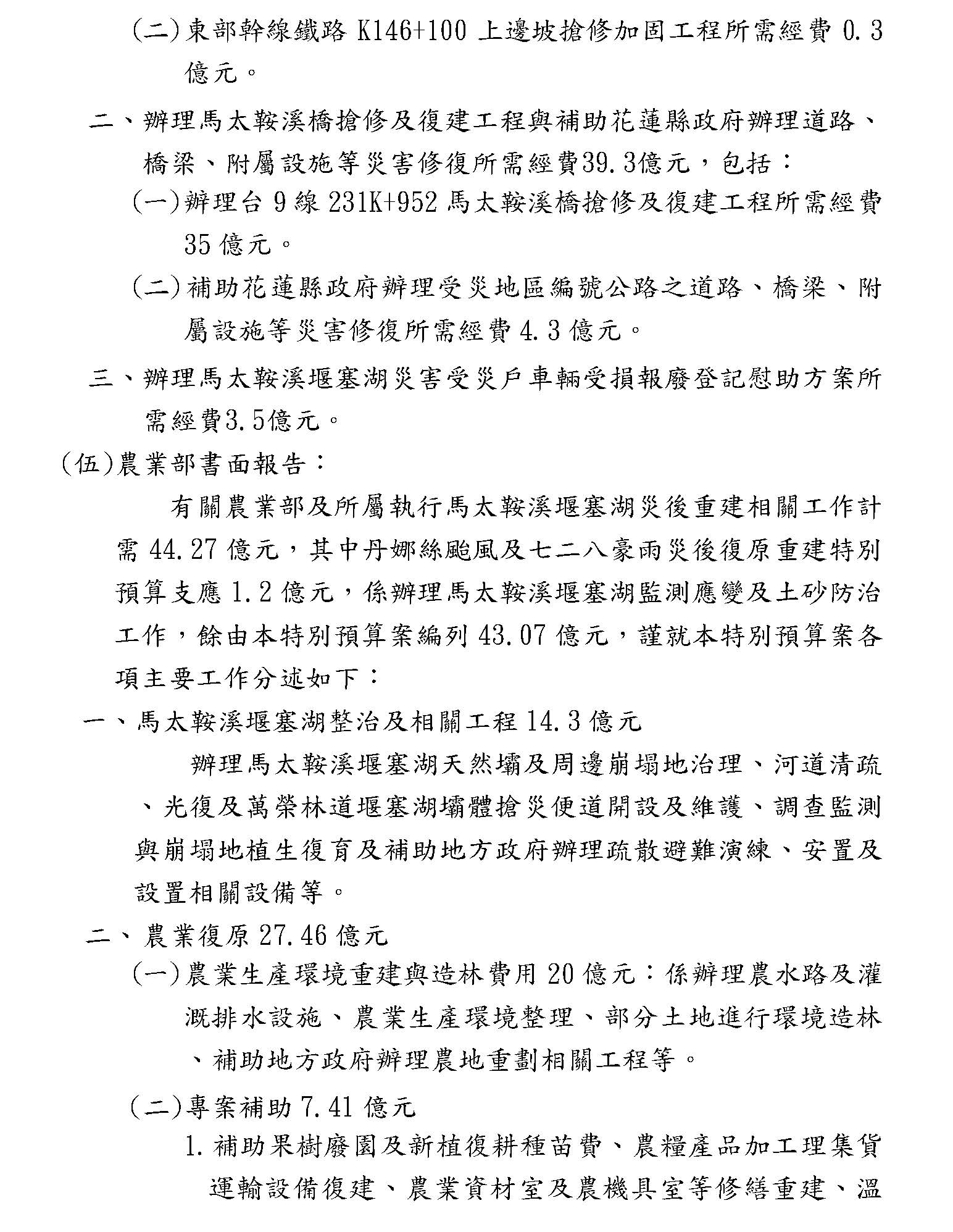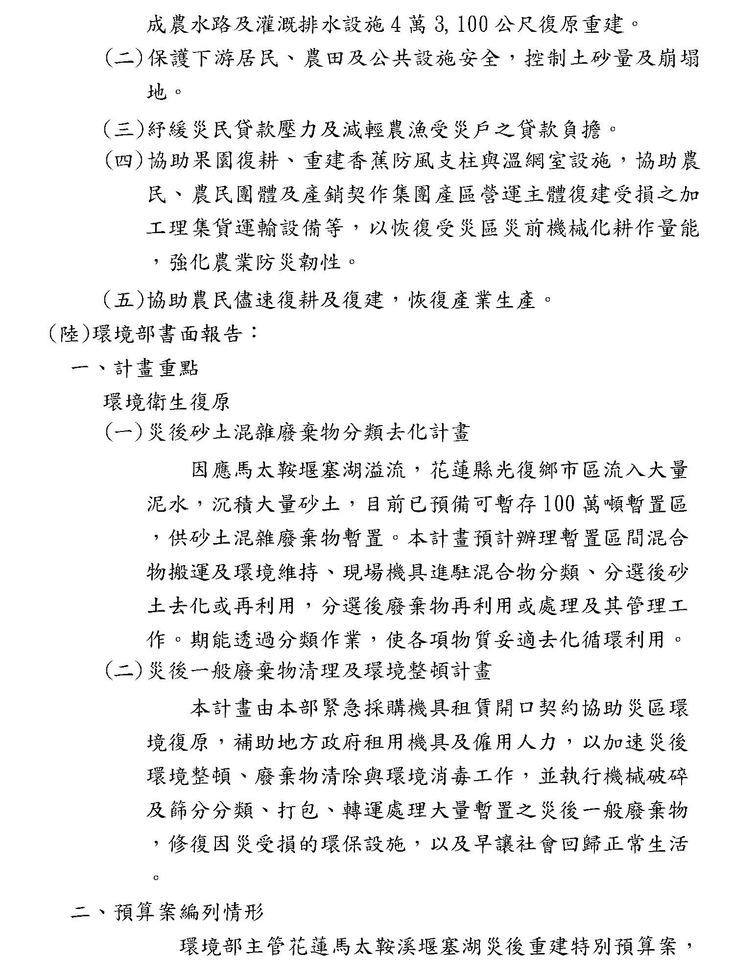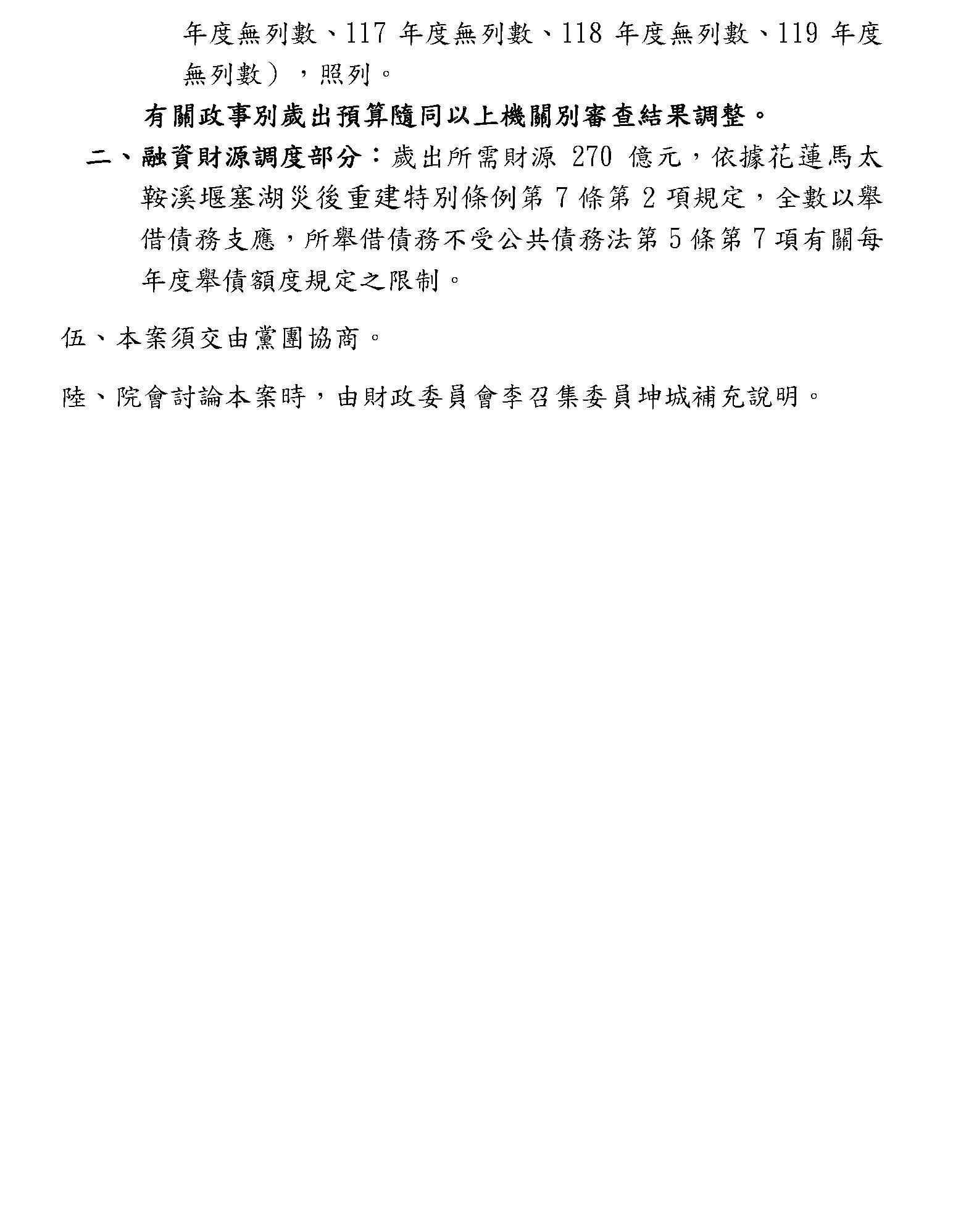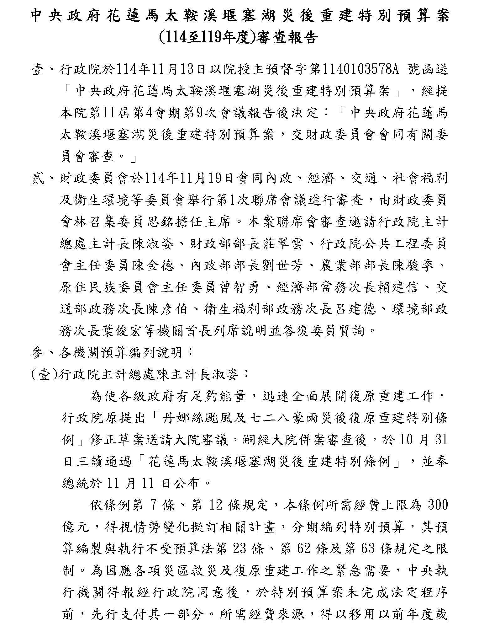 本院財政、內政、經濟、交通、社會福利及衛生環境五委員會報告審查行政院函請審議「中央政府花蓮馬太鞍溪堰塞湖災後重建特別預算案」案。 |
