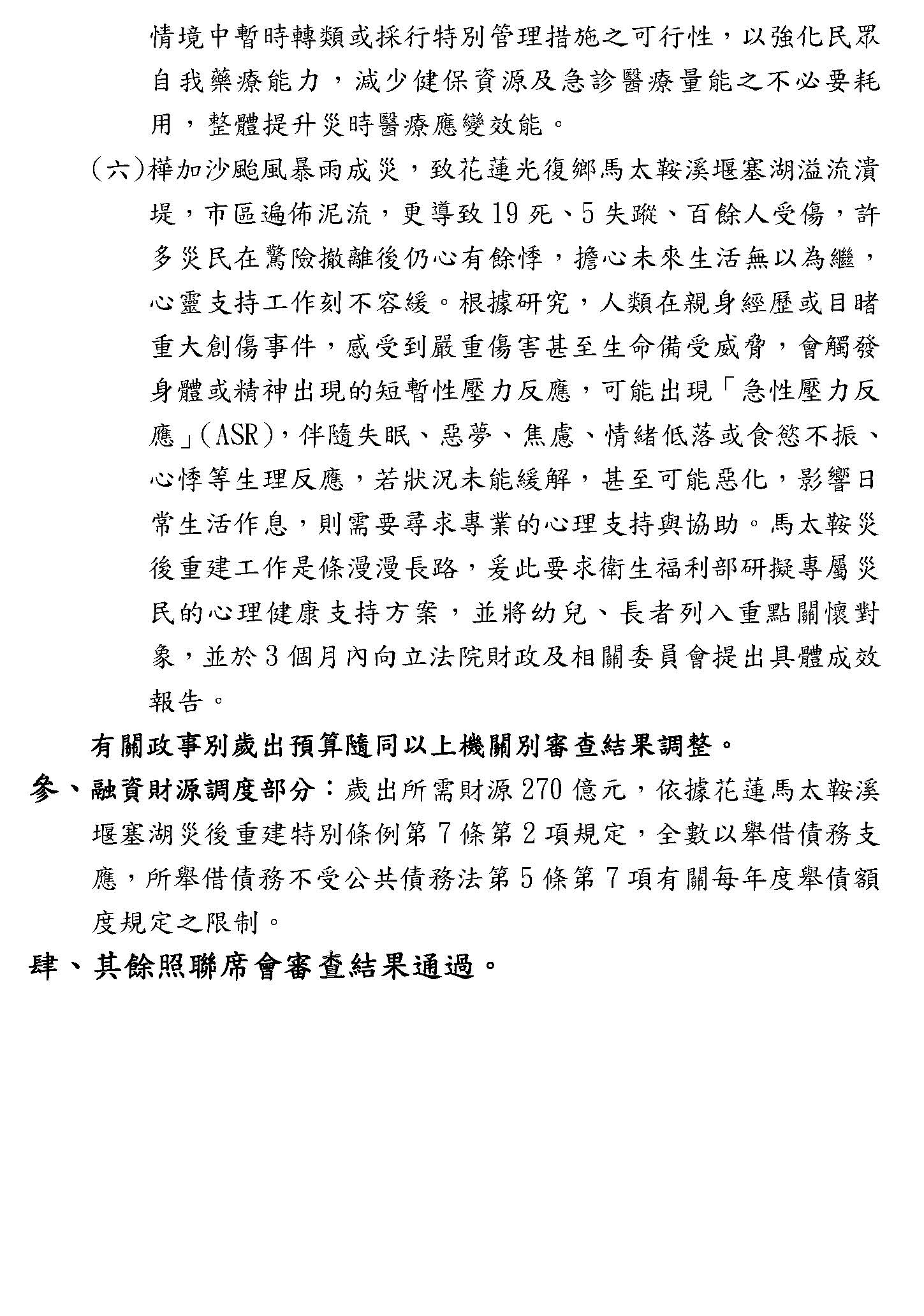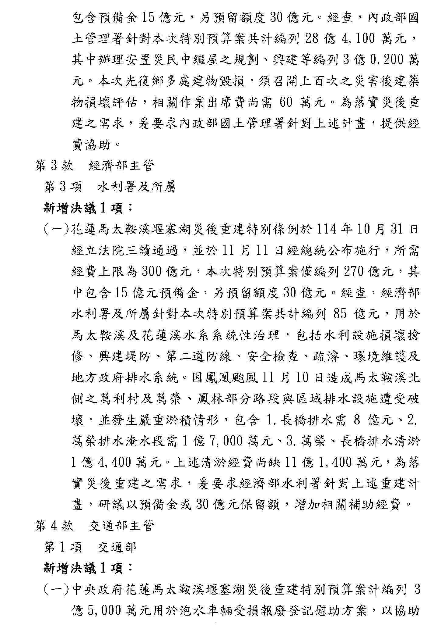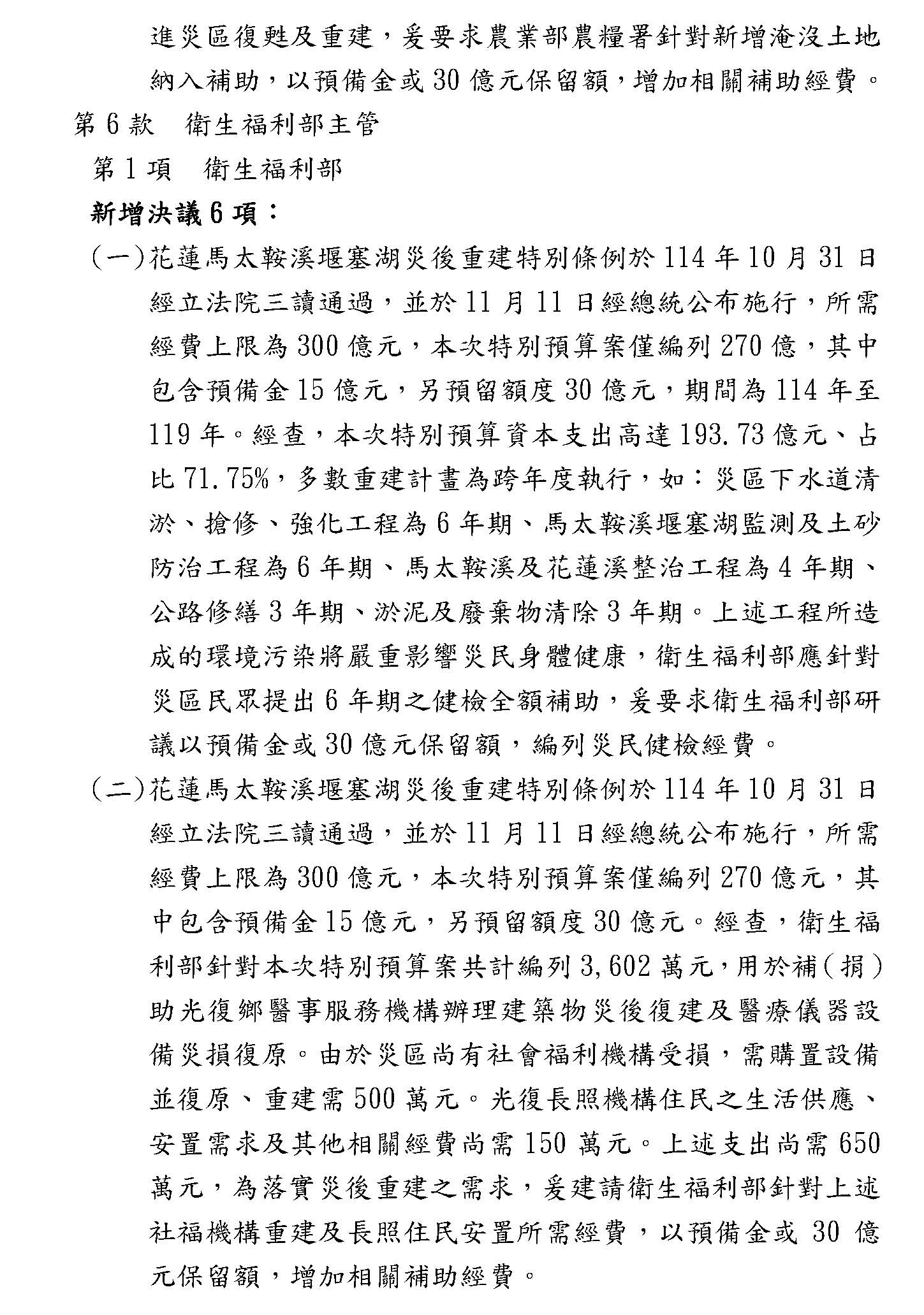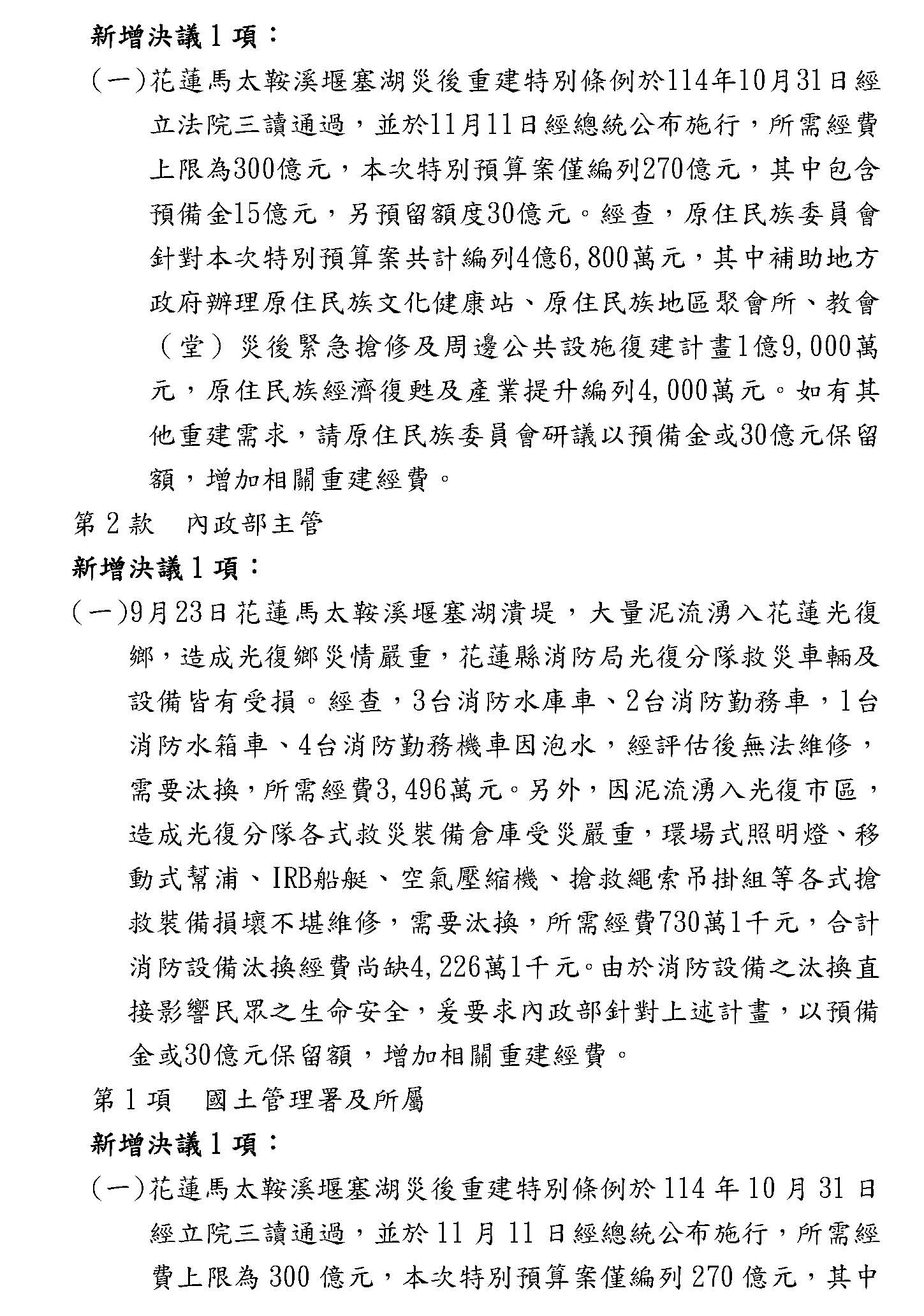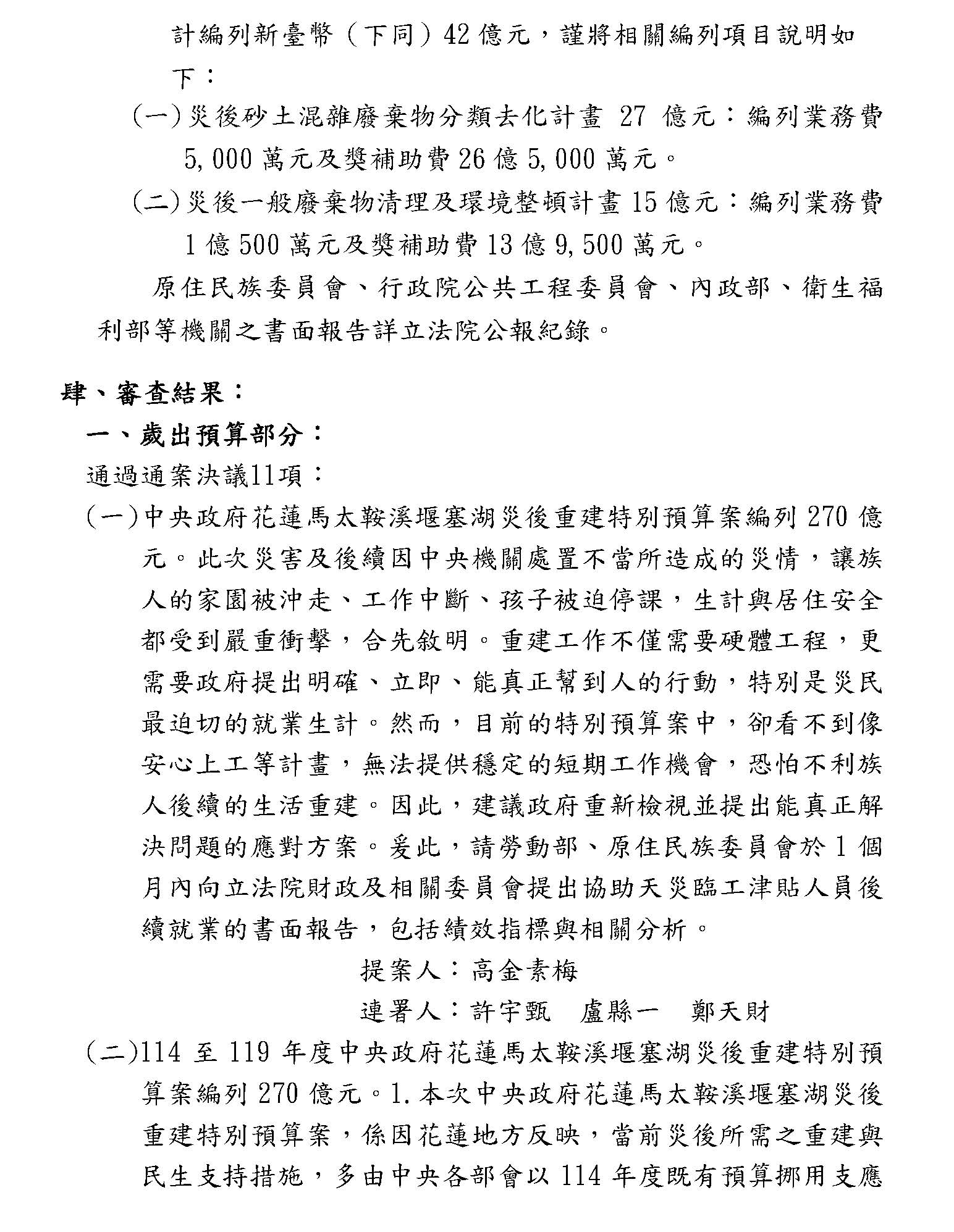 本院財政、內政、經濟、交通、社會福利及衛生環境五委員會報告審查行政院函請審議「中央政府花蓮馬太鞍溪堰塞湖災後重建特別預算案」案。 |