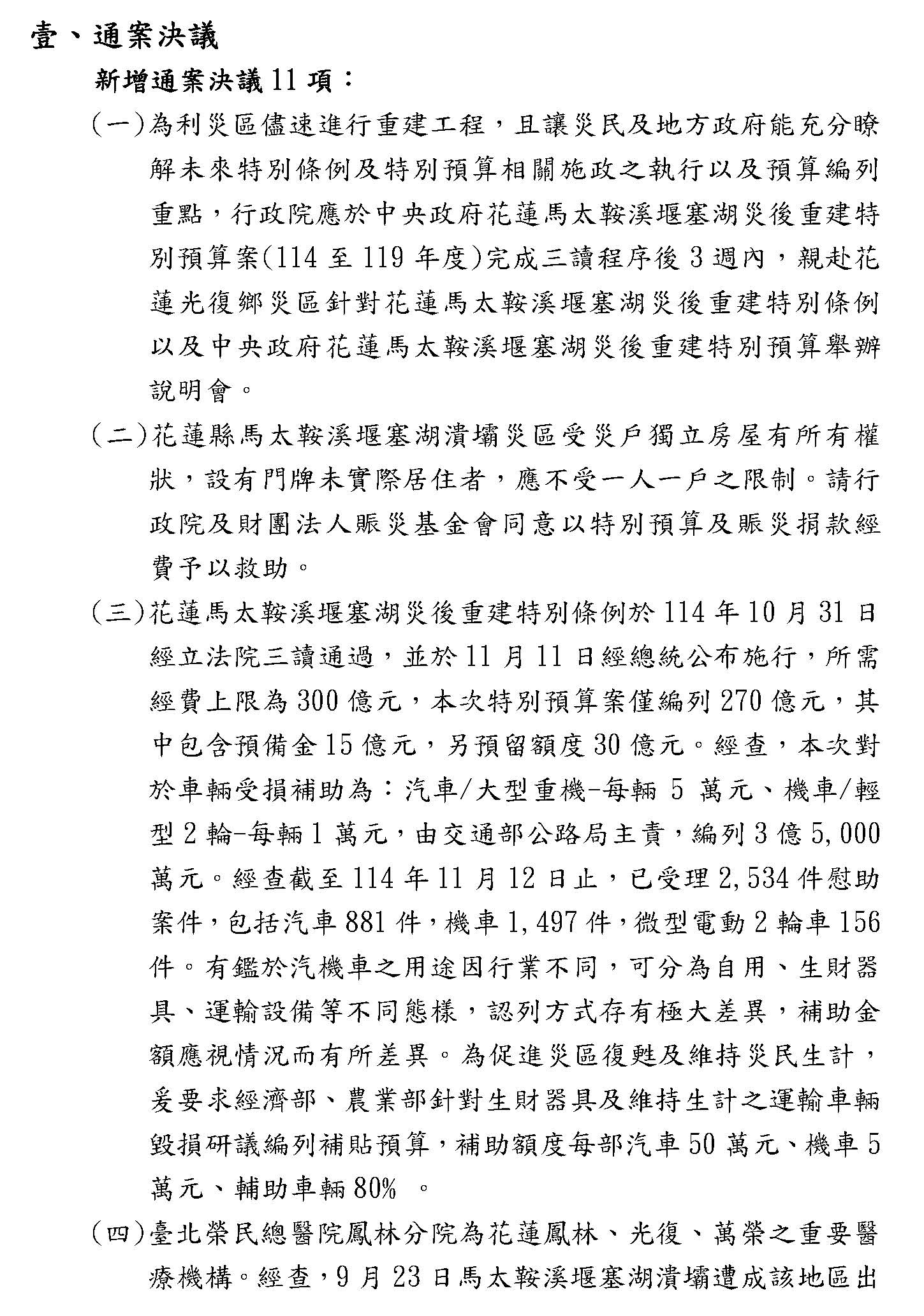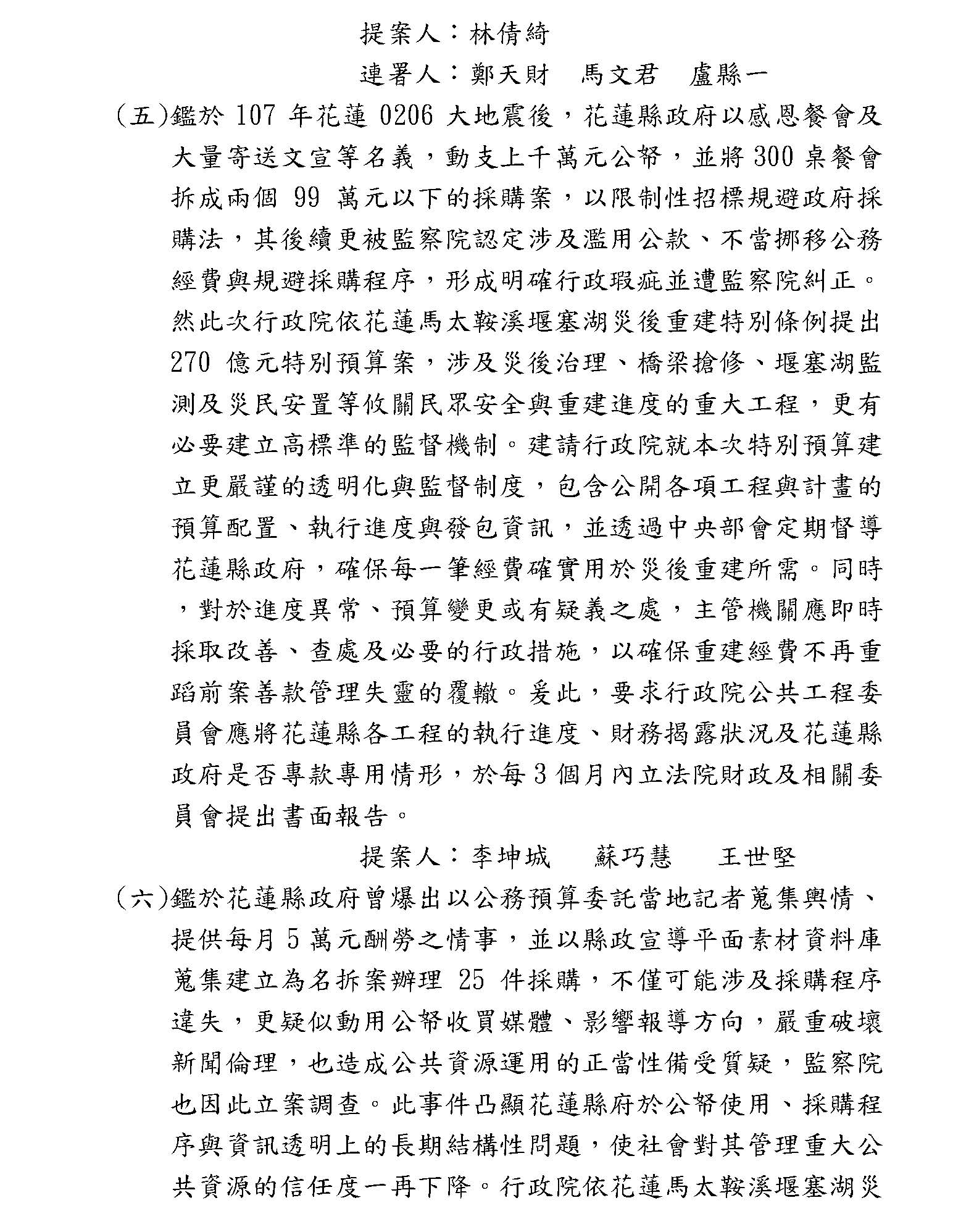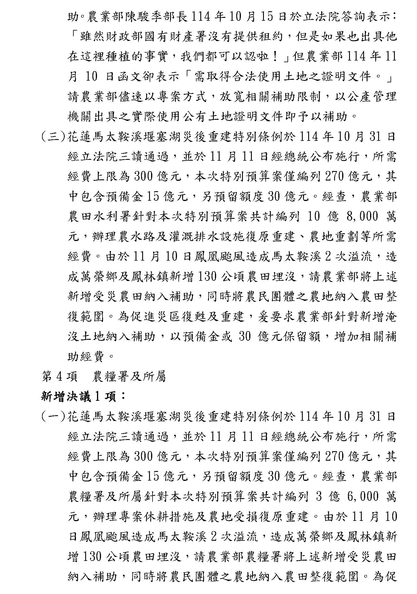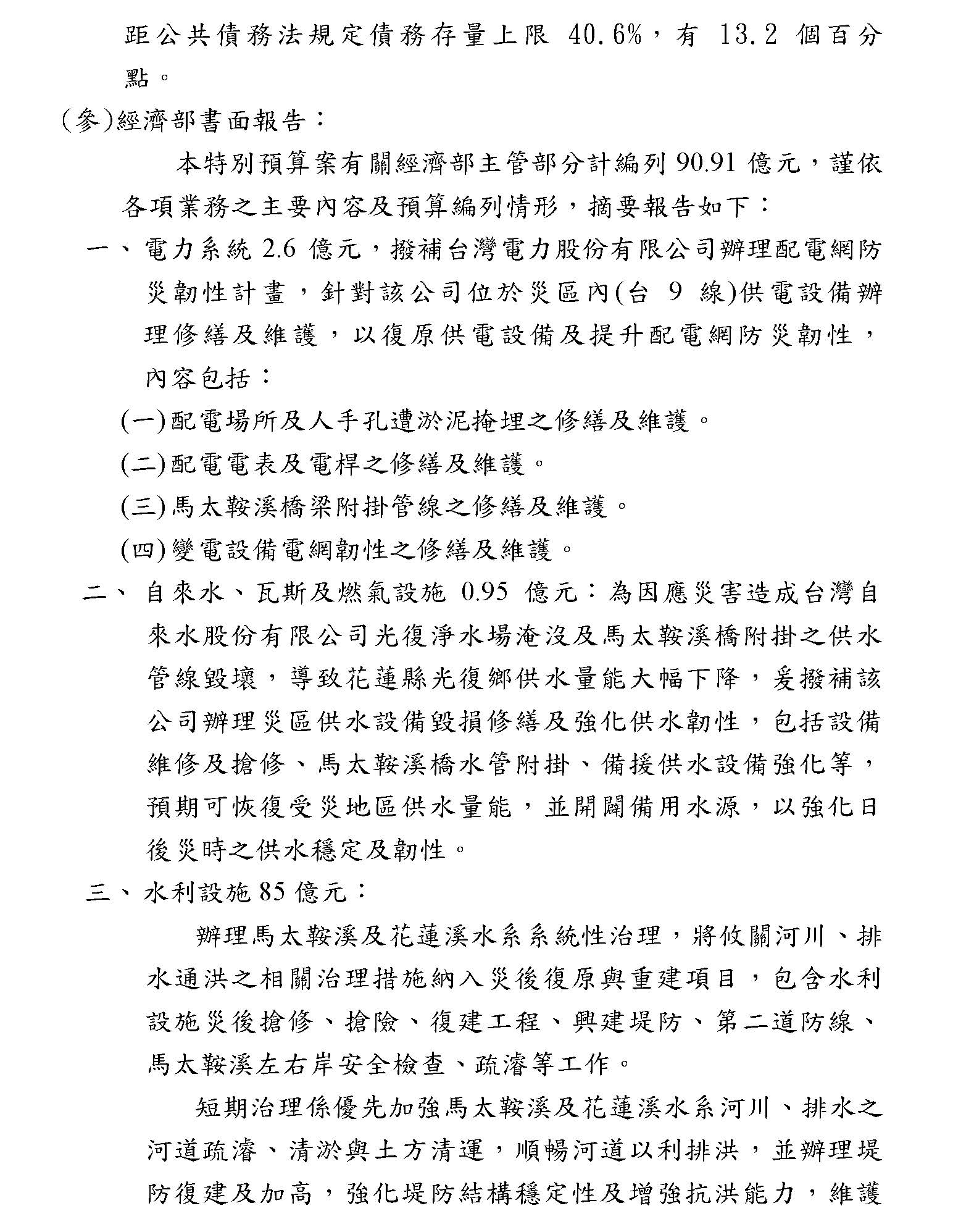 本院財政、內政、經濟、交通、社會福利及衛生環境五委員會報告審查行政院函請審議「中央政府花蓮馬太鞍溪堰塞湖災後重建特別預算案」案。 |
