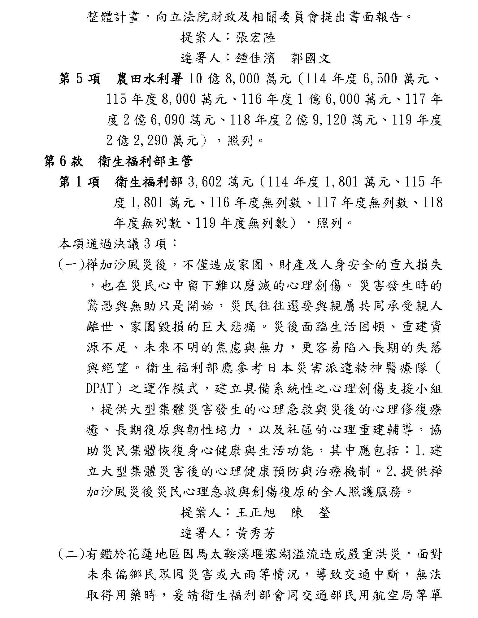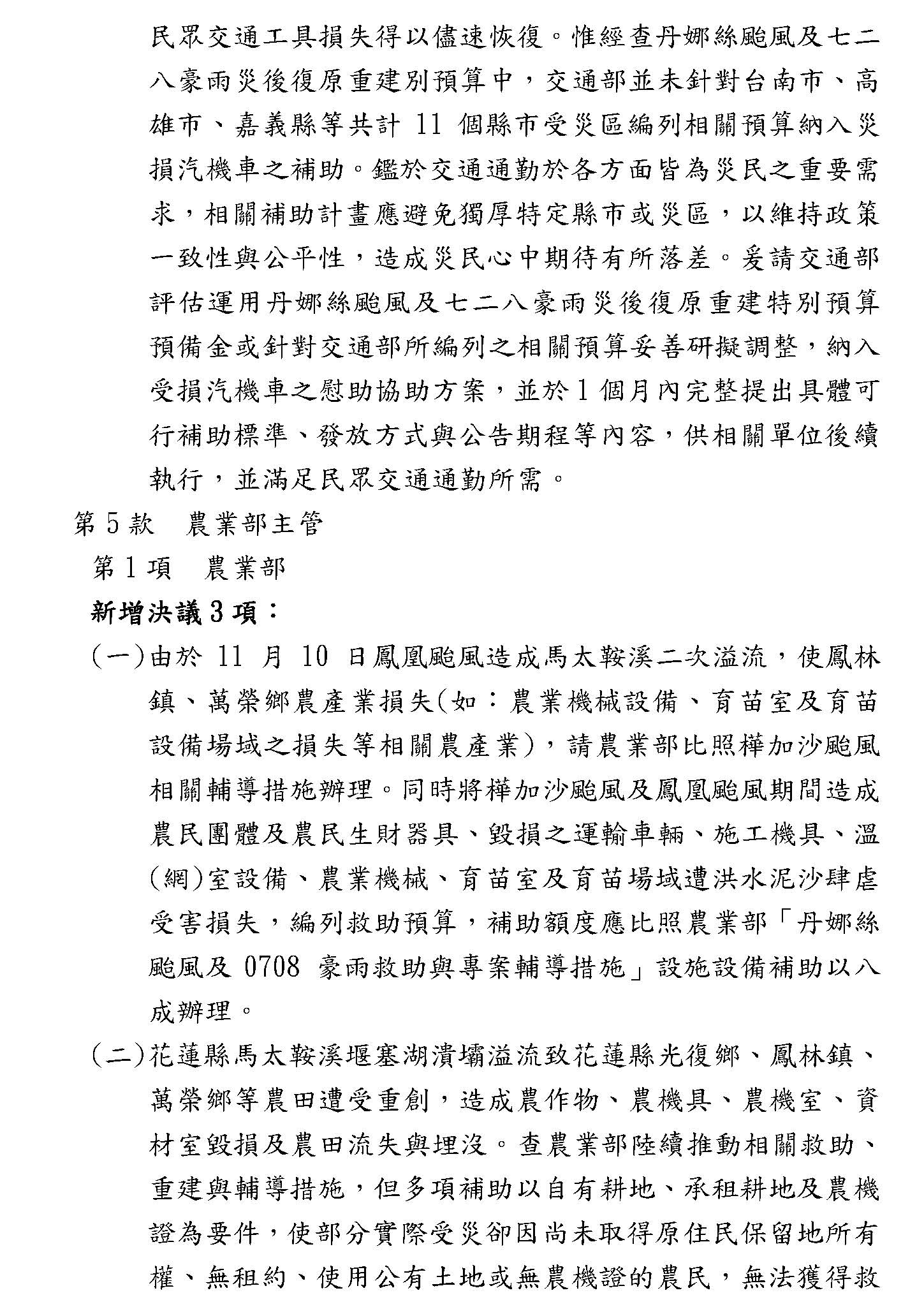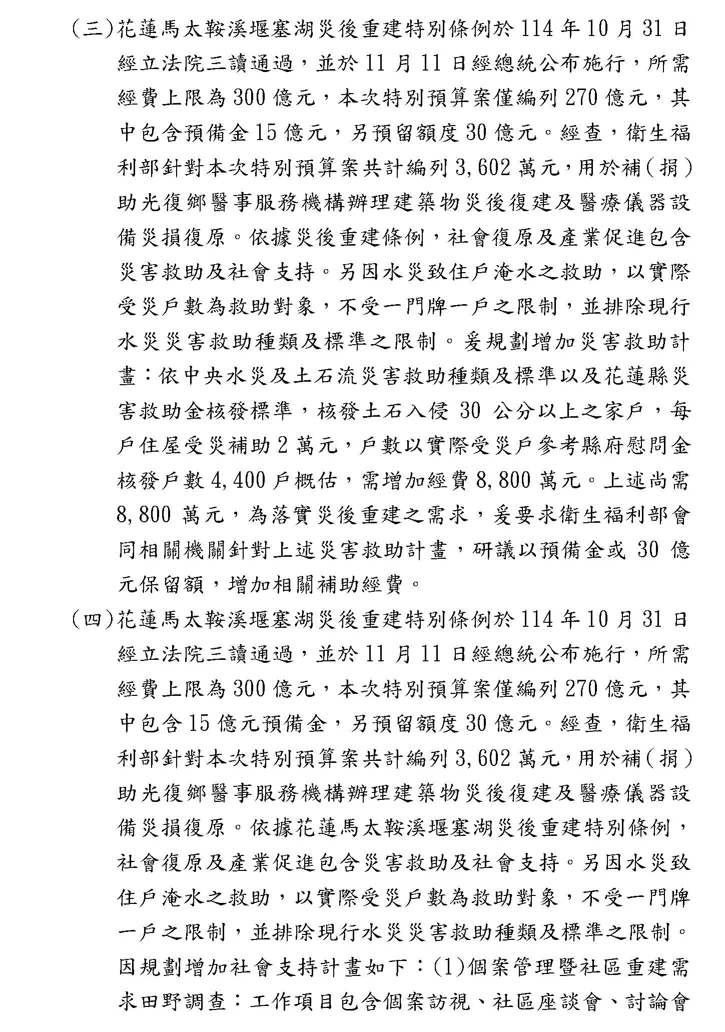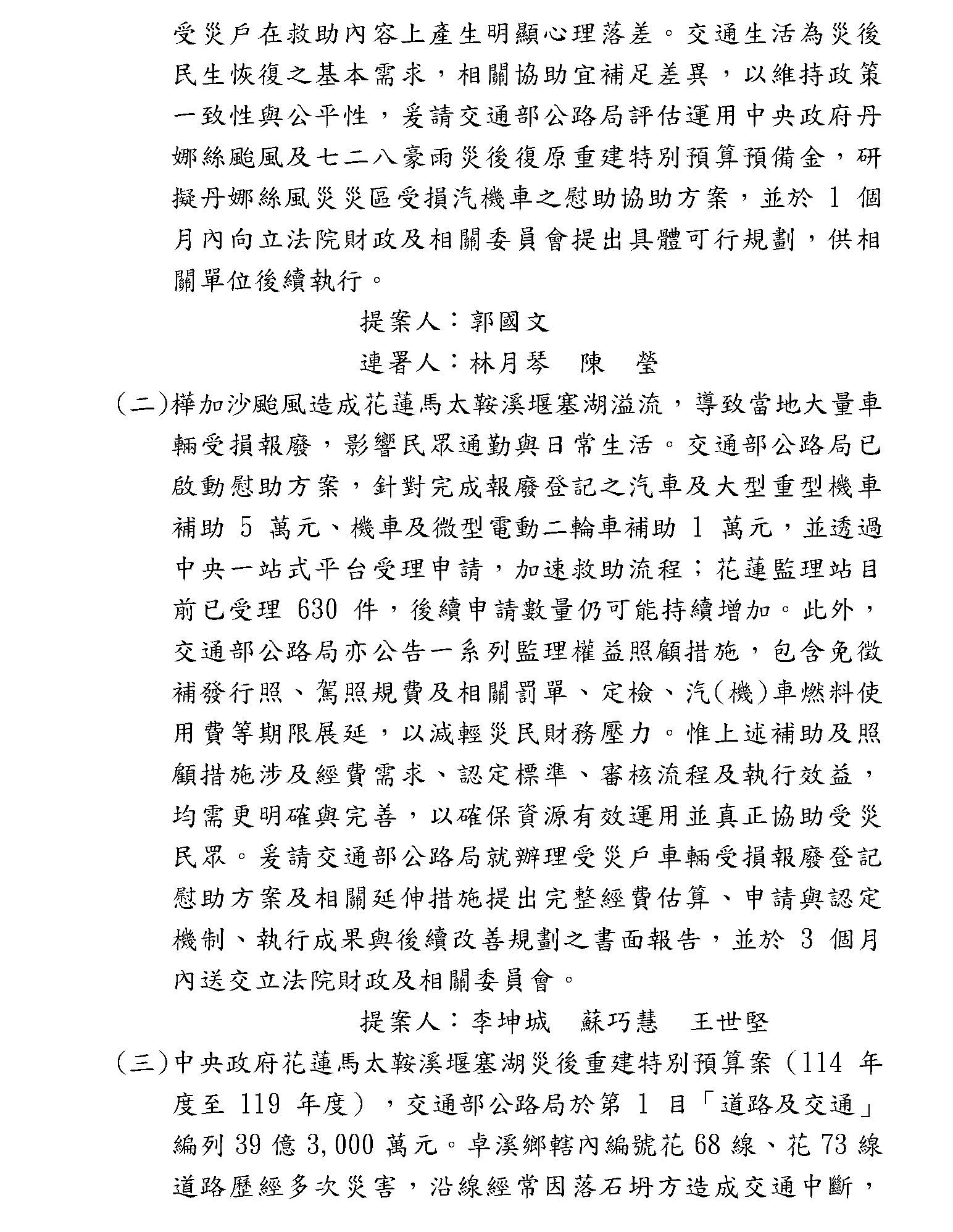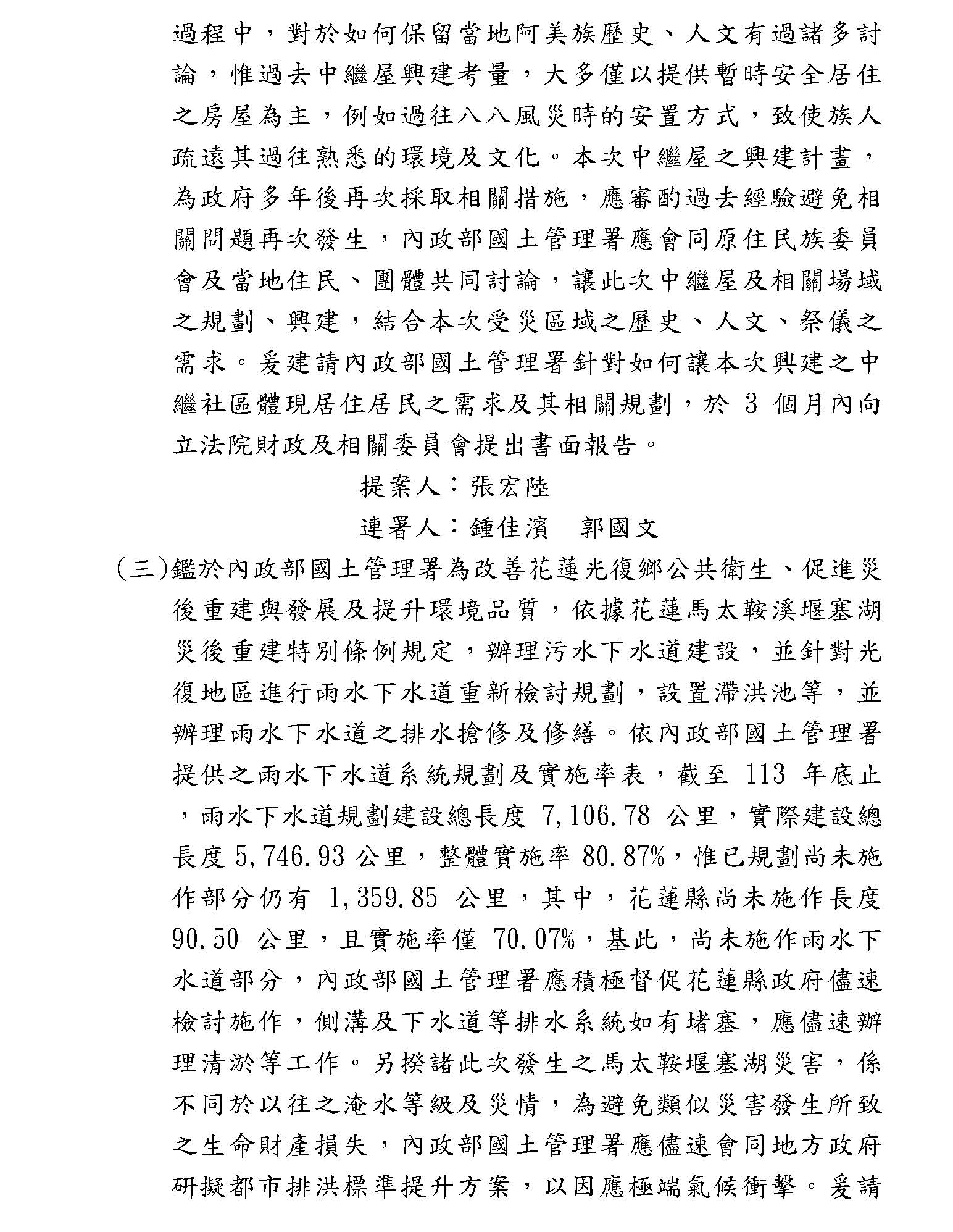 本院財政、內政、經濟、交通、社會福利及衛生環境五委員會報告審查行政院函請審議「中央政府花蓮馬太鞍溪堰塞湖災後重建特別預算案」案。 |