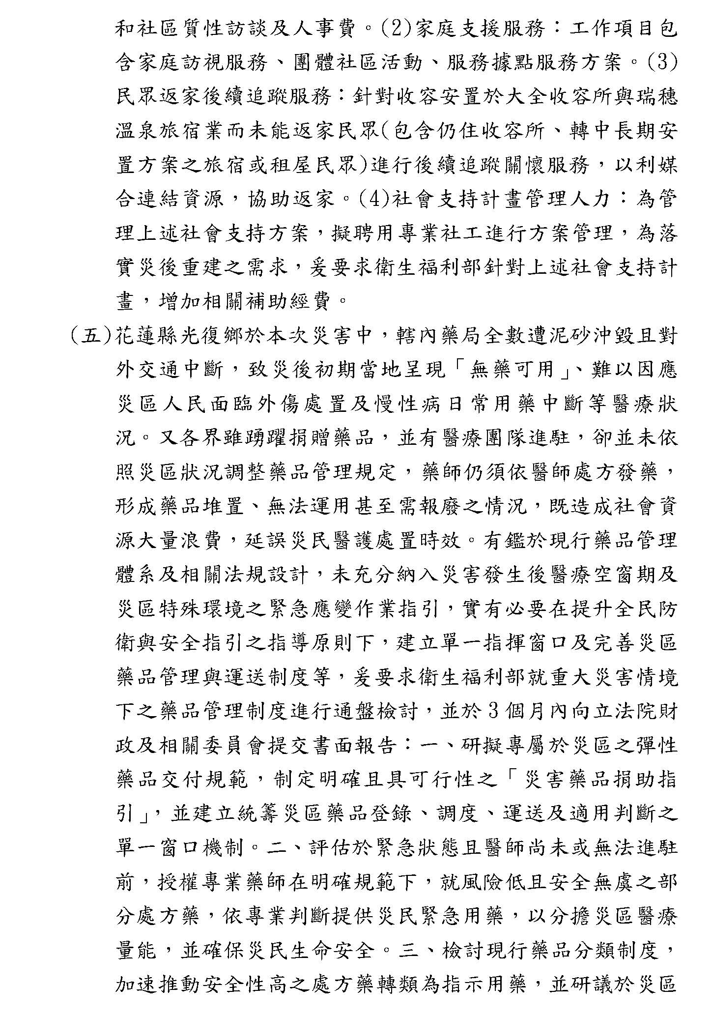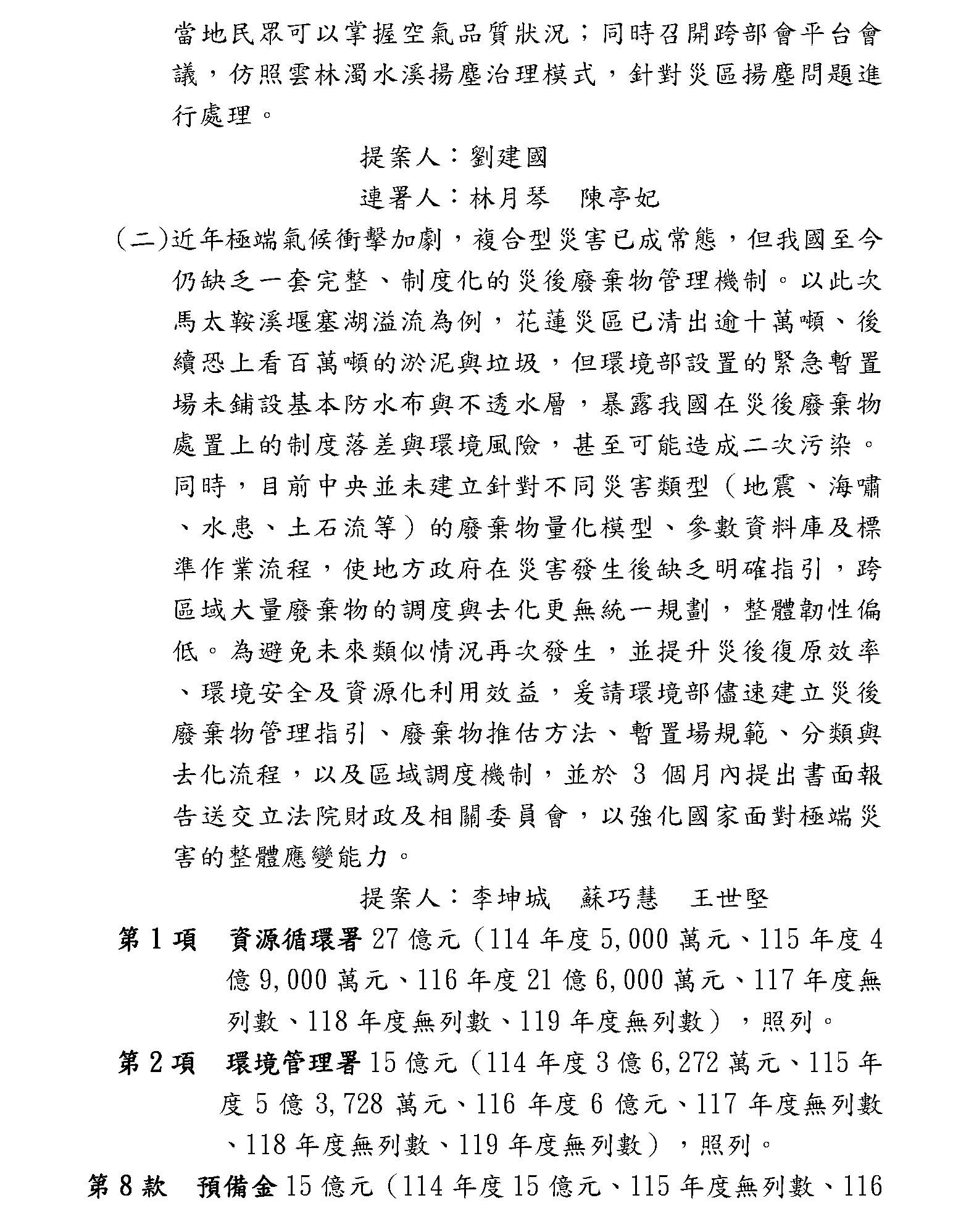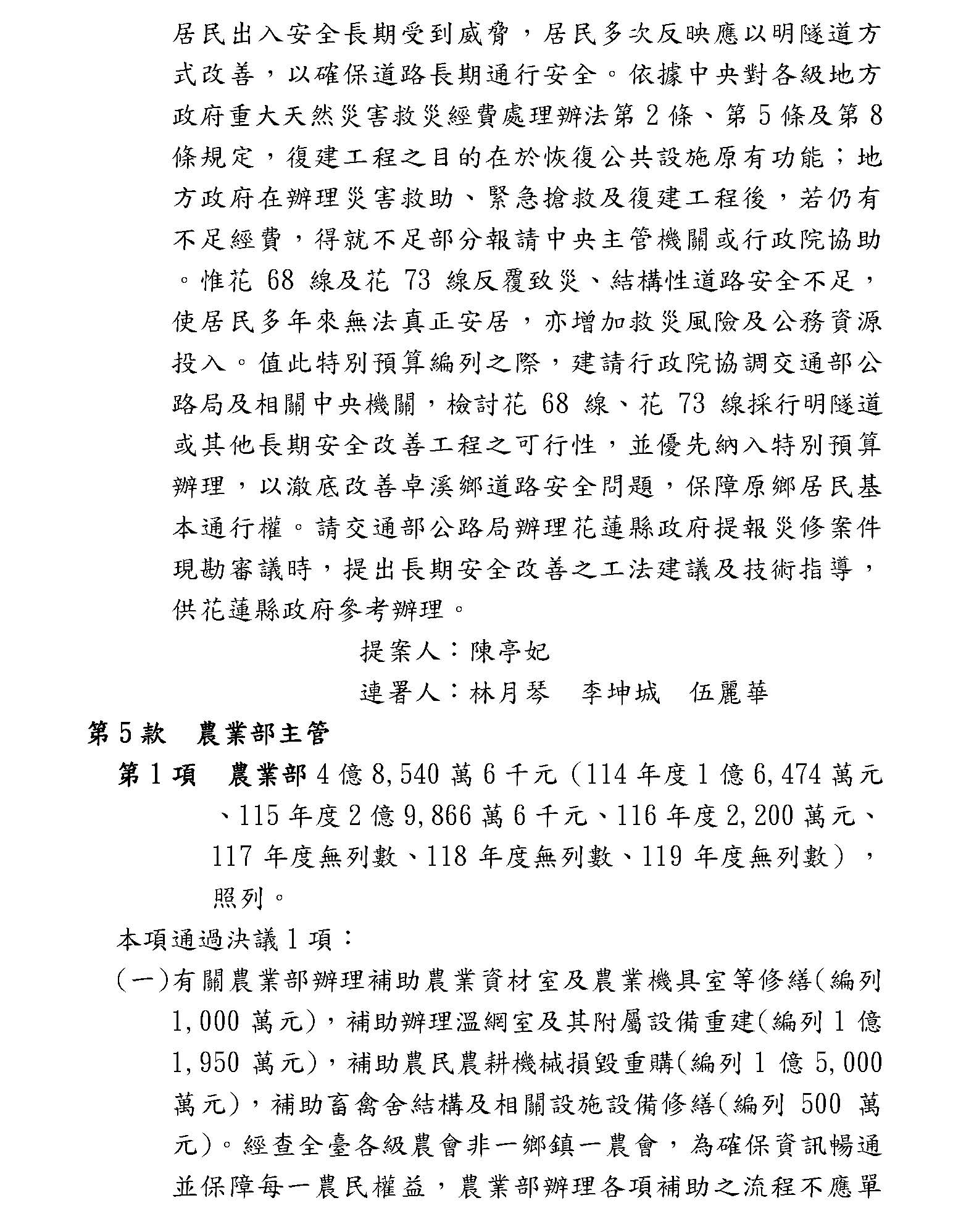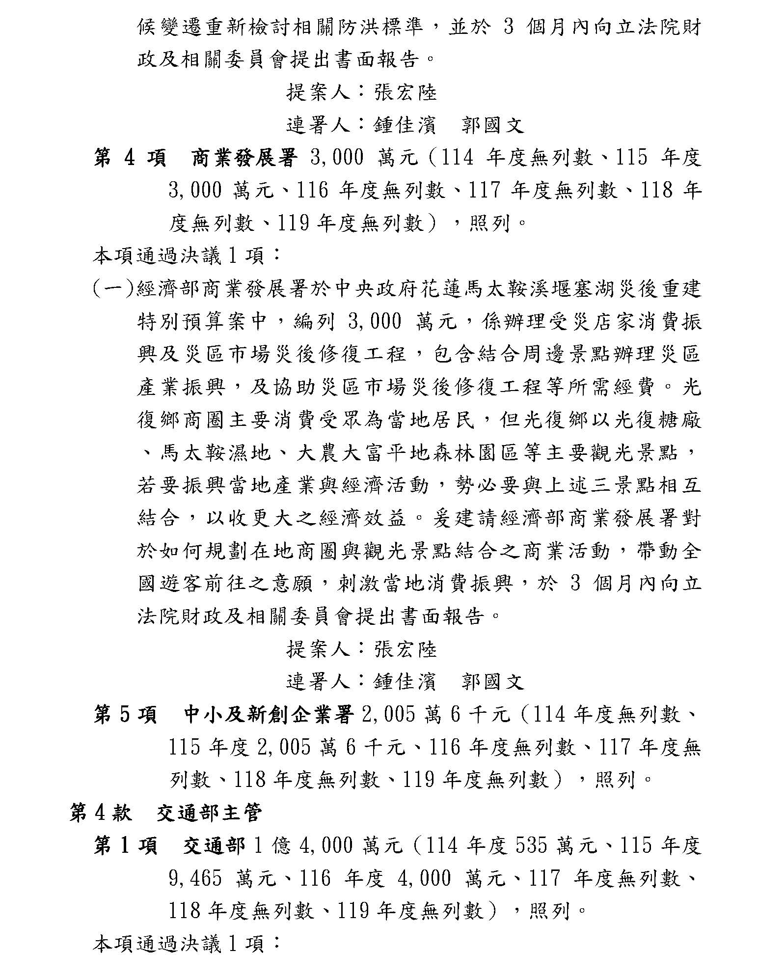 本院財政、內政、經濟、交通、社會福利及衛生環境五委員會報告審查行政院函請審議「中央政府花蓮馬太鞍溪堰塞湖災後重建特別預算案」案。 |