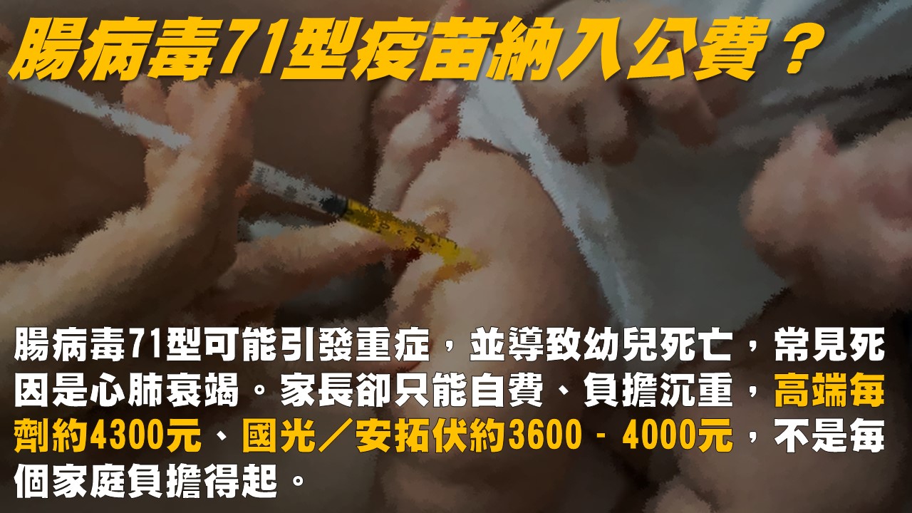 但公費政策遲遲沒有決策,家長只能自費(「高端腸病毒71型疫苗」每劑約為4,300元,而「國光/安拓伏腸病毒71型疫苗」每劑約為3,600到4,000元),負擔沉重。