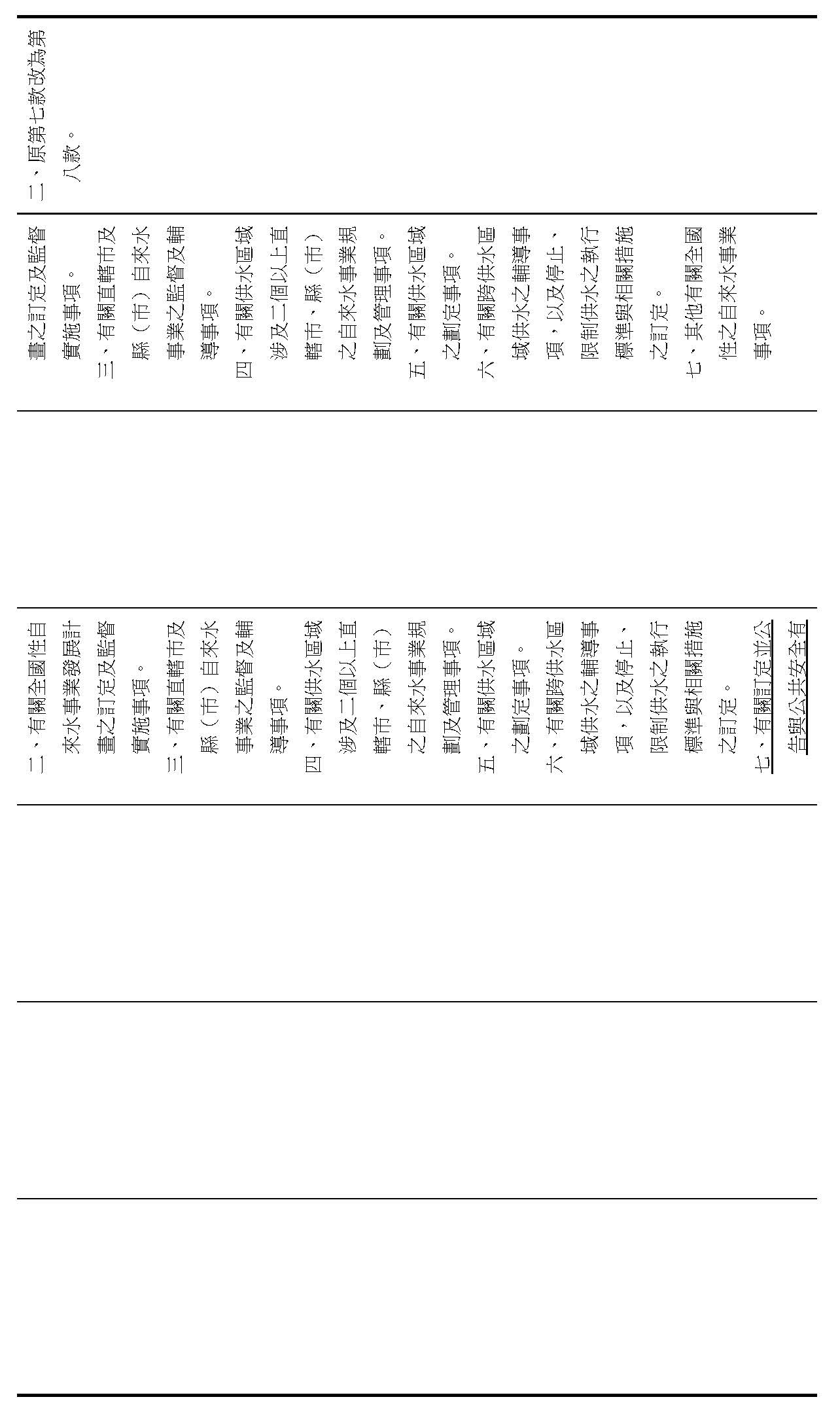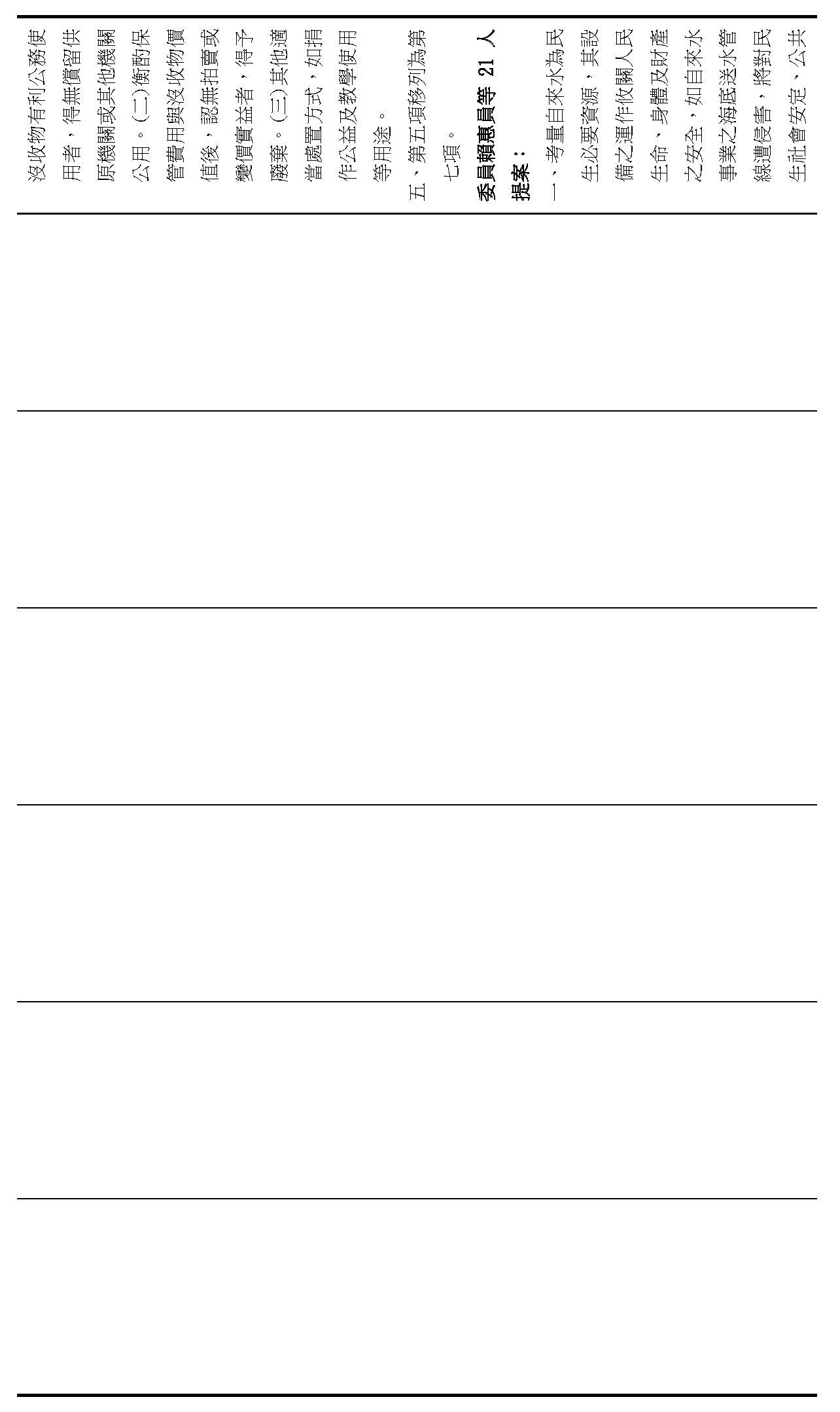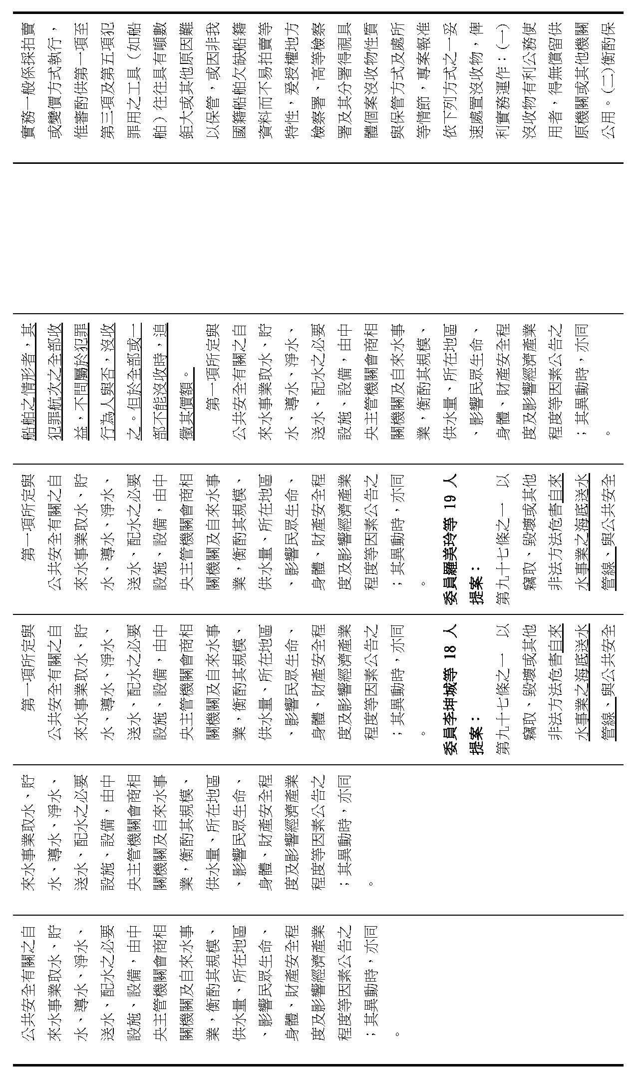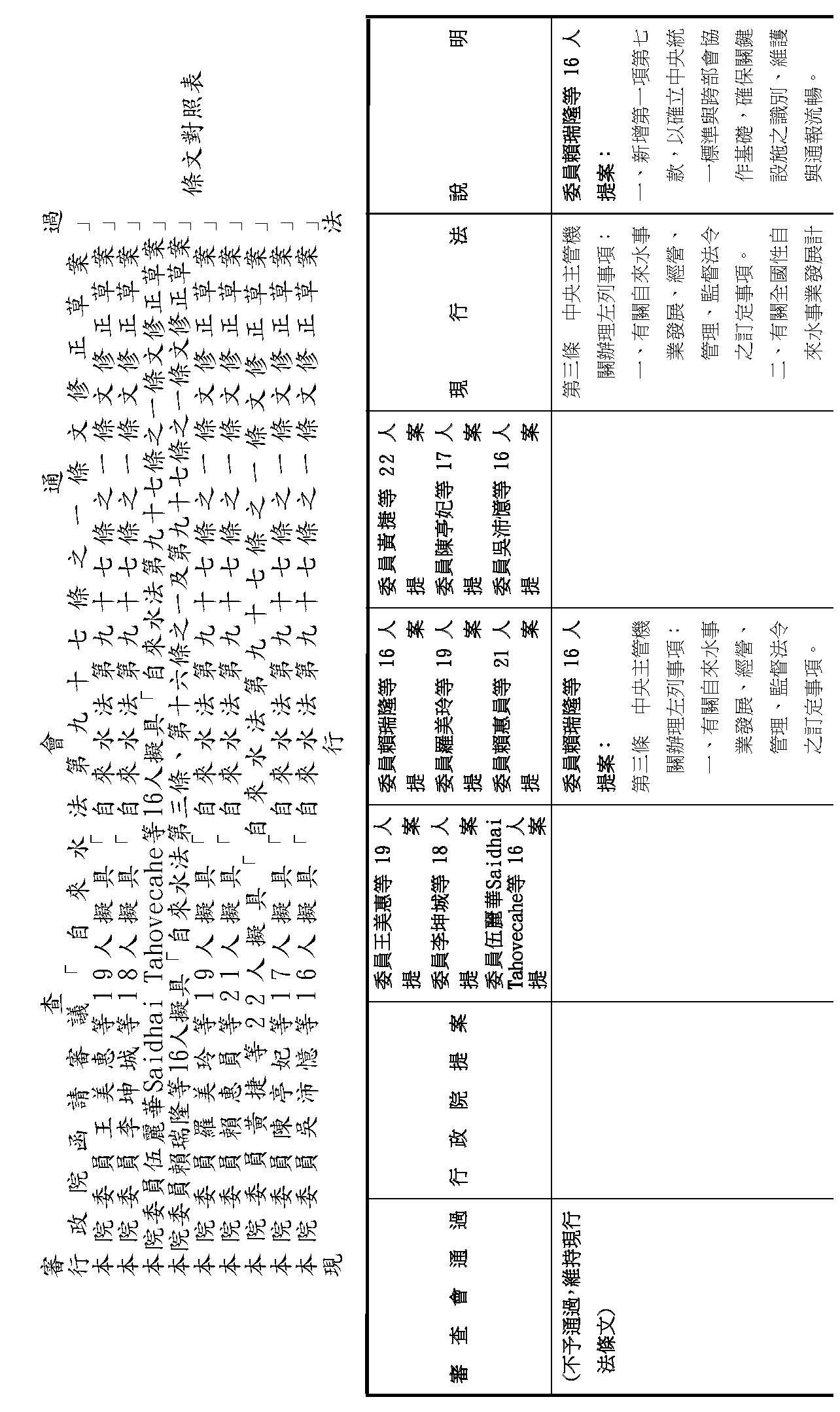 主旨:院會交付本會審查行政院函請審議「自來水法第九十七條之一條文修正草案」及委員王美惠等19人、委員李坤城等18人、委員伍麗華Saidhai Tahovecahe等16人、委員羅美玲等19人、委員賴惠員等21人、委員黃捷等22人、委員陳亭妃等17人、委員吳沛憶等16人分別擬具「自來水法第九十七條之一條文修正草案」、委員賴瑞隆等16人擬具「自來水法第三條、第十六條之一及第九十七條之一條文修正草案」等10案,業經併案審查完竣,並決議不須交由黨團協商,復請提報院會討論。
