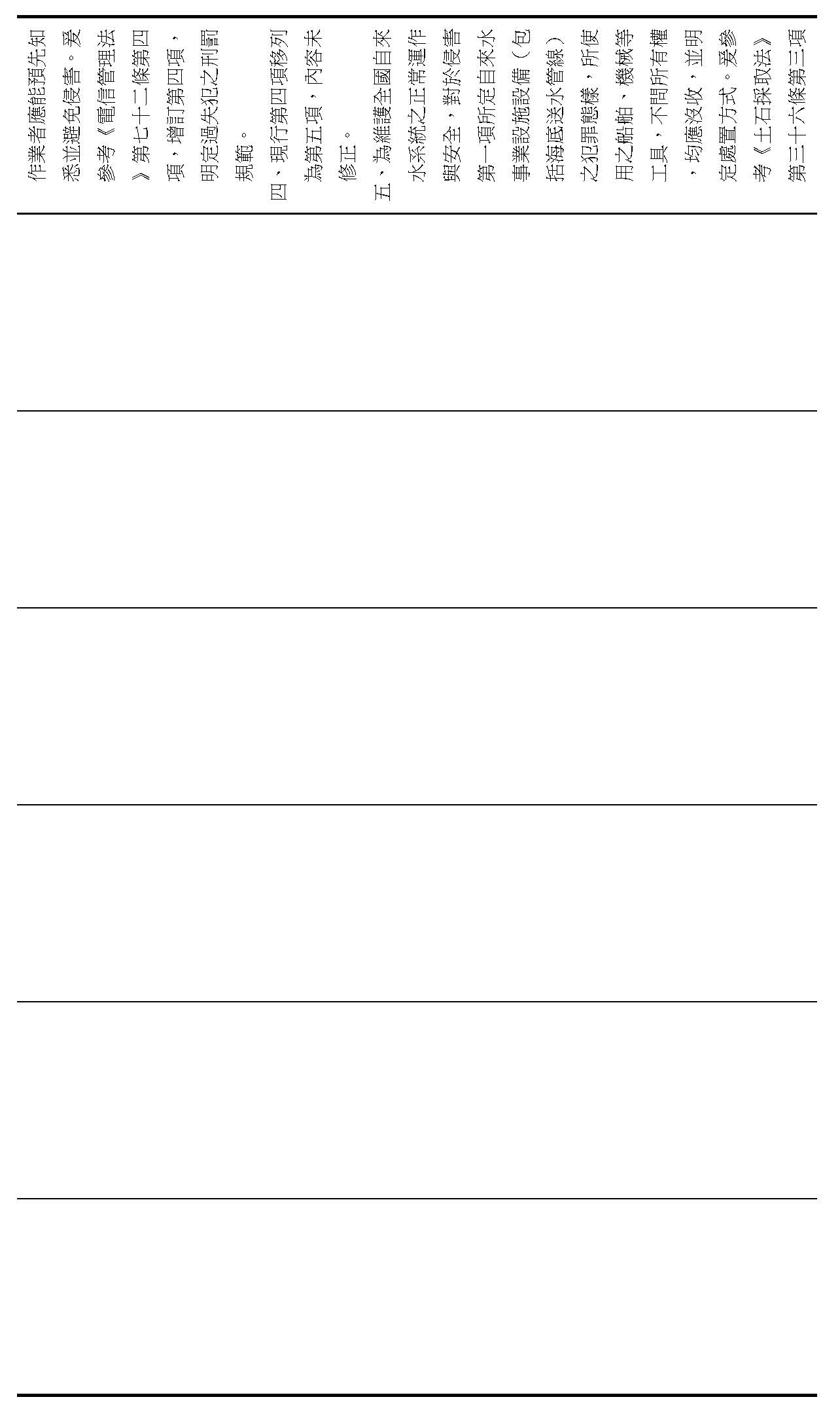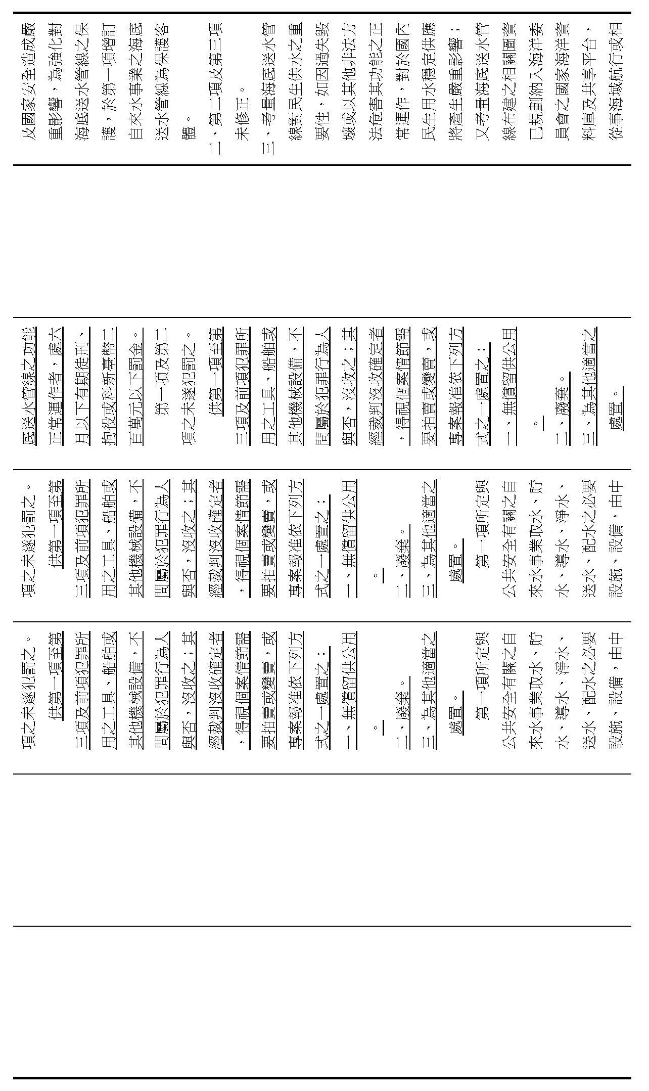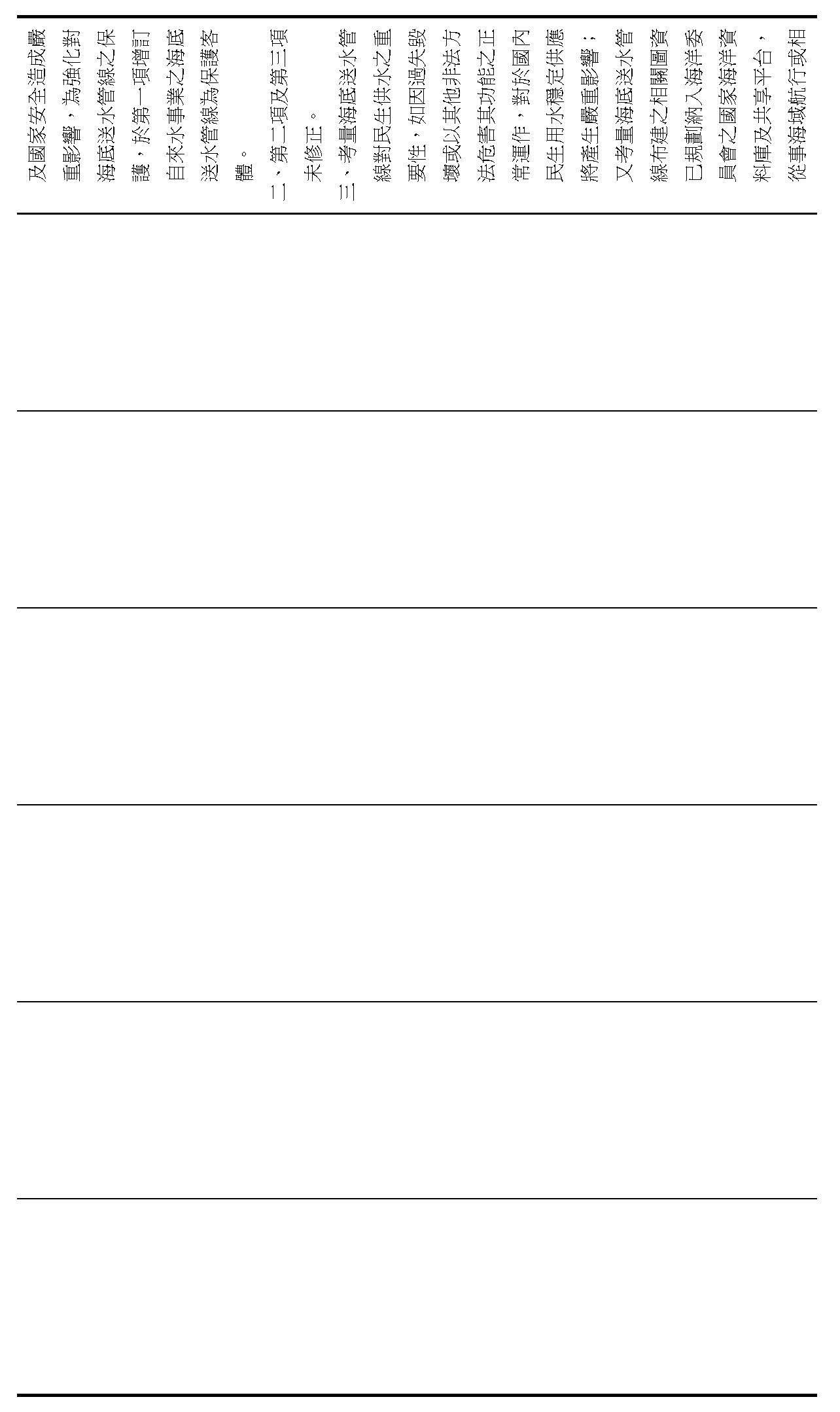 1.有關「將海底電力電纜、輸氣管線及送水管線納入法規保護範圍」、「新增過失犯刑罰規範」及「增訂故意犯之犯罪用具、船舶或其他機械設備沒收及處置規定」部分