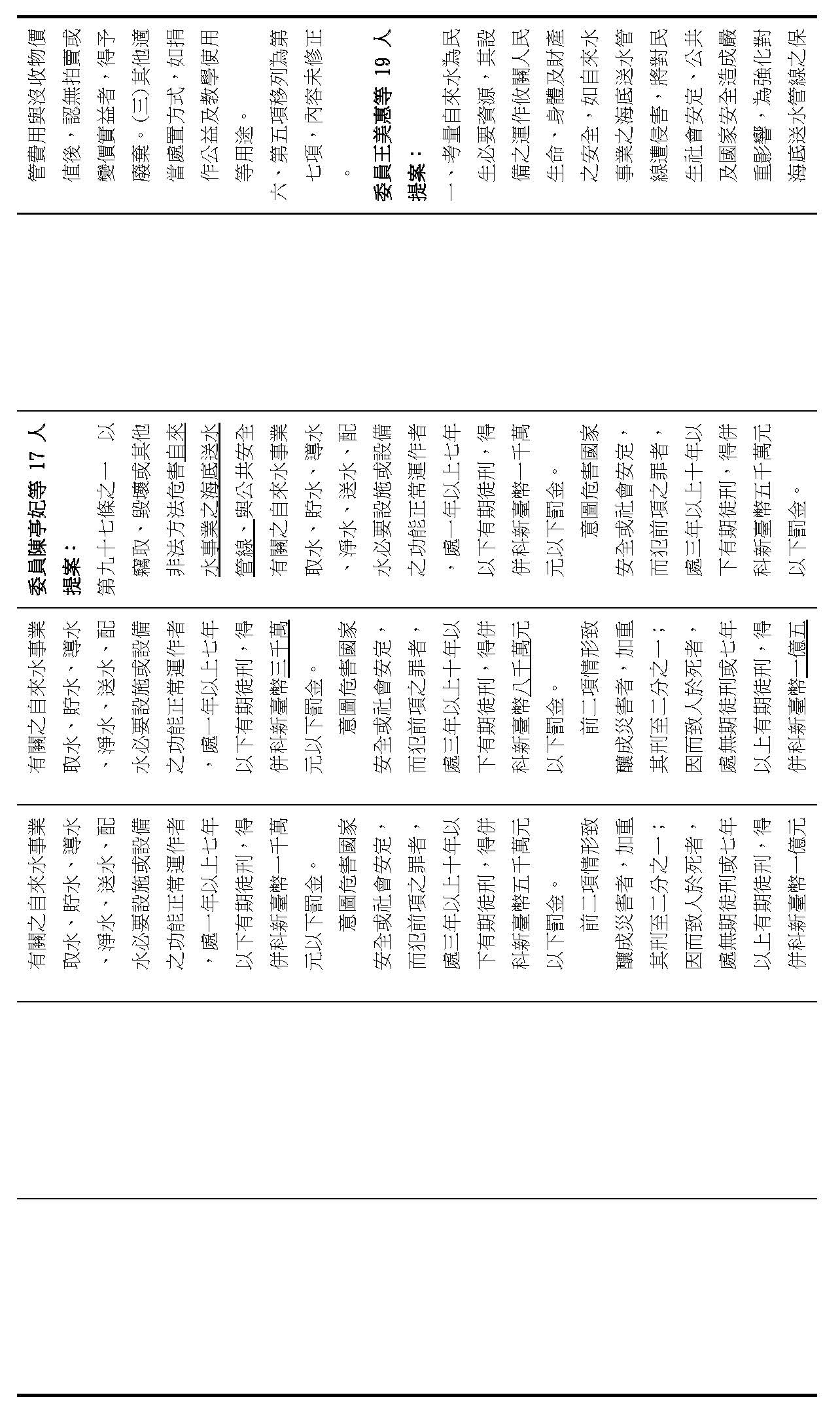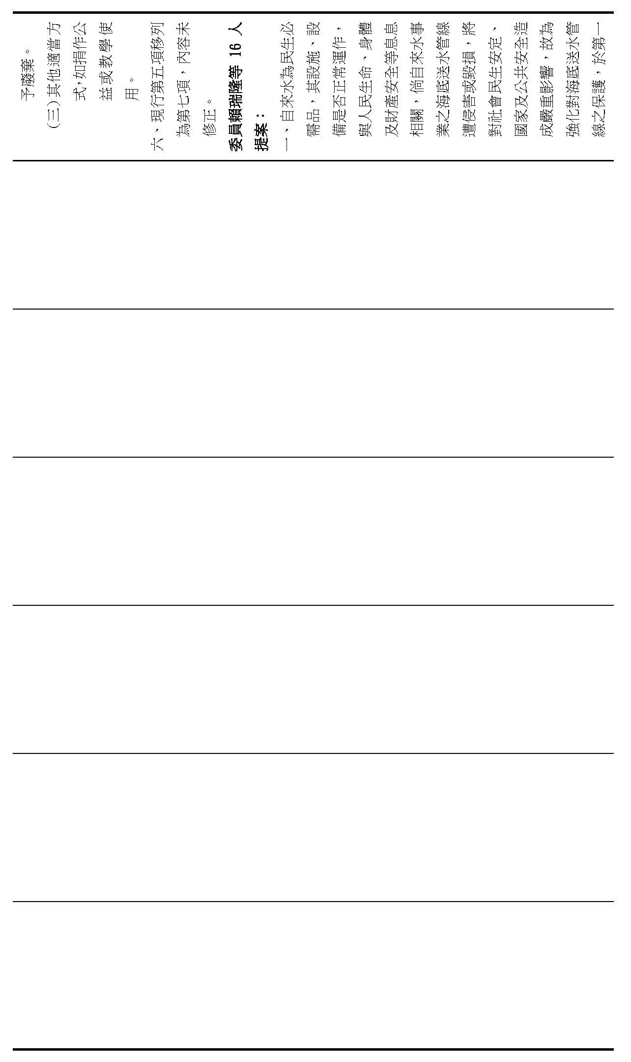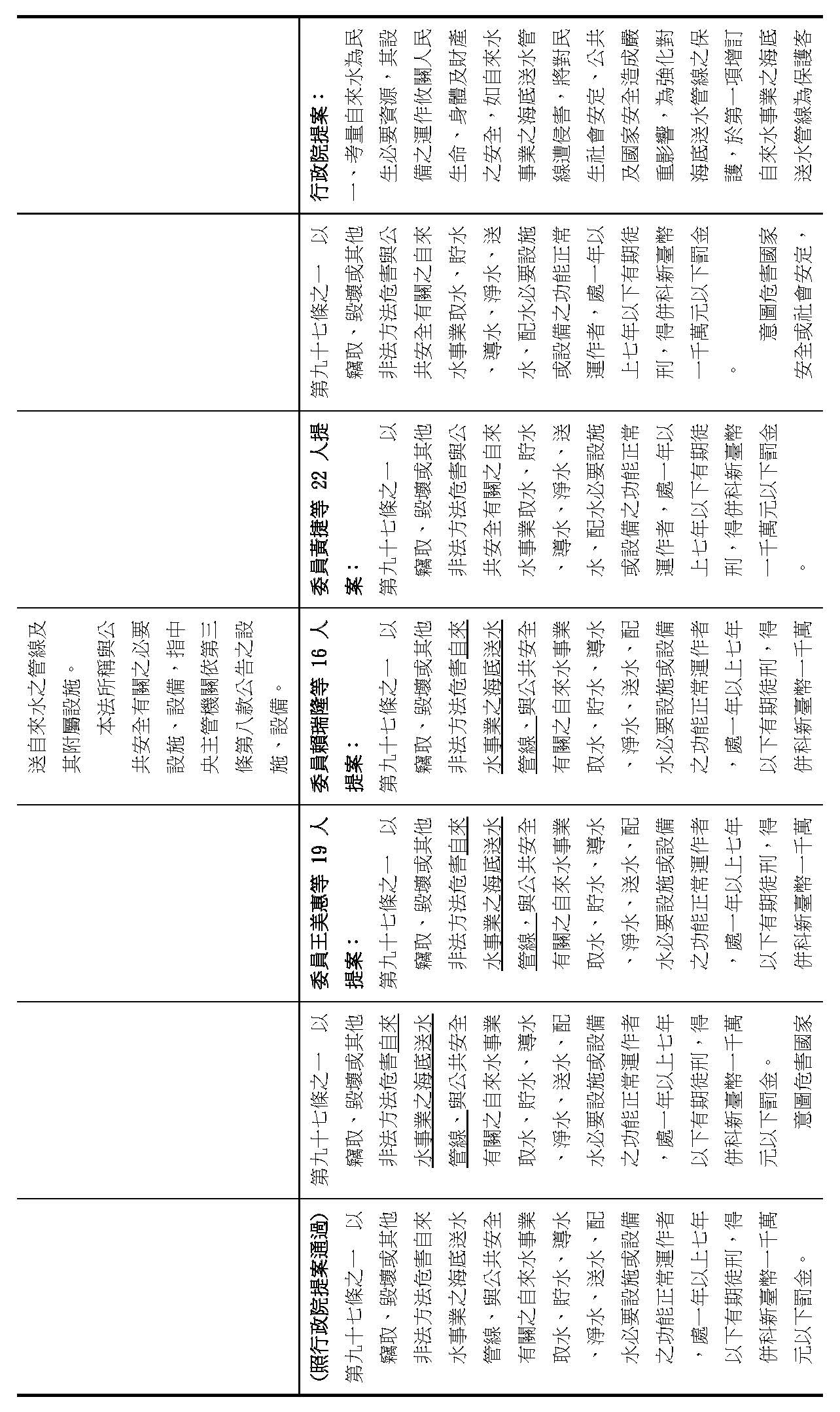 委員王美惠等20人、委員李坤城等18人、委員伍麗華Saidhai Tahovecahe等16人、委員賴瑞隆等16人、委員羅美玲等19人、委員賴惠員等21人、委員黃捷等22人、委員陳亭妃等17人、委員邱鎮軍等21人及委員吳沛憶等16人提案「電業法第七十一條之一條文修正草案」;委員王美惠等20人、委員李坤城等18人、委員伍麗華Saidhai Tahovecahe等16人、委員賴瑞隆等16人、委員羅美玲等19人、委員賴惠員等21人、委員黃捷等22人、委員陳亭妃等17人、委員邱鎮軍等24人及委員吳沛憶等16人提案「天然氣事業法第五十五條之一條文修正草案」;以及委員王美惠等19人、委員李坤城等18人、委員伍麗華Saidhai Tahovecahe等16人、委員賴瑞隆等16人、委員羅美玲等19人、委員賴惠員等21人、委員黃捷等22人、委員陳亭妃等17人及委員吳沛憶等16人提案「自來水法第九十七條之一條文修正草案」,建議將海底電力電纜、輸氣管線及送水管線分別納入法規保護範圍;新增過失犯刑罰規範及增訂故意犯之犯罪用具、船舶或其他機械設備沒收與處置等相關規定。
