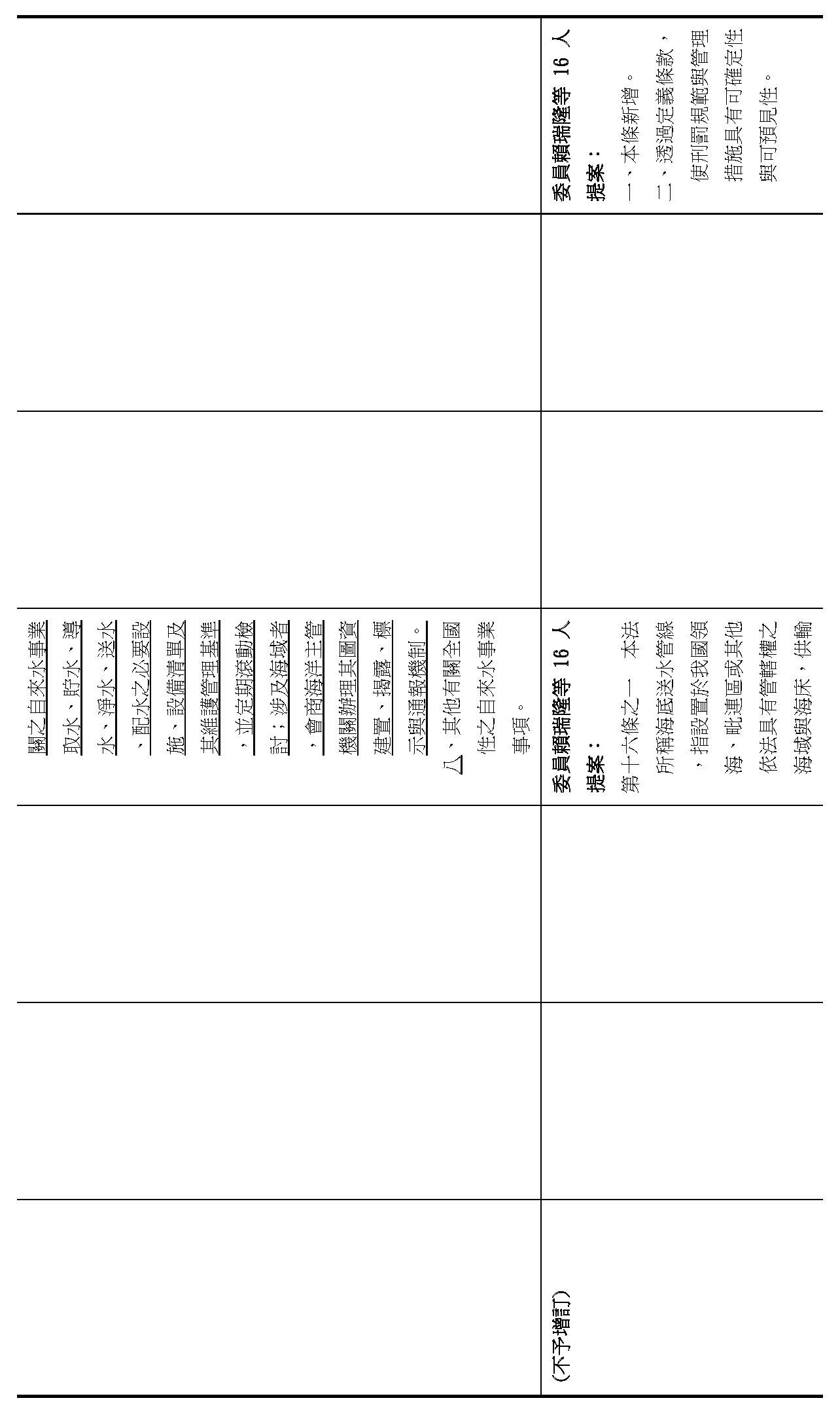 委員賴瑞隆等16人,提案修正「自來水法」第三條及新增「自來水法」第十六條之一,建議新增與公共安全有關之自來水事業必要設施、設備及會商海洋主管機關建置圖資等規定。