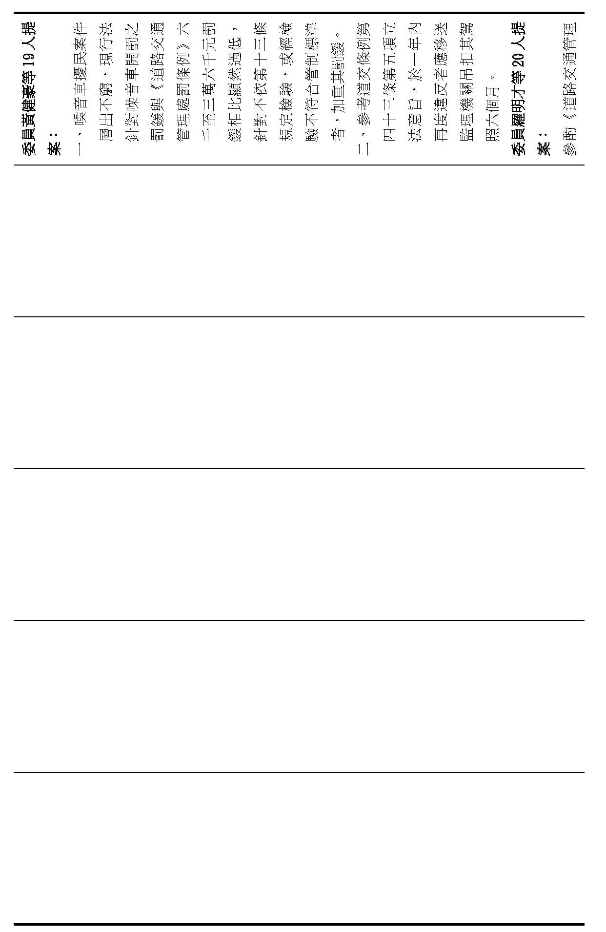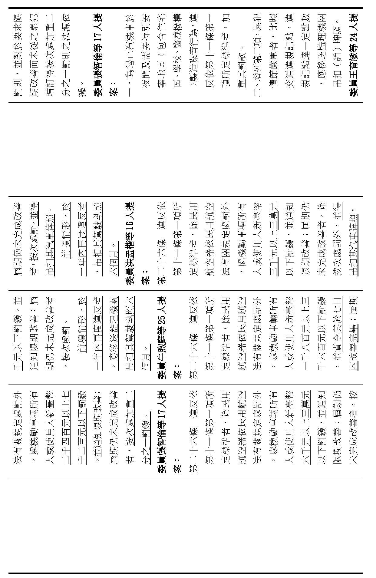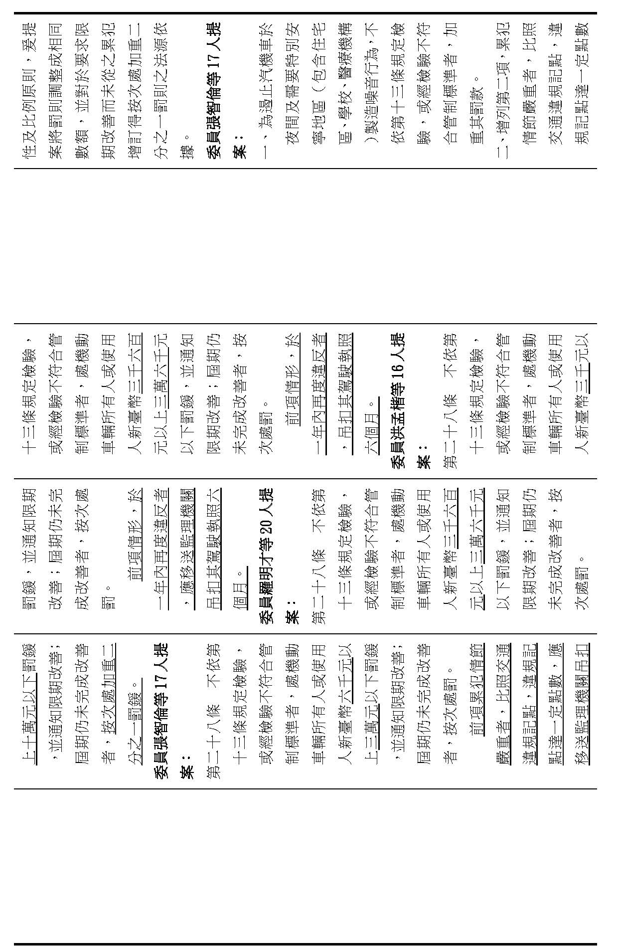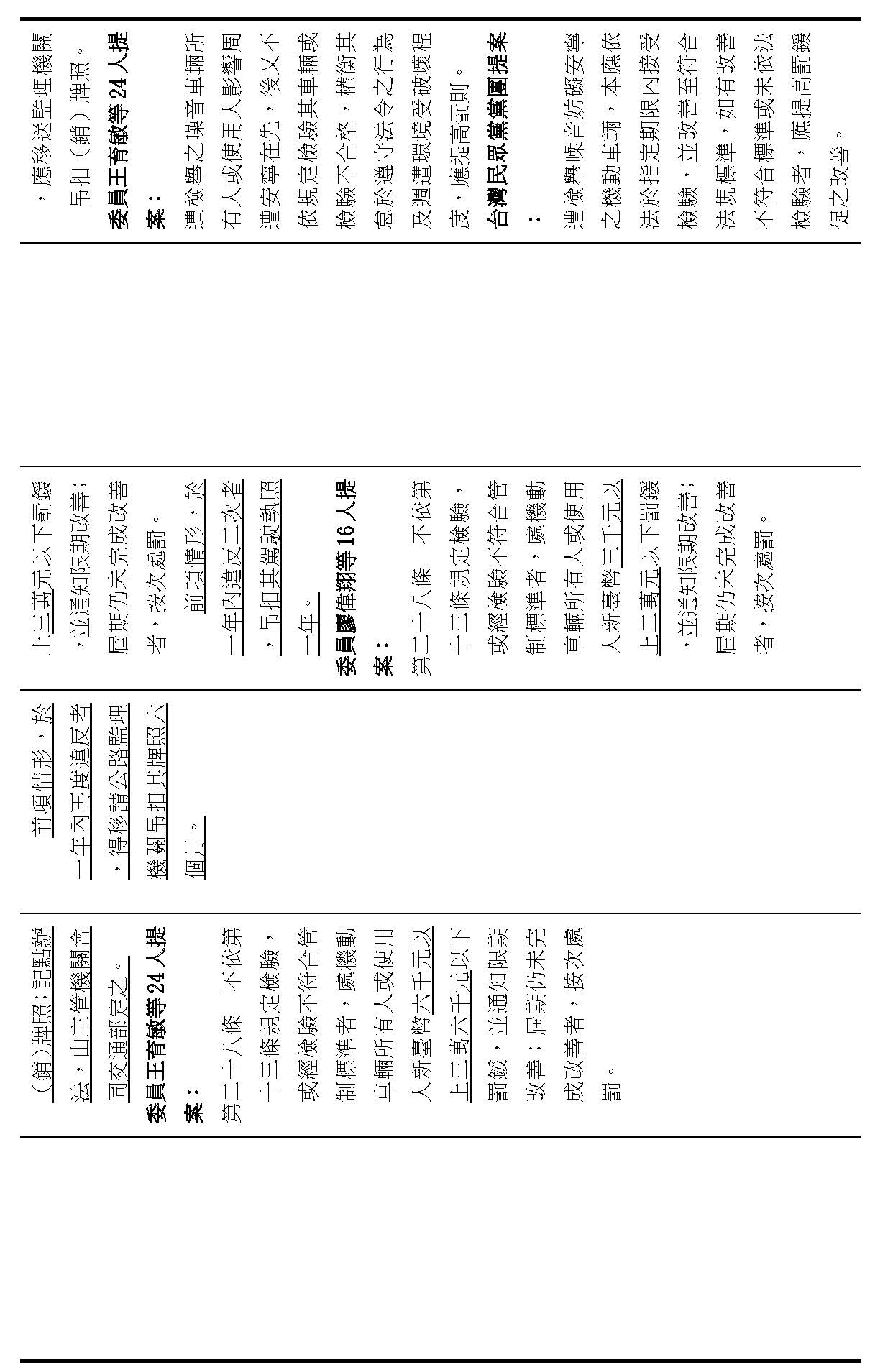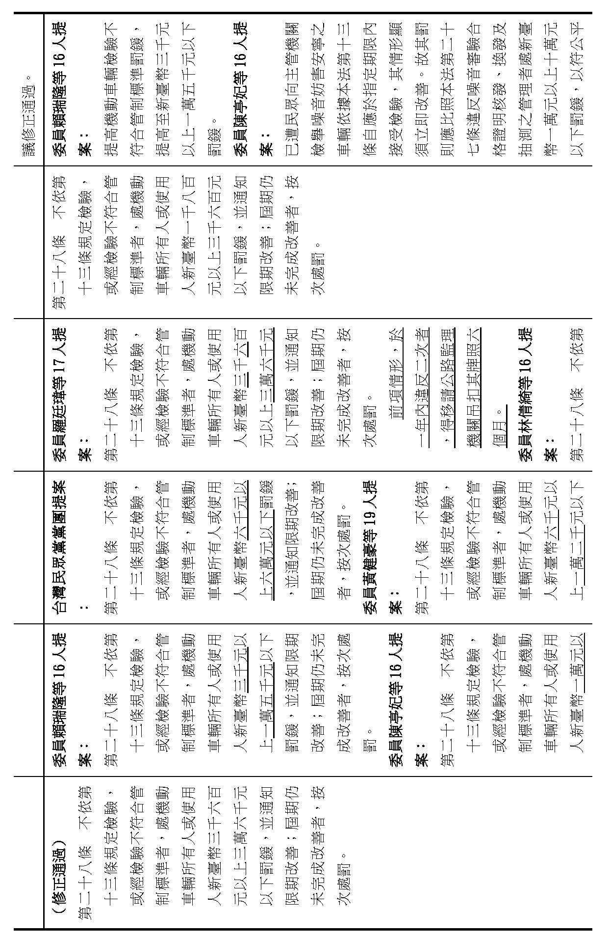 委員賴瑞隆等16人、委員陳亭妃等16人、委員張智倫等17人、委員王育敏等24人、台灣民眾黨黨團4人、委員黃健豪等19人、委員牛煦庭等25人、委員羅明才等19人、委員羅廷瑋等17人分別提具修正草案提高車輛超過噪音管制標準罰鍰,並針對累犯之情形納入吊扣車輛牌照、駕駛執照規定,本部敬表支持。