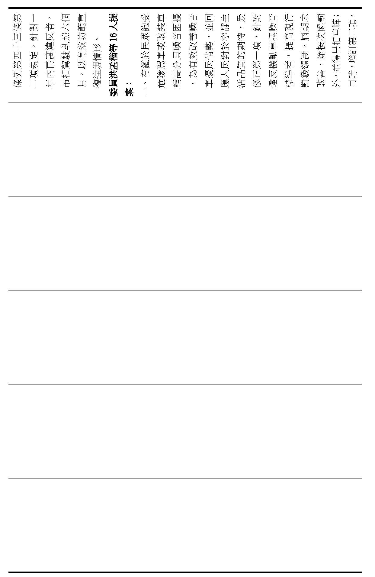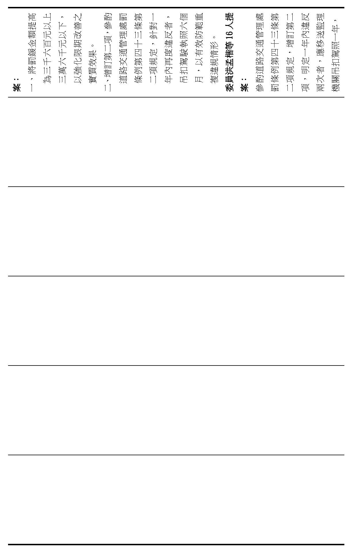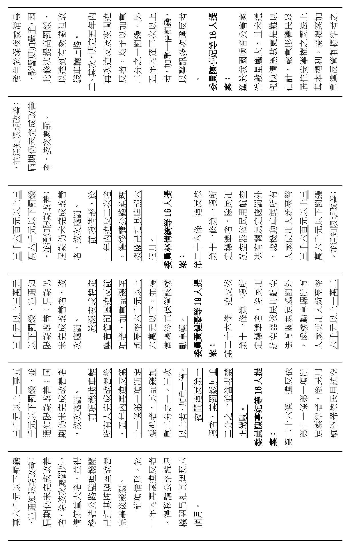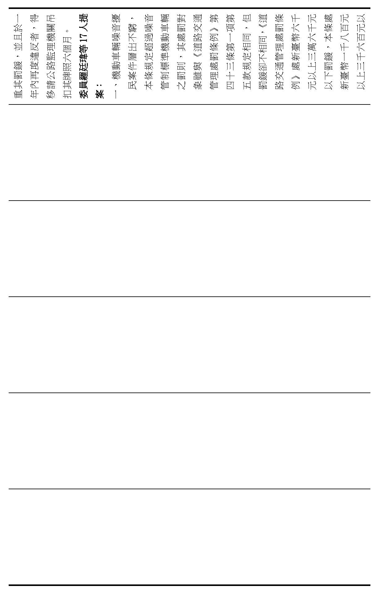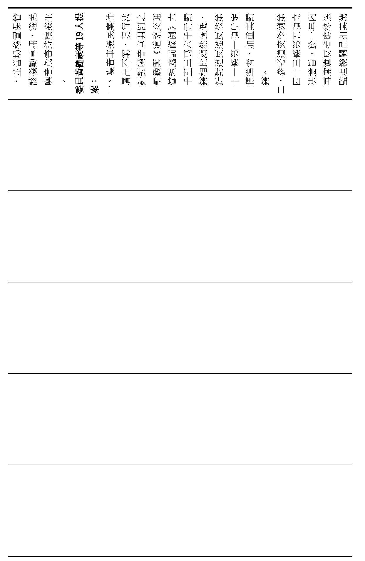 委員賴瑞隆等16人、委員陳亭妃等16人、委員張智倫等17人、委員王育敏等24人、台灣民眾黨黨團4人、委員黃健豪等19人、委員牛煦庭等25人、委員羅明才等19人、委員羅廷瑋等17人分別提具修正草案提高車輛超過噪音管制標準罰鍰,並針對累犯之情形納入吊扣車輛牌照、駕駛執照規定,本部敬表支持。