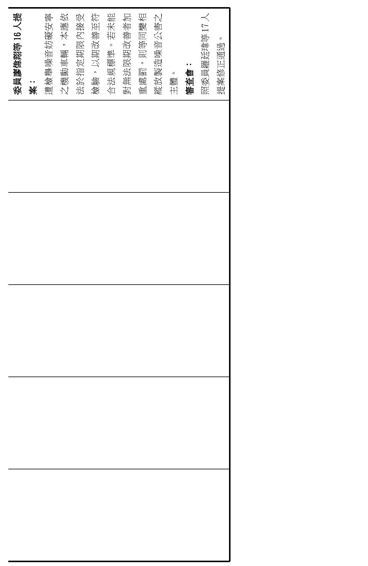 主旨:院會交付本會審查委員賴瑞隆等16人、委員陳亭妃等16人、委員張智倫等17人、委員王育敏等24人、台灣民眾黨黨團、委員黃健豪等19人分別擬具「噪音管制法第二十六條及第二十八條條文修正草案」、委員牛煦庭等25人擬具「噪音管制法第二條及第二十六條條文修正草案」、委員羅明才等20人、委員羅廷瑋等17人、委員林倩綺等16人、委員洪孟楷等16人分別擬具「噪音管制法第二十六條及第二十八條條文修正草案」、委員廖偉翔等16人擬具「噪音管制法第二條、第二十六條及第二十八條條文修正草案」等12案,業經併案審查完竣,不須黨團協商,復請查照,提報院會公決。