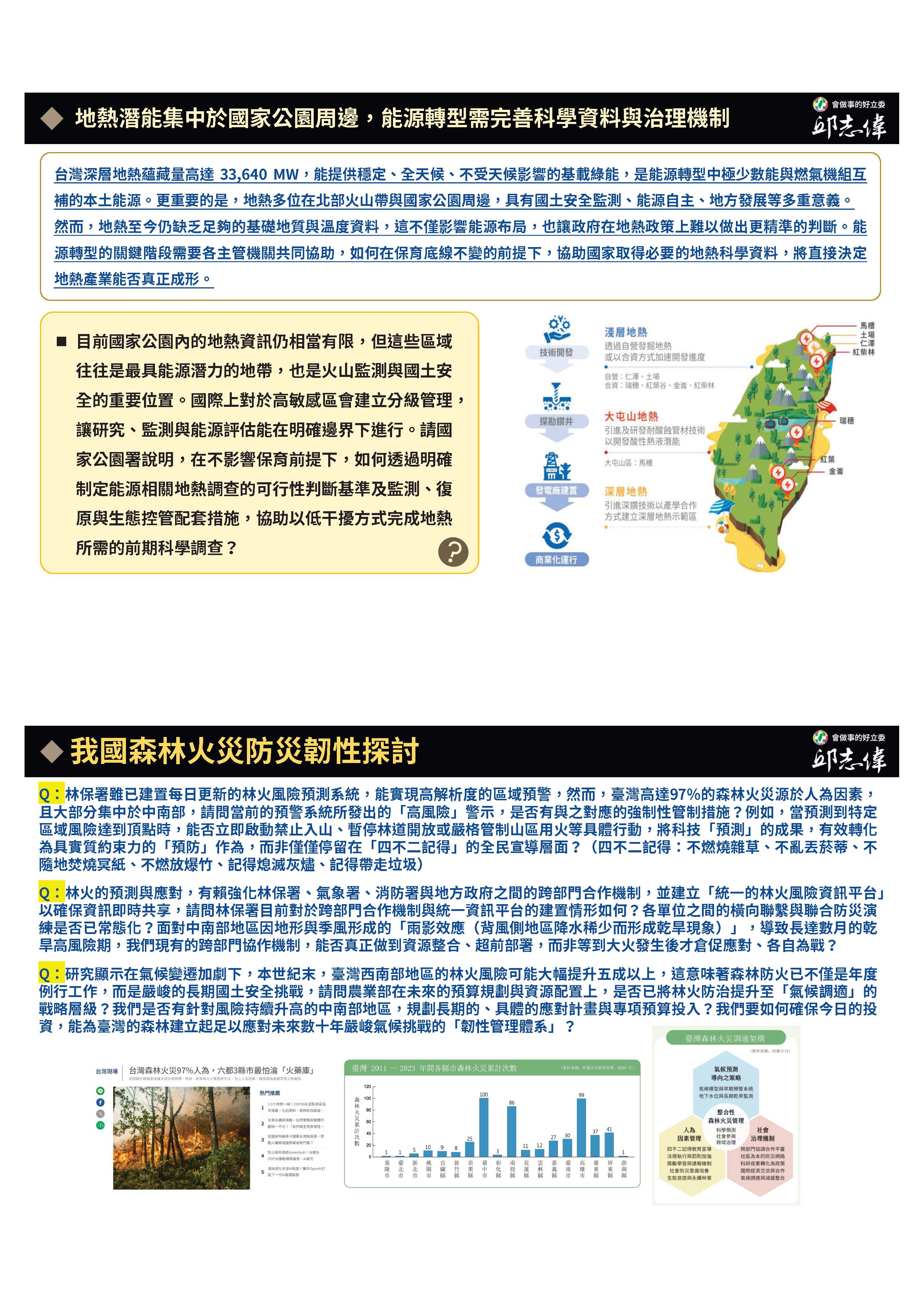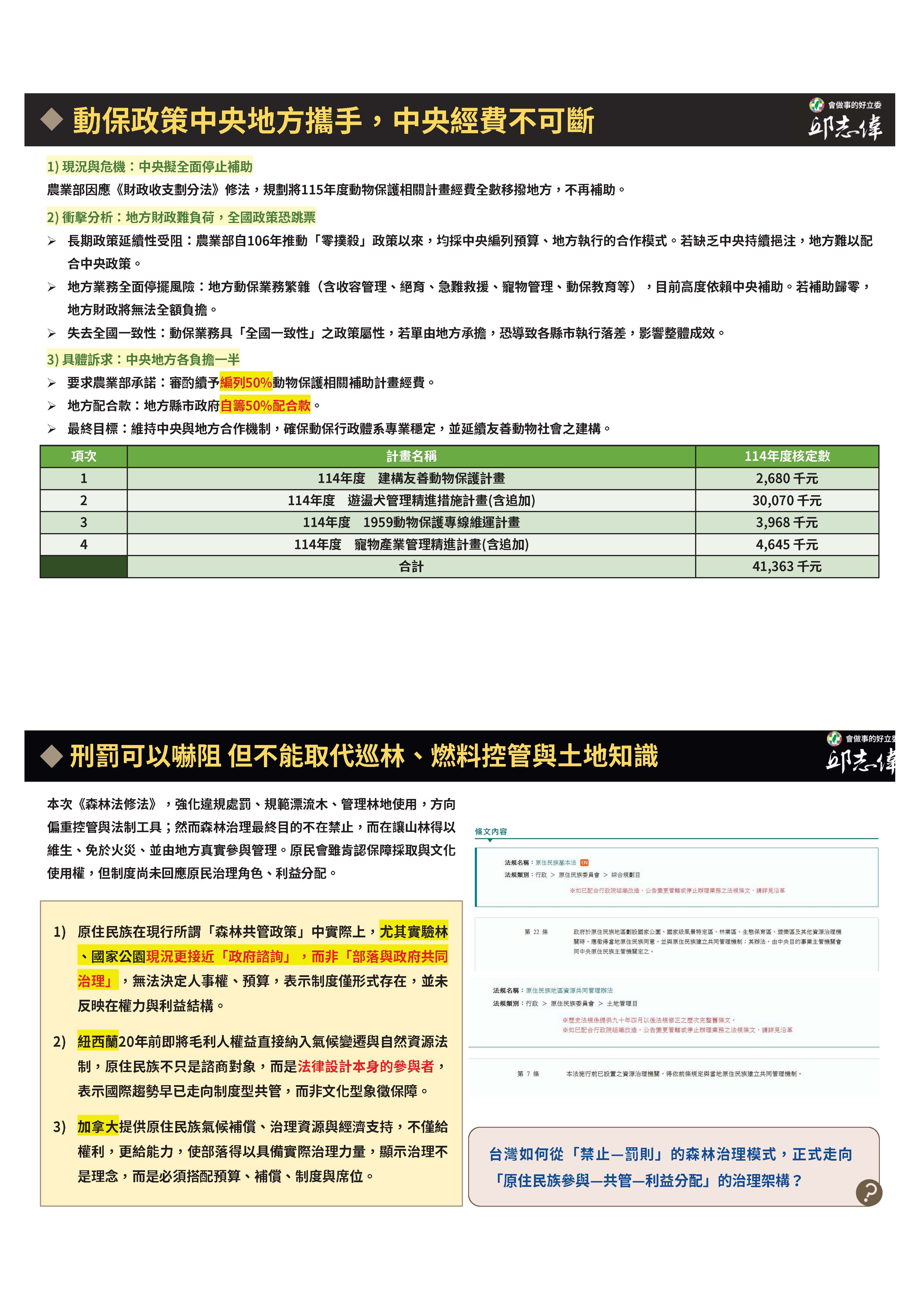 1.肯定農業部致力強化森林火災刑責、保護貴重木、提升山林管理,但修法須兼顧落地性,不宜僅止於提高罰則。