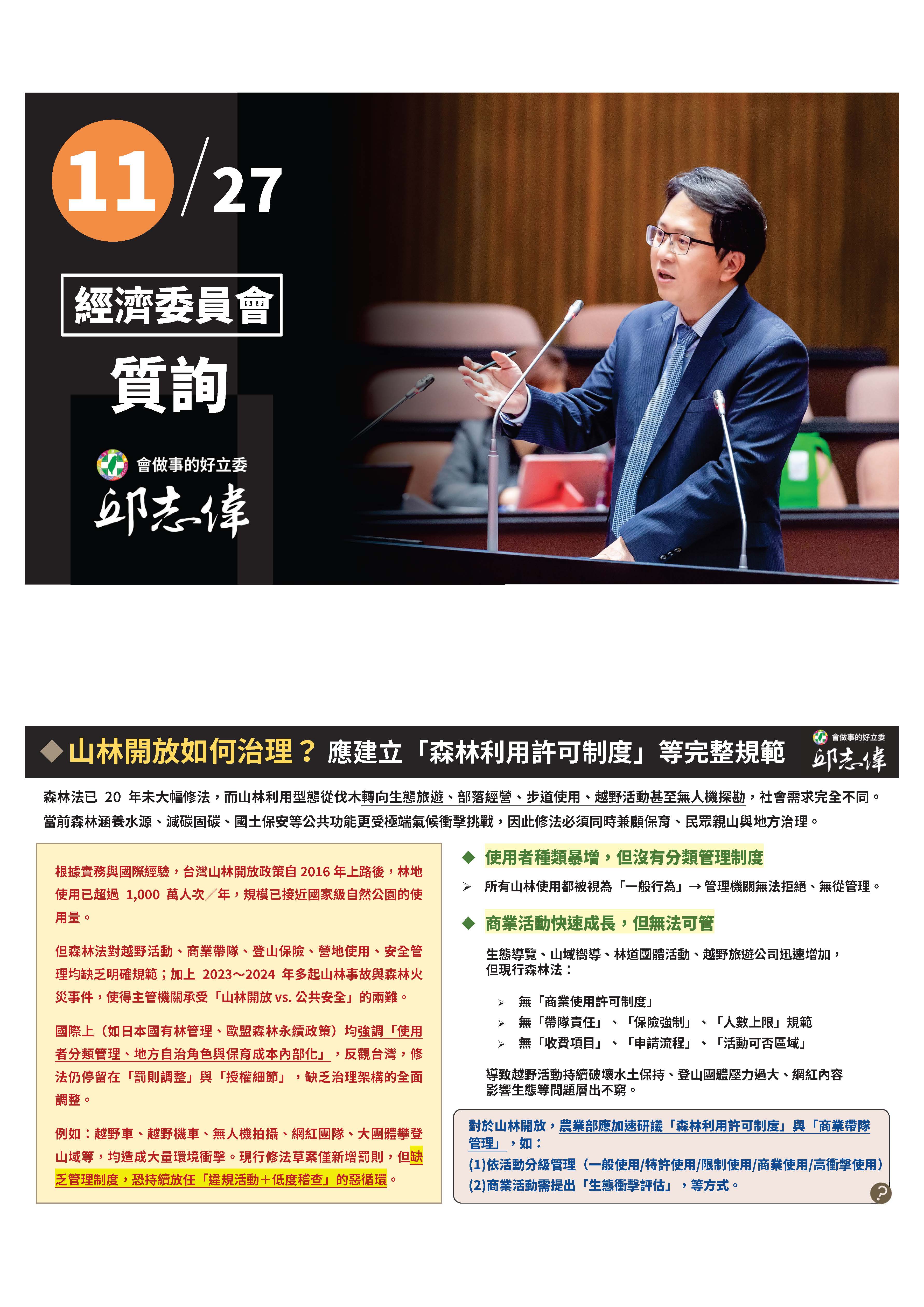 森林是我國非常重要的自然資產,也是許多民眾親近山林、體驗自然的重要公共空間,但是隨著我們的山林解禁及戶外活動的興盛,部分的國有與公有林區遊憩行為太集中,已出現明顯的生態壓力;研究也證實,過度遊憩將降低植被覆蓋、加劇土壤的硬化及沖蝕,讓自然環境面臨退化,甚至不可逆的傷害;本席也處理過很多的遊憩入山衝突,像是大武哈尤溪、丹大林道等等。為了讓民眾能夠永續的親近山林,讓森林生態得以持續健康,本席修法增訂森林法第十七條之二及修正第五十六條之三,主要目的是在於回應近年國有與公有林地因為遊憩活動的快速成長所造成的環境衝擊,有必要在法律層級明確授權主管機關得採取管制措施,以維護森林永續。