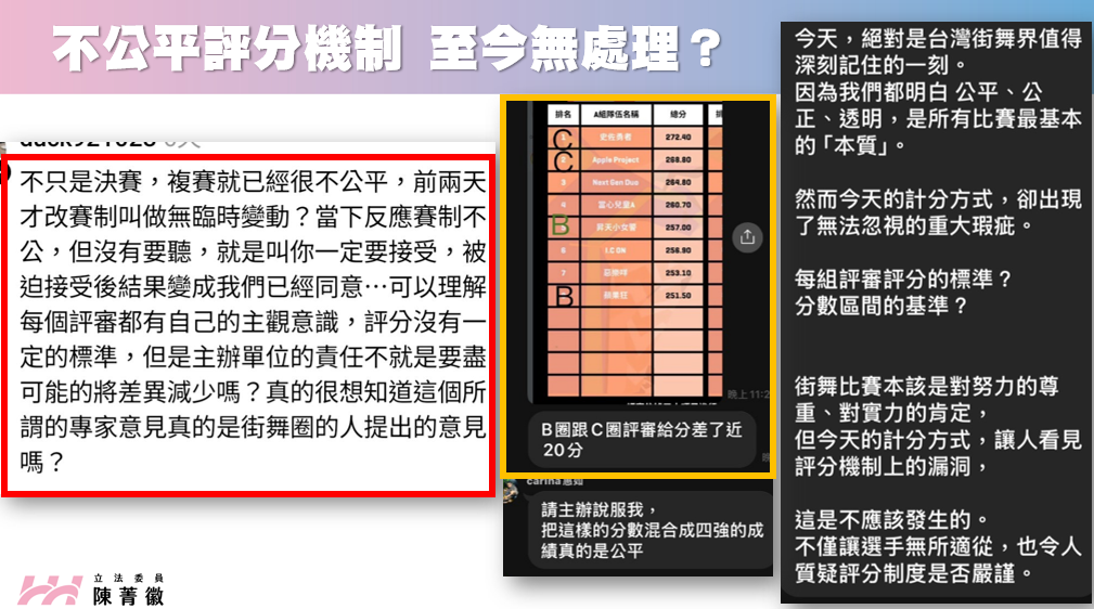 選手提供之截圖證據可以看到,決賽中不同組別(如B圈與C圈)之評審給分基準出現極大落差,分差竟高達近20分。在缺乏標準化程序與分數校正機制之前提下,主辦單位竟將基準不一的原始分數直接混合排名,此在統計學上完全不合理,亦無法反映選手真實實力。此種評分漏洞不僅讓比賽淪為「比運氣」,更嚴重踐踏街舞選手長期的努力與熱情。