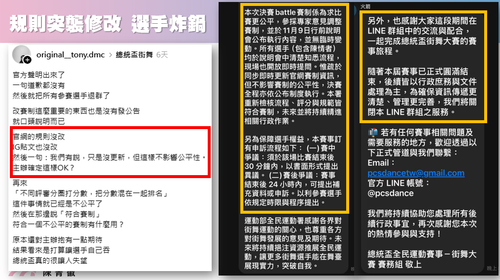 據參賽選手陳情,本次總統盃街舞錦標賽於決賽前夕,主辦單位竟在未更新官方網站規章、未發布正式公告之情況下,僅憑現場「口頭說明」即突襲式修改賽制。此舉如同兒戲,試問國家級賽事豈能如菜市場喊價般隨意變動?選手依據公開簡章備賽,主辦單位之突襲作為已嚴重違反行政程序中之公開透明與信賴保護原則,致使選手無所適從。