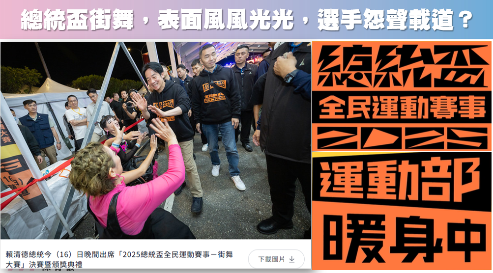 面對選手對於賽制不公與評分標準之質疑,主辦單位不僅未有檢討歉意,反而在發出一篇官腔聲明後,以「賽事結束」為由強行關閉選手群組,阻斷溝通管道。此種傲慢態度,不僅令年輕族群心寒,更讓外界質疑,賴清德總統親臨現場的「風光」,是否僅是用來掩蓋賽事執行粗糙的「遮羞布」?若連掛名「總統盃」的賽事都如此荒腔走板,未來的「運動部」如何取信於民?
