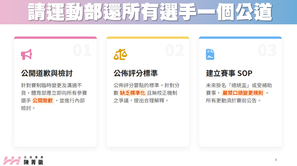 (三)建立國家級賽事SOP:未來凡掛名「總統盃」或受教育部/運動部補助之賽事,應明文嚴格禁止「口頭變更規則」。所有賽制更動必須於賽前一定期限內完成正式公告程序,建立標準作業規範(SOP),以維護賽事之公平性與權威性。