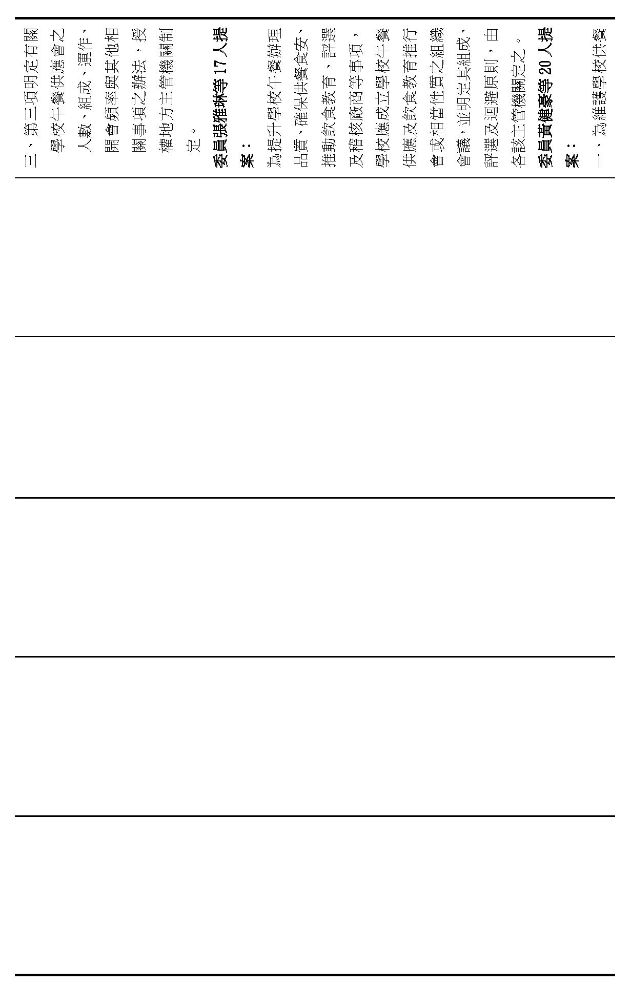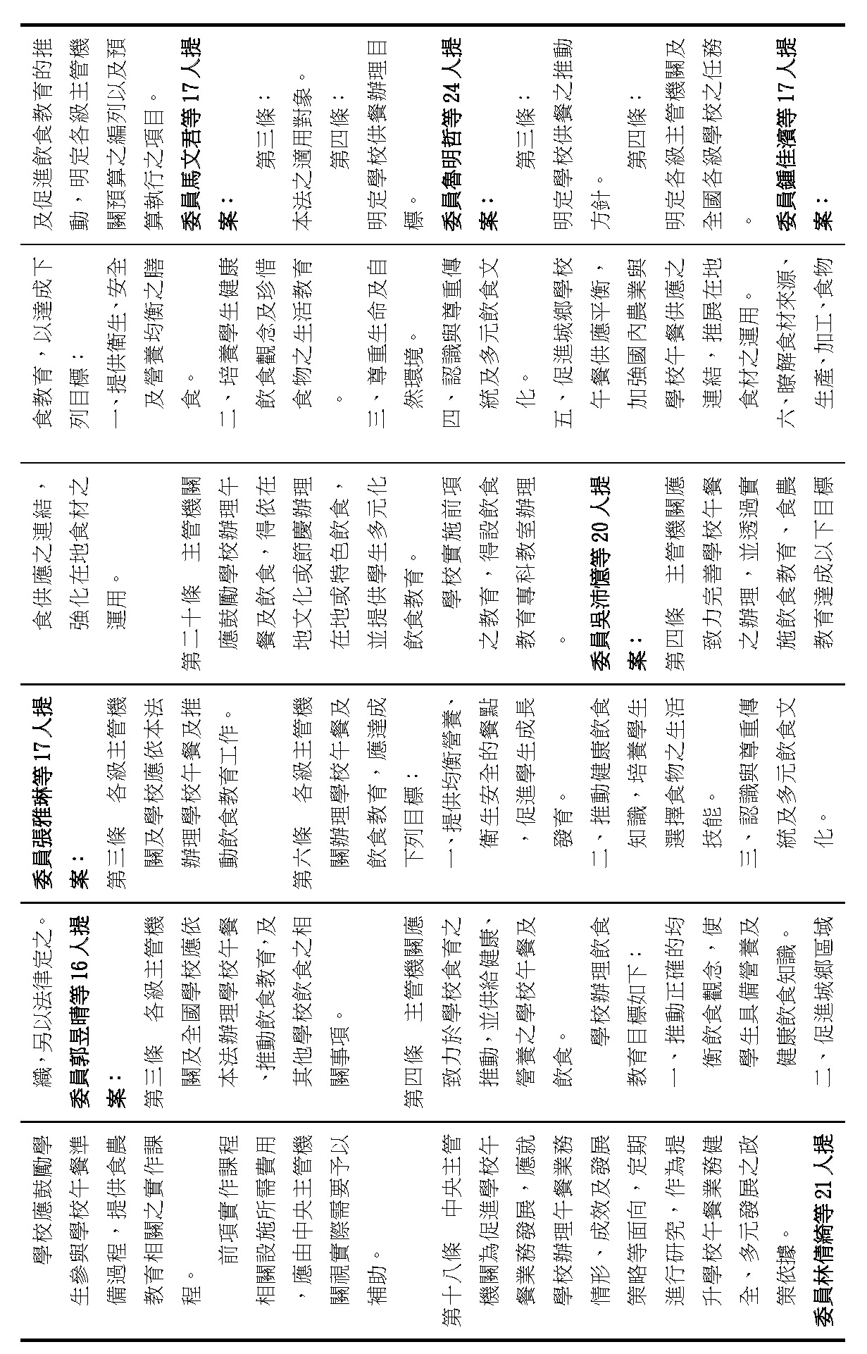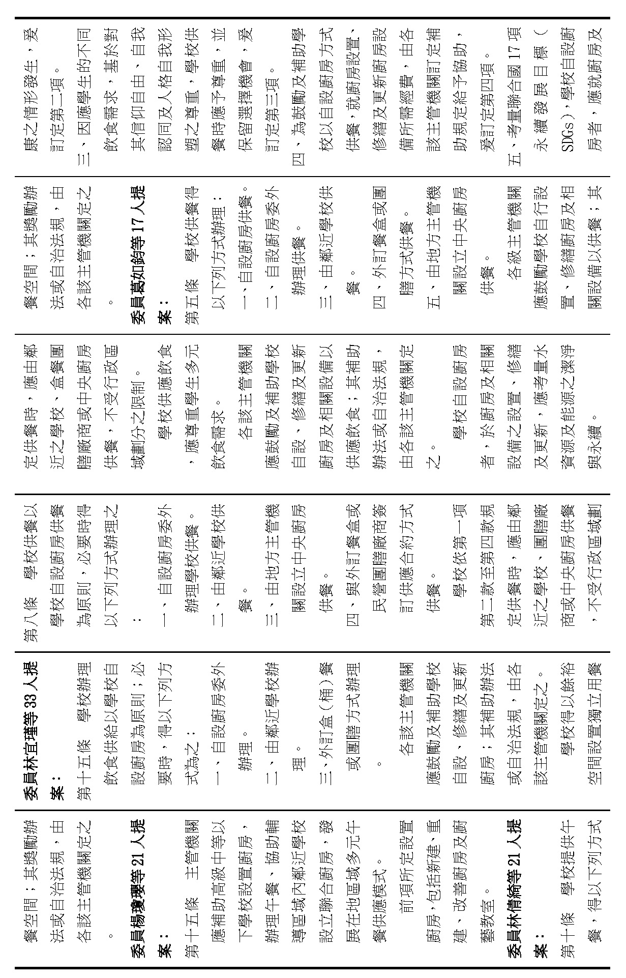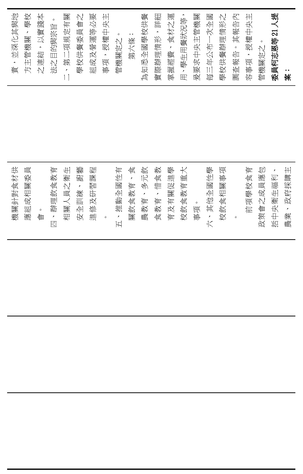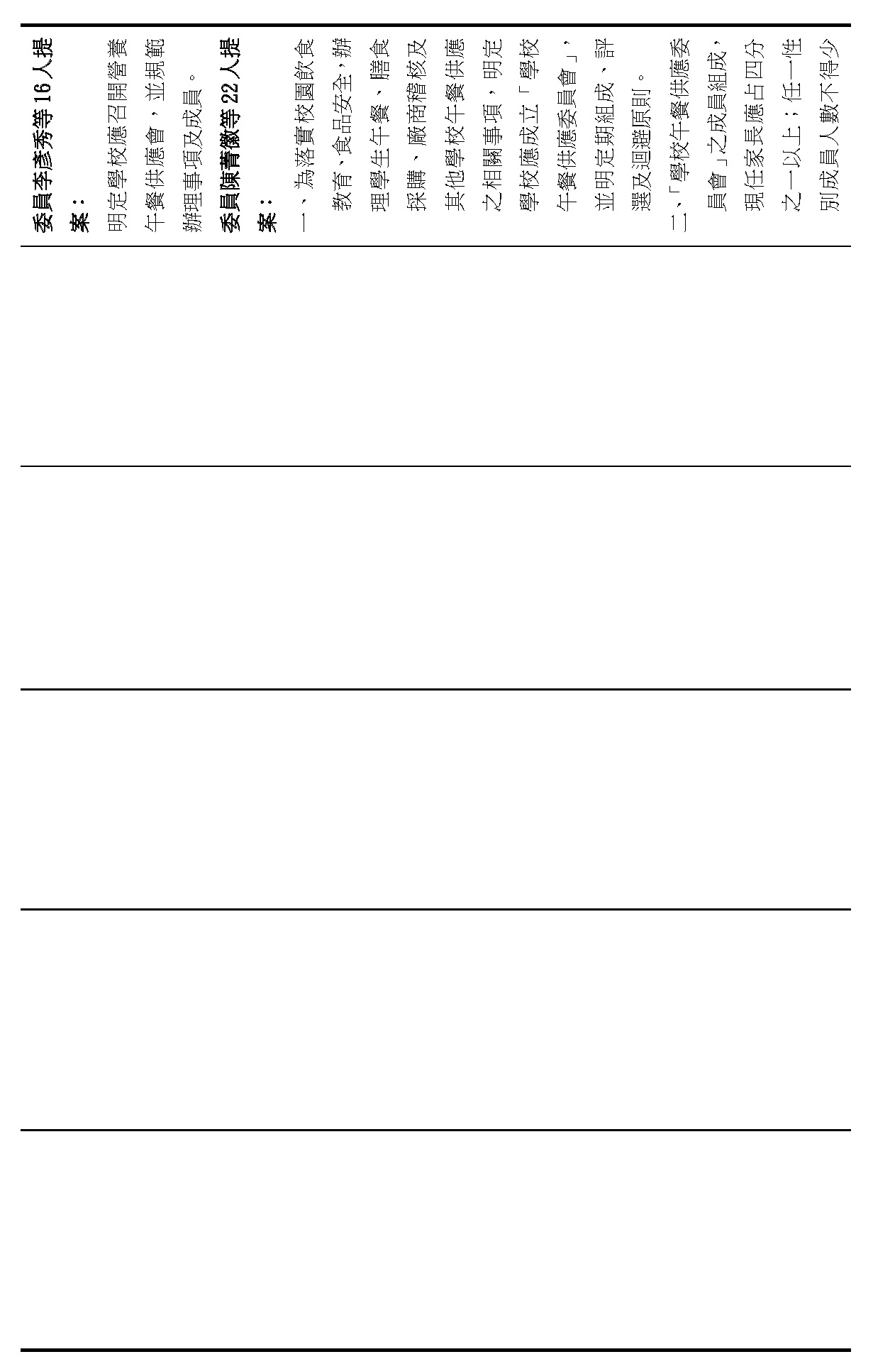 (八)委員林倩綺等21人擬具「學校午餐及營養促進條例草案」案。