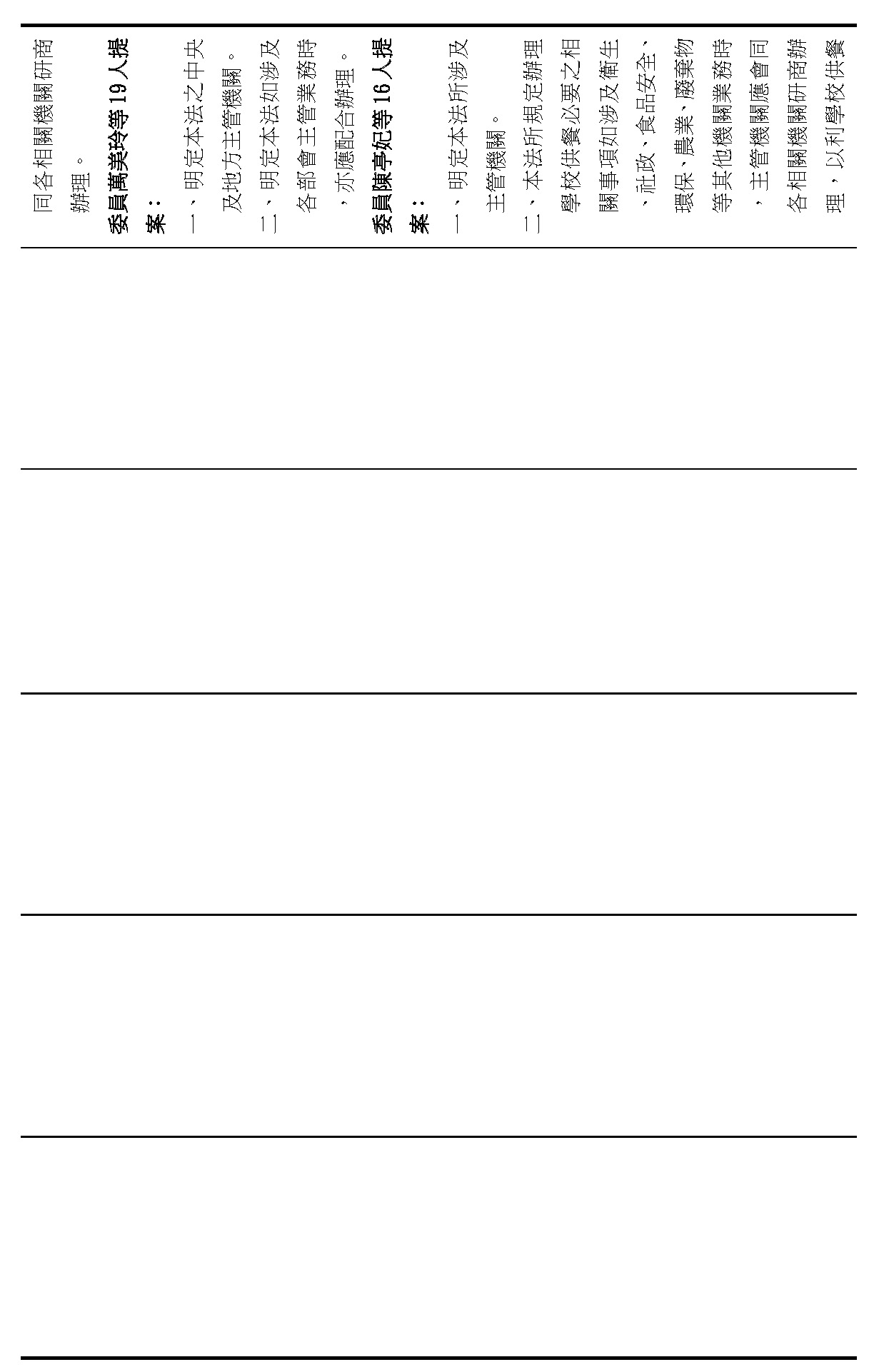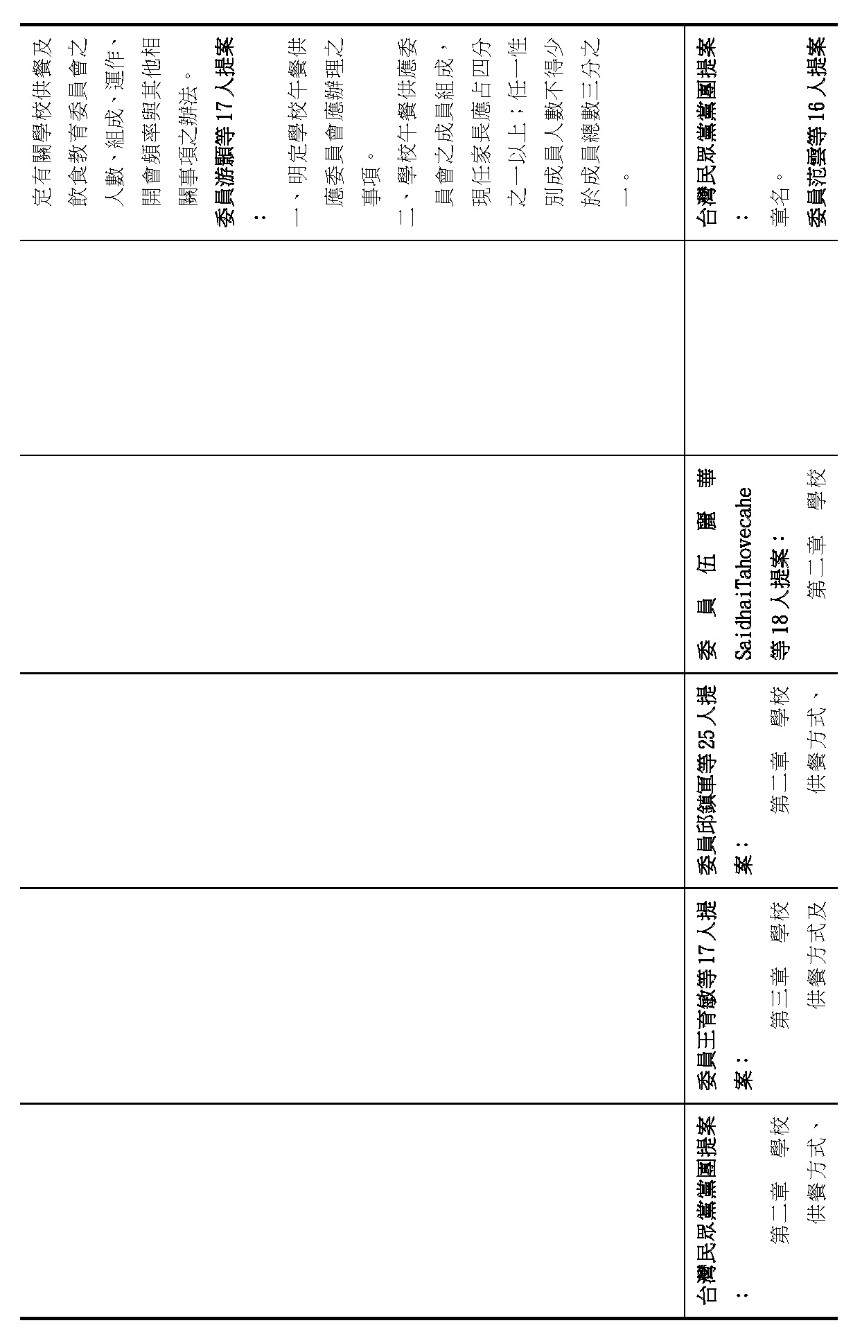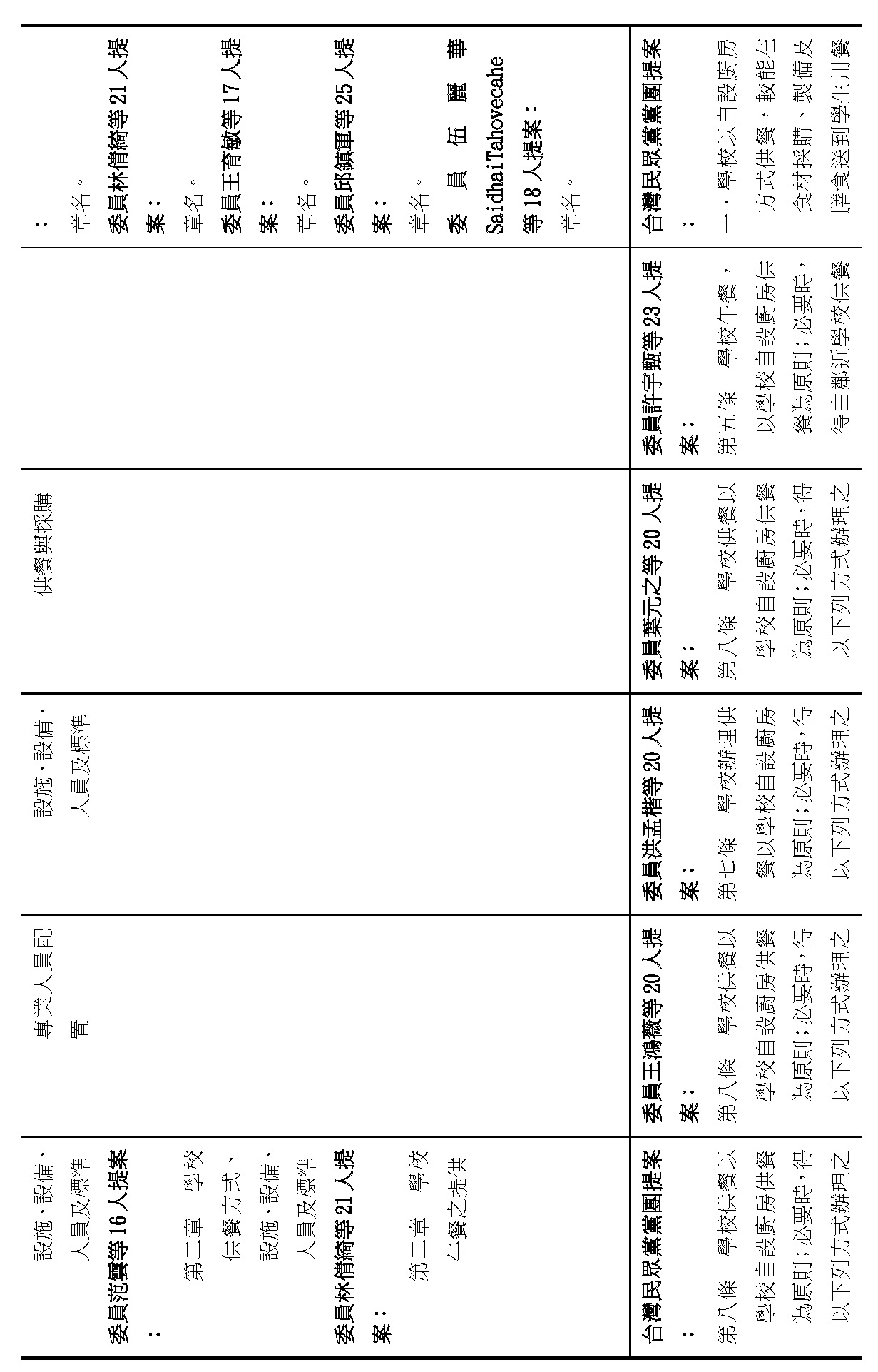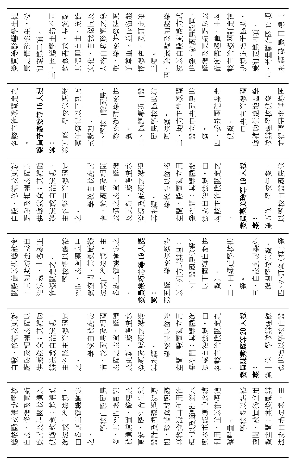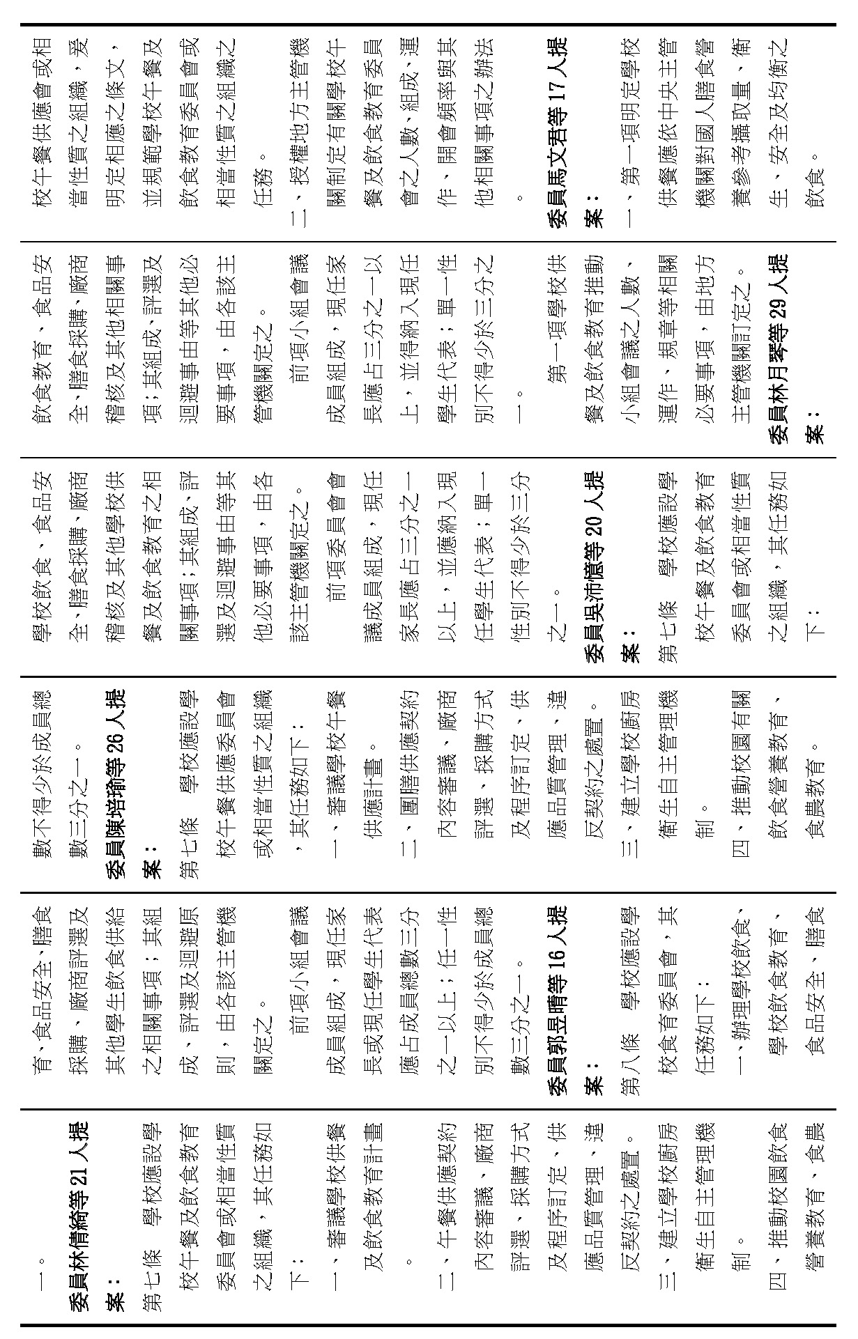 委員如果有臨時提案,請於上午10時30分前提出,處理提案時,若提案委員及連署委員均不在場,援例不予處理。現在審查學校供餐法草案相關草案,進行逐條審查,並進行……