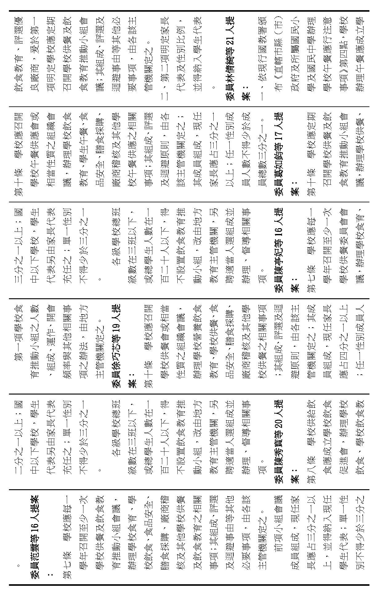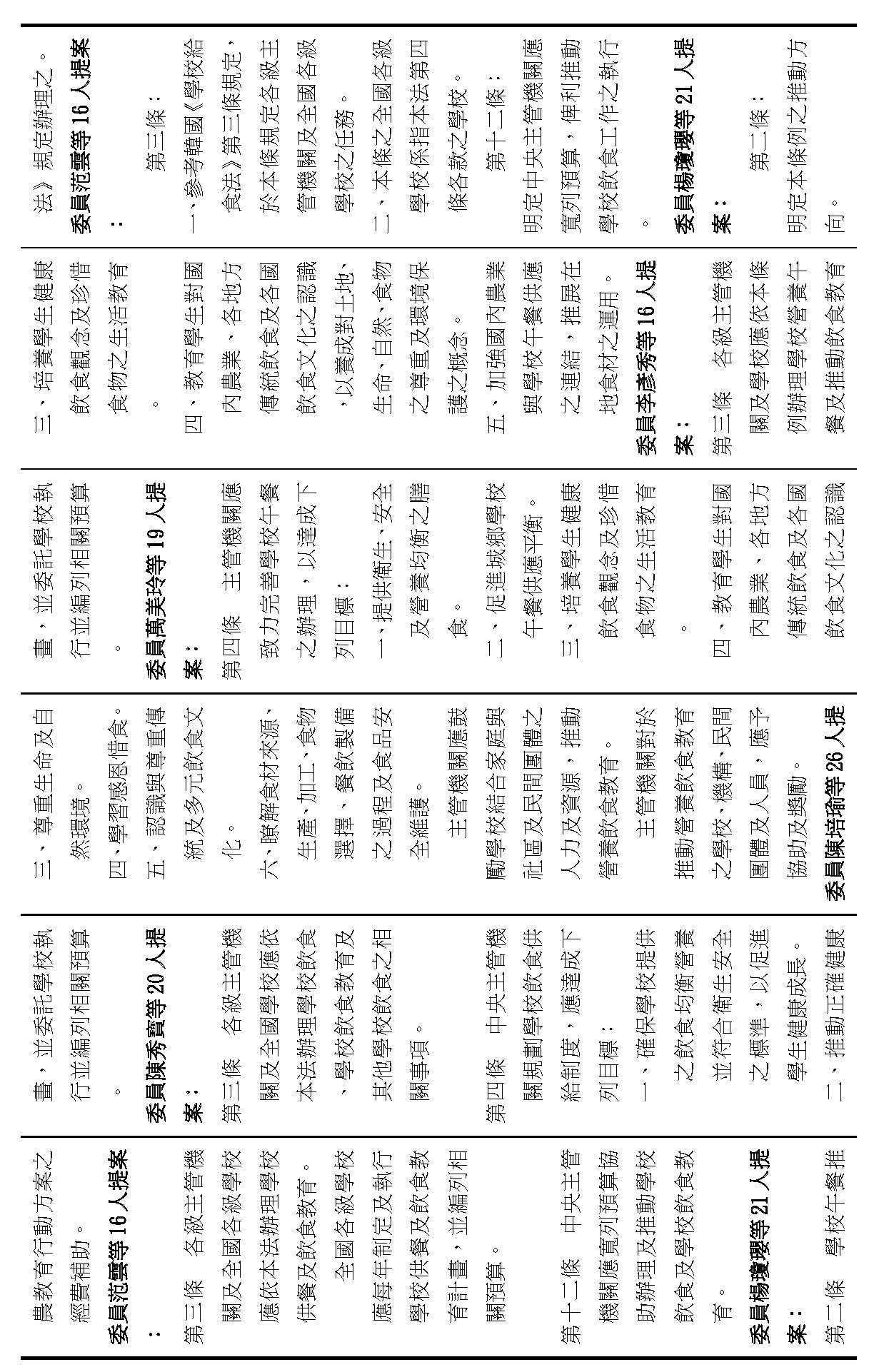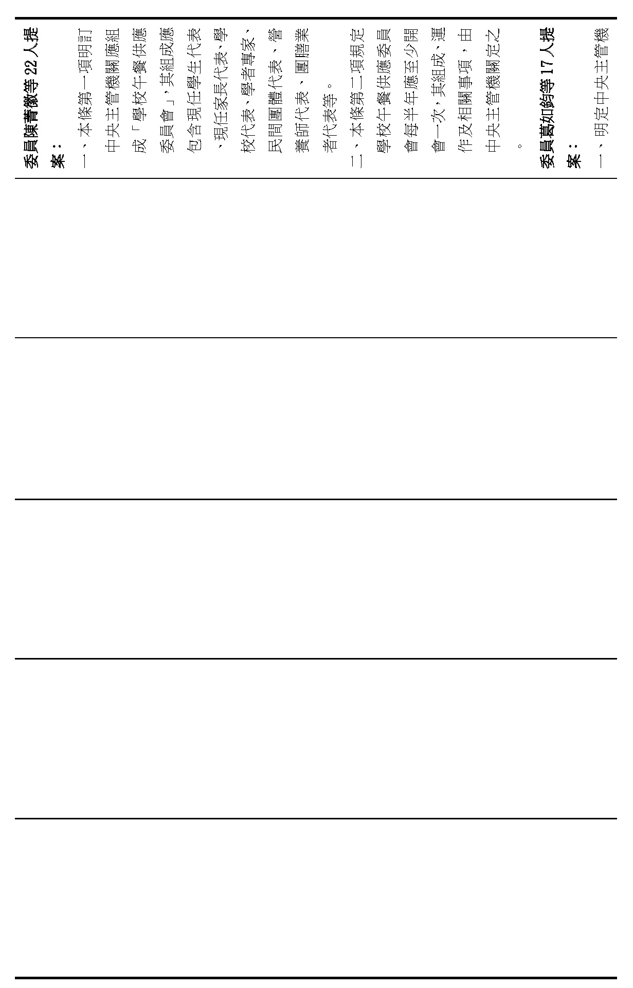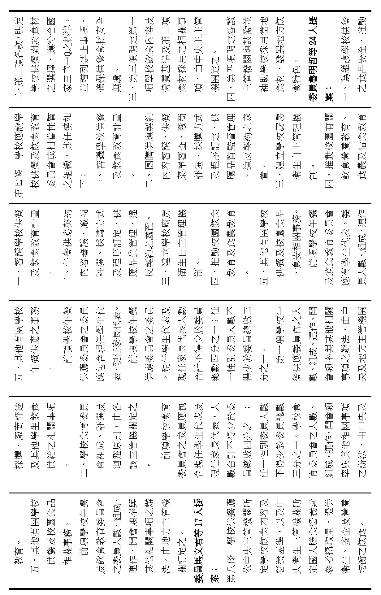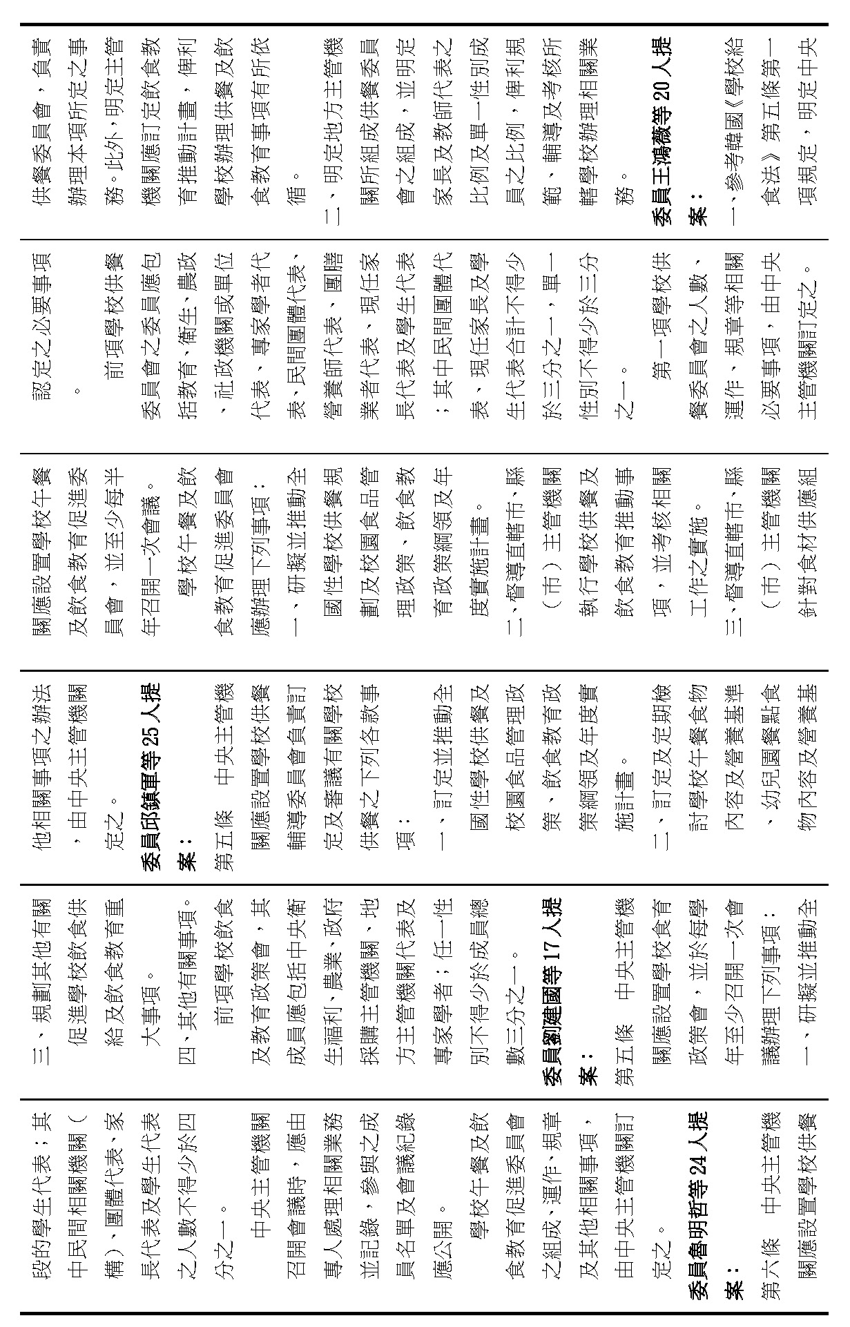 委員如果有臨時提案,請於上午10時30分前提出,處理提案時,若提案委員及連署委員均不在場,援例不予處理。現在審查學校供餐法草案相關草案,進行逐條審查,並進行……
