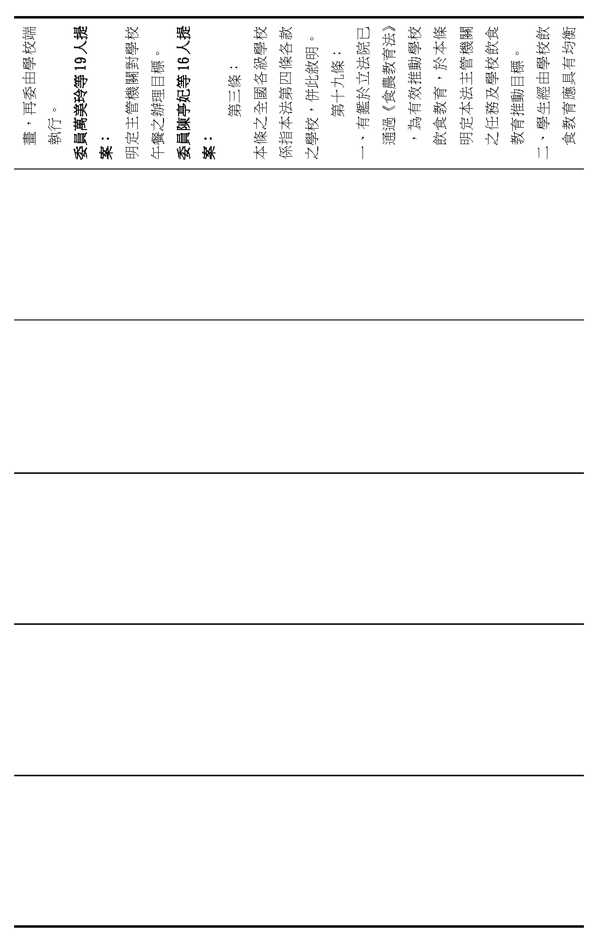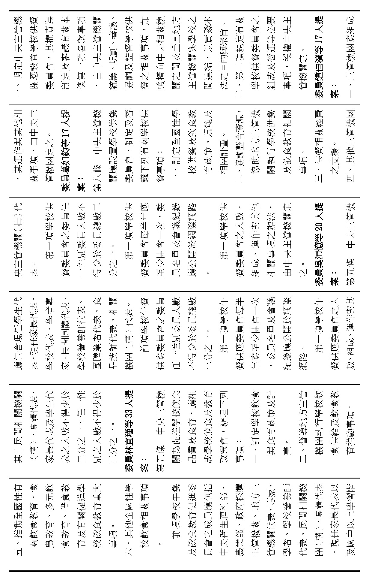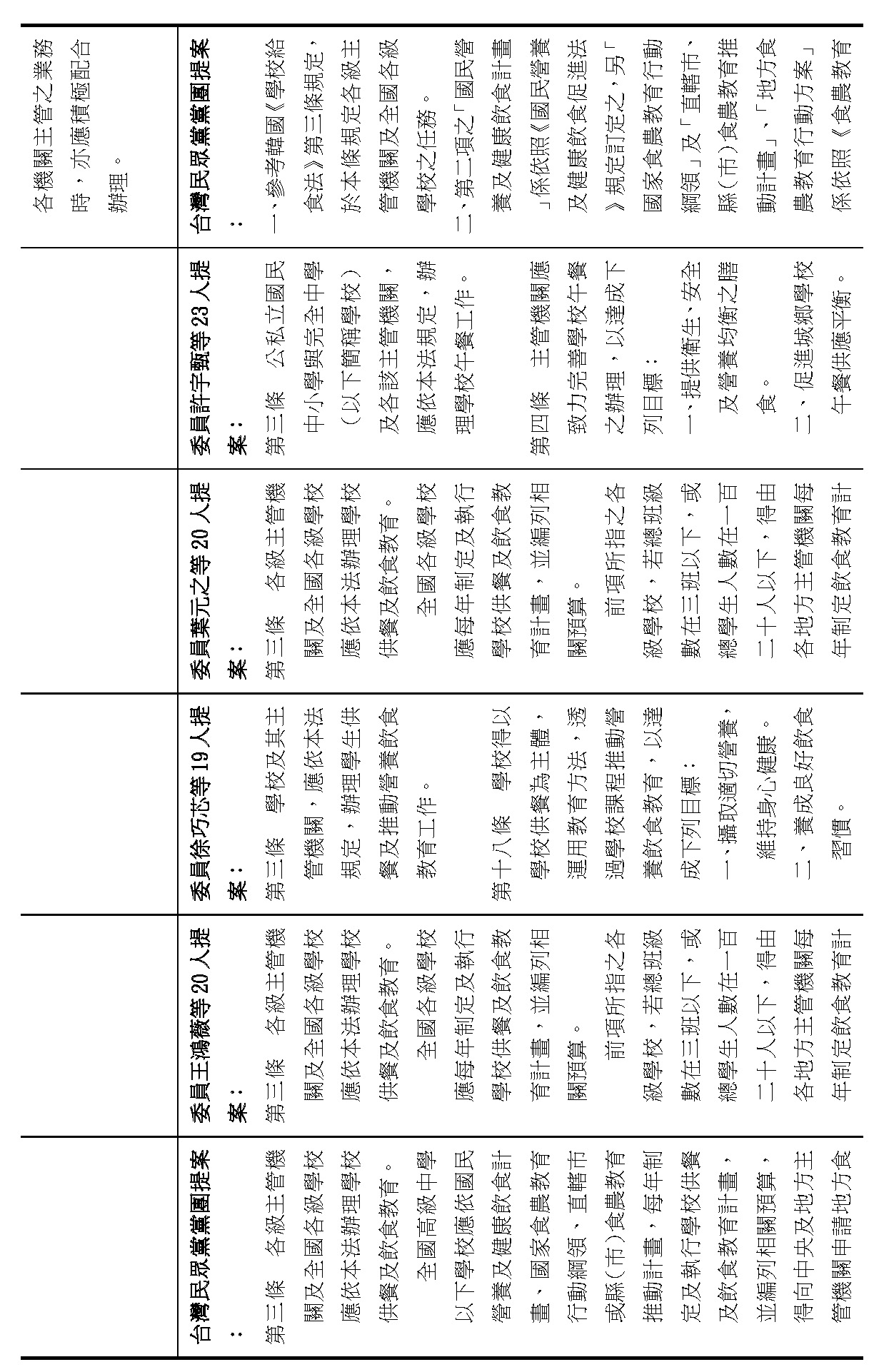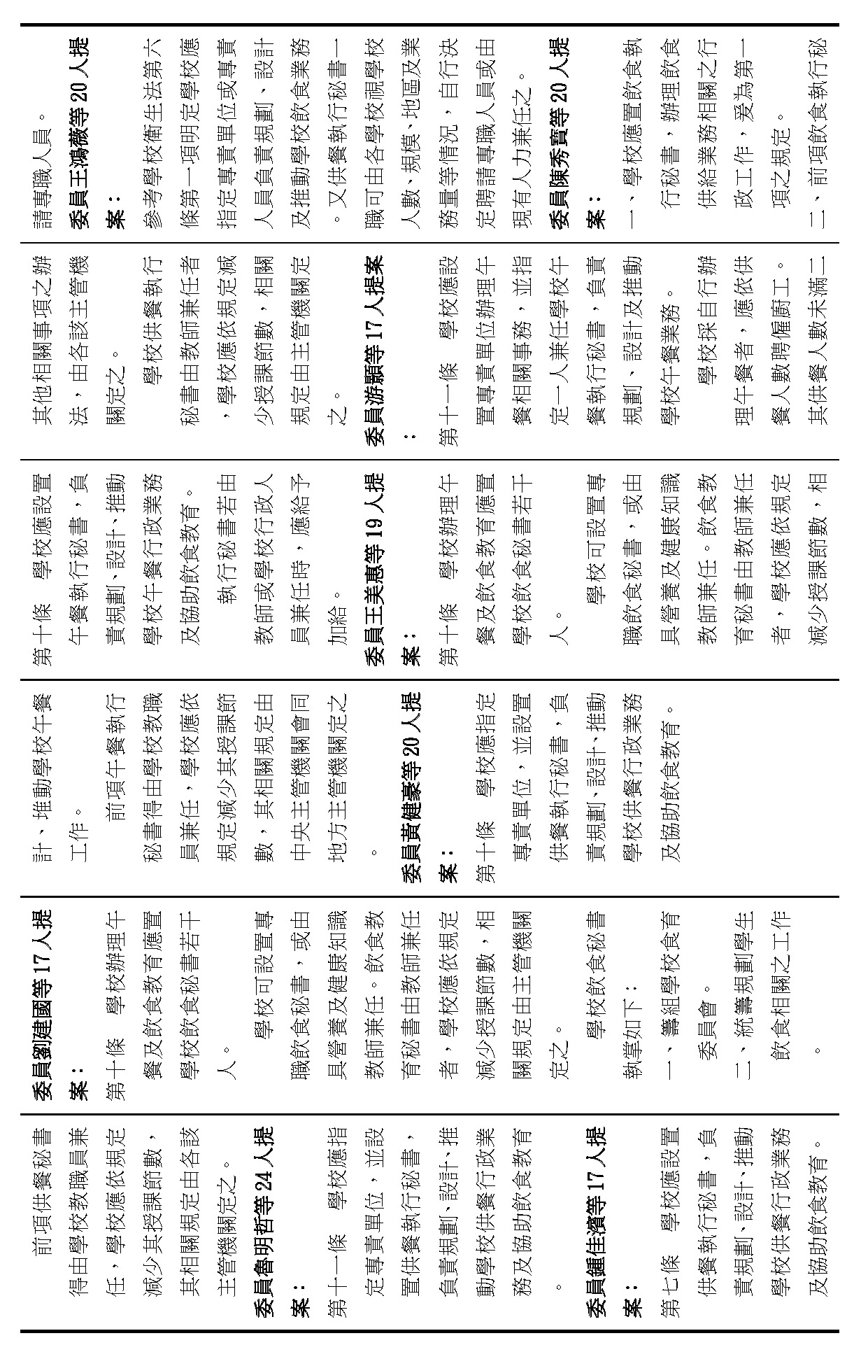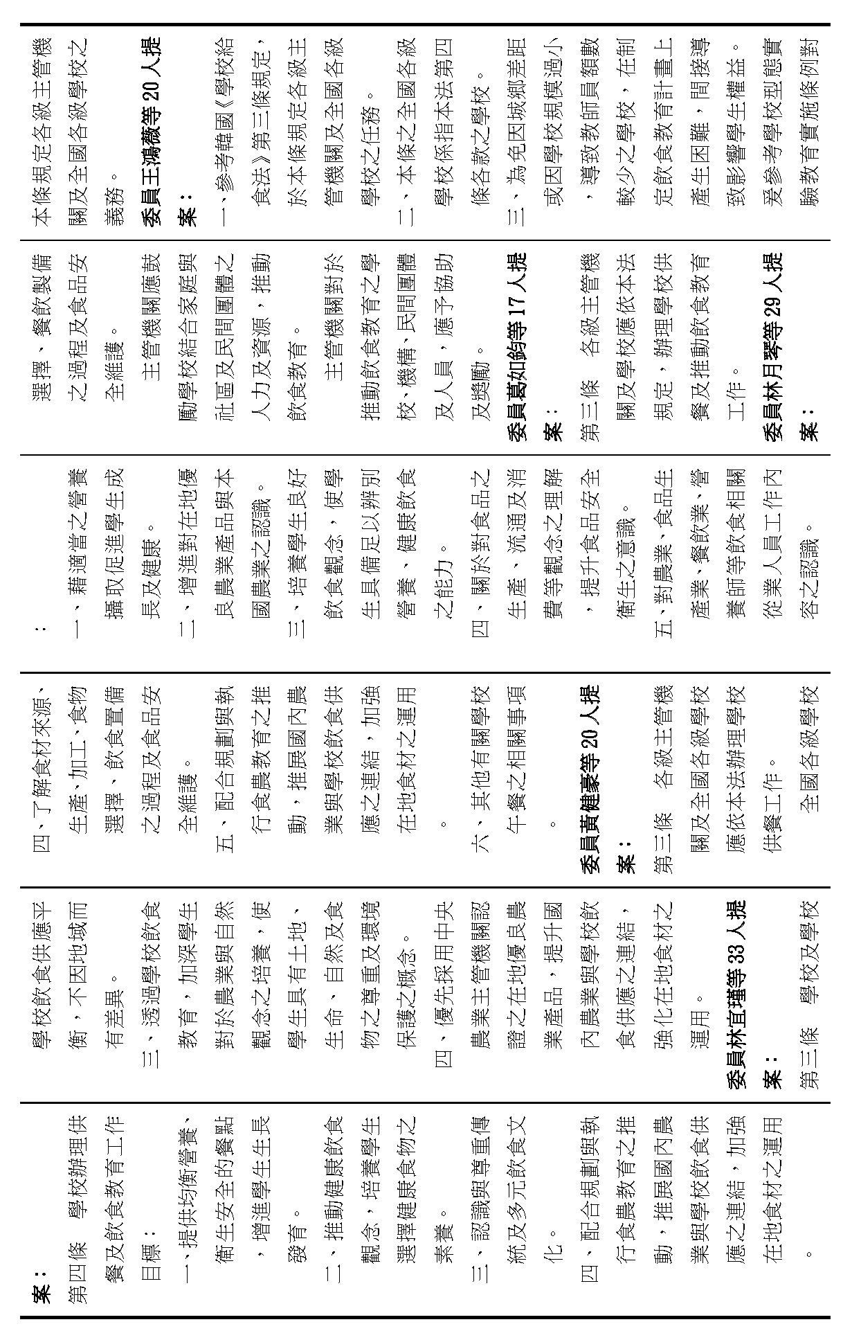委員如果有臨時提案,請於上午10時30分前提出,處理提案時,若提案委員及連署委員均不在場,援例不予處理。現在審查學校供餐法草案相關草案,進行逐條審查,並進行……