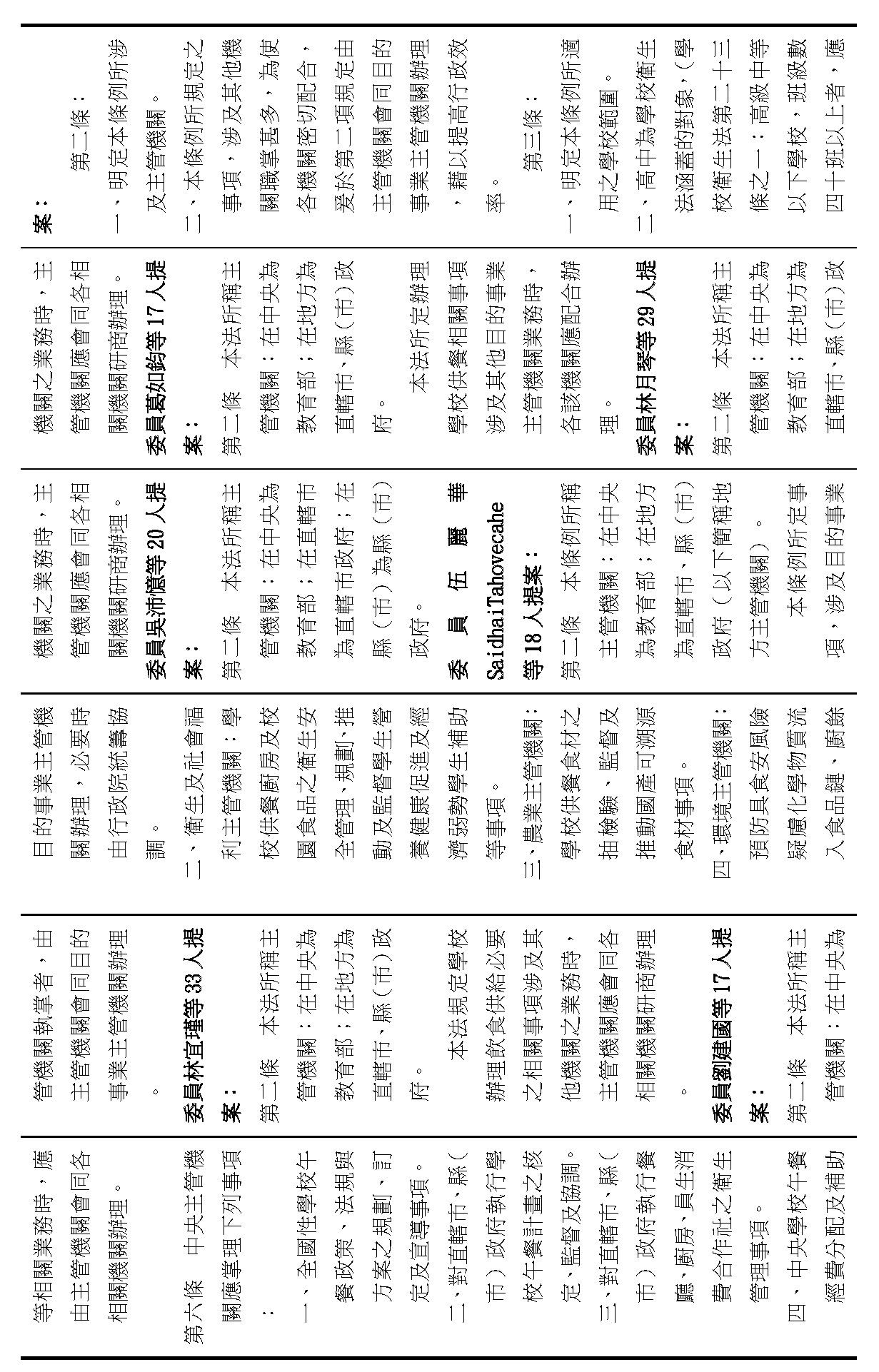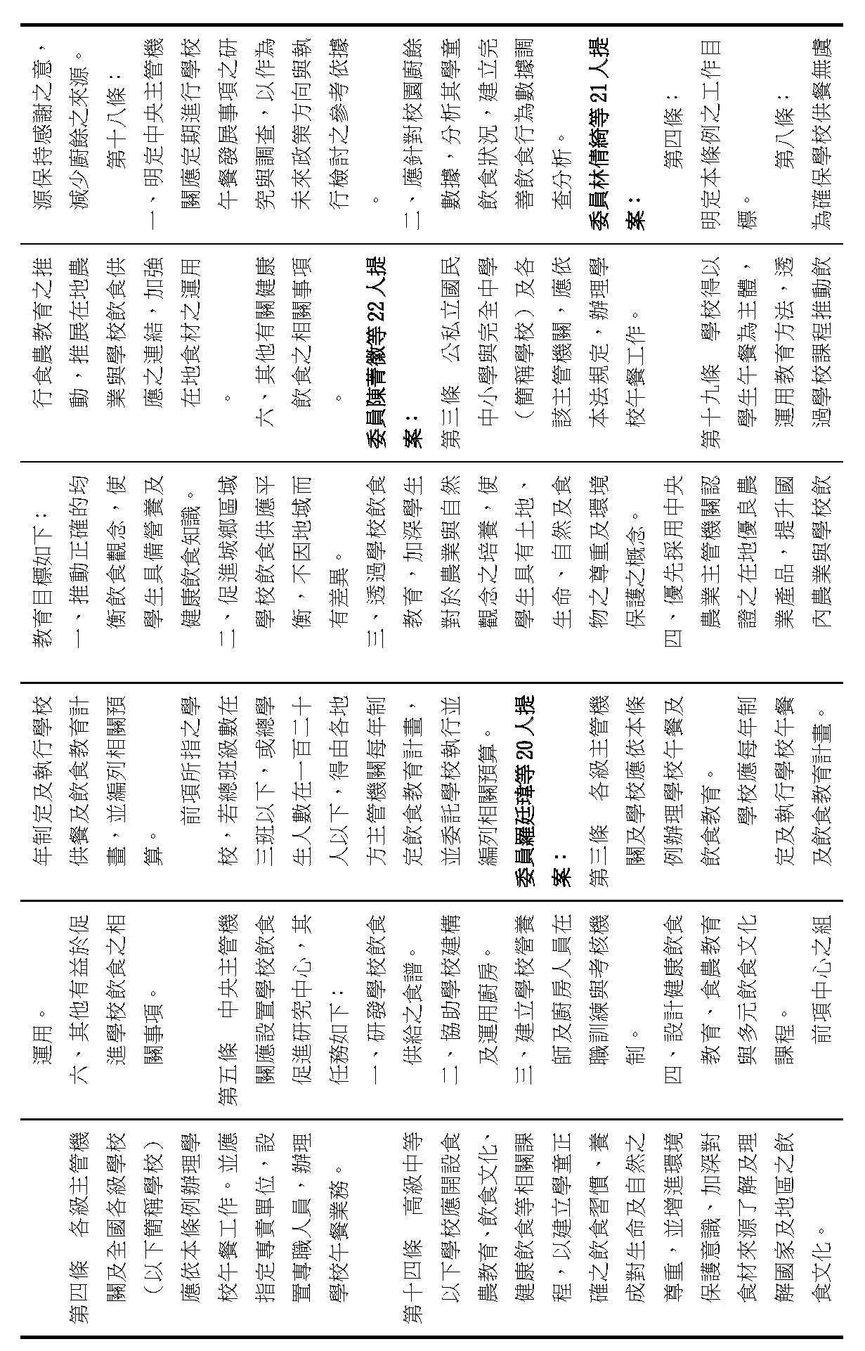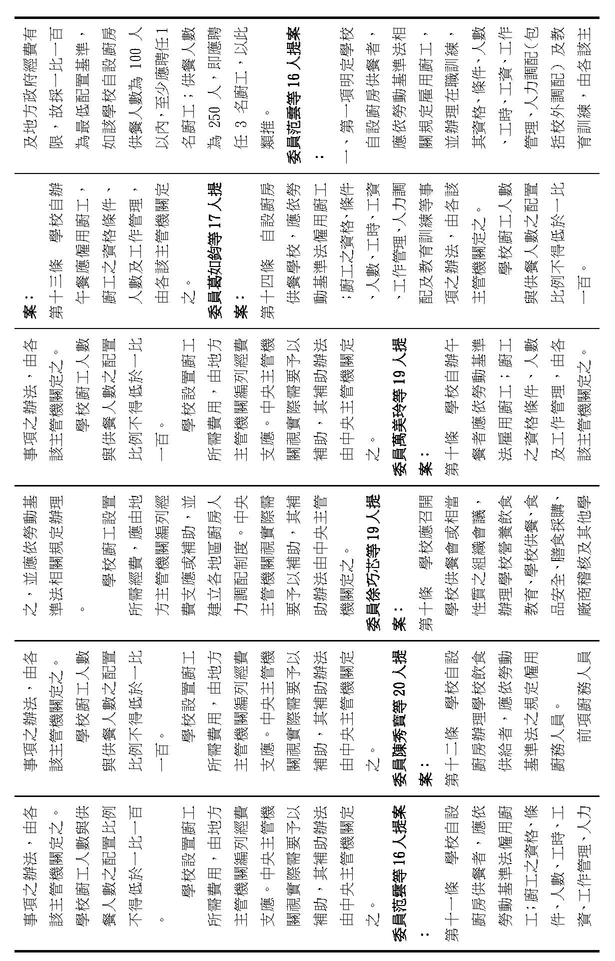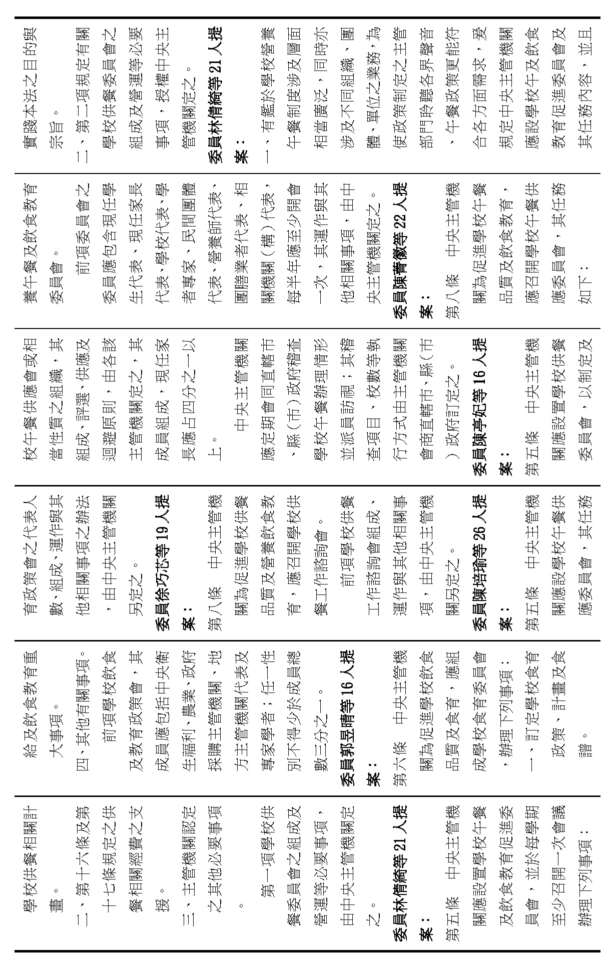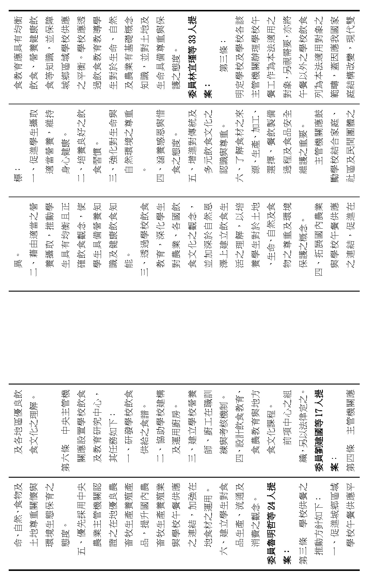 委員如果有臨時提案,請於上午10時30分前提出,處理提案時,若提案委員及連署委員均不在場,援例不予處理。現在審查學校供餐法草案相關草案,進行逐條審查,並進行……