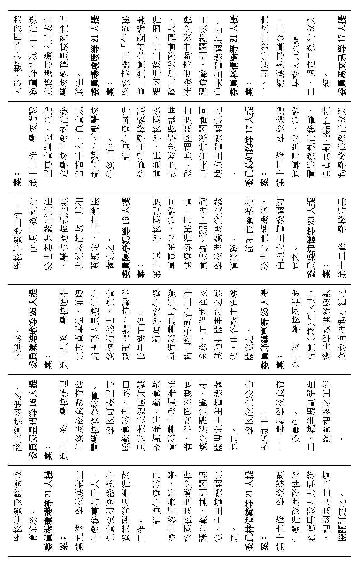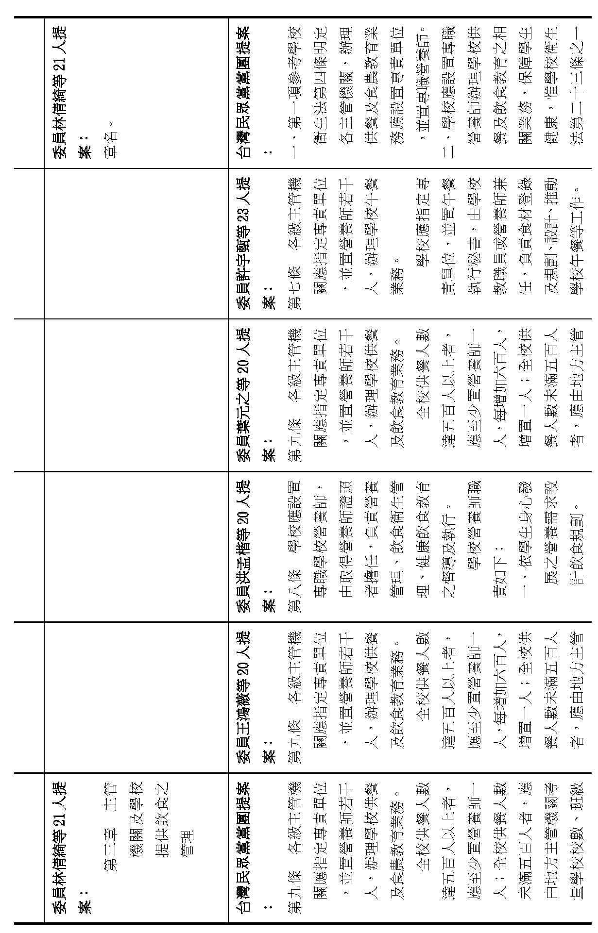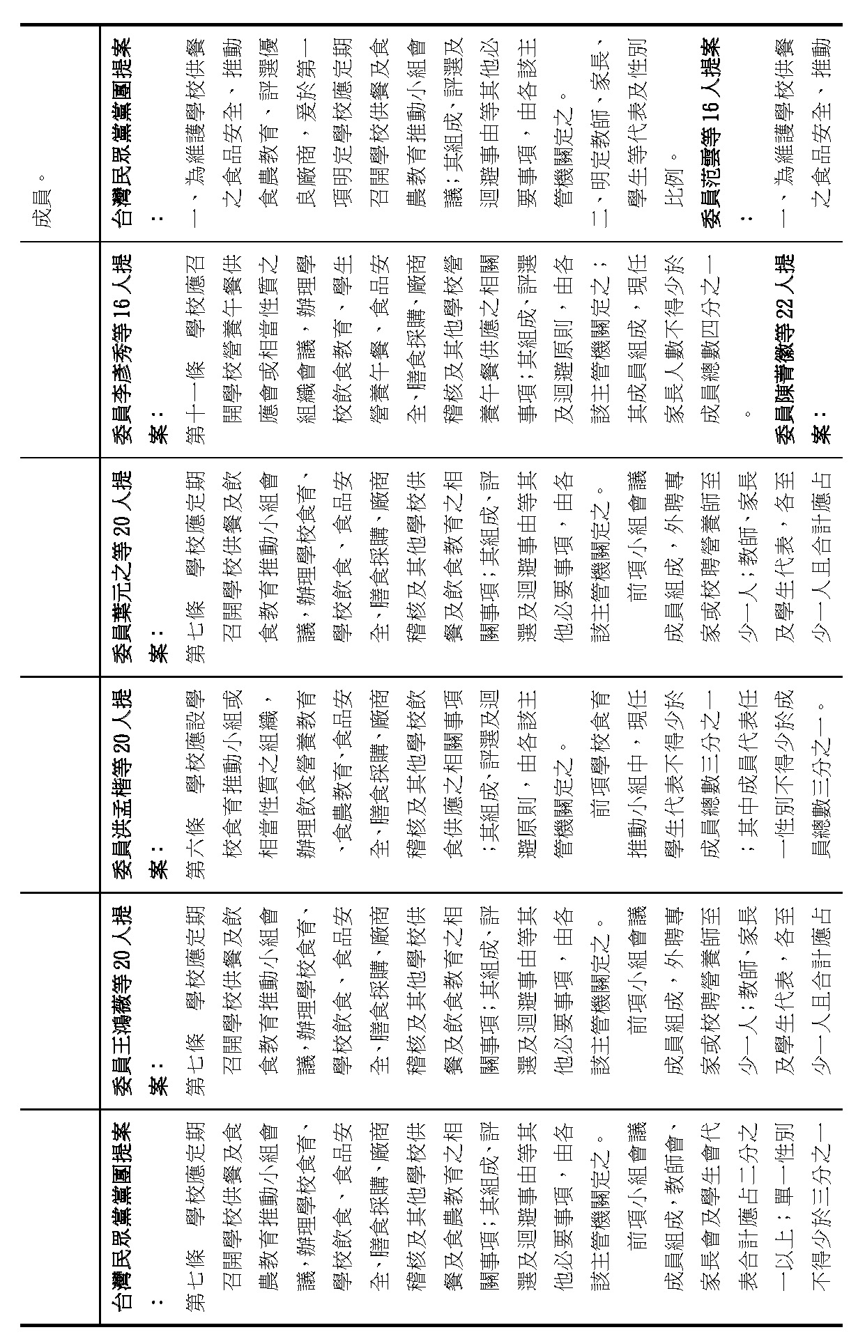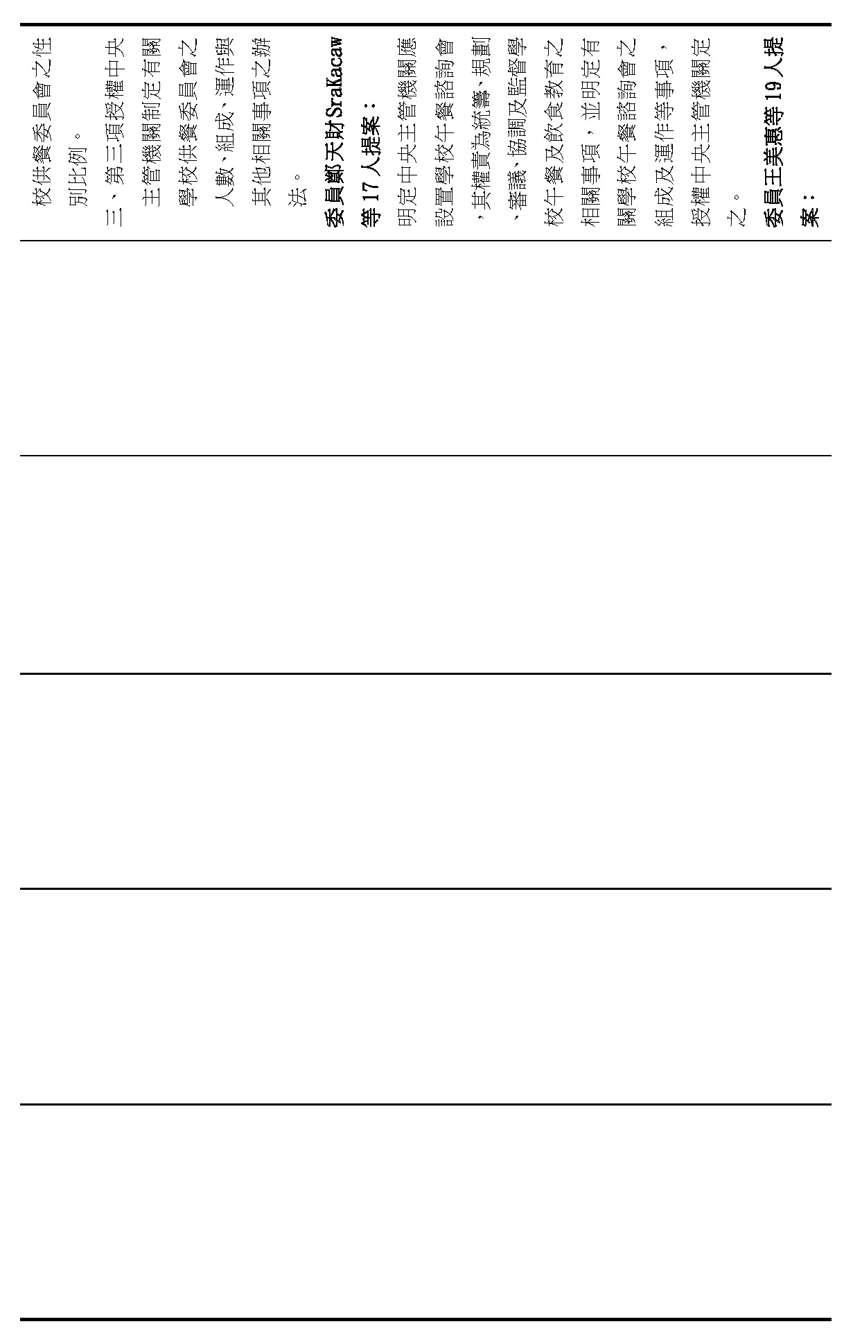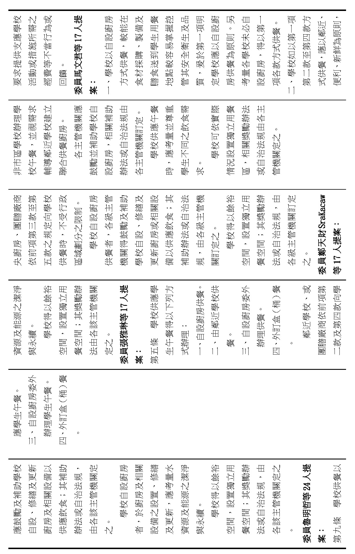 委員如果有臨時提案,請於上午10時30分前提出,處理提案時,若提案委員及連署委員均不在場,援例不予處理。現在審查學校供餐法草案相關草案,進行逐條審查,並進行……