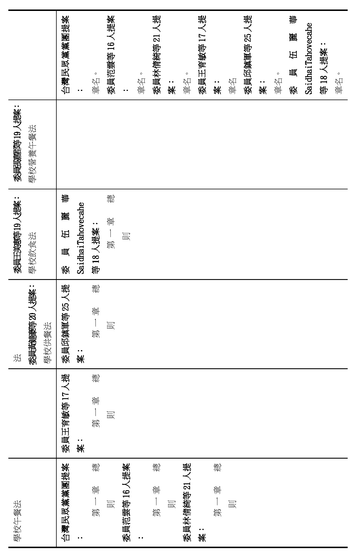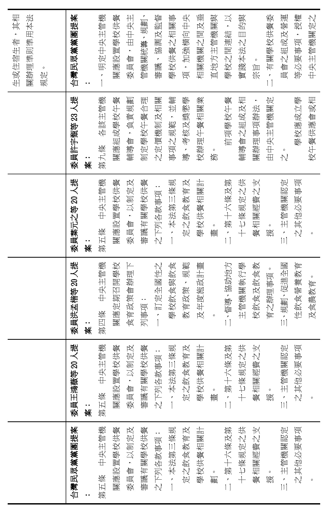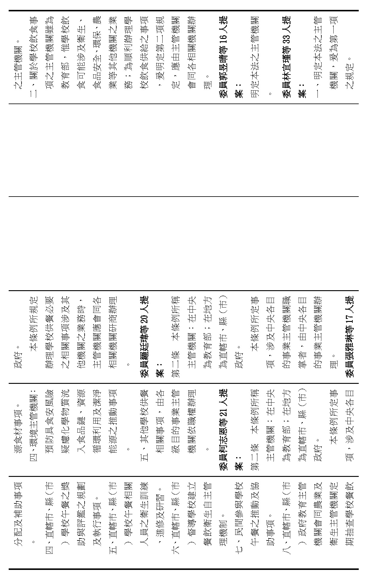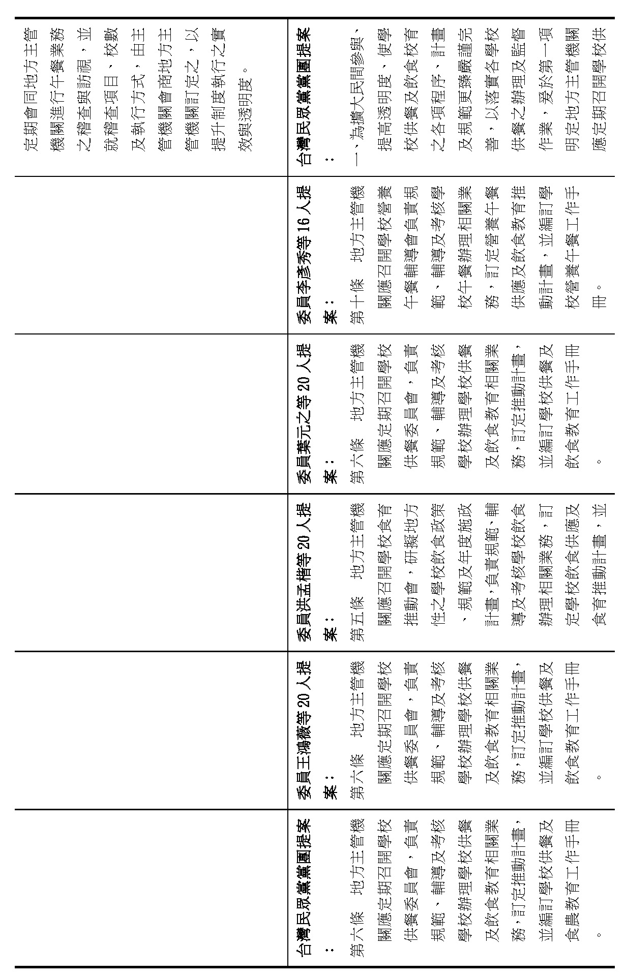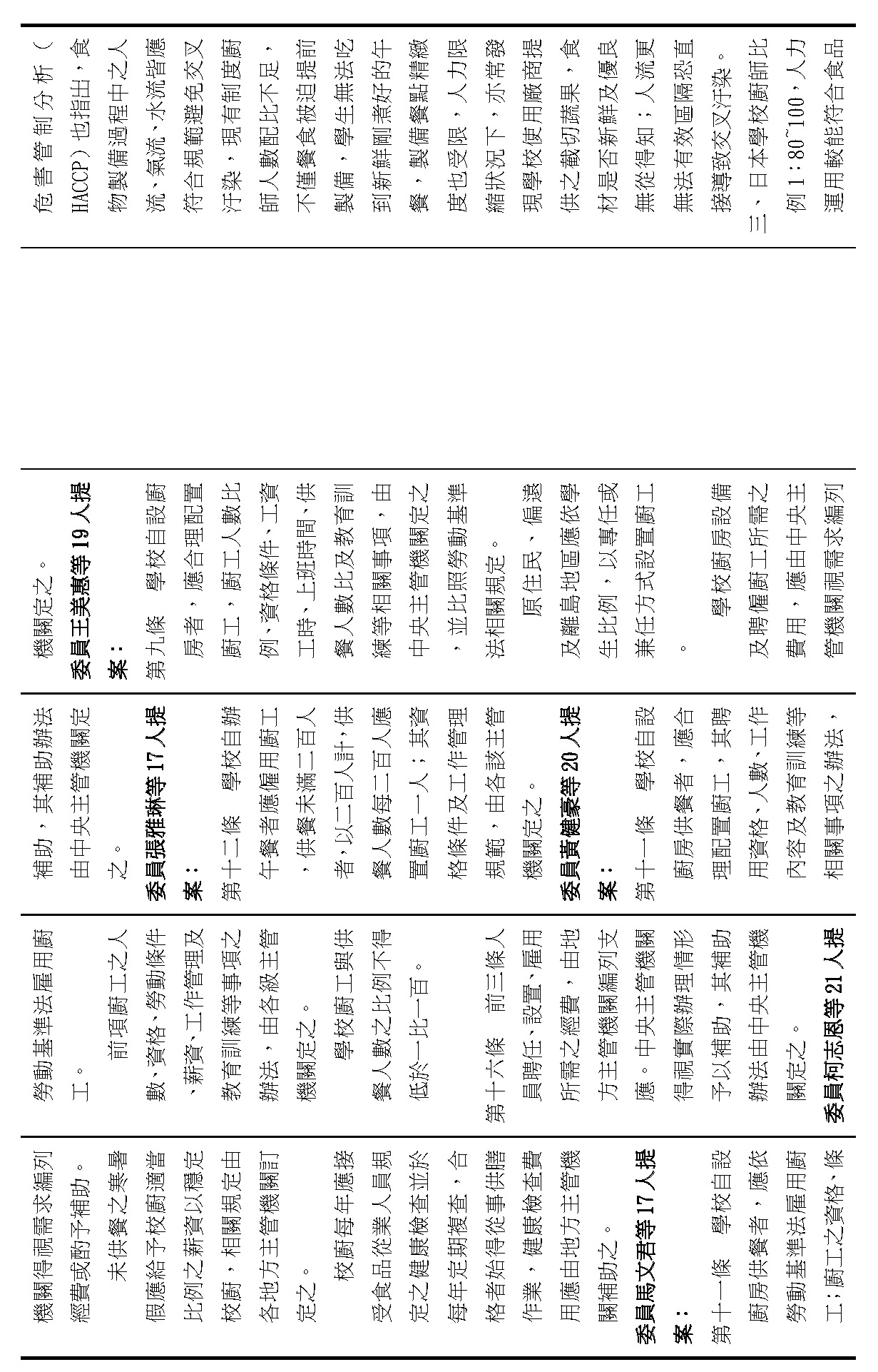 委員如果有臨時提案,請於上午10時30分前提出,處理提案時,若提案委員及連署委員均不在場,援例不予處理。現在審查學校供餐法草案相關草案,進行逐條審查,並進行……