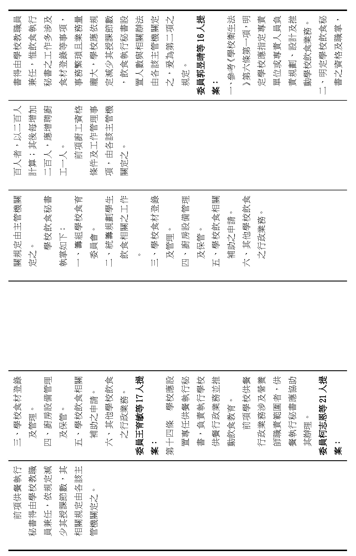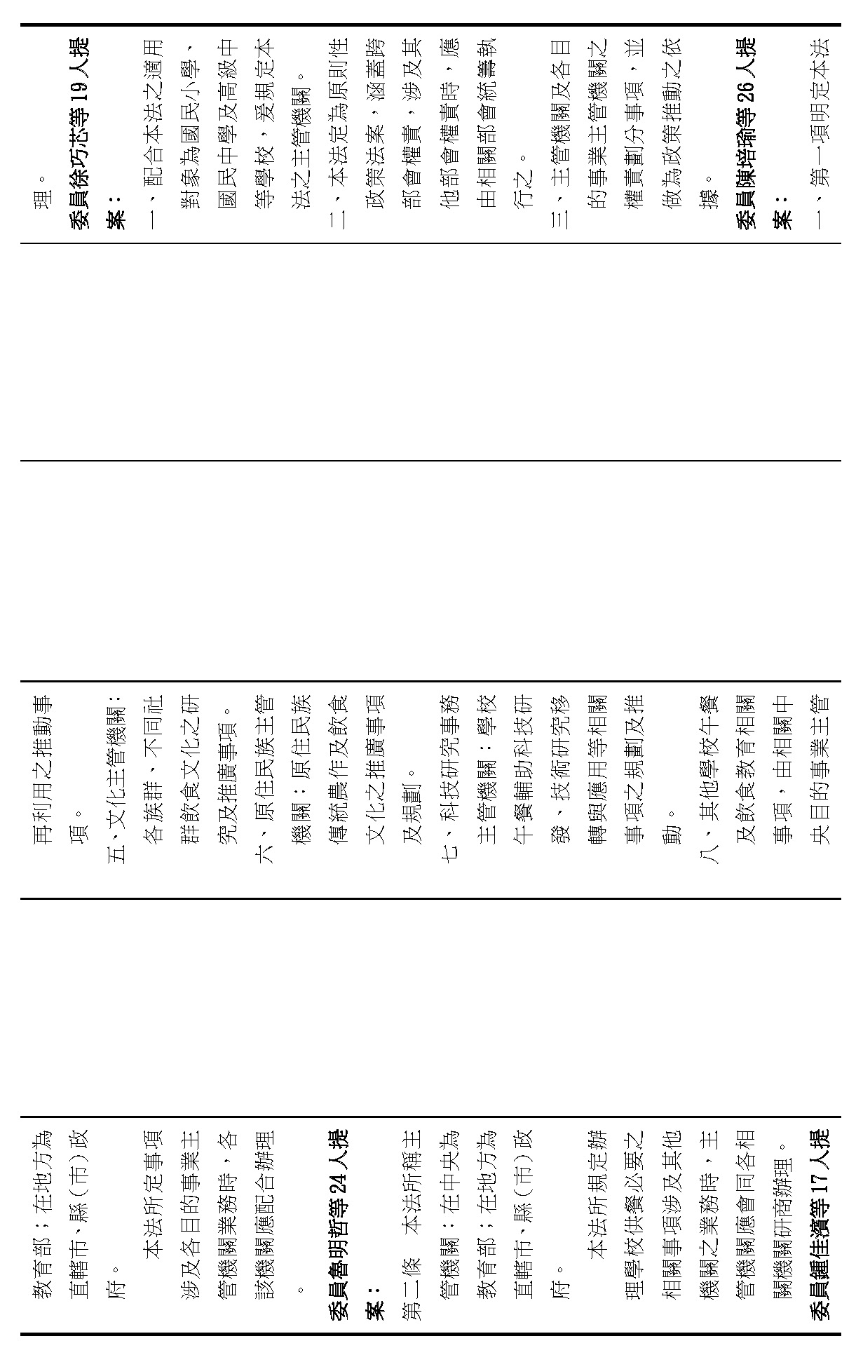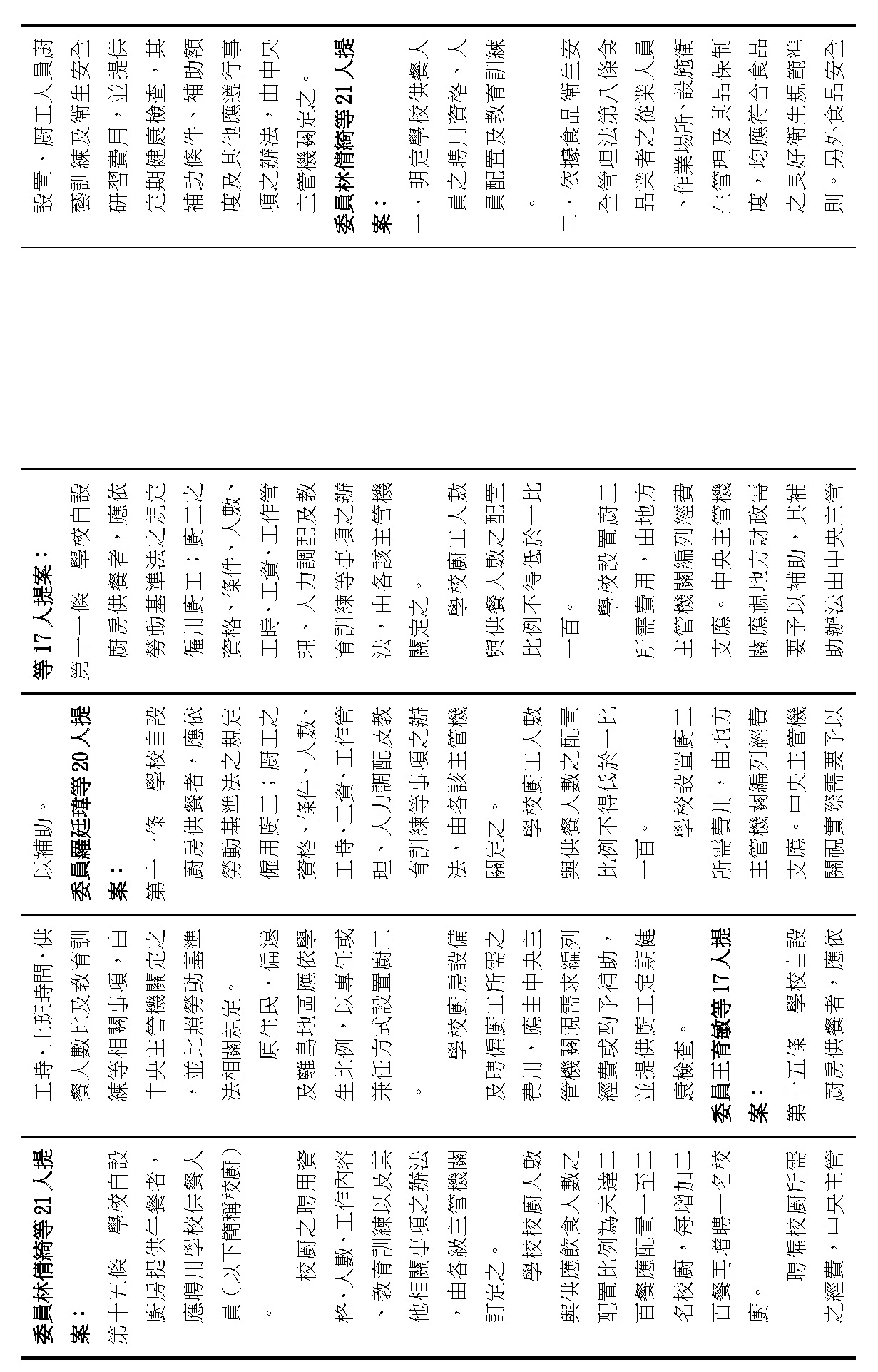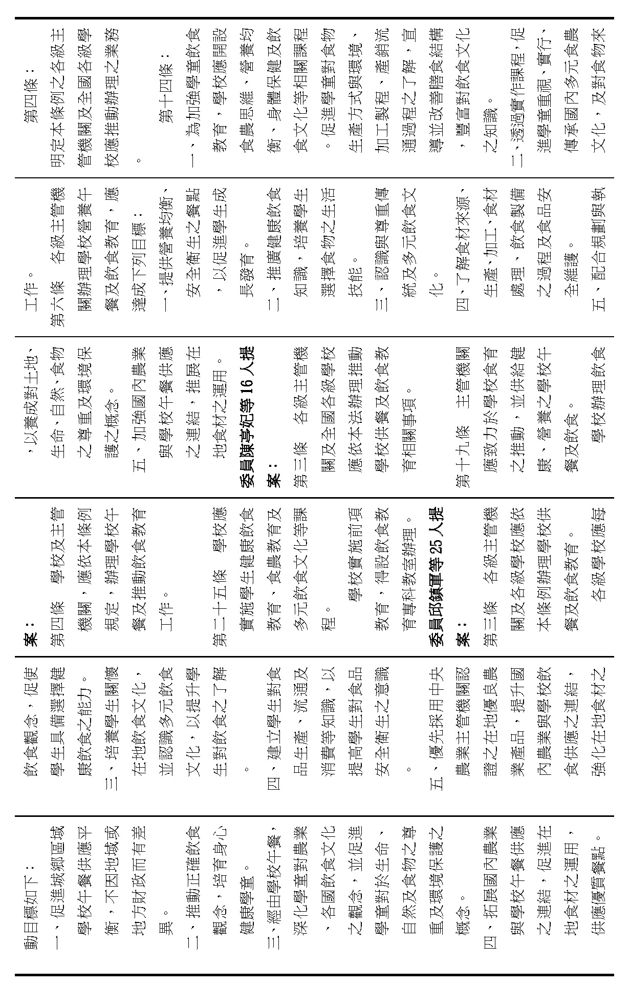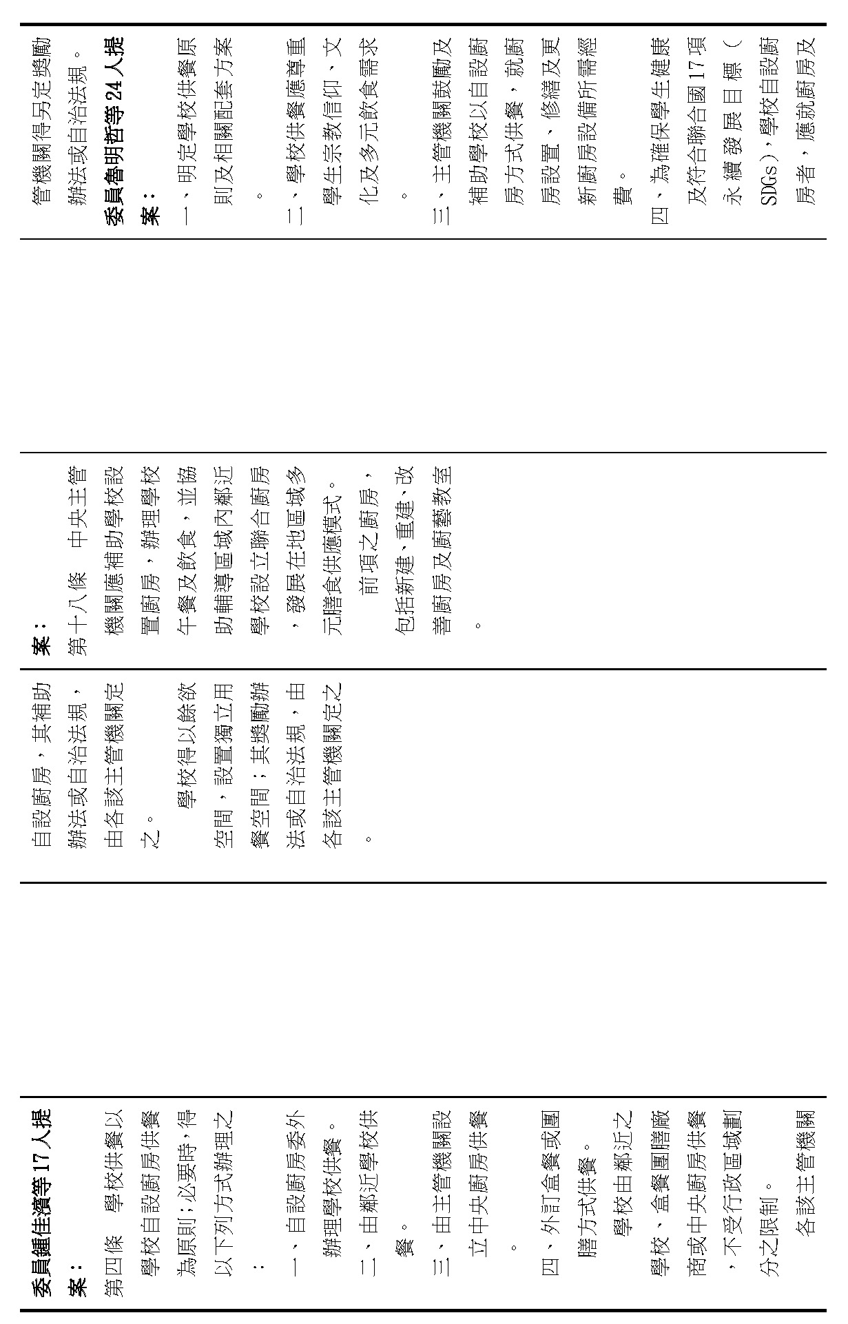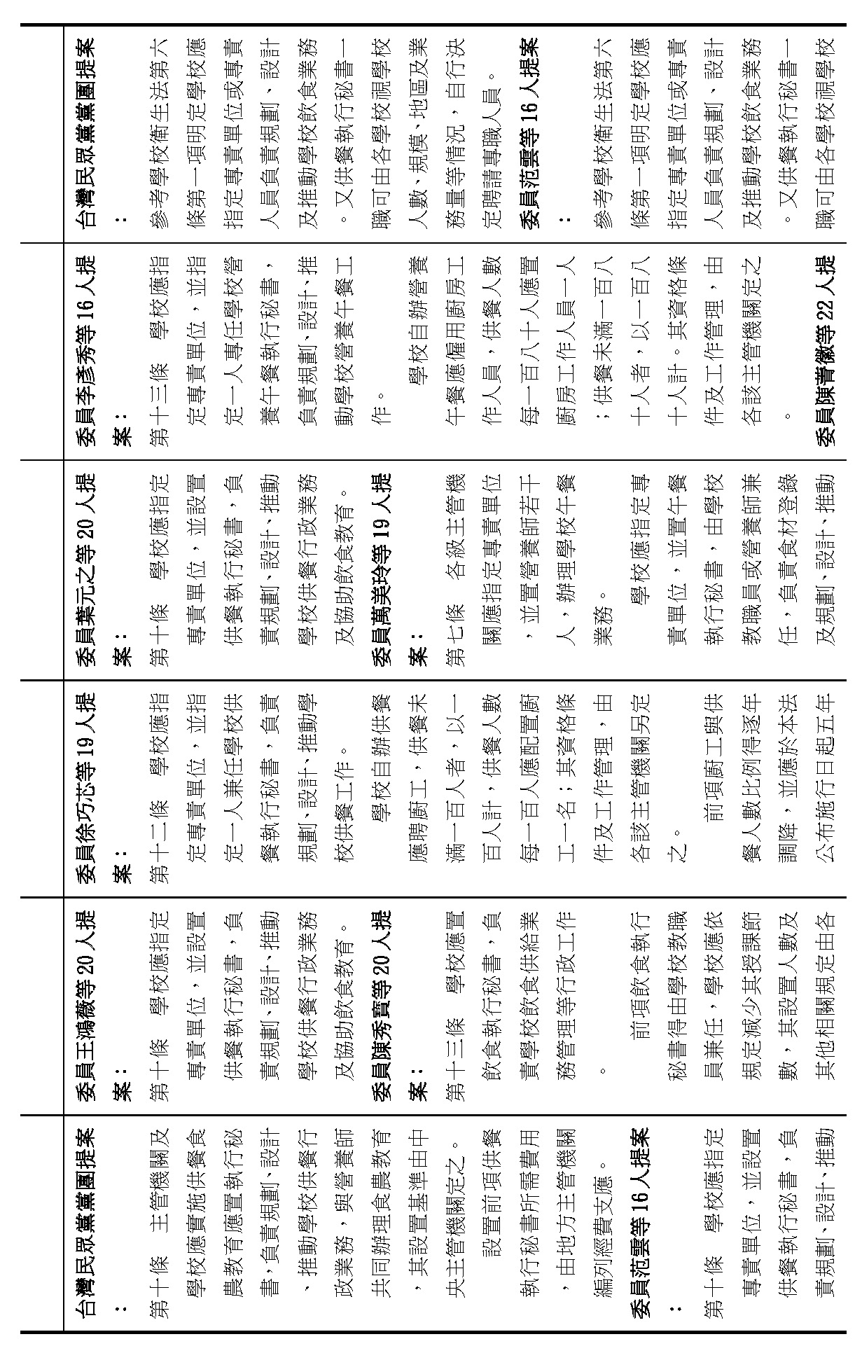 委員如果有臨時提案,請於上午10時30分前提出,處理提案時,若提案委員及連署委員均不在場,援例不予處理。現在審查學校供餐法草案相關草案,進行逐條審查,並進行……