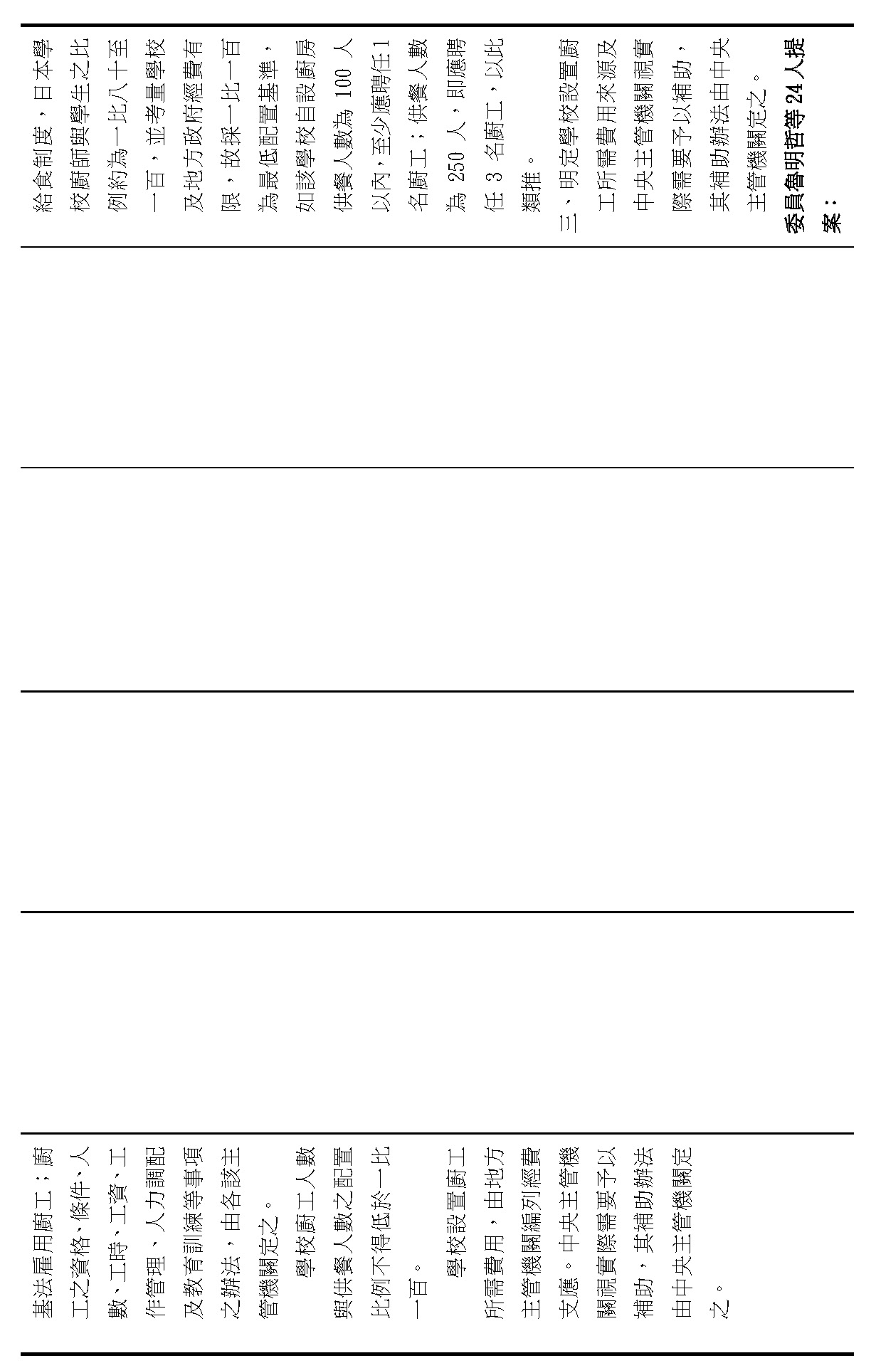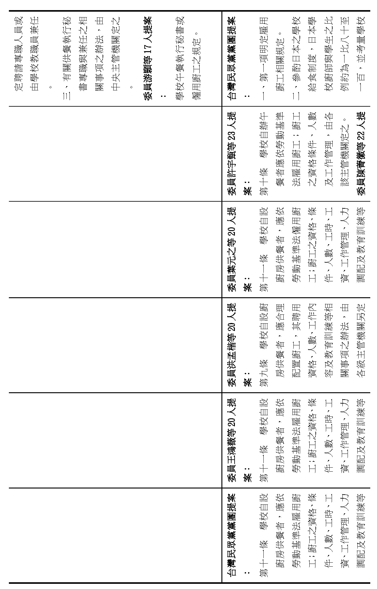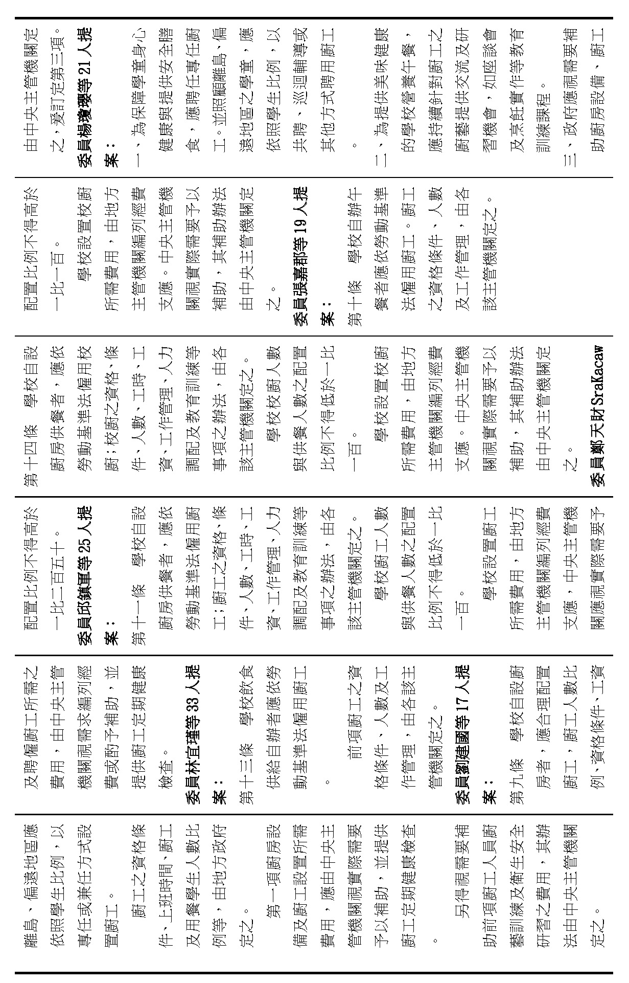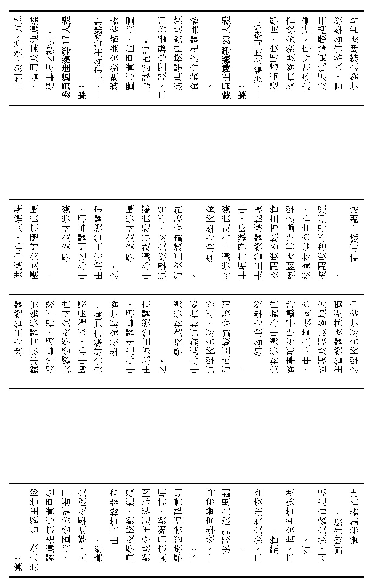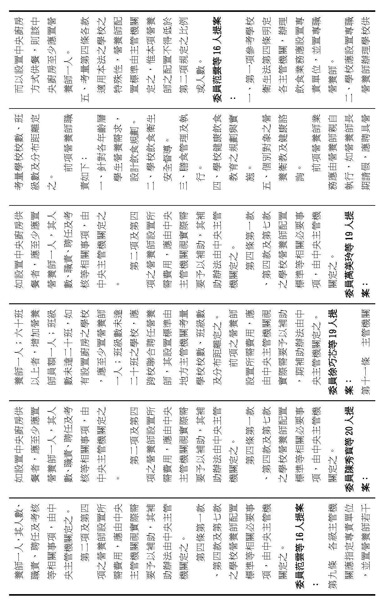委員如果有臨時提案,請於上午10時30分前提出,處理提案時,若提案委員及連署委員均不在場,援例不予處理。現在審查學校供餐法草案相關草案,進行逐條審查,並進行……
