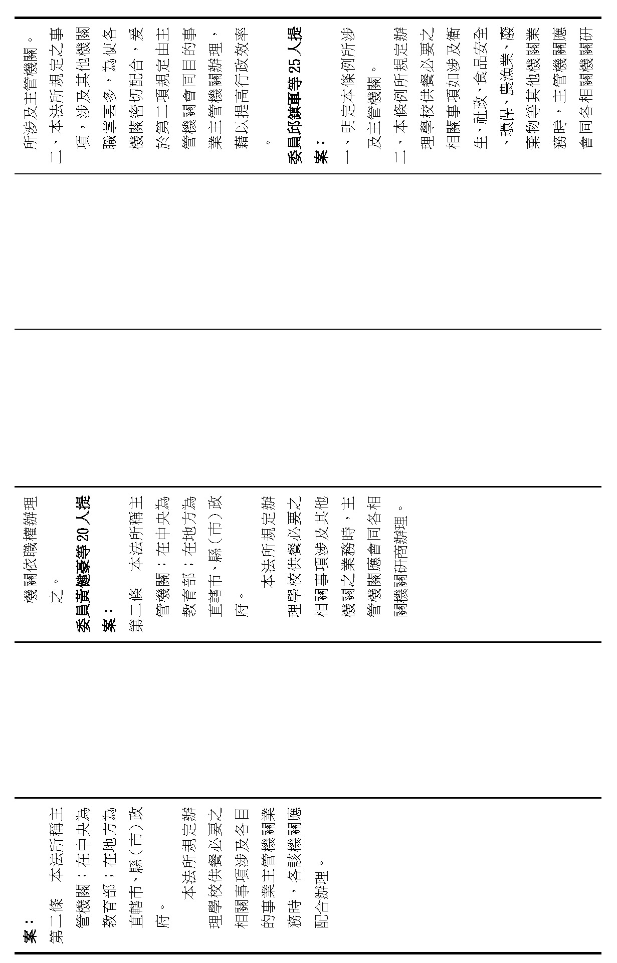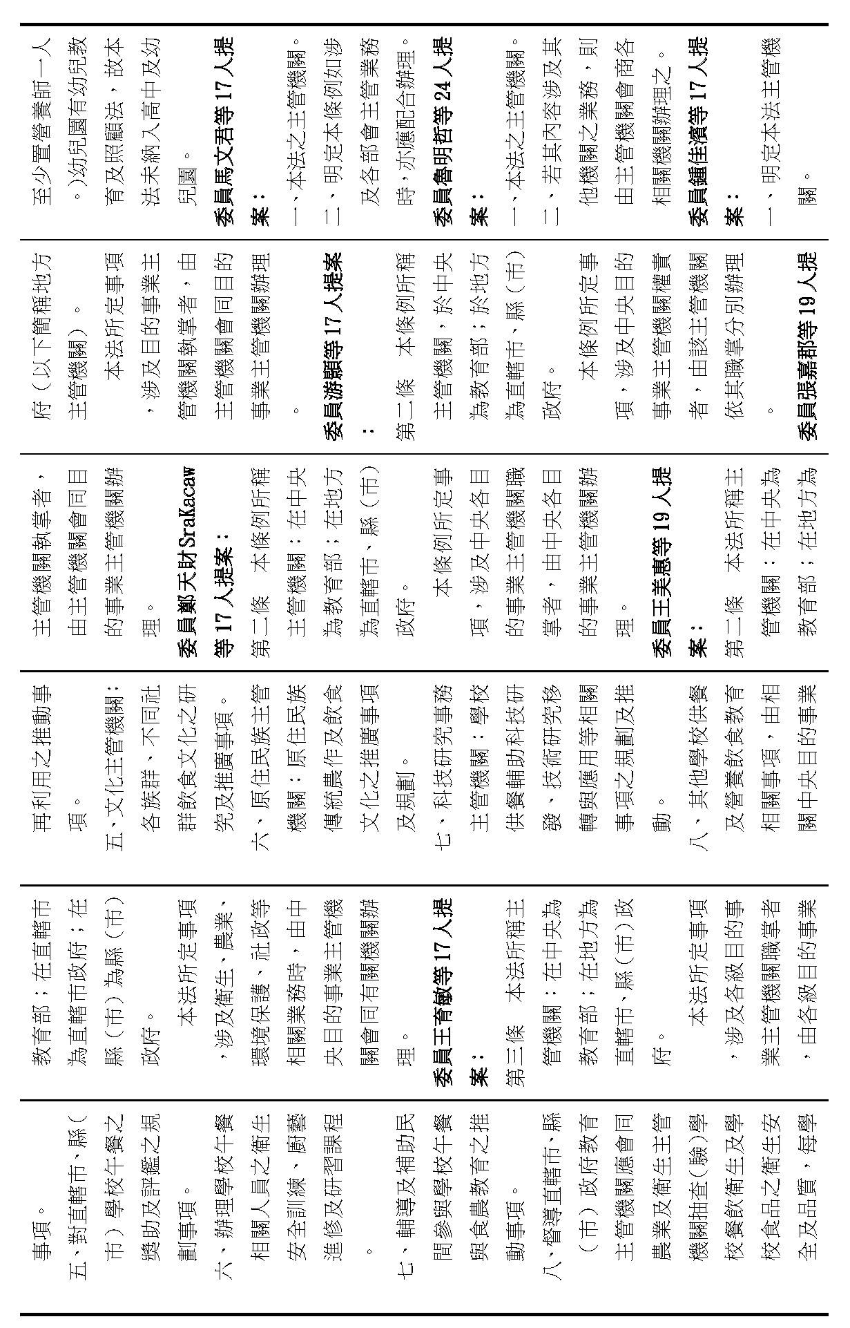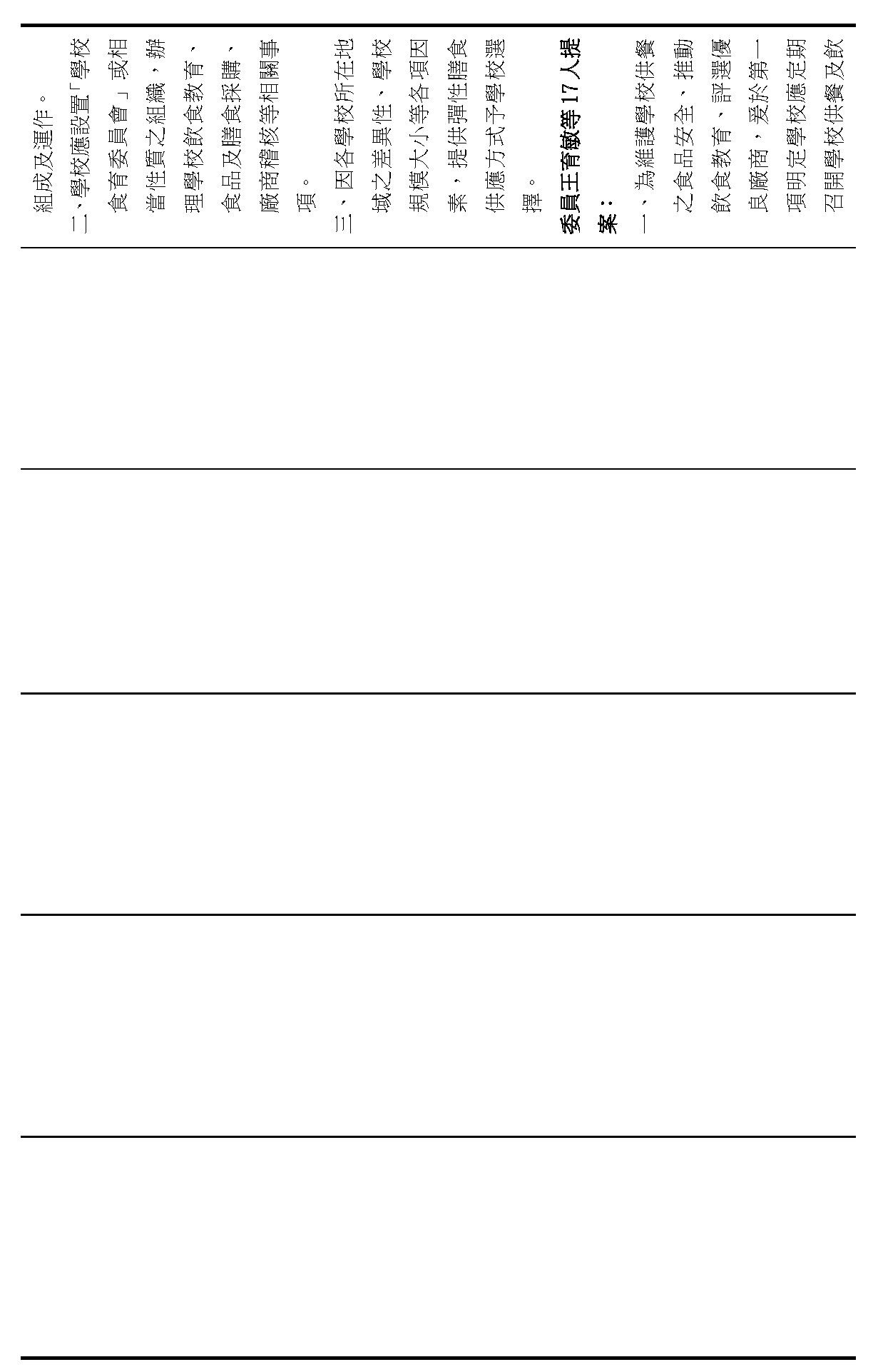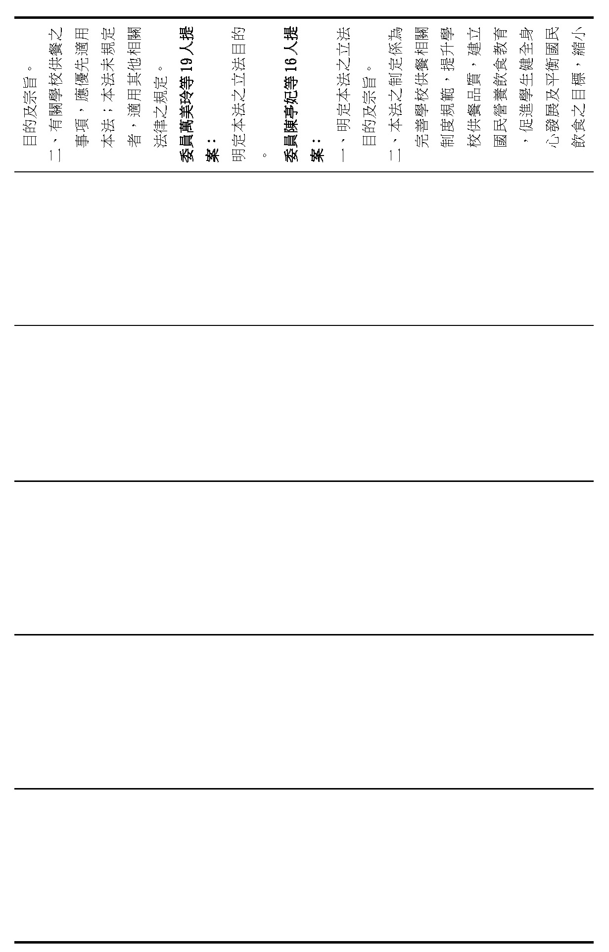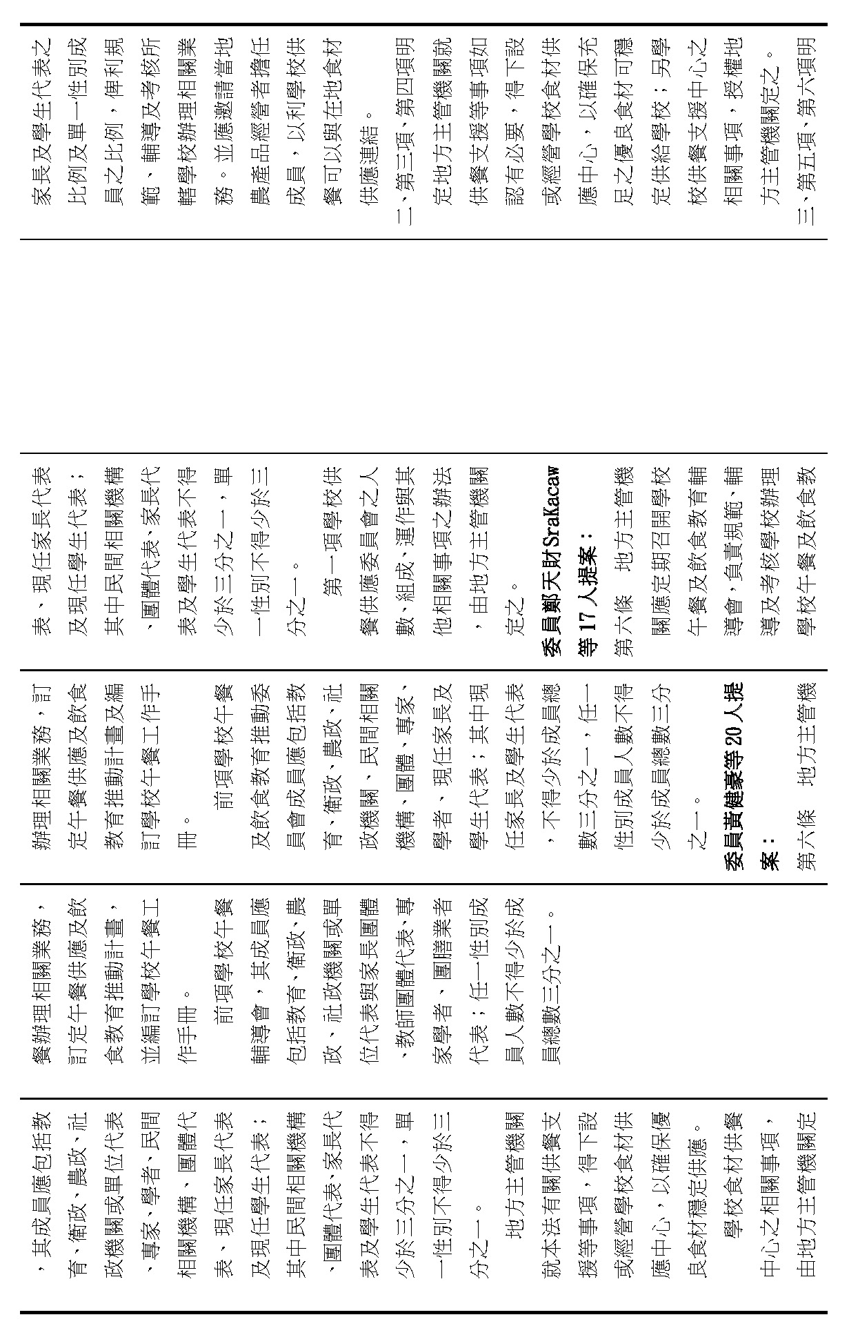委員如果有臨時提案,請於上午10時30分前提出,處理提案時,若提案委員及連署委員均不在場,援例不予處理。現在審查學校供餐法草案相關草案,進行逐條審查,並進行……